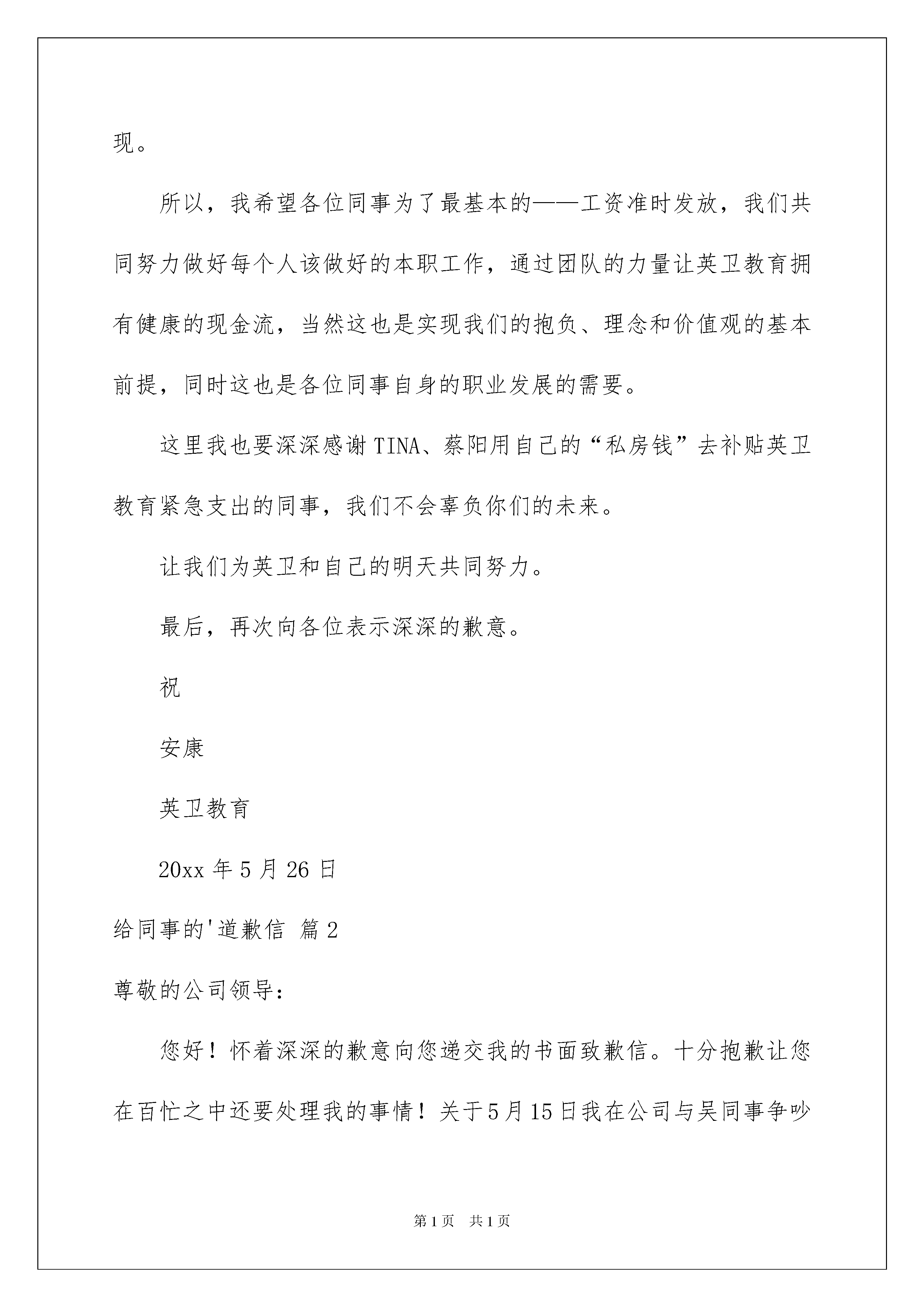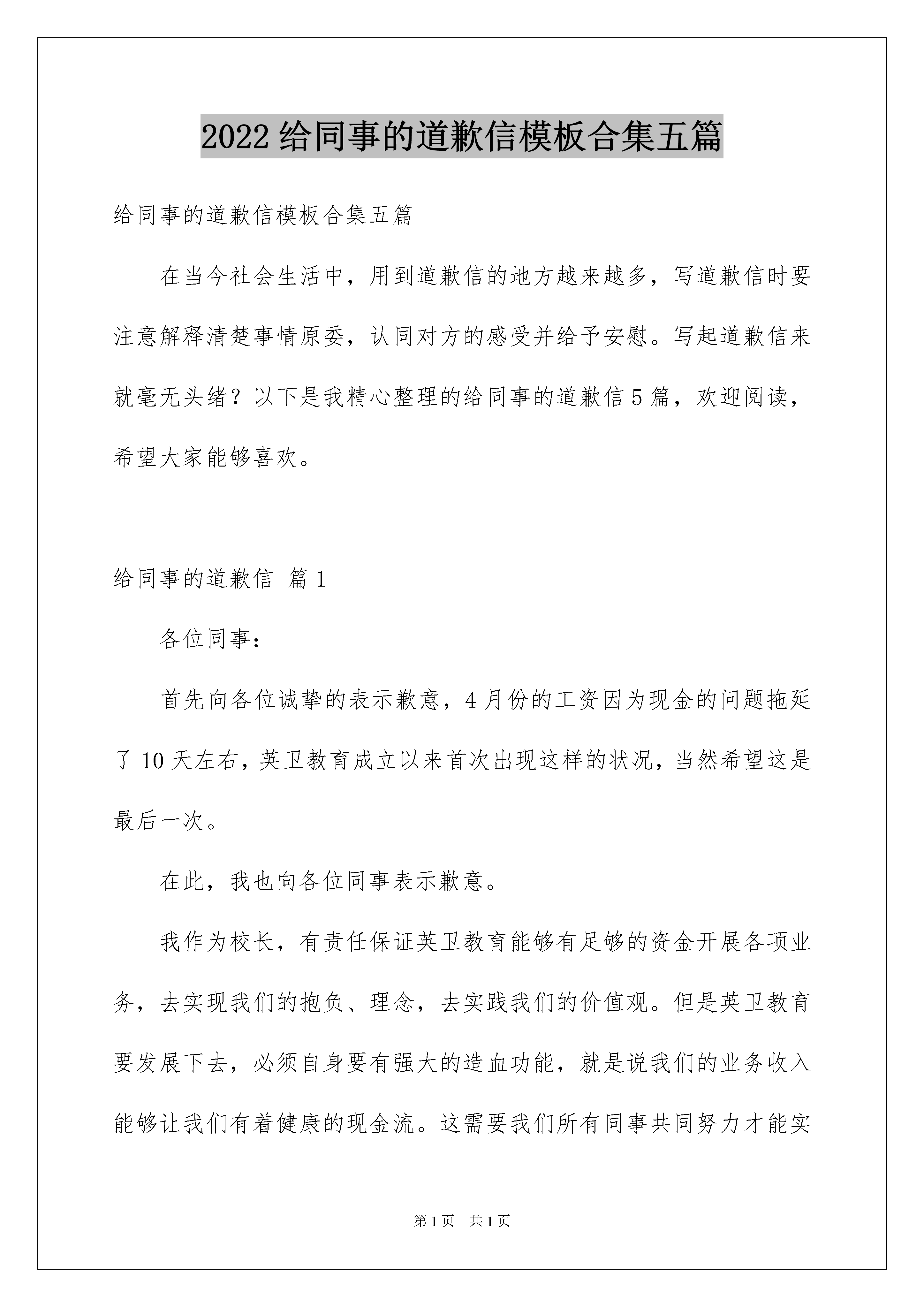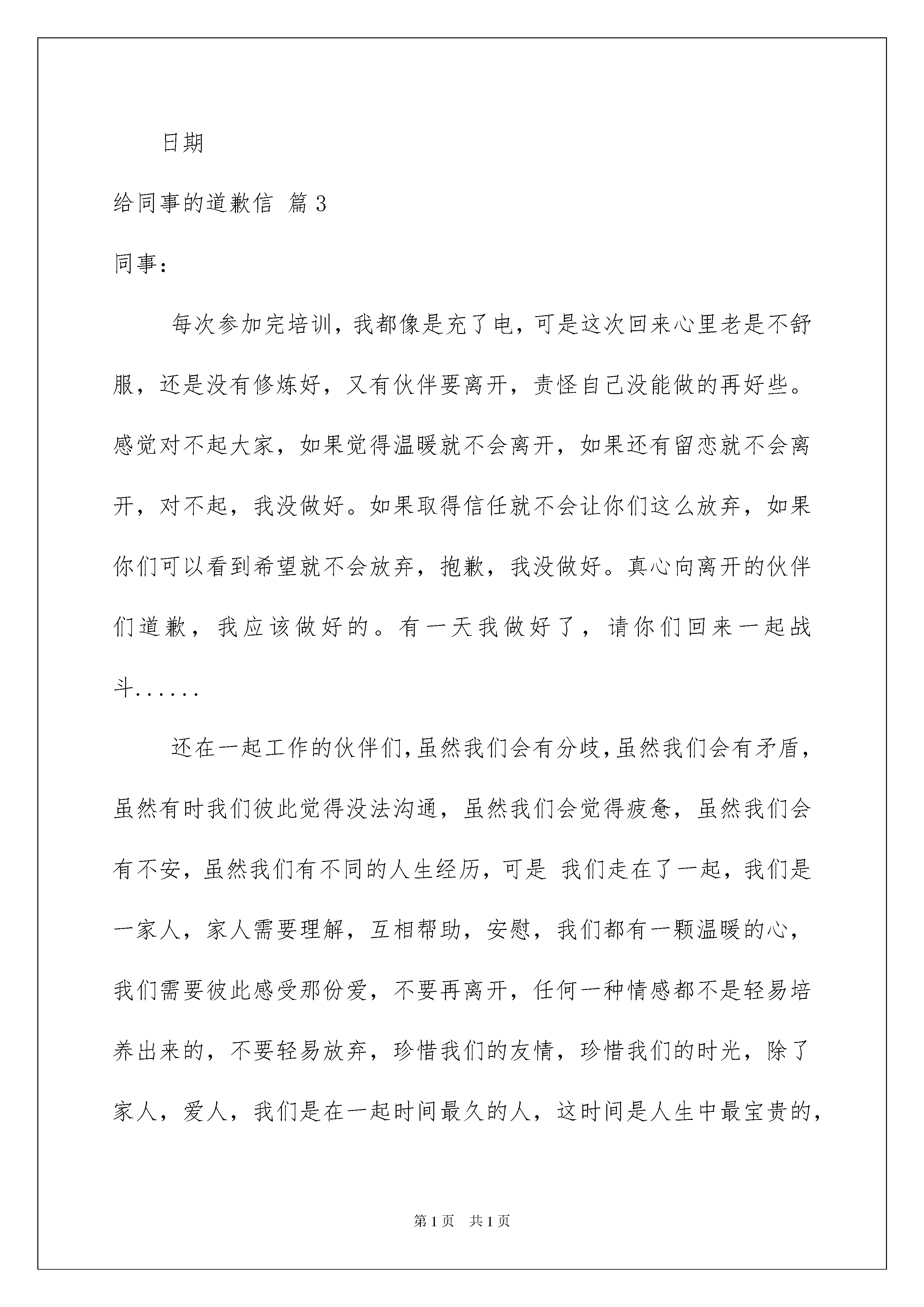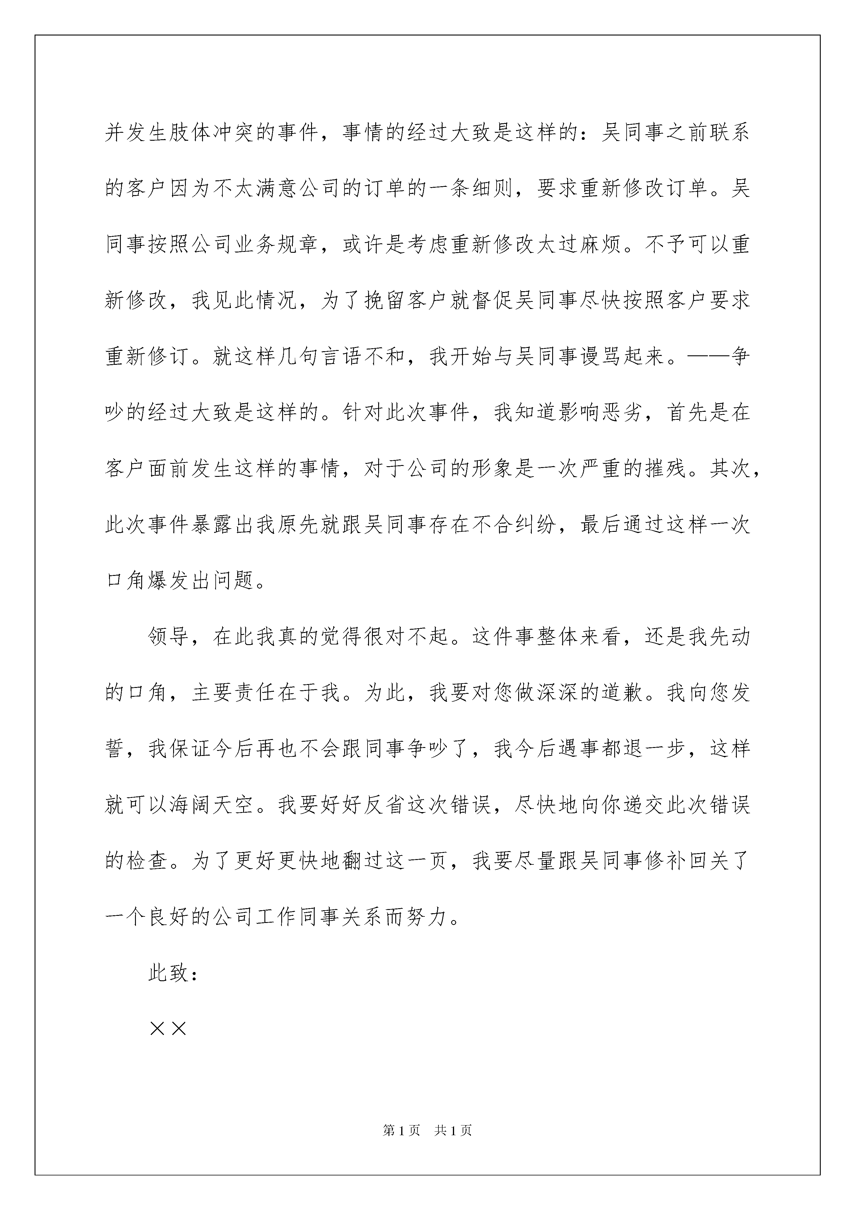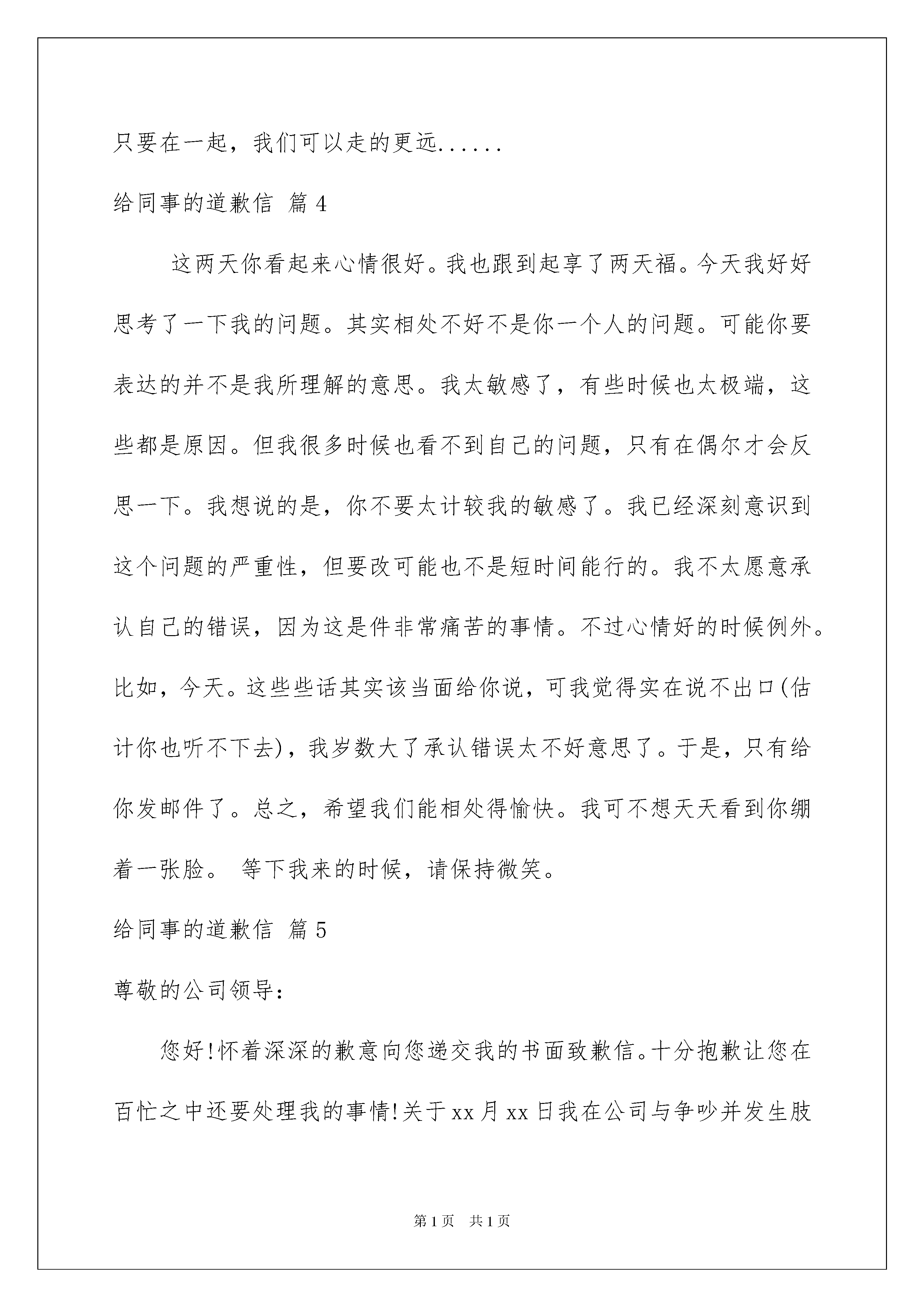 2022给同事的道歉信模板合集五篇给同事的道歉信模板合集五篇在当今社会生活中,用到道歉信的地方越来越多,写道歉信时要注意解释清楚事情原委,认同对方的感受并给予安慰。写起道歉信来就毫无头绪?以下是我精心整理的给同事的道歉信5篇,欢迎阅读,希望大家能够喜欢。给同事的道歉信篇1各位同事:首先向各位诚挚的表示歉意,4月份的工资因为现金的问题拖延了10天左右,英卫教育成立以来首次出现这样的状况,当然希望这是最后一次。在此,我也向各位同事表示歉意。我作为校长,有责任保证英卫教育能够有足够的资金开展各项业务,去实现我们的抱负、理念,去实践我们的价值观。但是英卫教育要发展下去,必须自身要有强大的造血功能,就是说我们的业务收入能够让我们有着健康的现金流。这需要我们所有同事共同努力才能实现。所以,我希望各位同事为了最基本的——工资准时发放,我们共同努力做好每个人该做好的本职工作,通过团队的力量让英卫教育拥有健康的现金流,当然这也是实现我们的抱负、理念和价值观的基本前提,同时这也是各位同事自身的职业发展的需要。这里我也要深深感谢TINA、蔡阳用自己的“私房钱”去补贴英卫教育紧急支出的同事,我们不会辜负你们的未来。让我们为英卫和自己的明天共同努力。最后,再次向各位表示深深的歉意。祝安康英卫教育20xx年5月26日给同事的'道歉信篇2尊敬的公司领导:您好!怀着深深的歉意向您递交我的书面致歉信。十分抱歉让您在百忙之中还要处理我的事情!关于5月15日我在公司与吴同事争吵并发生肢体冲突的事件,事情的经过大致是这样的:吴同事之前联系的客户因为不太满意公司的订单的一条细则,要求重新修改订单。吴同事按照公司业务规章,或许是考虑重新修改太过麻烦。不予可以重新修改,我见此情况,为了挽留客户就督促吴同事尽快按照客户要求重新修订。就这样几句言语不和,我开始与吴同事谩骂起来。——争吵的经过大致是这样的。针对此次事件,我知道影响恶劣,首先是在客户面前发生这样的事情,对于公司的形象是一次严重的摧残。其次,此次事件暴露出我原先就跟吴同事存在不合纠纷,最后通过这样一次口角爆发出问题。领导,在此我真的觉得很对不起。这件事整体来看,还是我先动的口角,主要责任在于我。为此,我要对您做深深的道歉。我向您发誓,我保证今后再也不会跟同事争吵了,我今后遇事都退一步,这样就可以海阔天空。我要好好反省这次错误,尽快地向你递交此次错误的检查。为了更好更快地翻过这一页,我要尽量跟吴同事修补回关了一个良好的公司工作同事关系而努力。此致:××日期给同事的道歉信篇3同事:每次参加完培训,我都像是充了电,可是这次回来心里老是不舒服,还是没有修炼好,又有伙伴要离开,责怪自己没能做的再好些。感觉对不起大家,如果觉得温暖就不会离开,如果还有留恋就不会离开,对不起,我没做好。如果取得信任就不会让你们这么放弃,如果你们可以看到希望就不会放弃,抱歉,我没做好。真心向离开的伙伴们道歉,我应该做好的。有一天我做好了,请你们回来一起战斗......还在一起工作的伙伴们,虽然我们会有分歧,虽然我们会有矛盾,虽然有时我们彼此觉得没法沟通,虽然我们会觉得疲惫,虽然我们会有不安,虽然我们有不同的人生经历,可是我们走在了一起,我们是一家人,家人需要理解,互相帮助,安慰,我们都有一颗温暖的心,我们需要彼此感受那份爱,不要再离开,任何一种情感都不是轻易培养出来的,不要轻易放弃,珍惜我们的友情,珍惜我们的时光,除了家人,爱人,我们是在一起时间最久的人,这时间是人生中最宝贵的,只要在一起,我们可以走的更远......给同事的道歉信篇4这两天你看起来心情很好。我也跟到起享了两天福。今天我好好思考了一下我的问题。其实相处不好不是你一个人的问题。可能你要表达的并不是我所理解的意思。我太敏感了,有些时候也太极端,这些都是原因。但我很多时候也看不到自己的问题,只有在偶尔才会反思一下。我想说的是,你不要太计较我的敏感了。我已经深刻意识到这个问题的严重性,但要改可能也不是短时间能行的。我不太愿意承认自己的错误,因为这是件非常痛苦的事情。不过心情好的时候例外。比如,今天。这些些话其实该当面给你说,可我觉得实在说不出口(估计你也听不下去),我岁数大了承认错误太不好意思了。于是,只有给你发邮件了。总之,希望我们能相处得愉快。我可不想天天看到你绷着一张脸。等下我来的时候,请保持微笑。给同事的道歉信篇5尊敬的公司领导:您好!怀着深深的歉意向您递交我的书面致歉信。十分抱歉让您在百忙之中还要处理我的事情!关于xx月xx日我在公司与争吵并发生肢体冲突的事件,事情的经过大致是这样的:之前联系的客户因为不太满意公司的订单的一