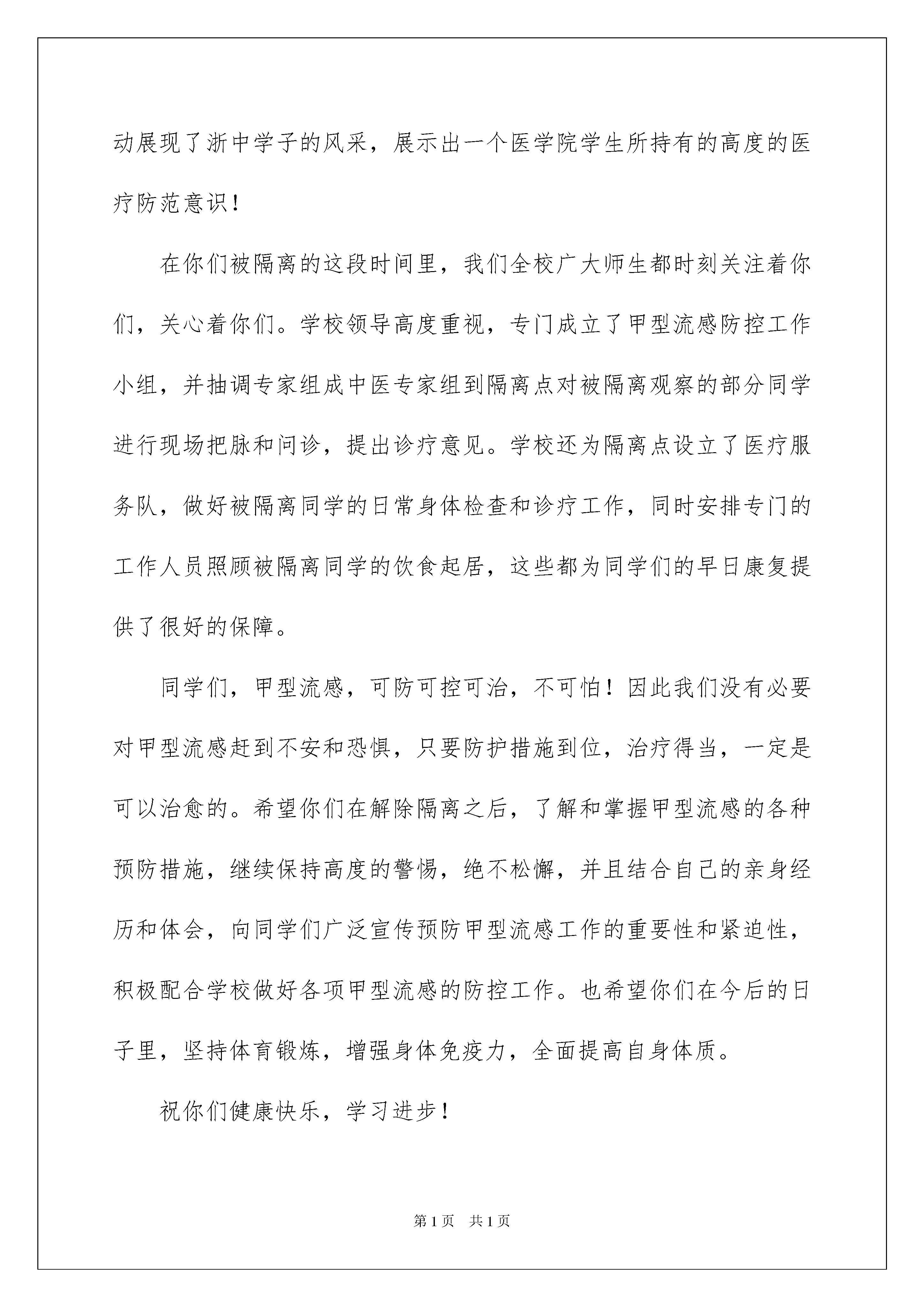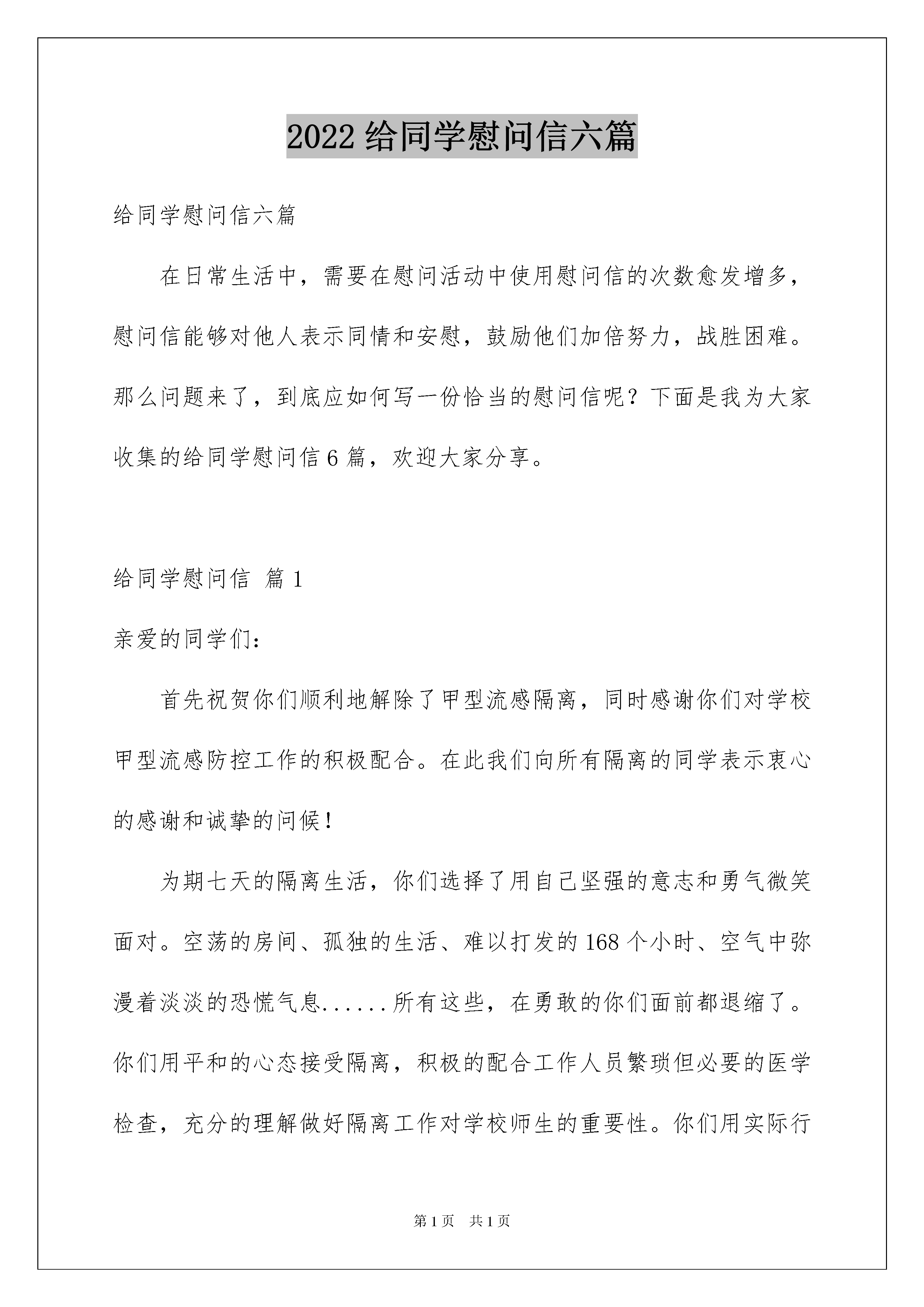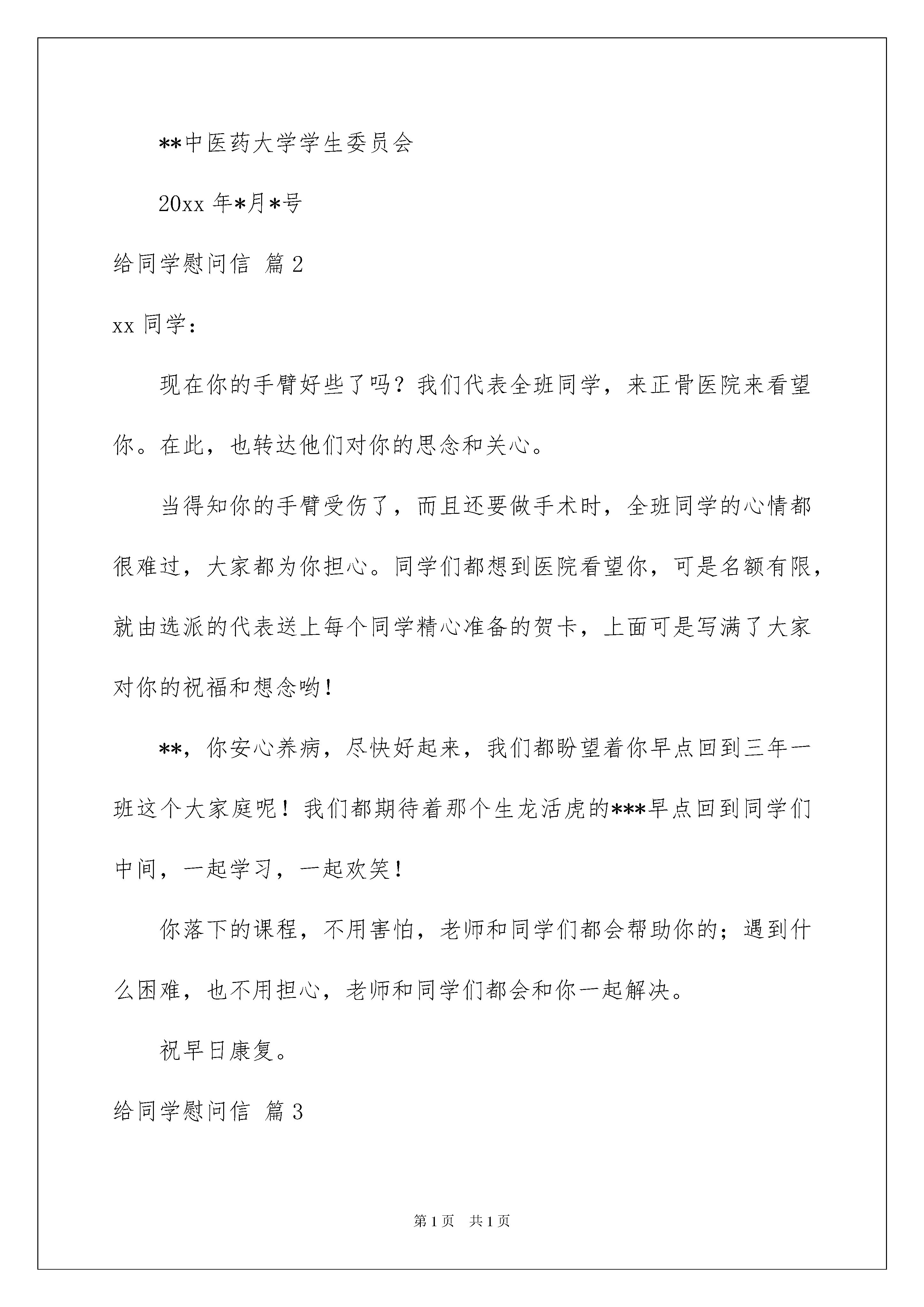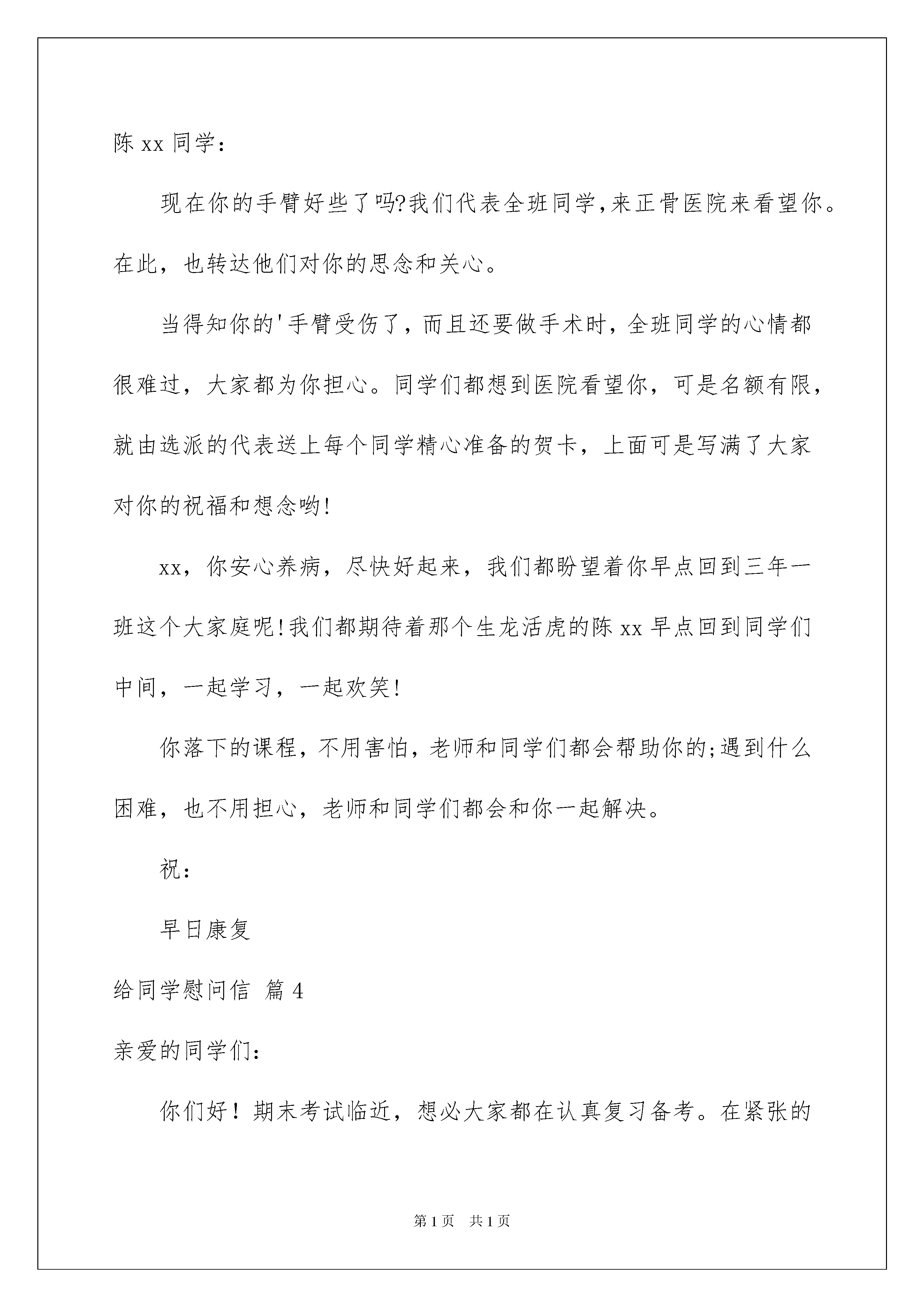 2022给同学慰问信六篇给同学慰问信六篇在日常生活中,需要在慰问活动中使用慰问信的次数愈发增多,慰问信能够对他人表示同情和安慰,鼓励他们加倍努力,战胜困难。那么问题来了,到底应如何写一份恰当的慰问信呢?下面是我为大家收集的给同学慰问信6篇,欢迎大家分享。给同学慰问信篇1亲爱的同学们:首先祝贺你们顺利地解除了甲型流感隔离,同时感谢你们对学校甲型流感防控工作的积极配合。在此我们向所有隔离的同学表示衷心的感谢和诚挚的问候!为期七天的隔离生活,你们选择了用自己坚强的意志和勇气微笑面对。空荡的房间、孤独的生活、难以打发的168个小时、空气中弥漫着淡淡的恐慌气息......所有这些,在勇敢的你们面前都退缩了。你们用平和的心态接受隔离,积极的配合工作人员繁琐但必要的医学检查,充分的理解做好隔离工作对学校师生的重要性。你们用实际行动展现了浙中学子的风采,展示出一个医学院学生所持有的高度的医疗防范意识!在你们被隔离的这段时间里,我们全校广大师生都时刻关注着你们,关心着你们。学校领导高度重视,专门成立了甲型流感防控工作小组,并抽调专家组成中医专家组到隔离点对被隔离观察的部分同学进行现场把脉和问诊,提出诊疗意见。学校还为隔离点设立了医疗服务队,做好被隔离同学的日常身体检查和诊疗工作,同时安排专门的工作人员照顾被隔离同学的饮食起居,这些都为同学们的早日康复提供了很好的保障。同学们,甲型流感,可防可控可治,不可怕!因此我们没有必要对甲型流感赶到不安和恐惧,只要防护措施到位,治疗得当,一定是可以治愈的。希望你们在解除隔离之后,了解和掌握甲型流感的各种预防措施,继续保持高度的警惕,绝不松懈,并且结合自己的亲身经历和体会,向同学们广泛宣传预防甲型流感工作的重要性和紧迫性,积极配合学校做好各项甲型流感的防控工作。也希望你们在今后的日子里,坚持体育锻炼,增强身体免疫力,全面提高自身体质。祝你们健康快乐,学习进步!**中医药大学学生委员会20xx年*月*号给同学慰问信篇2xx同学:现在你的手臂好些了吗?我们代表全班同学,来正骨医院来看望你。在此,也转达他们对你的思念和关心。当得知你的手臂受伤了,而且还要做手术时,全班同学的心情都很难过,大家都为你担心。同学们都想到医院看望你,可是名额有限,就由选派的代表送上每个同学精心准备的贺卡,上面可是写满了大家对你的祝福和想念哟!**,你安心养病,尽快好起来,我们都盼望着你早点回到三年一班这个大家庭呢!我们都期待着那个生龙活虎的***早点回到同学们中间,一起学习,一起欢笑!你落下的课程,不用害怕,老师和同学们都会帮助你的;遇到什么困难,也不用担心,老师和同学们都会和你一起解决。祝早日康复。给同学慰问信篇3陈xx同学:现在你的手臂好些了吗?我们代表全班同学,来正骨医院来看望你。在此,也转达他们对你的思念和关心。当得知你的'手臂受伤了,而且还要做手术时,全班同学的心情都很难过,大家都为你担心。同学们都想到医院看望你,可是名额有限,就由选派的代表送上每个同学精心准备的贺卡,上面可是写满了大家对你的祝福和想念哟!xx,你安心养病,尽快好起来,我们都盼望着你早点回到三年一班这个大家庭呢!我们都期待着那个生龙活虎的陈xx早点回到同学们中间,一起学习,一起欢笑!你落下的课程,不用害怕,老师和同学们都会帮助你的;遇到什么困难,也不用担心,老师和同学们都会和你一起解决。祝:早日康复给同学慰问信篇4亲爱的同学们:你们好!期末考试临近,想必大家都在认真复习备考。在紧张的期末考试后,轻松的寒假生活就要开始了,你准备好了吗?相信假期间同学们会返家探亲、社交、旅游、社会实践等,随着活动的增多,为使大家能够安全、健康、充实地度过这个寒假,特别提醒同学们注意以下几点:一、在校期间注意事项1.注意个人财务的保管。寒假期间校园内有留校的同学,各地同学之间来往相对比较复杂。各位留校同学一定要注意人身安全、宿舍安全、物品安全,防止盗窃、抢劫、受骗等事件的发生。自习时要注意保管好个人贵重物品,不要随意乱放,以防被人顺手牵羊。2.注意学习、生活的中的个人安全。学习之余,要注意自己的生活安全。无论校内校外,一定要注意饮食卫生,以免产生意外;生病及时去医院,以免耽误病情;严格遵守宿舍管理的各项规定,安全使用电器,宿舍内不留宿外来人员;外出遵守交通规则,最好结伴而行;提高辨别能力,防止电信诈骗;处理好同学关系,防止出现纠纷,有突发情况及时向老师或学校保卫部门联系。二、外出旅程注意事项1.注意旅途中的各项安全。不论是回家还是外出,同学们都应该时刻注意路途安全,包括:注意交通安全,不乘坐非法运营车辆;在回家旅途时要时刻注意自