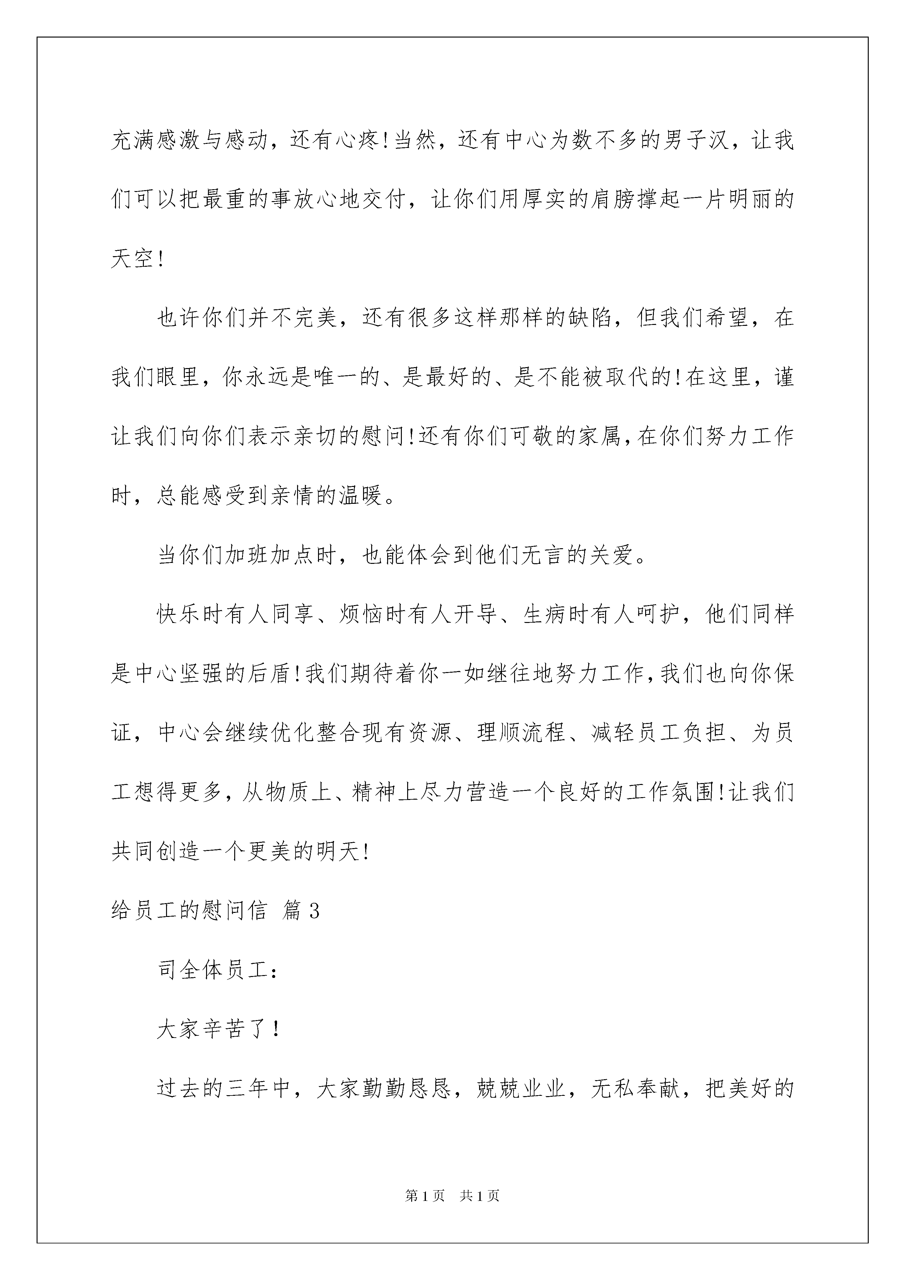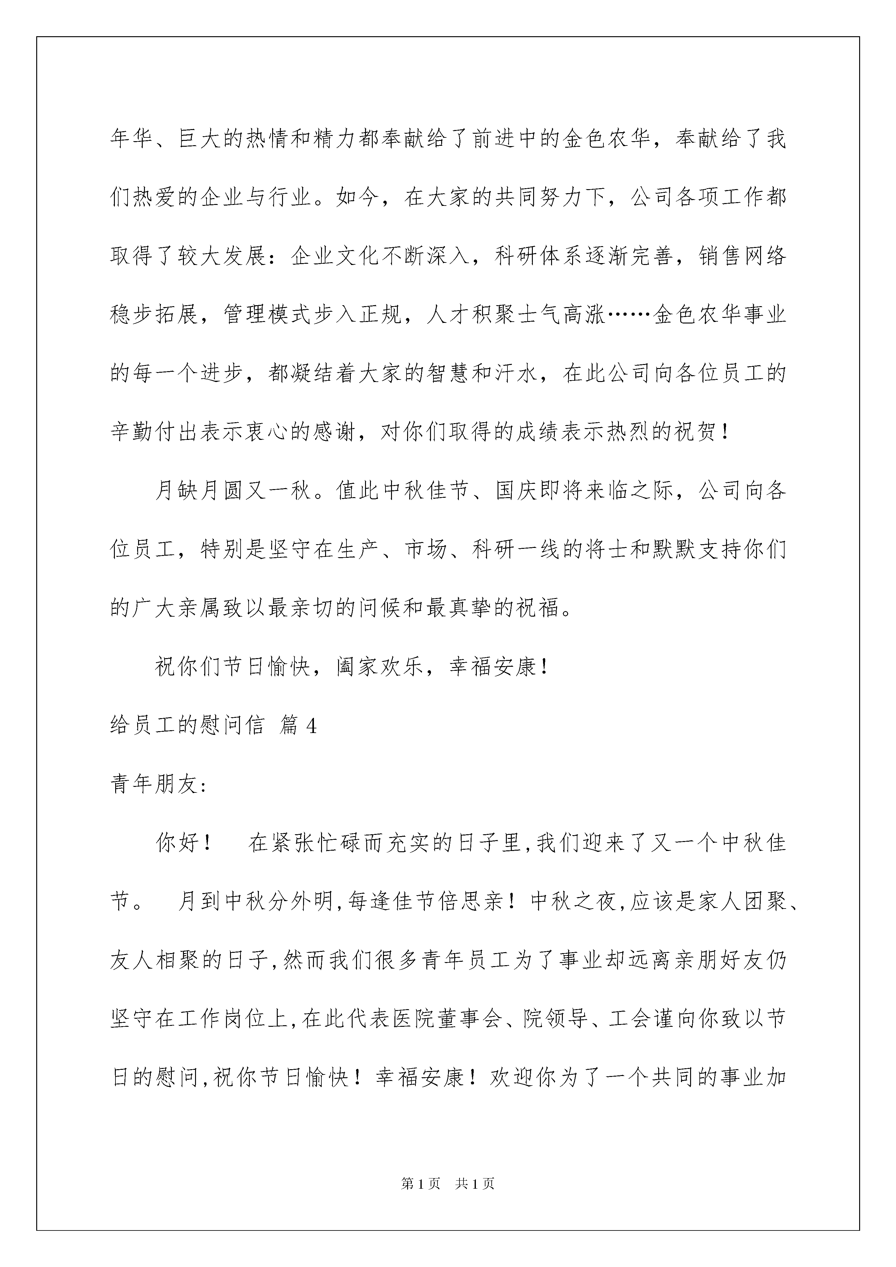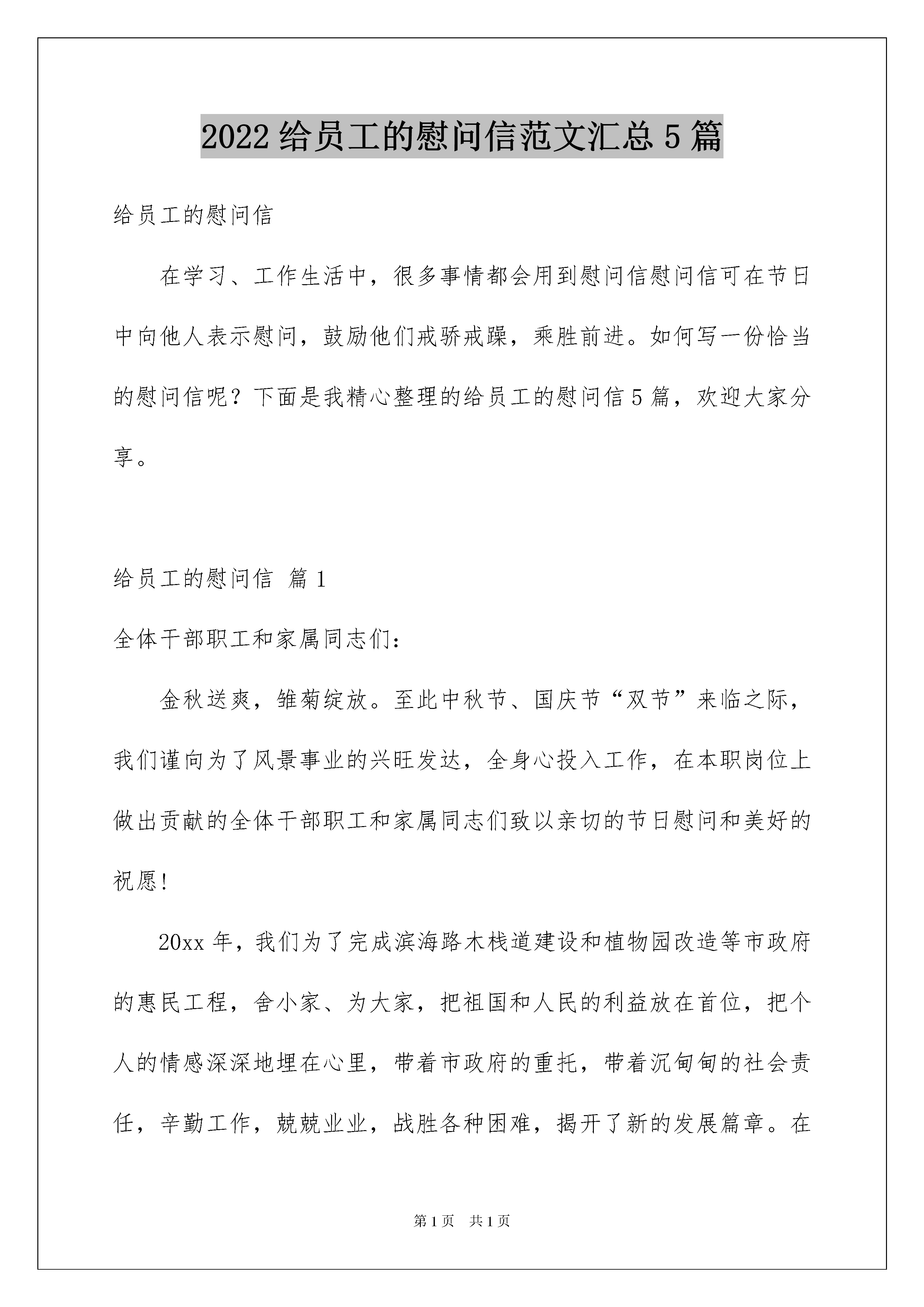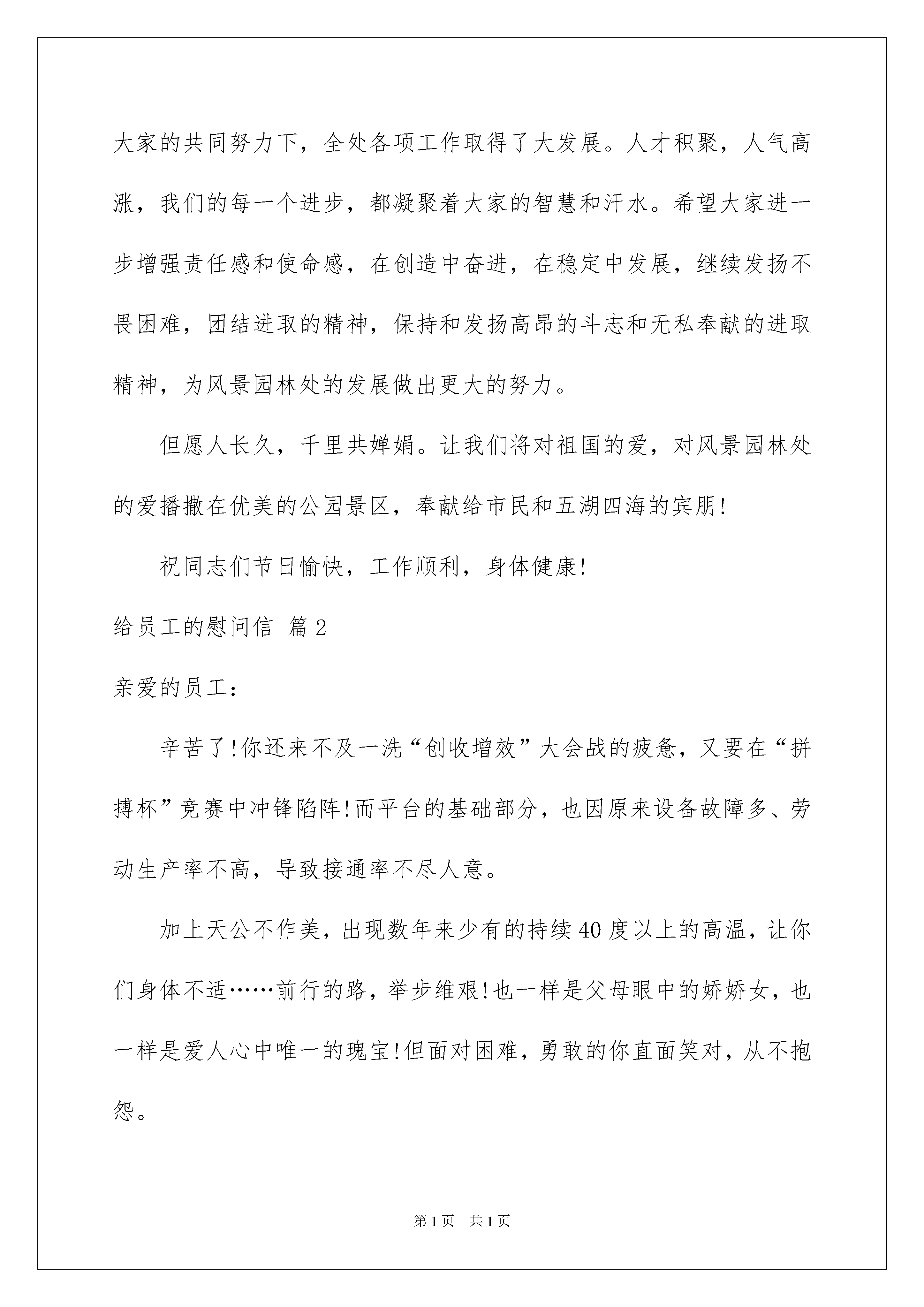 2022给员工的慰问信范文汇总5篇给员工的慰问信在学习、工作生活中,很多事情都会用到慰问信慰问信可在节日中向他人表示慰问,鼓励他们戒骄戒躁,乘胜前进。如何写一份恰当的慰问信呢?下面是我精心整理的给员工的慰问信5篇,欢迎大家分享。给员工的慰问信篇1全体干部职工和家属同志们:金秋送爽,雏菊绽放。至此中秋节、国庆节“双节”来临之际,我们谨向为了风景事业的兴旺发达,全身心投入工作,在本职岗位上做出贡献的全体干部职工和家属同志们致以亲切的节日慰问和美好的祝愿!20xx年,我们为了完成滨海路木栈道建设和植物园改造等市政府的惠民工程,舍小家、为大家,把祖国和人民的利益放在首位,把个人的情感深深地埋在心里,带着市政府的重托,带着沉甸甸的社会责任,辛勤工作,兢兢业业,战胜各种困难,揭开了新的发展篇章。在大家的共同努力下,全处各项工作取得了大发展。人才积聚,人气高涨,我们的每一个进步,都凝聚着大家的智慧和汗水。希望大家进一步增强责任感和使命感,在创造中奋进,在稳定中发展,继续发扬不畏困难,团结进取的精神,保持和发扬高昂的斗志和无私奉献的进取精神,为风景园林处的发展做出更大的努力。但愿人长久,千里共婵娟。让我们将对祖国的爱,对风景园林处的爱播撒在优美的公园景区,奉献给市民和五湖四海的宾朋!祝同志们节日愉快,工作顺利,身体健康!给员工的慰问信篇2亲爱的员工:辛苦了!你还来不及一洗“创收增效”大会战的疲惫,又要在“拼搏杯”竞赛中冲锋陷阵!而平台的基础部分,也因原来设备故障多、劳动生产率不高,导致接通率不尽人意。加上天公不作美,出现数年来少有的持续40度以上的高温,让你们身体不适……前行的路,举步维艰!也一样是父母眼中的娇娇女,也一样是爱人心中唯一的瑰宝!但面对困难,勇敢的你直面笑对,从不抱怨。年轻的你永不言败,豪情万丈!在誓师大会上,所有的人,用不同的形式,表达了巾帼不让须眉的壮志!那时候,你们每一个人都是美丽的——因为青春的光彩,因为发自心底的`信心,闪烁生光,耀人眼目!为此,配合中心的一系列举措,你们为了接多、接好每一个电话,加班加点、增量补欠。你们不放过每一个商机,主动营销,下班后还自愿上门服务。你们为完成每一个营销任务,顶着烈日酷暑,汗水无数次湿透你们的衣服,有时甚至喝不上一口水,很晚才饿着肚子、拖着一身疲惫回家……因为你们的努力,中心劳动生产率迅速提高,全面完成竞赛任务也露出希望的曙光!同时,你们的协作更加亲密无间:你们有了自己的班委会,不再孤单。你们有了自己的队歌,斗志昂扬。你们有了青翠蓊郁的步步高树,团结向上。你们有了自己的《竞赛简报》,士气高涨!看到宋丽莎7月完成产量26838张、看到周艳一次揽机300台、看到杨灿因急着赶来上班而中暑直至晕倒、看到杨爱玲晒得黝黑如印度姑娘的脸……我们的心中充满感激与感动,还有心疼!当然,还有中心为数不多的男子汉,让我们可以把最重的事放心地交付,让你们用厚实的肩膀撑起一片明丽的天空!也许你们并不完美,还有很多这样那样的缺陷,但我们希望,在我们眼里,你永远是唯一的、是最好的、是不能被取代的!在这里,谨让我们向你们表示亲切的慰问!还有你们可敬的家属,在你们努力工作时,总能感受到亲情的温暖。当你们加班加点时,也能体会到他们无言的关爱。快乐时有人同享、烦恼时有人开导、生病时有人呵护,他们同样是中心坚强的后盾!我们期待着你一如继往地努力工作,我们也向你保证,中心会继续优化整合现有资源、理顺流程、减轻员工负担、为员工想得更多,从物质上、精神上尽力营造一个良好的工作氛围!让我们共同创造一个更美的明天!给员工的慰问信篇3司全体员工:大家辛苦了!过去的三年中,大家勤勤恳恳,兢兢业业,无私奉献,把美好的年华、巨大的热情和精力都奉献给了前进中的金色农华,奉献给了我们热爱的企业与行业。如今,在大家的共同努力下,公司各项工作都取得了较大发展:企业文化不断深入,科研体系逐渐完善,销售网络稳步拓展,管理模式步入正规,人才积聚士气高涨……金色农华事业的每一个进步,都凝结着大家的智慧和汗水,在此公司向各位员工的辛勤付出表示衷心的感谢,对你们取得的成绩表示热烈的祝贺!月缺月圆又一秋。值此中秋佳节、国庆即将来临之际,公司向各位员工,特别是坚守在生产、市场、科研一线的将士和默默支持你们的广大亲属致以最亲切的问候和最真挚的祝福。祝你们节日愉快,阖家欢乐,幸福安康!给员工的慰问信篇4青年朋友:你好!在紧张忙碌而充实的日子里,我们迎来了又一个中秋佳节。月到中秋分外明,每逢佳节倍思亲!中秋之夜,应该是家人团聚、友人相聚的日子,然而我们很多青年员工为了事业却远离亲朋好友仍坚守在工作岗位上,在此代表医