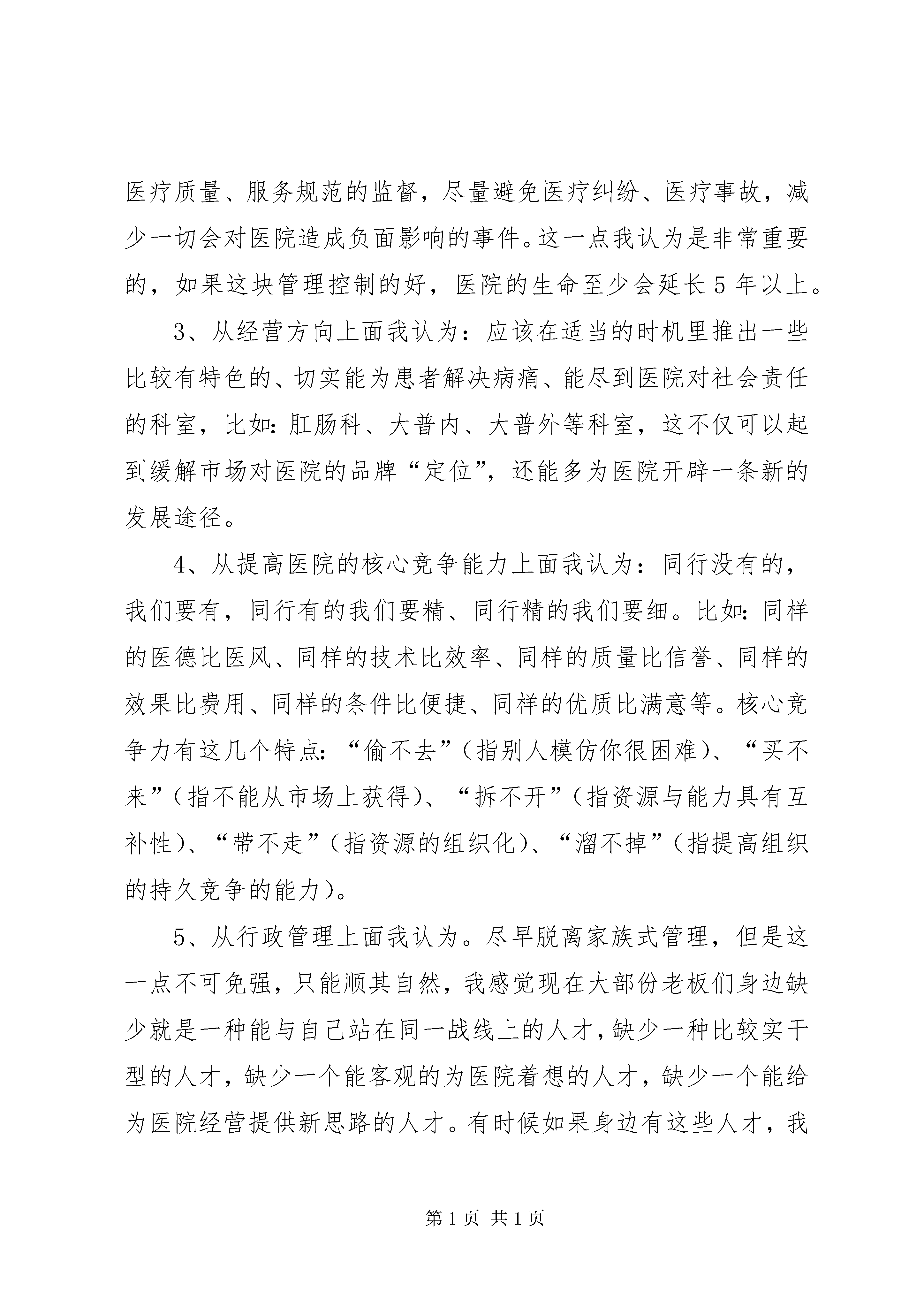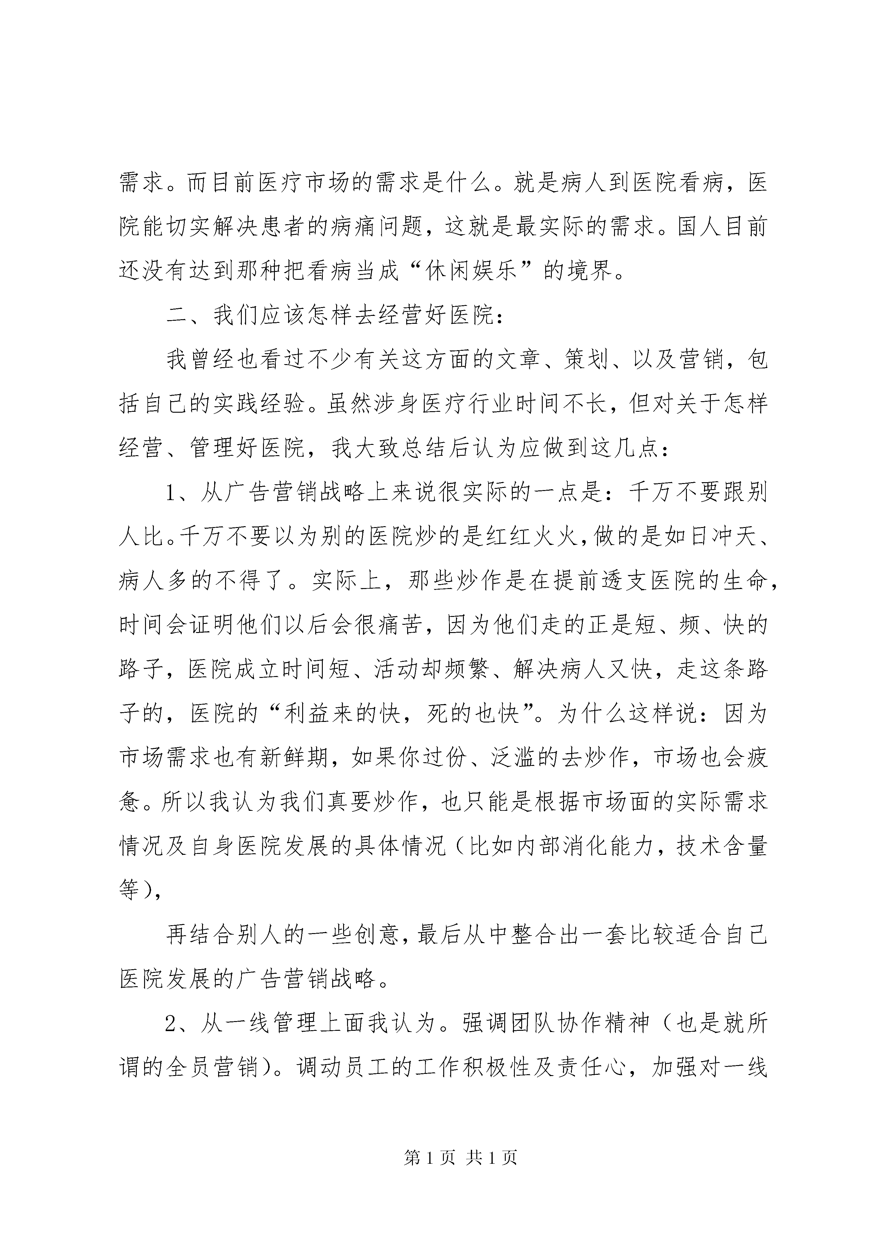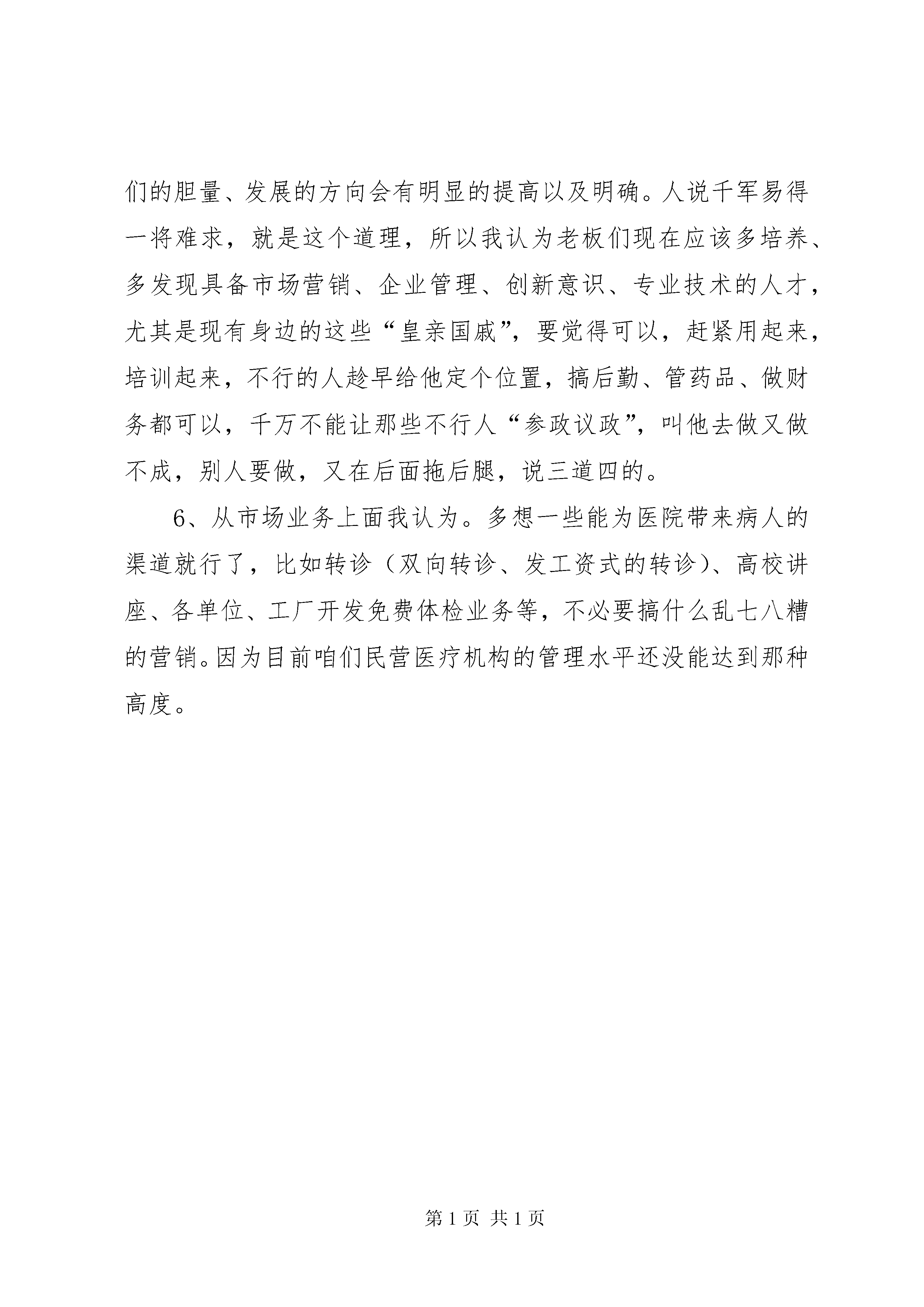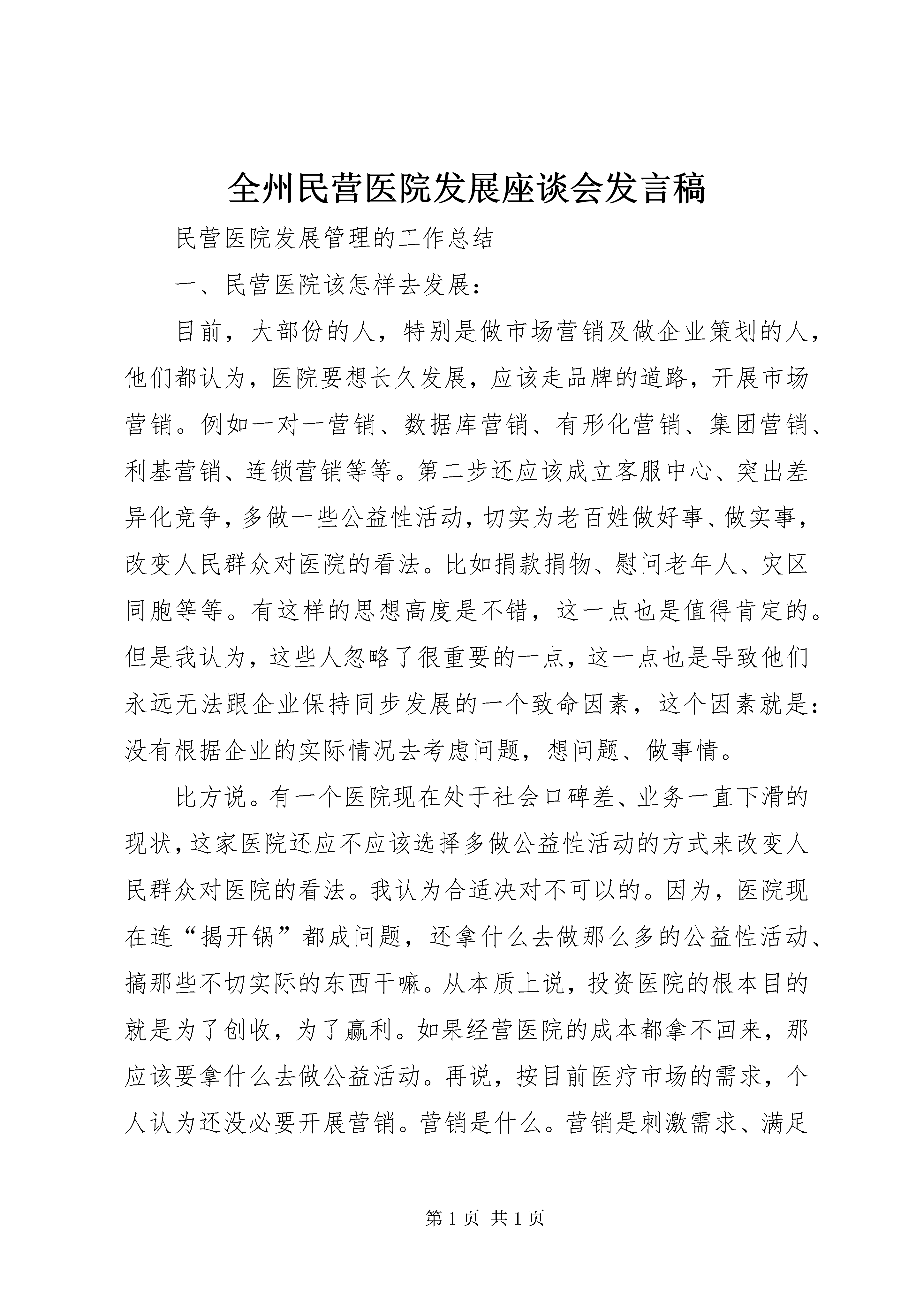 全州民营医院发展座谈会发言稿民营医院发展管理的工作总结一、民营医院该怎样去发展:目前,大部份的人,特别是做市场营销及做企业策划的人,他们都认为,医院要想长久发展,应该走品牌的道路,开展市场营销。例如一对一营销、数据库营销、有形化营销、集团营销、利基营销、连锁营销等等。第二步还应该成立客服中心、突出差异化竞争,多做一些公益性活动,切实为老百姓做好事、做实事,改变人民群众对医院的看法。比如捐款捐物、慰问老年人、灾区同胞等等。有这样的思想高度是不错,这一点也是值得肯定的。但是我认为,这些人忽略了很重要的一点,这一点也是导致他们永远无法跟企业保持同步发展的一个致命因素,这个因素就是:没有根据企业的实际情况去考虑问题,想问题、做事情。比方说。有一个医院现在处于社会口碑差、业务一直下滑的现状,这家医院还应不应该选择多做公益性活动的方式来改变人民群众对医院的看法。我认为合适决对不可以的。因为,医院现在连“揭开锅”都成问题,还拿什么去做那么多的公益性活动、搞那些不切实际的东西干嘛。从本质上说,投资医院的根本目的就是为了创收,为了赢利。如果经营医院的成本都拿不回来,那应该要拿什么去做公益活动。再说,按目前医疗市场的需求,个人认为还没必要开展营销。营销是什么。营销是刺激需求、满足需求。而目前医疗市场的需求是什么。就是病人到医院看病,医院能切实解决患者的病痛问题,这就是最实际的需求。国人目前还没有达到那种把看病当成“休闲娱乐”的境界。二、我们应该怎样去经营好医院:我曾经也看过不少有关这方面的文章、策划、以及营销,包括自己的实践经验。虽然涉身医疗行业时间不长,但对关于怎样经营、管理好医院,我大致总结后认为应做到这几点:1、从广告营销战略上来说很实际的一点是:千万不要跟别人比。千万不要以为别的医院炒的是红红火火,做的是如日冲天、病人多的不得了。实际上,那些炒作是在提前透支医院的生命,时间会证明他们以后会很痛苦,因为他们走的正是短、频、快的路子,医院成立时间短、活动却频繁、解决病人又快,走这条路子的,医院的“利益来的快,死的也快”。为什么这样说:因为市场需求也有新鲜期,如果你过份、泛滥的去炒作,市场也会疲惫。所以我认为我们真要炒作,也只能是根据市场面的实际需求情况及自身医院发展的具体情况(比如内部消化能力,技术含量等),再结合别人的一些创意,最后从中整合出一套比较适合自己医院发展的广告营销战略。2、从一线管理上面我认为。强调团队协作精神(也是就所谓的全员营销)。调动员工的工作积极性及责任心,加强对一线医疗质量、服务规范的监督,尽量避免医疗纠纷、医疗事故,减少一切会对医院造成负面影响的事件。这一点我认为是非常重要的,如果这块管理控制的好,医院的生命至少会延长5年以上。3、从经营方向上面我认为:应该在适当的时机里推出一些比较有特色的、切实能为患者解决病痛、能尽到医院对社会责任的科室,比如:肛肠科、大普内、大普外等科室,这不仅可以起到缓解市场对医院的品牌“定位”,还能多为医院开辟一条新的发展途径。4、从提高医院的核心竞争能力上面我认为:同行没有的,我们要有,同行有的我们要精、同行精的我们要细。比如:同样的医德比医风、同样的技术比效率、同样的质量比信誉、同样的效果比费用、同样的条件比便捷、同样的优质比满意等。核心竞争力有这几个特点:“偷不去”(指别人模仿你很困难)、“买不来”(指不能从市场上获得)、“拆不开”(指资源与能力具有互补性)、“带不走”(指资源的组织化)、“溜不掉”(指提高组织的持久竞争的能力)。5、从行政管理上面我认为。尽早脱离家族式管理,但是这一点不可免强,只能顺其自然,我感觉现在大部份老板们身边缺少就是一种能与自己站在同一战线上的人才,缺少一种比较实干型的人才,缺少一个能客观的为医院着想的人才,缺少一个能给为医院经营提供新思路的人才。有时候如果身边有这些人才,我们的胆量、发展的方向会有明显的提高以及明确。人说千军易得一将难求,就是这个道理,所以我认为老板们现在应该多培养、多发现具备市场营销、企业管理、创新意识、专业技术的人才,尤其是现有身边的这些“皇亲国戚”,要觉得可以,赶紧用起来,培训起来,不行的人趁早给他定个位置,搞后勤、管药品、做财务都可以,千万不能让那些不行人“参政议政”,叫他去做又做不成,别人要做,又在后面拖后腿,说三道四的。6、从市场业务上面我认为。多想一些能为医院带来病人的渠道就行了,比如转诊(双向转诊、发工资式的转诊)、高校讲座、各单位、工厂开发免费体检业务等,不必要搞什么乱七八糟的营销。因为目前咱们民营医疗机构的管理水平还没能达到那种高度。