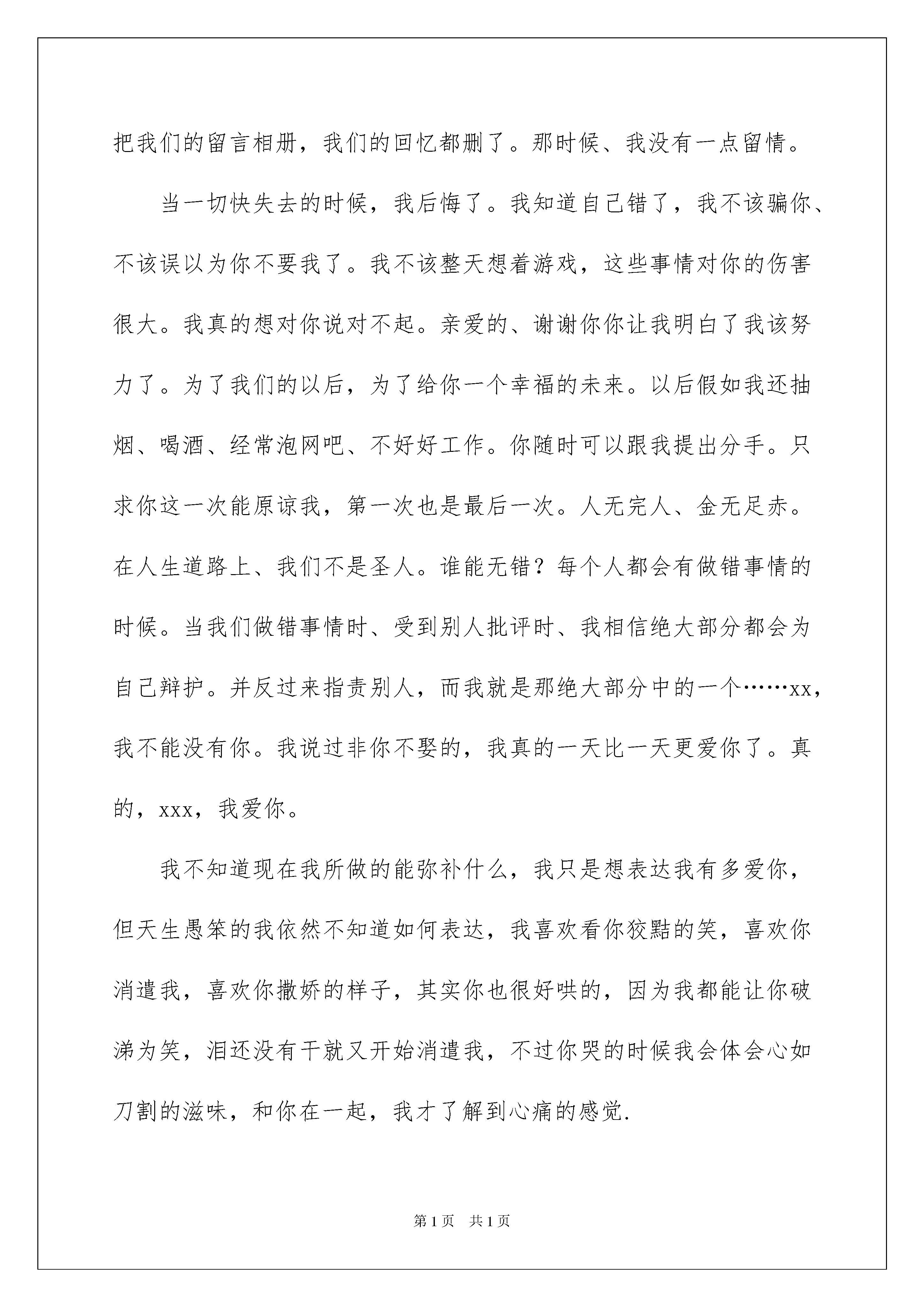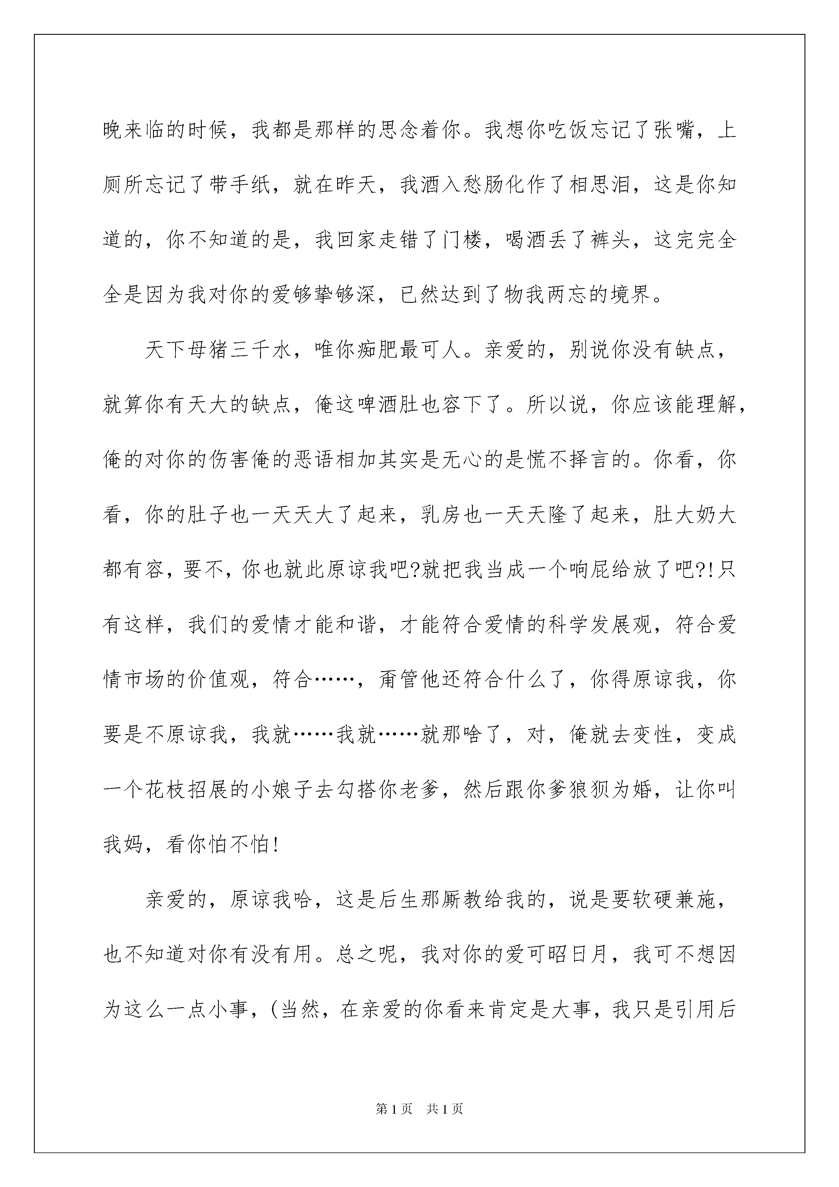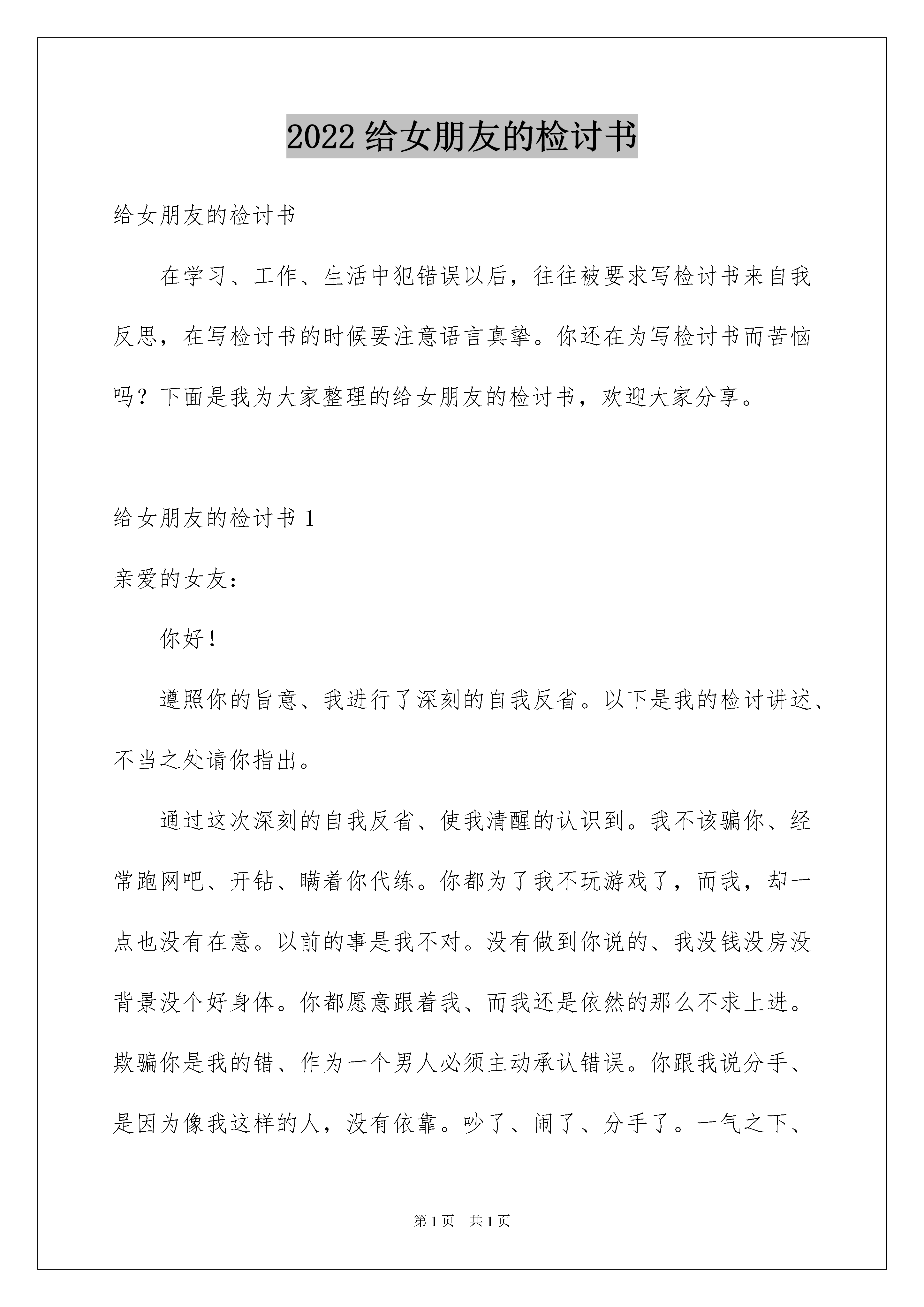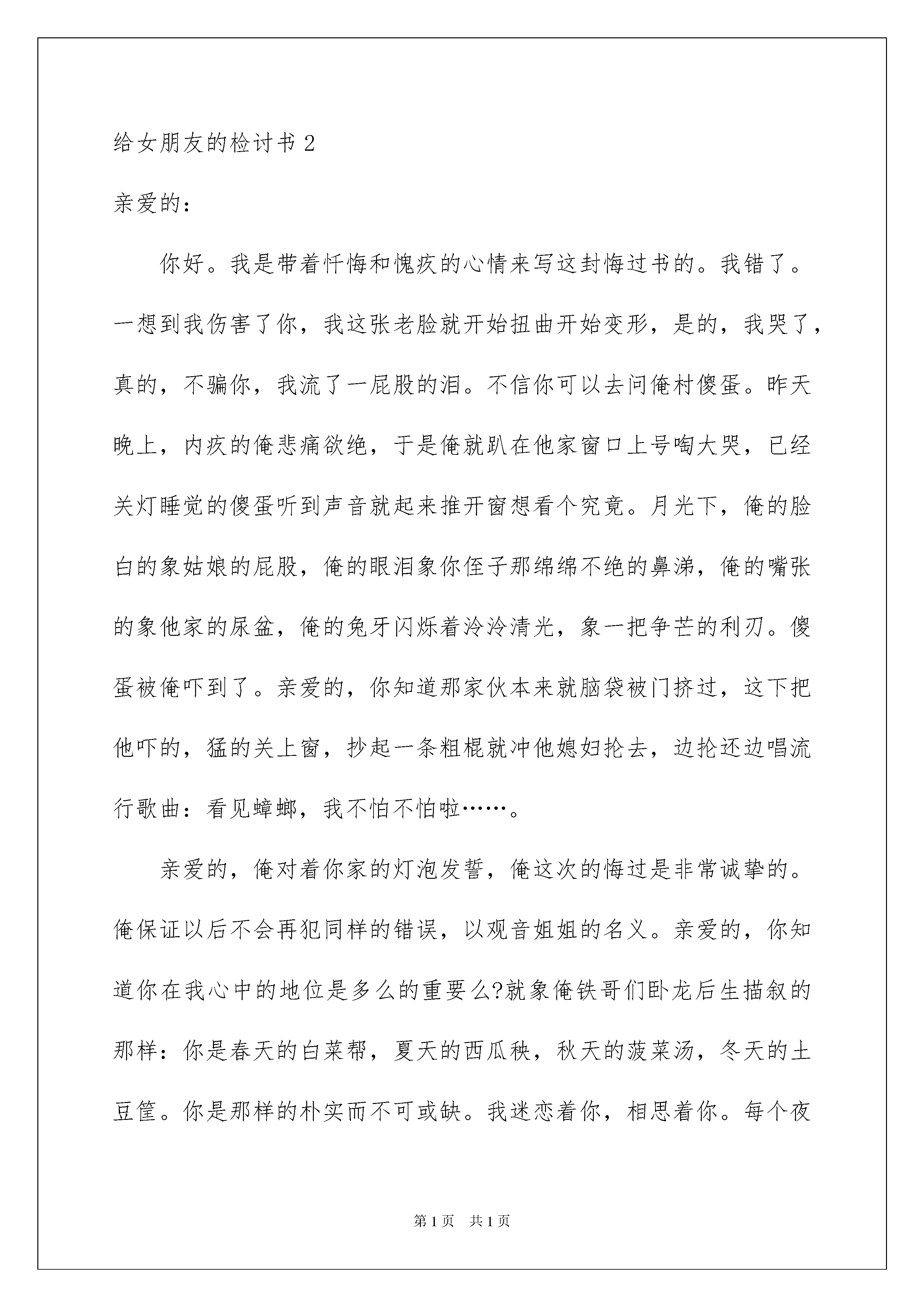 2022给女朋友的检讨书给女朋友的检讨书在学习、工作、生活中犯错误以后,往往被要求写检讨书来自我反思,在写检讨书的时候要注意语言真挚。你还在为写检讨书而苦恼吗?下面是我为大家整理的给女朋友的检讨书,欢迎大家分享。给女朋友的检讨书1亲爱的女友:你好!遵照你的旨意、我进行了深刻的自我反省。以下是我的检讨讲述、不当之处请你指出。通过这次深刻的自我反省、使我清醒的认识到。我不该骗你、经常跑网吧、开钻、瞒着你代练。你都为了我不玩游戏了,而我,却一点也没有在意。以前的事是我不对。没有做到你说的、我没钱没房没背景没个好身体。你都愿意跟着我、而我还是依然的那么不求上进。欺骗你是我的错、作为一个男人必须主动承认错误。你跟我说分手、是因为像我这样的人,没有依靠。吵了、闹了、分手了。一气之下、把我们的留言相册,我们的回忆都删了。那时候、我没有一点留情。当一切快失去的时候,我后悔了。我知道自己错了,我不该骗你、不该误以为你不要我了。我不该整天想着游戏,这些事情对你的伤害很大。我真的想对你说对不起。亲爱的、谢谢你你让我明白了我该努力了。为了我们的以后,为了给你一个幸福的未来。以后假如我还抽烟、喝酒、经常泡网吧、不好好工作。你随时可以跟我提出分手。只求你这一次能原谅我,第一次也是最后一次。人无完人、金无足赤。在人生道路上、我们不是圣人。谁能无错?每个人都会有做错事情的时候。当我们做错事情时、受到别人批评时、我相信绝大部分都会为自己辩护。并反过来指责别人,而我就是那绝大部分中的一个……xx,我不能没有你。我说过非你不娶的,我真的一天比一天更爱你了。真的,xxx,我爱你。我不知道现在我所做的能弥补什么,我只是想表达我有多爱你,但天生愚笨的我依然不知道如何表达,我喜欢看你狡黠的笑,喜欢你消遣我,喜欢你撒娇的样子,其实你也很好哄的,因为我都能让你破涕为笑,泪还没有干就又开始消遣我,不过你哭的时候我会体会心如刀割的滋味,和你在一起,我才了解到心痛的感觉.亲爱的,我错了,以后再也不玩游戏了!我知道,你是我生命中最重要的两个女人之一,而游戏,只是我众多娱乐方式的其中一个。对于我沉迷游戏而忽略了你让你不高兴的事情,我先郑重地道歉:对不起!以下的话,都是真心的。我不能说我再也不玩游戏了,就如同你不能再也不去淘宝再也不看娱乐新闻一样,但是,我能做到的是,在不忽略你的前提下玩,在你觉得我可以娱乐的时间里玩。我是真心的做出允诺,希望你也能谅解我。另外,你不要吃游戏的醋噢,我最爱你啦。希望你能多谅解我一点,帮我一起改过嘛,好吗?我亲爱的。也许现在拿我跟人家比,你会觉得我什么都不好,但是我有一颗真的爱你的心,不论时间空间如何的转变,我都爱你,永远的爱你!在我们以后的日子里,我一定会用我全部的热情投入进关于你的一切,不再让你失望。此致敬礼!检讨人:xxx20xx年xx月xx日给女朋友的检讨书2亲爱的:你好。我是带着忏悔和愧疚的心情来写这封悔过书的。我错了。一想到我伤害了你,我这张老脸就开始扭曲开始变形,是的,我哭了,真的,不骗你,我流了一屁股的泪。不信你可以去问俺村傻蛋。昨天晚上,内疚的俺悲痛欲绝,于是俺就趴在他家窗口上号啕大哭,已经关灯睡觉的傻蛋听到声音就起来推开窗想看个究竟。月光下,俺的脸白的象姑娘的屁股,俺的眼泪象你侄子那绵绵不绝的鼻涕,俺的嘴张的象他家的尿盆,俺的兔牙闪烁着泠泠清光,象一把争芒的利刃。傻蛋被俺吓到了。亲爱的,你知道那家伙本来就脑袋被门挤过,这下把他吓的,猛的关上窗,抄起一条粗棍就冲他媳妇抡去,边抡还边唱流行歌曲:看见蟑螂,我不怕不怕啦……。亲爱的,俺对着你家的灯泡发誓,俺这次的悔过是非常诚挚的。俺保证以后不会再犯同样的错误,以观音姐姐的名义。亲爱的,你知道你在我心中的地位是多么的重要么?就象俺铁哥们卧龙后生描叙的那样:你是春天的白菜帮,夏天的西瓜秧,秋天的菠菜汤,冬天的土豆筐。你是那样的朴实而不可或缺。我迷恋着你,相思着你。每个夜晚来临的时候,我都是那样的思念着你。我想你吃饭忘记了张嘴,上厕所忘记了带手纸,就在昨天,我酒入愁肠化作了相思泪,这是你知道的,你不知道的是,我回家走错了门楼,喝酒丢了裤头,这完完全全是因为我对你的爱够挚够深,已然达到了物我两忘的境界。天下母猪三千水,唯你痴肥最可人。亲爱的,别说你没有缺点,就算你有天大的缺点,俺这啤酒肚也容下了。所以说,你应该能理解,俺的对你的伤害俺的恶语相加其实是无心的是慌不择言的。你看,你看,你的肚子也一天天大了起来,乳房也一天天隆了起来,肚大奶大都有容,要不,你也就此原谅我吧?就把我当成一个响屁给放了吧?!只有这样,我们的爱情才能和谐,才能符合爱情的科学发展