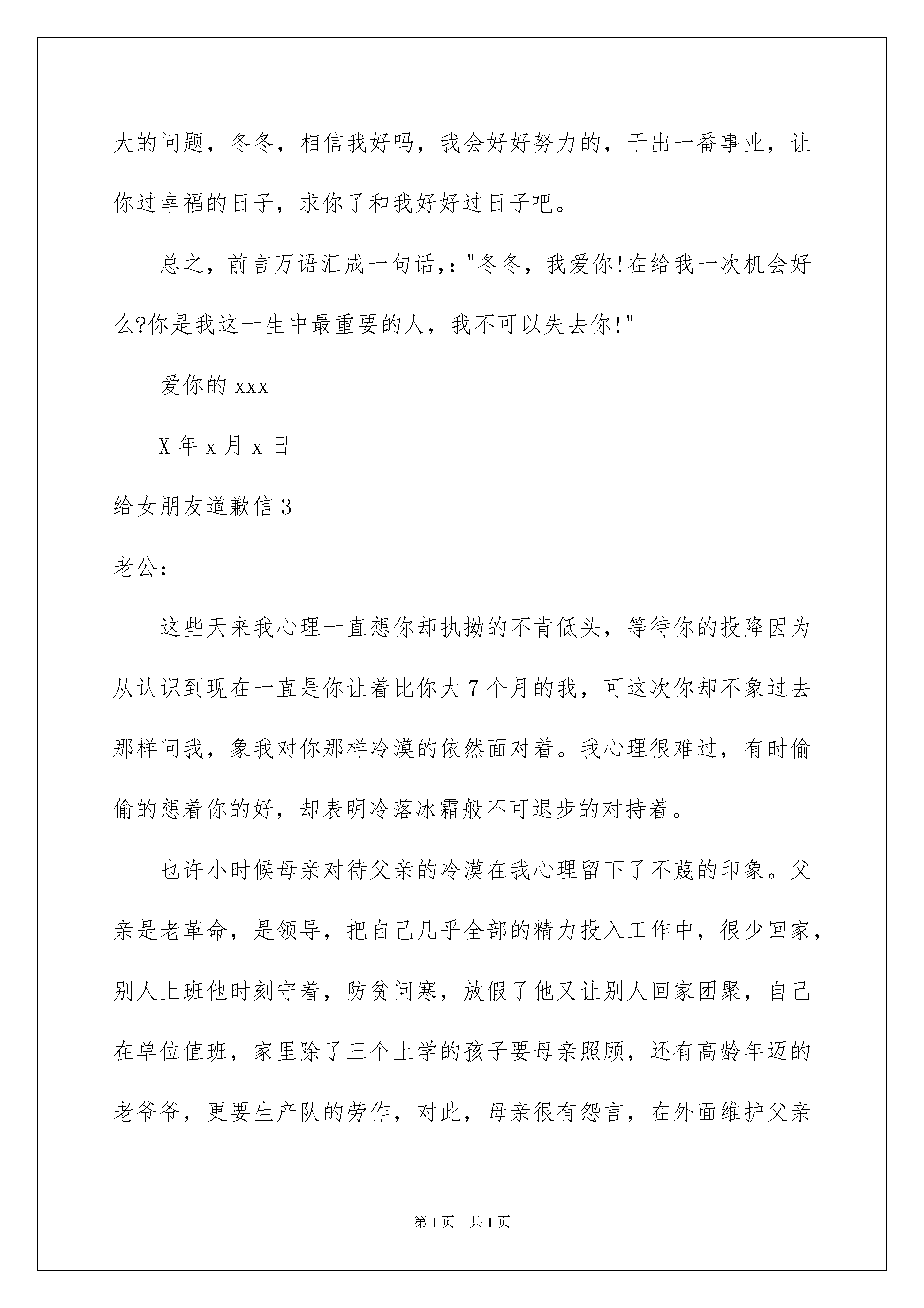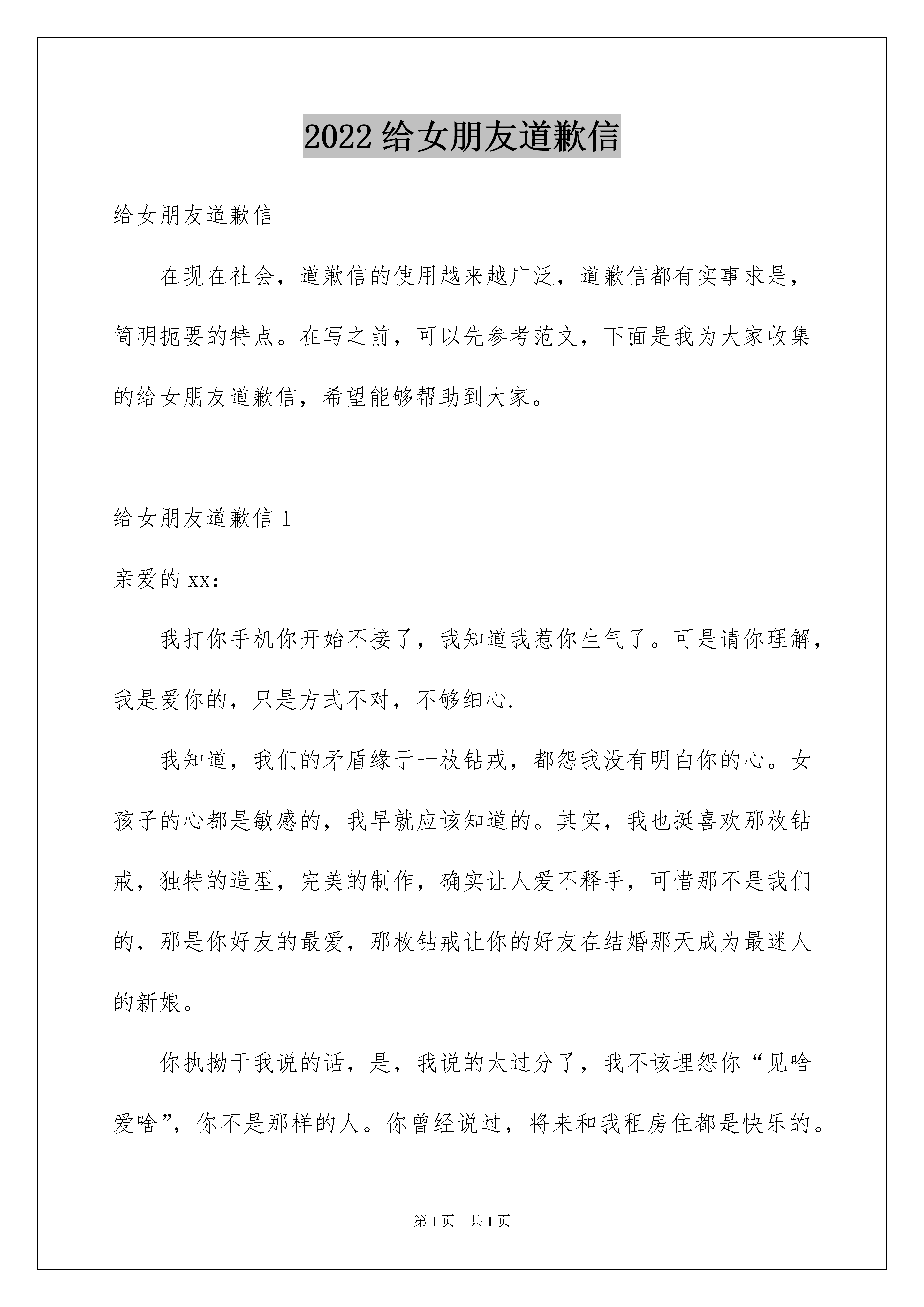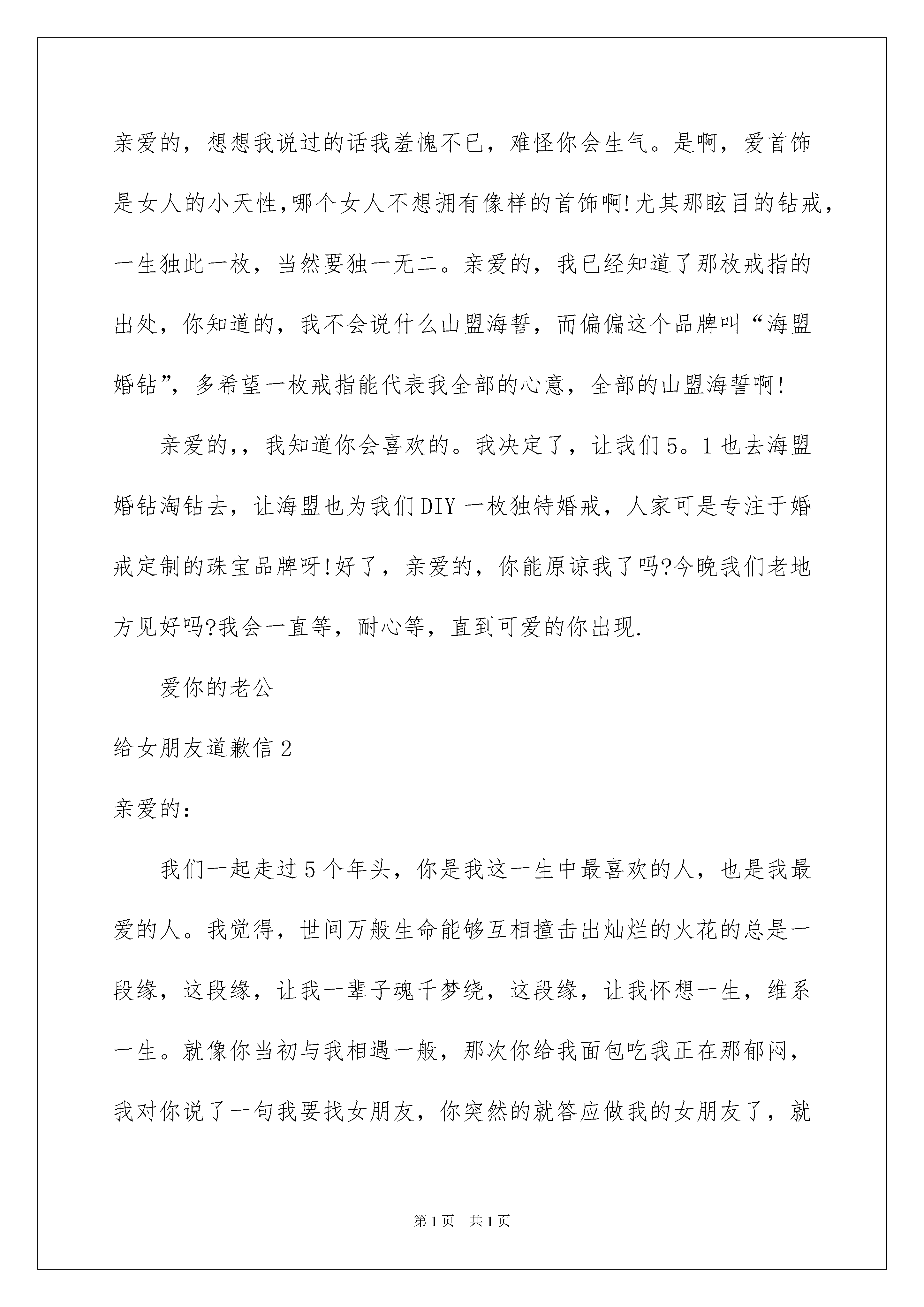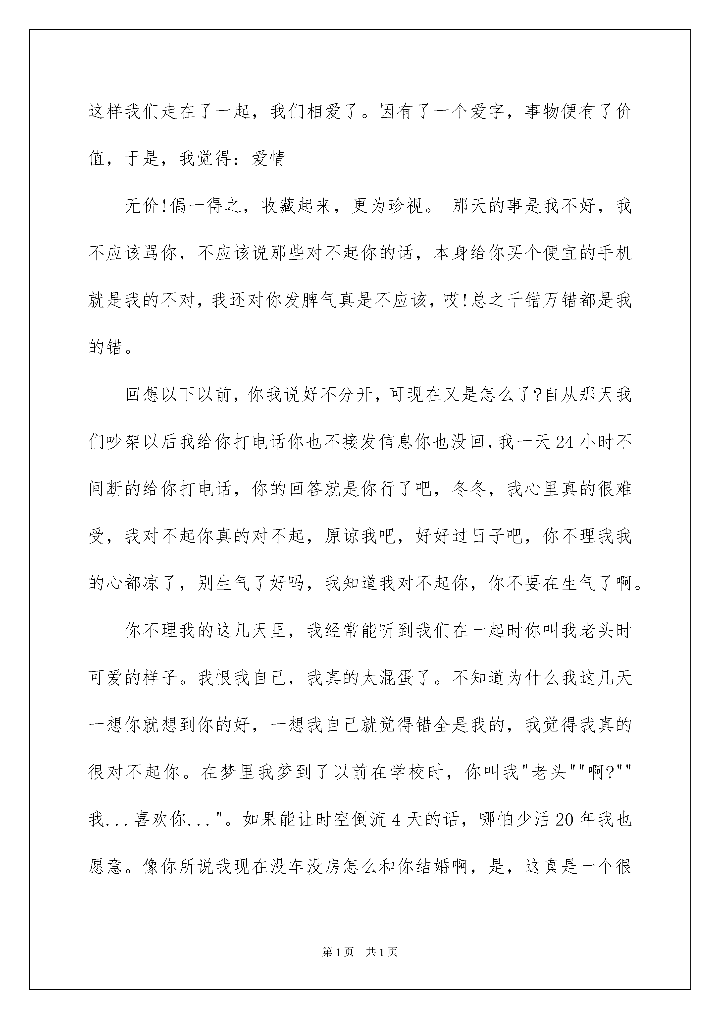 2022给女朋友道歉信给女朋友道歉信在现在社会,道歉信的使用越来越广泛,道歉信都有实事求是,简明扼要的特点。在写之前,可以先参考范文,下面是我为大家收集的给女朋友道歉信,希望能够帮助到大家。给女朋友道歉信1亲爱的xx:我打你手机你开始不接了,我知道我惹你生气了。可是请你理解,我是爱你的,只是方式不对,不够细心.我知道,我们的矛盾缘于一枚钻戒,都怨我没有明白你的心。女孩子的心都是敏感的,我早就应该知道的。其实,我也挺喜欢那枚钻戒,独特的造型,完美的制作,确实让人爱不释手,可惜那不是我们的,那是你好友的最爱,那枚钻戒让你的好友在结婚那天成为最迷人的新娘。你执拗于我说的话,是,我说的太过分了,我不该埋怨你“见啥爱啥”,你不是那样的人。你曾经说过,将来和我租房住都是快乐的。亲爱的,想想我说过的话我羞愧不已,难怪你会生气。是啊,爱首饰是女人的小天性,哪个女人不想拥有像样的首饰啊!尤其那眩目的钻戒,一生独此一枚,当然要独一无二。亲爱的,我已经知道了那枚戒指的出处,你知道的,我不会说什么山盟海誓,而偏偏这个品牌叫“海盟婚钻”,多希望一枚戒指能代表我全部的心意,全部的山盟海誓啊!亲爱的,,我知道你会喜欢的。我决定了,让我们5。1也去海盟婚钻淘钻去,让海盟也为我们DIY一枚独特婚戒,人家可是专注于婚戒定制的珠宝品牌呀!好了,亲爱的,你能原谅我了吗?今晚我们老地方见好吗?我会一直等,耐心等,直到可爱的你出现.爱你的老公给女朋友道歉信2亲爱的:我们一起走过5个年头,你是我这一生中最喜欢的人,也是我最爱的人。我觉得,世间万般生命能够互相撞击出灿烂的火花的总是一段缘,这段缘,让我一辈子魂千梦绕,这段缘,让我怀想一生,维系一生。就像你当初与我相遇一般,那次你给我面包吃我正在那郁闷,我对你说了一句我要找女朋友,你突然的就答应做我的女朋友了,就这样我们走在了一起,我们相爱了。因有了一个爱字,事物便有了价值,于是,我觉得:爱情无价!偶一得之,收藏起来,更为珍视。那天的事是我不好,我不应该骂你,不应该说那些对不起你的话,本身给你买个便宜的手机就是我的不对,我还对你发脾气真是不应该,哎!总之千错万错都是我的错。回想以下以前,你我说好不分开,可现在又是怎么了?自从那天我们吵架以后我给你打电话你也不接发信息你也没回,我一天24小时不间断的给你打电话,你的回答就是你行了吧,冬冬,我心里真的很难受,我对不起你真的对不起,原谅我吧,好好过日子吧,你不理我我的心都凉了,别生气了好吗,我知道我对不起你,你不要在生气了啊。你不理我的这几天里,我经常能听到我们在一起时你叫我老头时可爱的样子。我恨我自己,我真的太混蛋了。不知道为什么我这几天一想你就想到你的好,一想我自己就觉得错全是我的,我觉得我真的很对不起你。在梦里我梦到了以前在学校时,你叫我"老头""啊?""我...喜欢你..."。如果能让时空倒流4天的话,哪怕少活20年我也愿意。像你所说我现在没车没房怎么和你结婚啊,是,这真是一个很大的问题,冬冬,相信我好吗,我会好好努力的,干出一番事业,让你过幸福的日子,求你了和我好好过日子吧。总之,前言万语汇成一句话,:"冬冬,我爱你!在给我一次机会好么?你是我这一生中最重要的人,我不可以失去你!"爱你的xxxX年x月x日给女朋友道歉信3老公:这些天来我心理一直想你却执拗的不肯低头,等待你的投降因为从认识到现在一直是你让着比你大7个月的我,可这次你却不象过去那样问我,象我对你那样冷漠的依然面对着。我心理很难过,有时偷偷的想着你的好,却表明冷落冰霜般不可退步的对持着。也许小时候母亲对待父亲的冷漠在我心理留下了不蔑的印象。父亲是老革命,是领导,把自己几乎全部的精力投入工作中,很少回家,别人上班他时刻守着,防贫问寒,放假了他又让别人回家团聚,自己在单位值班,家里除了三个上学的孩子要母亲照顾,还有高龄年迈的老爷爷,更要生产队的劳作,对此,母亲很有怨言,在外面维护父亲的形象,说他总是很忙,没时间回来。可每次父亲抽空回来,面对的是母亲冷漠没有问候的表情,当然年幼的我又很深的印象,总看不懂,母亲为什么那样恨父亲回来?成家了才体会母亲的心情,她是用冷漠表达自己的守望。也是一种爱的宣泄吧!在三个孩子中,父亲欣慰的是我继承了他的大度,随和,遇事沉稳,老练,可没有发现我有母亲的倔强,甚至自我。过去一直有老公的宠爱让我变得矫情,有时蛮横无理,甚至刚结婚时的无理取闹。知道老公是爱我的,重视我的,却总要拿你给的令箭伤害你,让你满身伤痛,举手投降,那样自己有种成就感。现在你的工作太忙了,没心情,没时间和我闹了,可我还象小姑娘般不肯罢手,总想在婚姻中争当每次的赢家,总