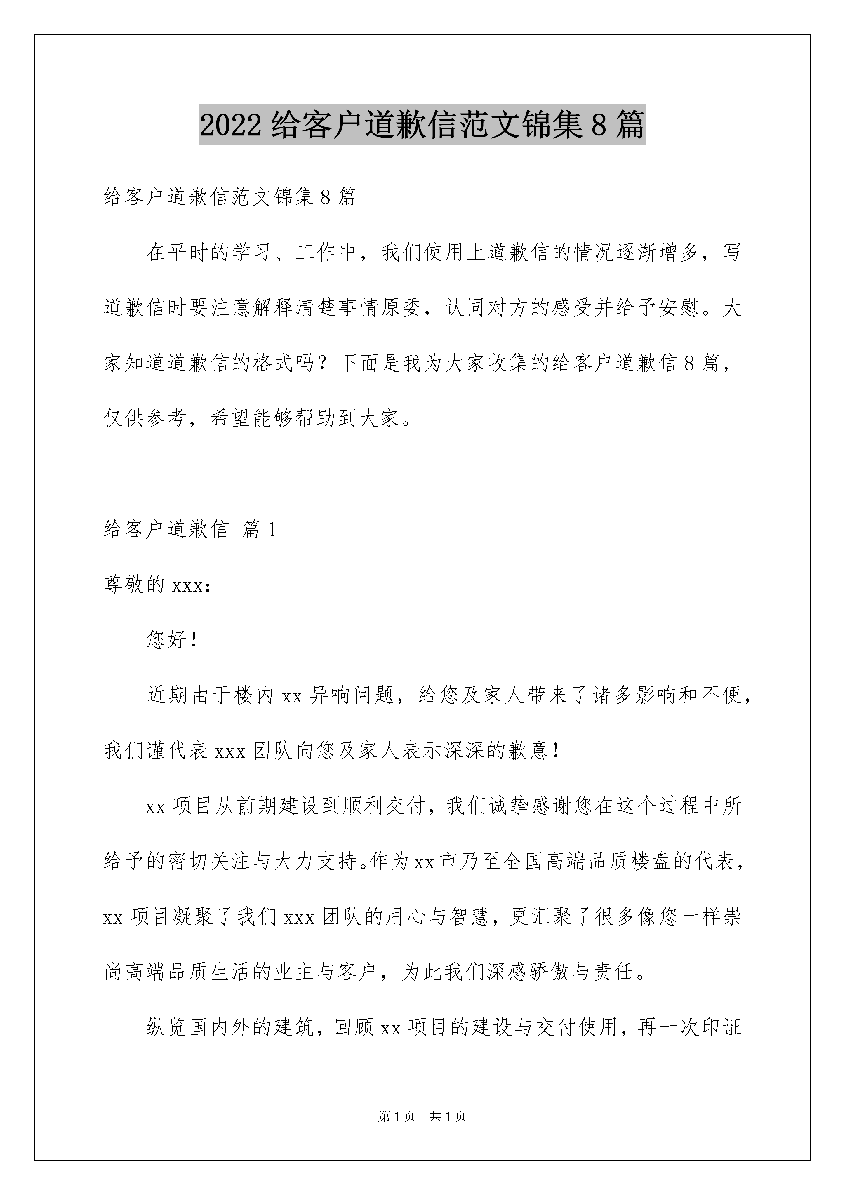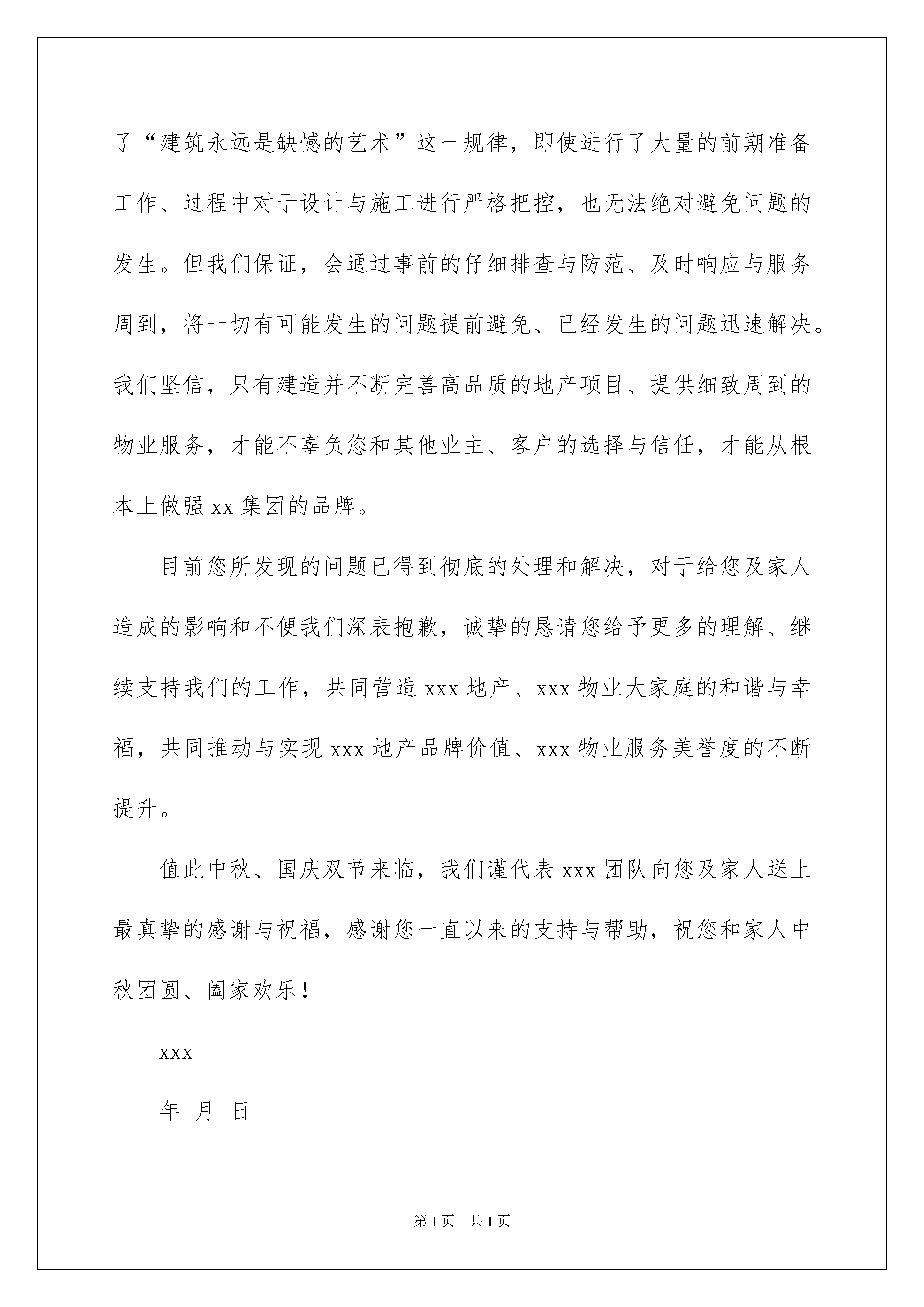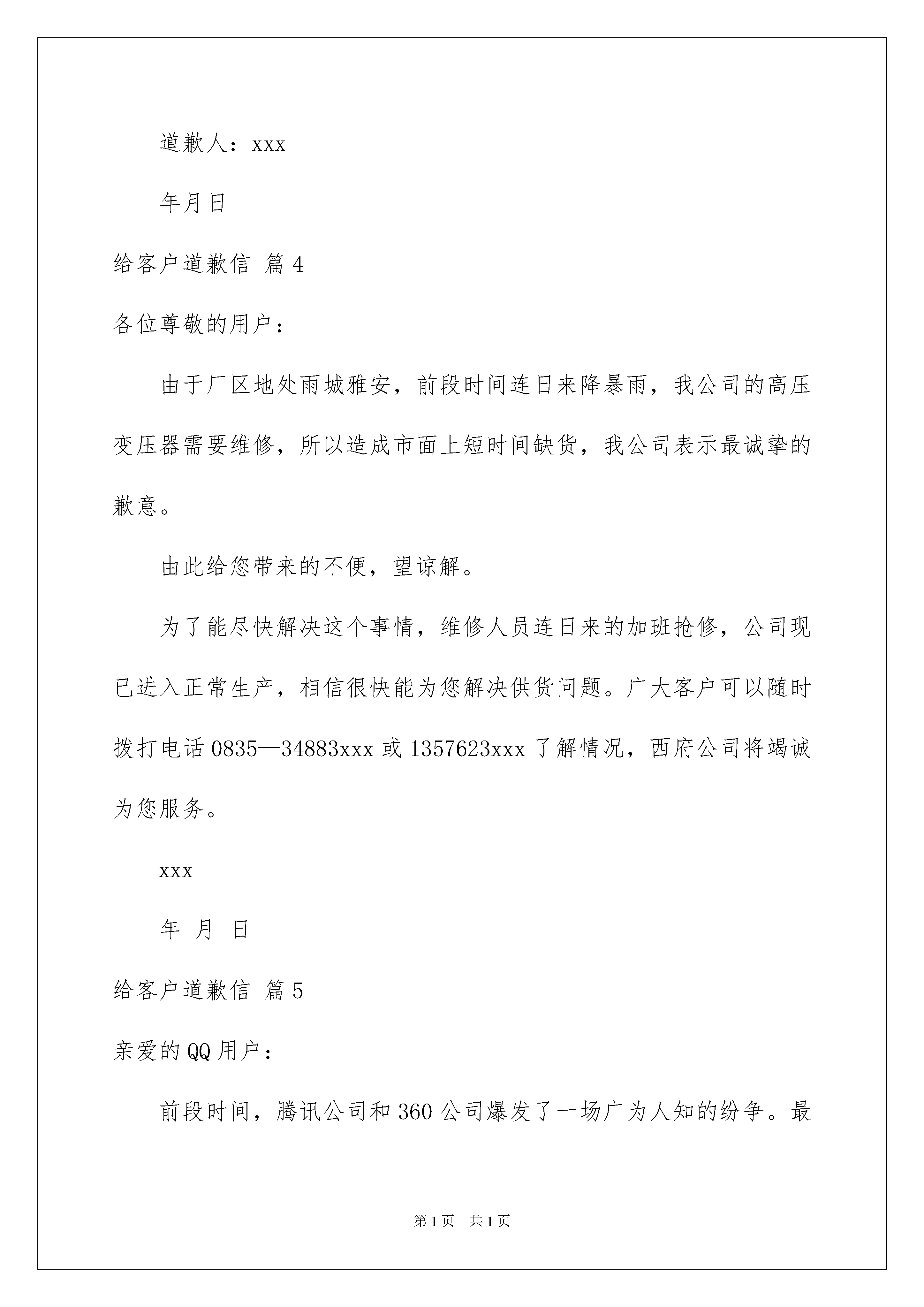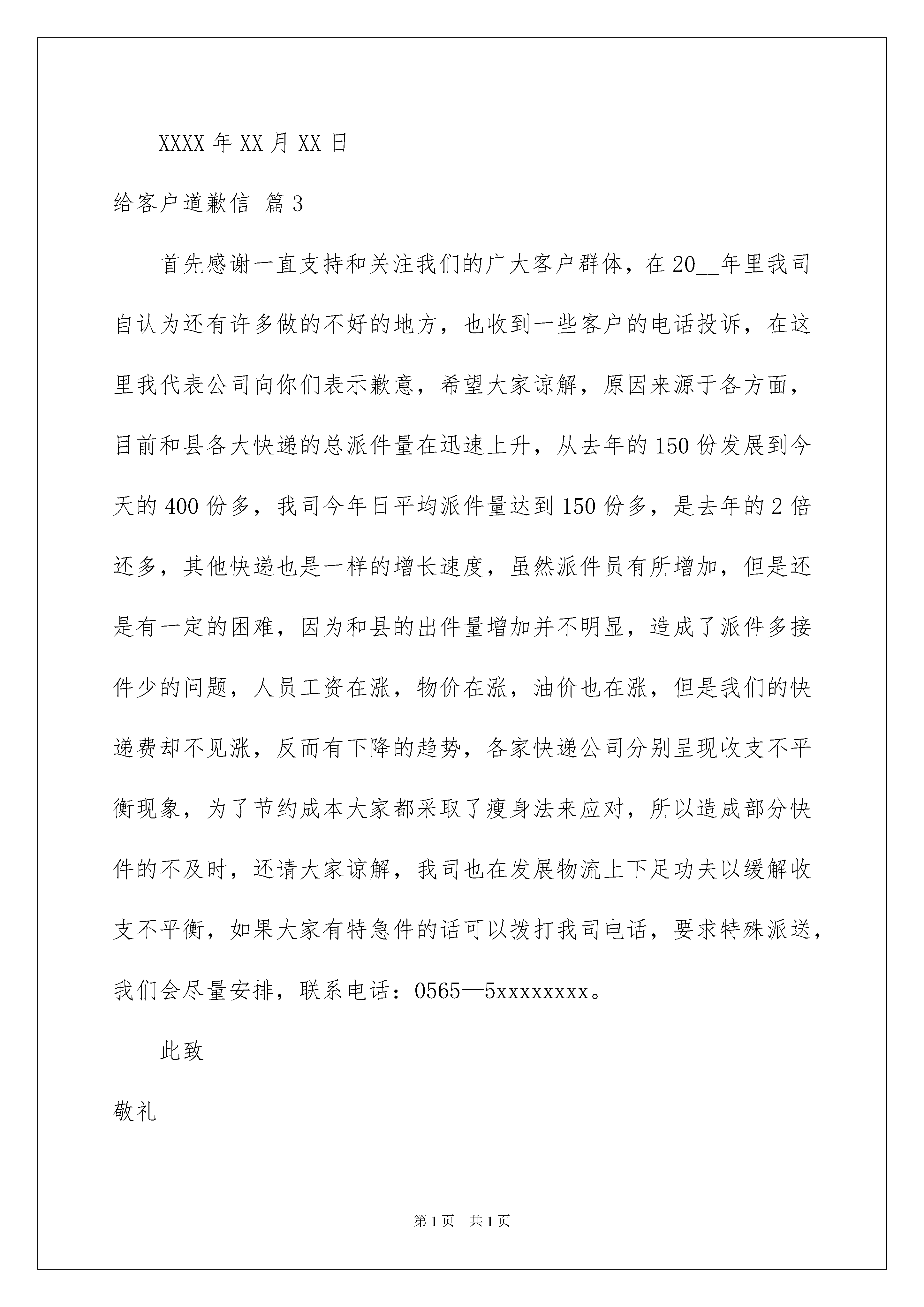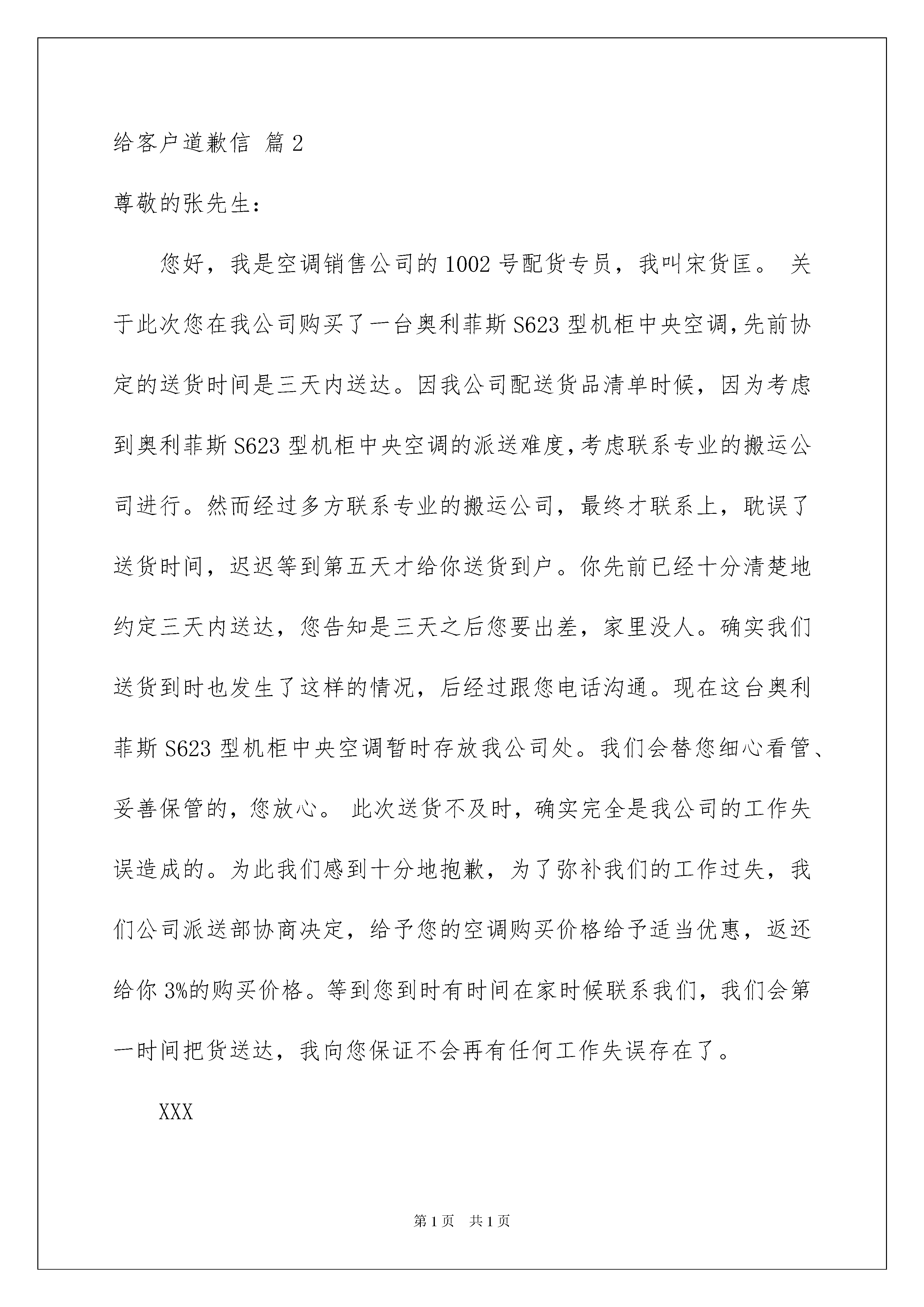2022给客户道歉信范文锦集8篇给客户道歉信范文锦集8篇在平时的学习、工作中,我们使用上道歉信的情况逐渐增多,写道歉信时要注意解释清楚事情原委,认同对方的感受并给予安慰。大家知道道歉信的格式吗?下面是我为大家收集的给客户道歉信8篇,仅供参考,希望能够帮助到大家。给客户道歉信篇1尊敬的xxx:您好!近期由于楼内xx异响问题,给您及家人带来了诸多影响和不便,我们谨代表xxx团队向您及家人表示深深的歉意!xx项目从前期建设到顺利交付,我们诚挚感谢您在这个过程中所给予的密切关注与大力支持。作为xx市乃至全国高端品质楼盘的代表,xx项目凝聚了我们xxx团队的用心与智慧,更汇聚了很多像您一样崇尚高端品质生活的业主与客户,为此我们深感骄傲与责任。纵览国内外的建筑,回顾xx项目的建设与交付使用,再一次印证了“建筑永远是缺憾的艺术”这一规律,即使进行了大量的前期准备工作、过程中对于设计与施工进行严格把控,也无法绝对避免问题的发生。但我们保证,会通过事前的仔细排查与防范、及时响应与服务周到,将一切有可能发生的问题提前避免、已经发生的问题迅速解决。我们坚信,只有建造并不断完善高品质的地产项目、提供细致周到的物业服务,才能不辜负您和其他业主、客户的选择与信任,才能从根本上做强xx集团的品牌。目前您所发现的问题已得到彻底的处理和解决,对于给您及家人造成的影响和不便我们深表抱歉,诚挚的恳请您给予更多的理解、继续支持我们的工作,共同营造xxx地产、xxx物业大家庭的和谐与幸福,共同推动与实现xxx地产品牌价值、xxx物业服务美誉度的不断提升。值此中秋、国庆双节来临,我们谨代表xxx团队向您及家人送上最真挚的感谢与祝福,感谢您一直以来的支持与帮助,祝您和家人中秋团圆、阖家欢乐!xxx年月日给客户道歉信篇2尊敬的张先生:您好,我是空调销售公司的1002号配货专员,我叫宋货匡。关于此次您在我公司购买了一台奥利菲斯S623型机柜中央空调,先前协定的送货时间是三天内送达。因我公司配送货品清单时候,因为考虑到奥利菲斯S623型机柜中央空调的派送难度,考虑联系专业的搬运公司进行。然而经过多方联系专业的搬运公司,最终才联系上,耽误了送货时间,迟迟等到第五天才给你送货到户。你先前已经十分清楚地约定三天内送达,您告知是三天之后您要出差,家里没人。确实我们送货到时也发生了这样的情况,后经过跟您电话沟通。现在这台奥利菲斯S623型机柜中央空调暂时存放我公司处。我们会替您细心看管、妥善保管的,您放心。此次送货不及时,确实完全是我公司的工作失误造成的。为此我们感到十分地抱歉,为了弥补我们的工作过失,我们公司派送部协商决定,给予您的空调购买价格给予适当优惠,返还给你3%的购买价格。等到您到时有时间在家时候联系我们,我们会第一时间把货送达,我向您保证不会再有任何工作失误存在了。XXXXXXX年XX月XX日给客户道歉信篇3首先感谢一直支持和关注我们的广大客户群体,在20__年里我司自认为还有许多做的不好的地方,也收到一些客户的电话投诉,在这里我代表公司向你们表示歉意,希望大家谅解,原因来源于各方面,目前和县各大快递的总派件量在迅速上升,从去年的150份发展到今天的400份多,我司今年日平均派件量达到150份多,是去年的2倍还多,其他快递也是一样的增长速度,虽然派件员有所增加,但是还是有一定的困难,因为和县的出件量增加并不明显,造成了派件多接件少的问题,人员工资在涨,物价在涨,油价也在涨,但是我们的快递费却不见涨,反而有下降的趋势,各家快递公司分别呈现收支不平衡现象,为了节约成本大家都采取了瘦身法来应对,所以造成部分快件的不及时,还请大家谅解,我司也在发展物流上下足功夫以缓解收支不平衡,如果大家有特急件的话可以拨打我司电话,要求特殊派送,我们会尽量安排,联系电话:0565—5xxxxxxxx。此致敬礼道歉人:xxx年月日给客户道歉信篇4各位尊敬的用户:由于厂区地处雨城雅安,前段时间连日来降暴雨,我公司的高压变压器需要维修,所以造成市面上短时间缺货,我公司表示最诚挚的歉意。由此给您带来的不便,望谅解。为了能尽快解决这个事情,维修人员连日来的加班抢修,公司现已进入正常生产,相信很快能为您解决供货问题。广大客户可以随时拨打电话0835—34883xxx或1357623xxx了解情况,西府公司将竭诚为您服务。xxx年月日给客户道歉信篇5亲爱的QQ用户:前段时间,腾讯公司和360公司爆发了一场广为人知的纷争。最终在工业和信息化部等政府部门的协调下,这次纷争告一段落,QQ用户的安全和权益得到了保障。在此,大家向所有在事件中受到困扰的用户致以诚挚的歉
