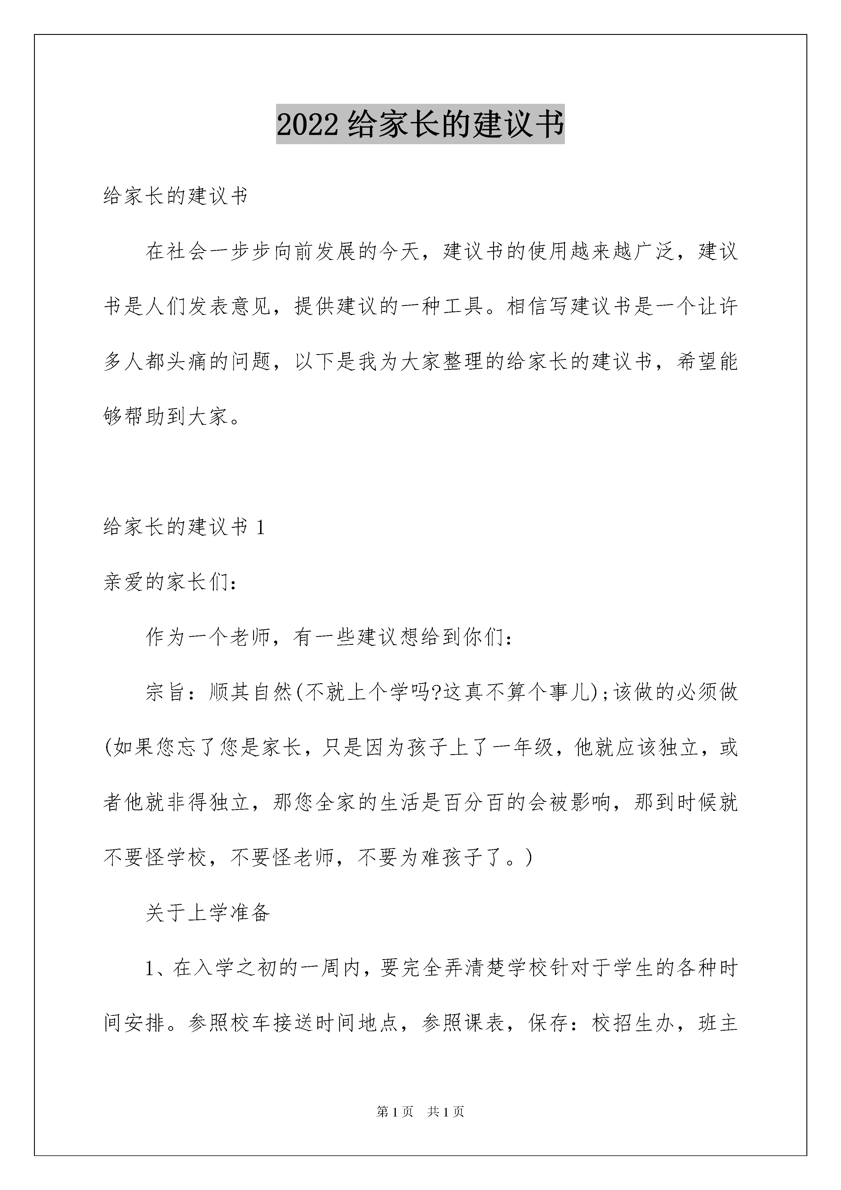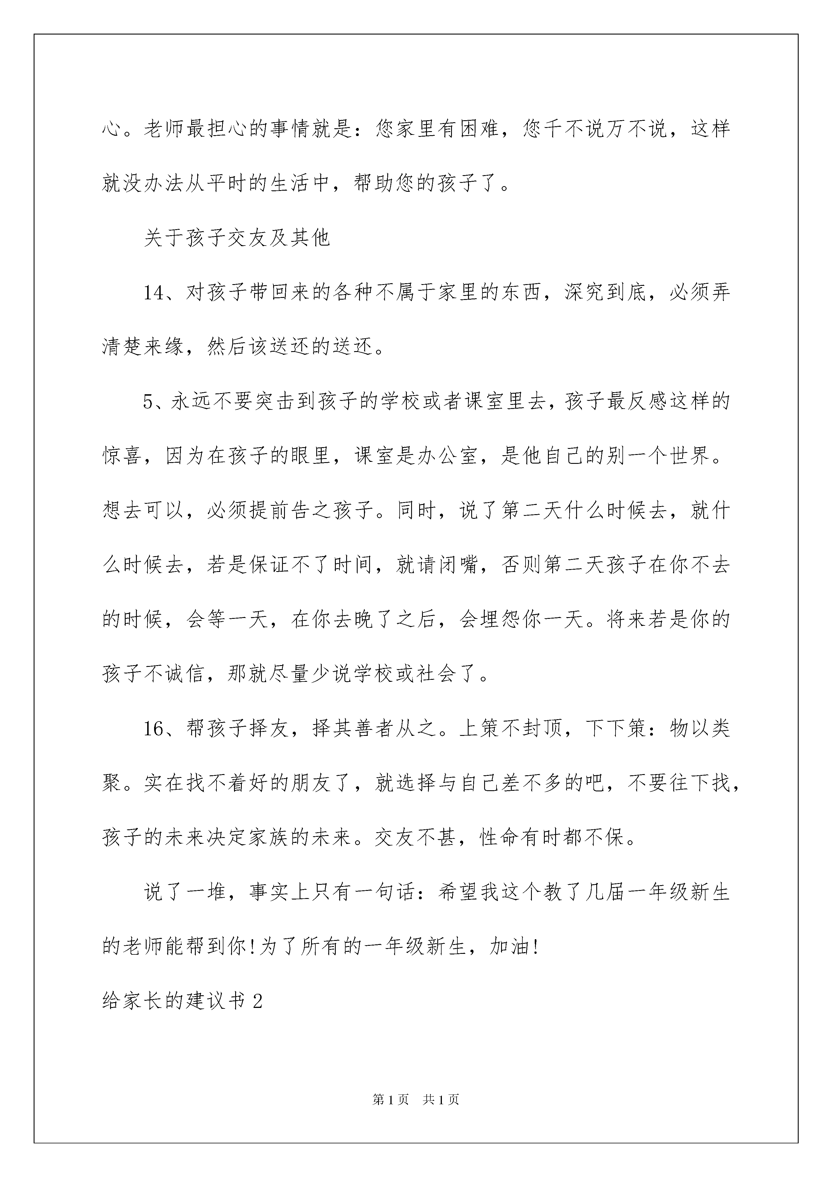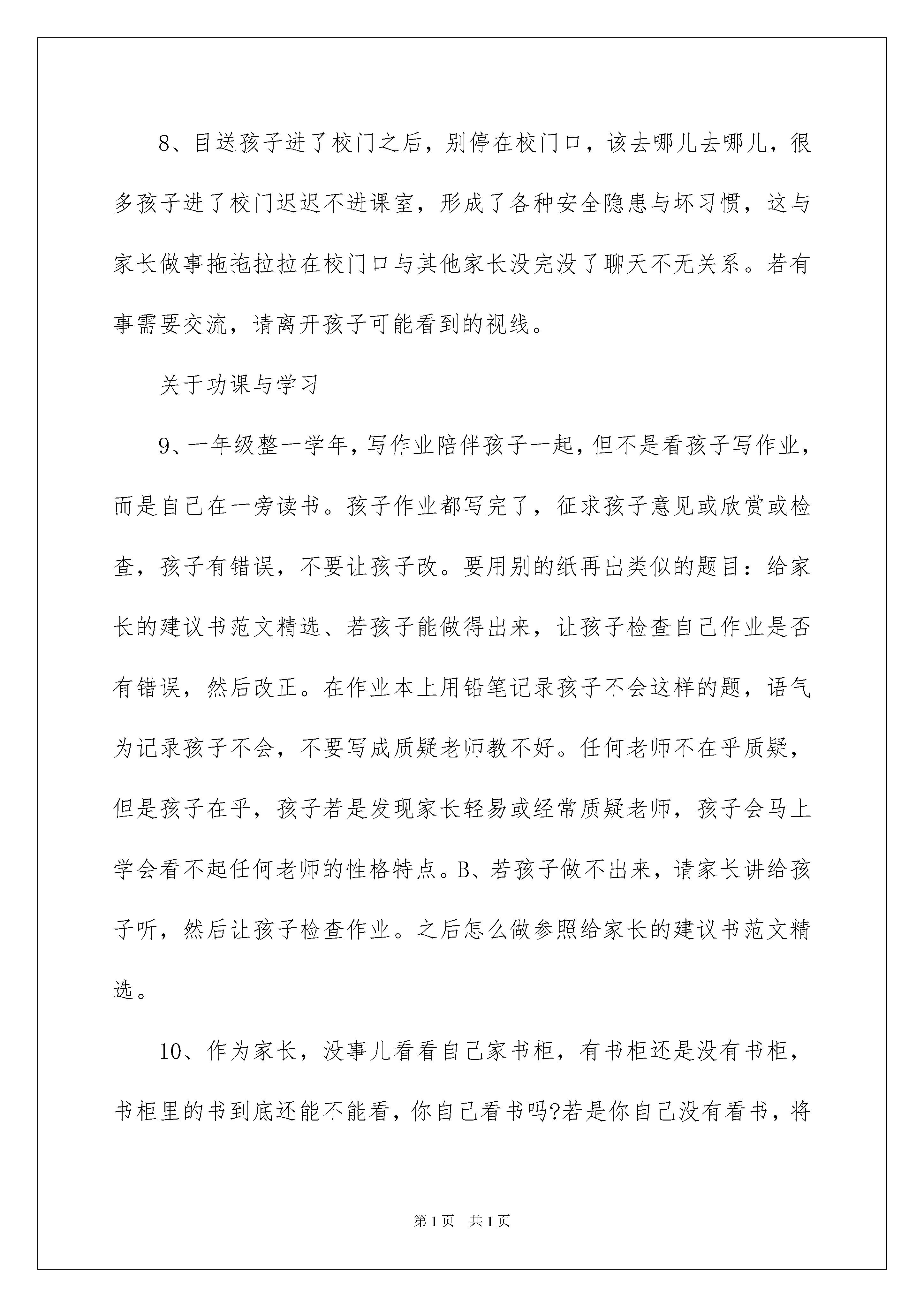 2022给家长的建议书给家长的建议书在社会一步步向前发展的今天,建议书的使用越来越广泛,建议书是人们发表意见,提供建议的一种工具。相信写建议书是一个让许多人都头痛的问题,以下是我为大家整理的给家长的建议书,希望能够帮助到大家。给家长的建议书1亲爱的家长们:作为一个老师,有一些建议想给到你们:宗旨:顺其自然(不就上个学吗?这真不算个事儿);该做的必须做(如果您忘了您是家长,只是因为孩子上了一年级,他就应该独立,或者他就非得独立,那您全家的生活是百分百的会被影响,那到时候就不要怪学校,不要怪老师,不要为难孩子了。)关于上学准备1、在入学之初的一周内,要完全弄清楚学校针对于学生的各种时间安排。参照校车接送时间地点,参照课表,保存:校招生办,班主任,校长,主任电话。2、在一年级的两个学期里,坚持每天临睡前,带孩子一起检查第二天早上孩子要用的各种上学备品,顺便也带孩子跟您一起准备您第二天一早需要的东西。3、要坚持做到每天老师要求带的学习备品或者其他物品及时帮孩子带上。若孩子常常记不清楚,参看第4条。4、至少要有孩子班里其他2位同学家长的电话。妈留妈电话,爹留爹电话。留家庭状况差不多的家庭的电话。5、孩子的着装非常重要,不可以让孩子穿脏、破、过于时尚的衣服上学、过于旧的衣服上学。衣服要得体,干净,方便孩子运动。若学校当天不需要穿礼服,请孩子穿运动鞋,个别学校穿礼服,请给孩子配儿童皮鞋。关于上学路上6、训练孩子每天离家门跟家里其他成员讲再见,与送孩子上学的人讲再见,接孩子回家后,让孩子与其他人报告他回来了。7、与孩子一起步行上学,一定要遵守交通规则,因为你现在接送,就为了将来不接送时孩子也懂注意安全。8、目送孩子进了校门之后,别停在校门口,该去哪儿去哪儿,很多孩子进了校门迟迟不进课室,形成了各种安全隐患与坏习惯,这与家长做事拖拖拉拉在校门口与其他家长没完没了聊天不无关系。若有事需要交流,请离开孩子可能看到的视线。关于功课与学习9、一年级整一学年,写作业陪伴孩子一起,但不是看孩子写作业,而是自己在一旁读书。孩子作业都写完了,征求孩子意见或欣赏或检查,孩子有错误,不要让孩子改。要用别的纸再出类似的题目:给家长的建议书范文精选、若孩子能做得出来,让孩子检查自己作业是否有错误,然后改正。在作业本上用铅笔记录孩子不会这样的题,语气为记录孩子不会,不要写成质疑老师教不好。任何老师不在乎质疑,但是孩子在乎,孩子若是发现家长轻易或经常质疑老师,孩子会马上学会看不起任何老师的性格特点。B、若孩子做不出来,请家长讲给孩子听,然后让孩子检查作业。之后怎么做参照给家长的建议书范文精选。10、作为家长,没事儿看看自己家书柜,有书柜还是没有书柜,书柜里的书到底还能不能看,你自己看书吗?若是你自己没有看书,将来孩子不看书,你就别说孩子了,更别埋怨别人。关于家校沟通11、坚持关注与学校相关的新闻,坚持了解学校周围的治安环境,现在每个学校都配有警务室,有相应的派出所领导担任学校的重要安保职位,若发现学校周围的安全隐患,从班主任开始及时逐层报告,并跟进了解。有家长觉得,这是应该学校做的,可是家长要明白一个此生不变的事实:孩子是你自己的。所谓:爱一个人,就要首先爱他的环境。12、不要给老师送礼物,更不要送钱。人很好买,因人性使然。教师节发个短信就够了,一个真正负责人的老师,都没时间因为一些礼物给予哪些同学哪些照顾,每个孩子都是孩子,在老师眼里,都一样可爱,缺一不可。13、家里有困难的,比如:孩子某一监护人长年病中,家里老人年纪偏大,家里经济出现问题,家里人手不够……请家长您一定要跟老师说说,说出来的好处不是暴露隐私,而是老师一定会做到怎么样营造一个更适合您家孩子成长的心理空间。放心,任何老师对学生家庭状况的秘密都会守口如瓶,个别八卦的老师会遭天谴,家长不要担心。老师最担心的事情就是:您家里有困难,您千不说万不说,这样就没办法从平时的生活中,帮助您的孩子了。关于孩子交友及其他14、对孩子带回来的各种不属于家里的东西,深究到底,必须弄清楚来缘,然后该送还的送还。5、永远不要突击到孩子的学校或者课室里去,孩子最反感这样的惊喜,因为在孩子的眼里,课室是办公室,是他自己的别一个世界。想去可以,必须提前告之孩子。同时,说了第二天什么时候去,就什么时候去,若是保证不了时间,就请闭嘴,否则第二天孩子在你不去的时候,会等一天,在你去晚了之后,会埋怨你一天。将来若是你的孩子不诚信,那就尽量少说学校或社会了。16、帮孩子择友,择其善者从之。上策不封顶,下下策:物以类聚。实在找不着好的朋友了,就选择与自己差不多的吧,不要往下找,孩子的未来决定家族