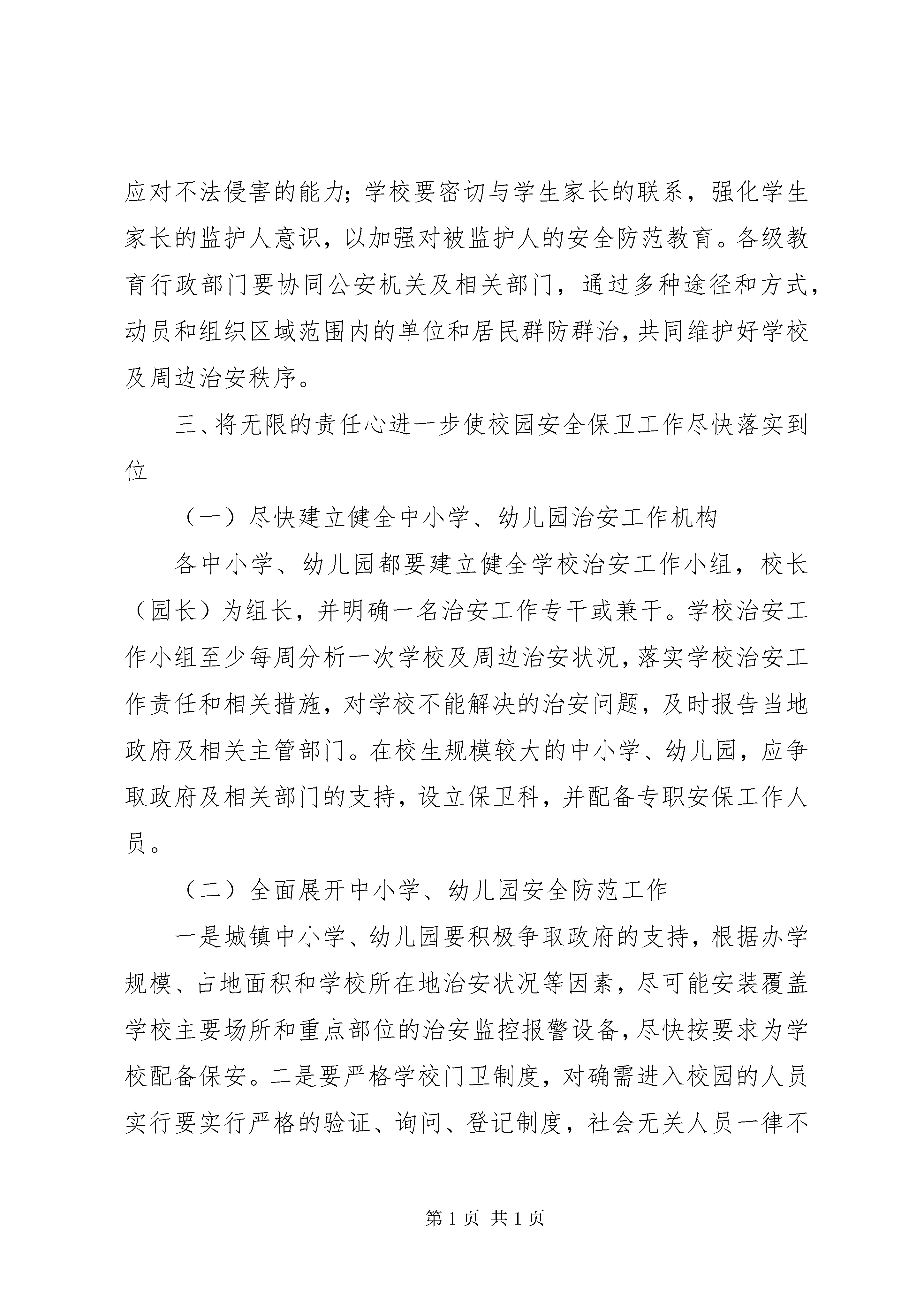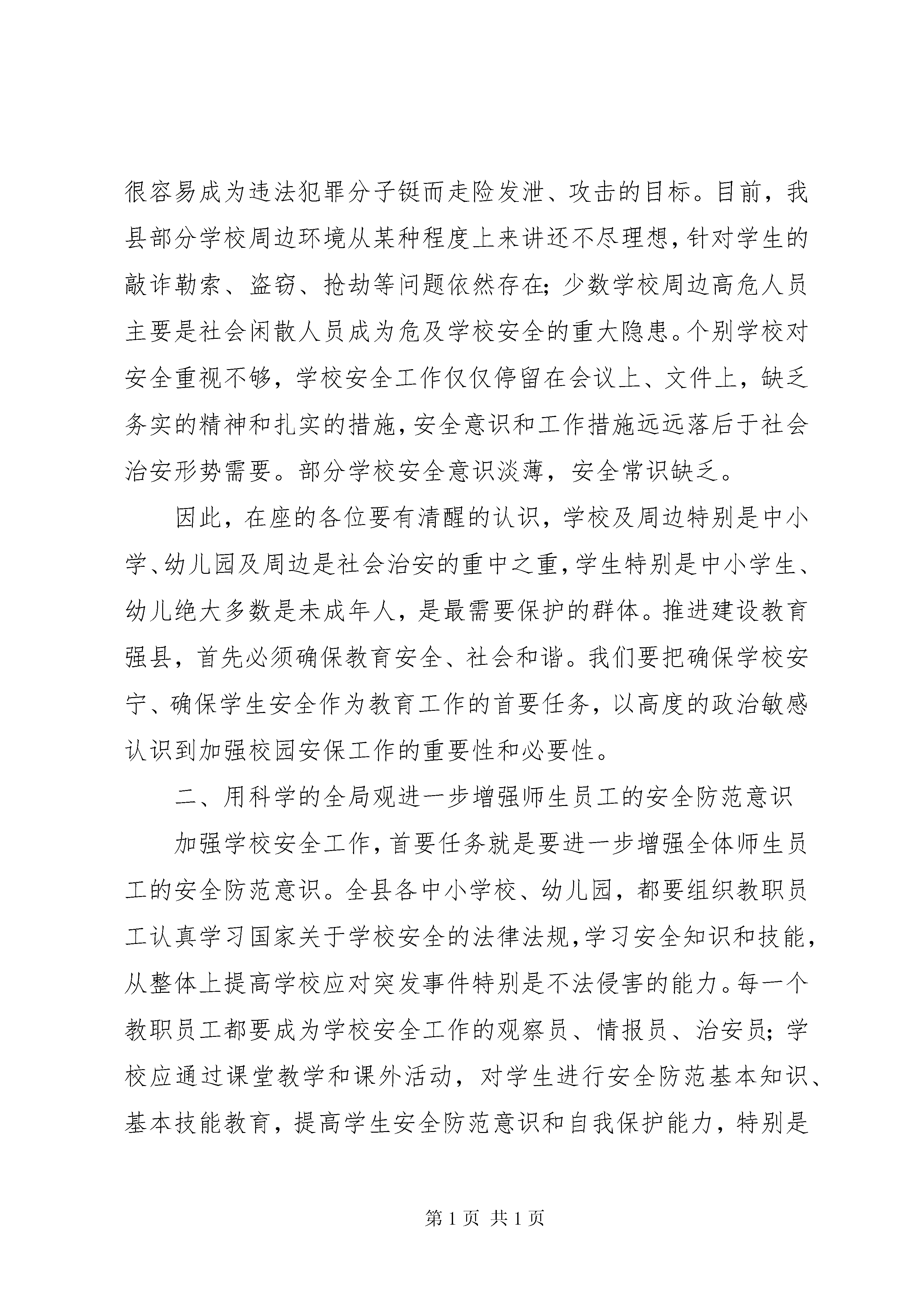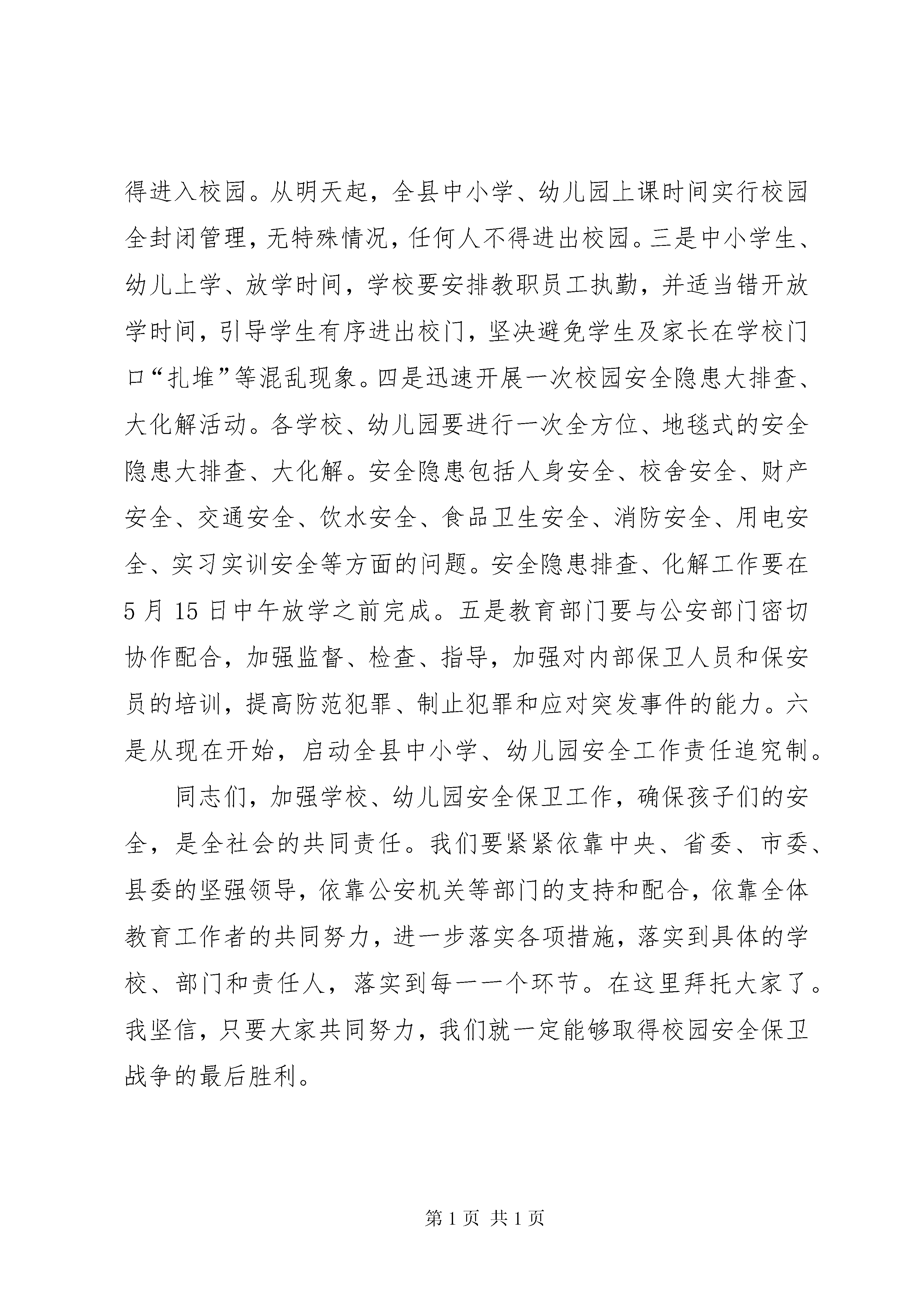 县校园安全紧急会议上的讲话编者按:本文主要从以高度的政治敏感进一步认识到加强校园安保工作的重要性;用科学的全局观进一步增强师生员工的安全防范意识;将无限的责任心进一步使校园安全保卫工作尽快落实到位进行讲述。其中,主要包括:加强学校安全工作,首要任务就是要进一步增强全体师生员工的安全防范意识、每一个教职员工都要成为学校安全工作的观察员、情报员、治安员;学校应通过课堂教学和课外活动,对学生进行安全防范基本知识、基本技能教育,提高学生安全防范意识和自我保护能力,特别是应对不法侵害的能力、尽快建立健全中小学、幼儿园治安工作机构、全面展开中小学、幼儿园安全防范工作等,具体材料请详见:同志们:大家下午好。今天,我们在这里召开加强全县各中小学校、幼儿园安全保卫工作紧急会议,主要是对进一步加强学校、幼儿园安全保卫工作进行进一步紧急动员和部署。刚才,盘向云副局长已经就具体的事情和工作措施进行了动员和部署,我完全赞同。下面,我想讲几点意见。一、以高度的政治敏感进一步认识到加强校园安保工作的重要性当前,学校安全尤其是学校及周边治安面临形势严峻。大家应该从各种渠道了解到了,昨天上午8时左右,位于XX省南部的XX市XX县区圣水镇林场村幼儿园发生一起恶性凶杀案,犯罪嫌疑人吴焕明持菜刀闯入该村幼儿园,致7名儿童、2名成人死亡,11名儿童受伤。这是我国自3月23日福建南平校园凶杀案以来发生的第六起侵害中小学生、幼儿园幼儿的恶性案件。党中央、国务院对恶性案件的发生高度重视,胡锦涛总书记曾作出重要批示。5月3日上午,中央综治委就加强各类学校、幼儿园安全管理工作专门召开全国综治维稳工作电视电话会议,周永康同志到会并作重要讲话。5月4日下午,XX省委教育工委、省教育厅召开XX省学校安全工作视频会议,传达并贯彻5月3日全国综治维稳工作电视电话会议精神,部署全省校园安全工作。省教育厅厅长张放平作重要讲话。他强调,全省各级教育行政部门、各级各类学校要紧急动员、立即行动起来,学习贯彻落实全国会议精神,进一步提高认识,增强意识,加强和改进措施,努力提高学校安全工作水平,确保校园平安。昨天,5月12日,公安部教育部联合召开加强学校、幼儿园安全保卫工作紧急视频会议。国务委员、公安部部长孟建柱,中央综治委副主任、中央综治办主任陈冀平,教育部部长袁贵仁出席会议并讲话,会议对进一步加强学校、幼儿园安全保卫工作进行紧急再动员、再部署。这一系列校园恶性案件,具有偶发性,但偶然之中又包含着一定的必然。学校尤其是中小学、幼儿园治安防范能力相对较弱,很容易成为违法犯罪分子铤而走险发泄、攻击的目标。目前,我县部分学校周边环境从某种程度上来讲还不尽理想,针对学生的敲诈勒索、盗窃、抢劫等问题依然存在;少数学校周边高危人员主要是社会闲散人员成为危及学校安全的重大隐患。个别学校对安全重视不够,学校安全工作仅仅停留在会议上、文件上,缺乏务实的精神和扎实的措施,安全意识和工作措施远远落后于社会治安形势需要。部分学校安全意识淡薄,安全常识缺乏。因此,在座的各位要有清醒的认识,学校及周边特别是中小学、幼儿园及周边是社会治安的重中之重,学生特别是中小学生、幼儿绝大多数是未成年人,是最需要保护的群体。推进建设教育强县,首先必须确保教育安全、社会和谐。我们要把确保学校安宁、确保学生安全作为教育工作的首要任务,以高度的政治敏感认识到加强校园安保工作的重要性和必要性。二、用科学的全局观进一步增强师生员工的安全防范意识加强学校安全工作,首要任务就是要进一步增强全体师生员工的安全防范意识。全县各中小学校、幼儿园,都要组织教职员工认真学习国家关于学校安全的法律法规,学习安全知识和技能,从整体上提高学校应对突发事件特别是不法侵害的能力。每一个教职员工都要成为学校安全工作的观察员、情报员、治安员;学校应通过课堂教学和课外活动,对学生进行安全防范基本知识、基本技能教育,提高学生安全防范意识和自我保护能力,特别是应对不法侵害的能力;学校要密切与学生家长的联系,强化学生家长的监护人意识,以加强对被监护人的安全防范教育。各级教育行政部门要协同公安机关及相关部门,通过多种途径和方式,动员和组织区域范围内的单位和居民群防群治,共同维护好学校及周边治安秩序。三、将无限的责任心进一步使校园安全保卫工作尽快落实到位(一)尽快建立健全中小学、幼儿园治安工作机构各中小学、幼儿园都要建立健全学校治安工作小组,校长(园长)为组长,并明确一名治安工作专干或兼干。学校治安工作小组至少每周分析一次学校及周边治安状况,落实学校治安工作责任和相关措施,对学校不能解决的治安问题,及时报告当地政府及相关主管部门。在校生规模较大的中小学、幼儿园,应争取政府及相关部门的支持,设立保卫科,并配备专职安保工作人员。(二)全面展开中小学、幼儿园安全防范工作