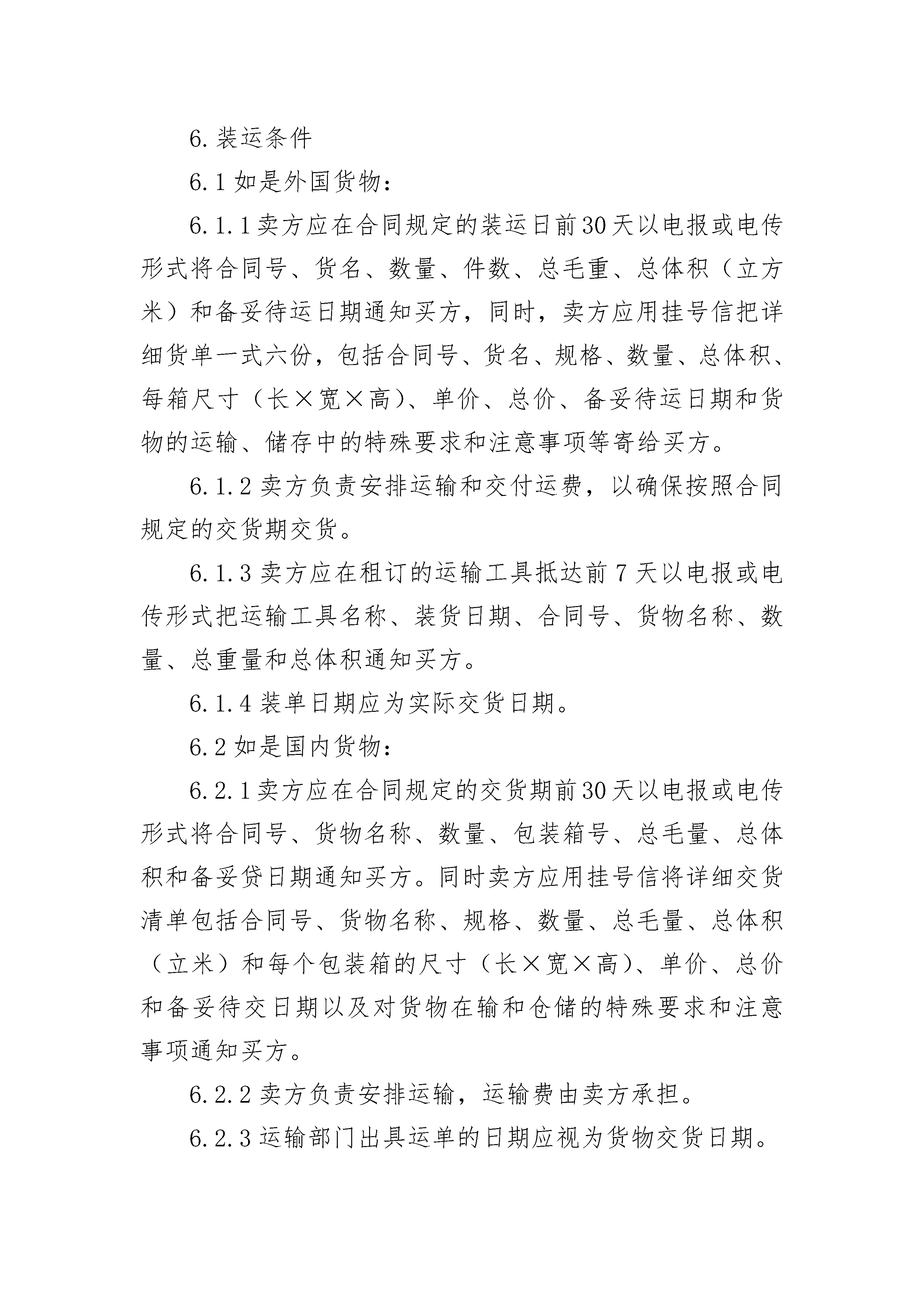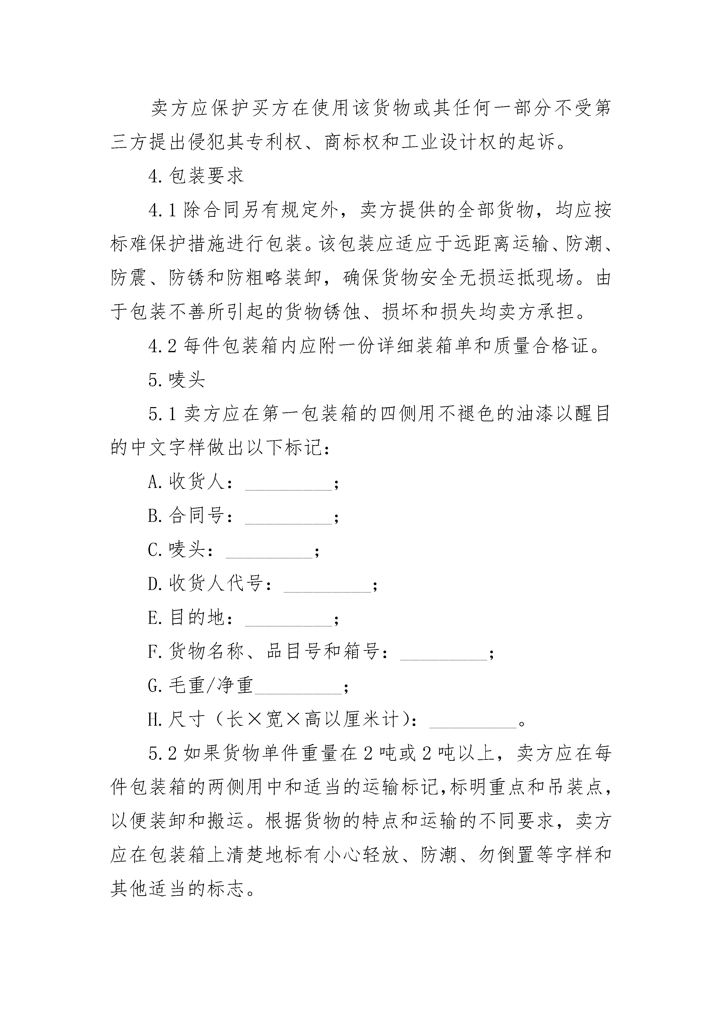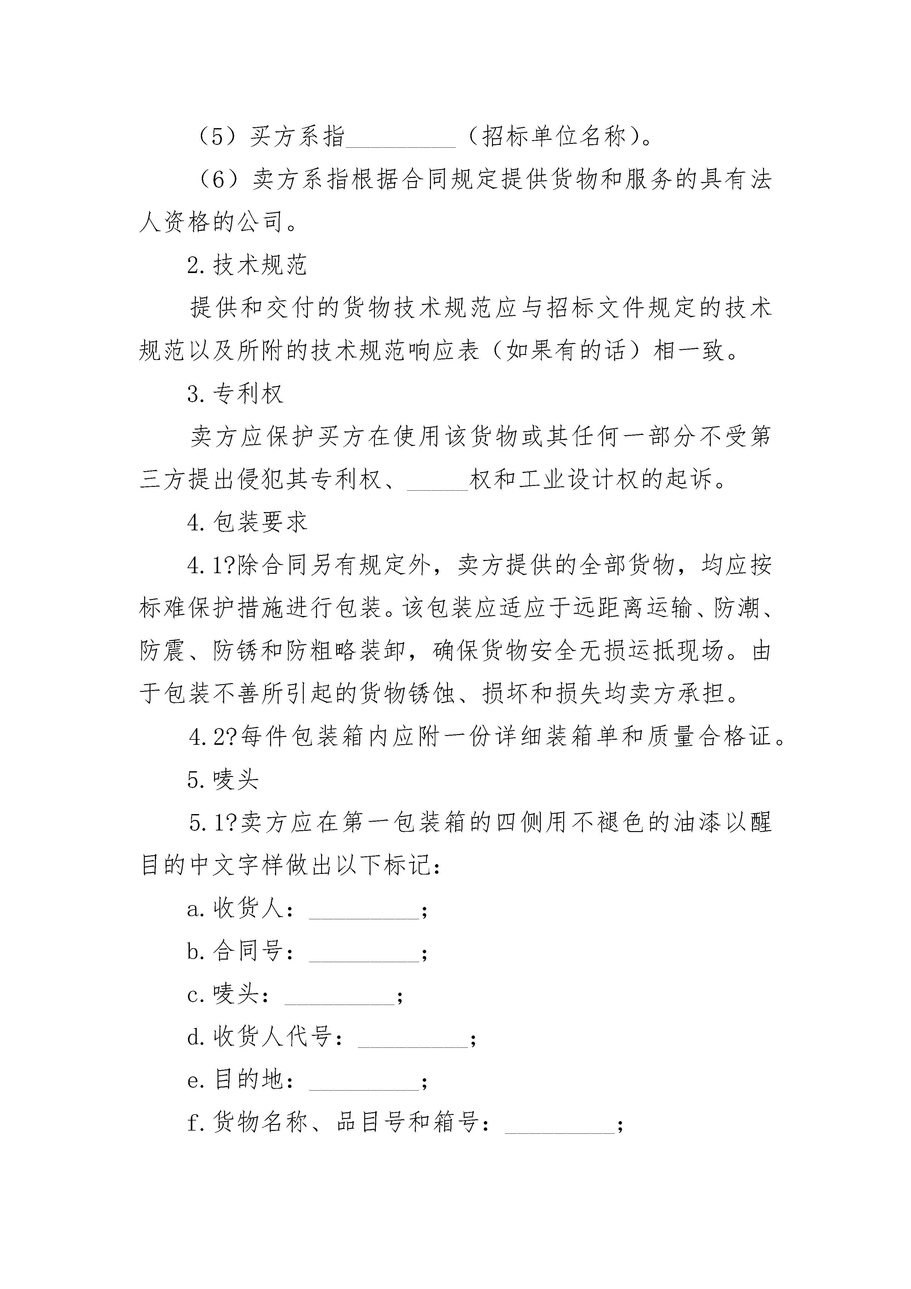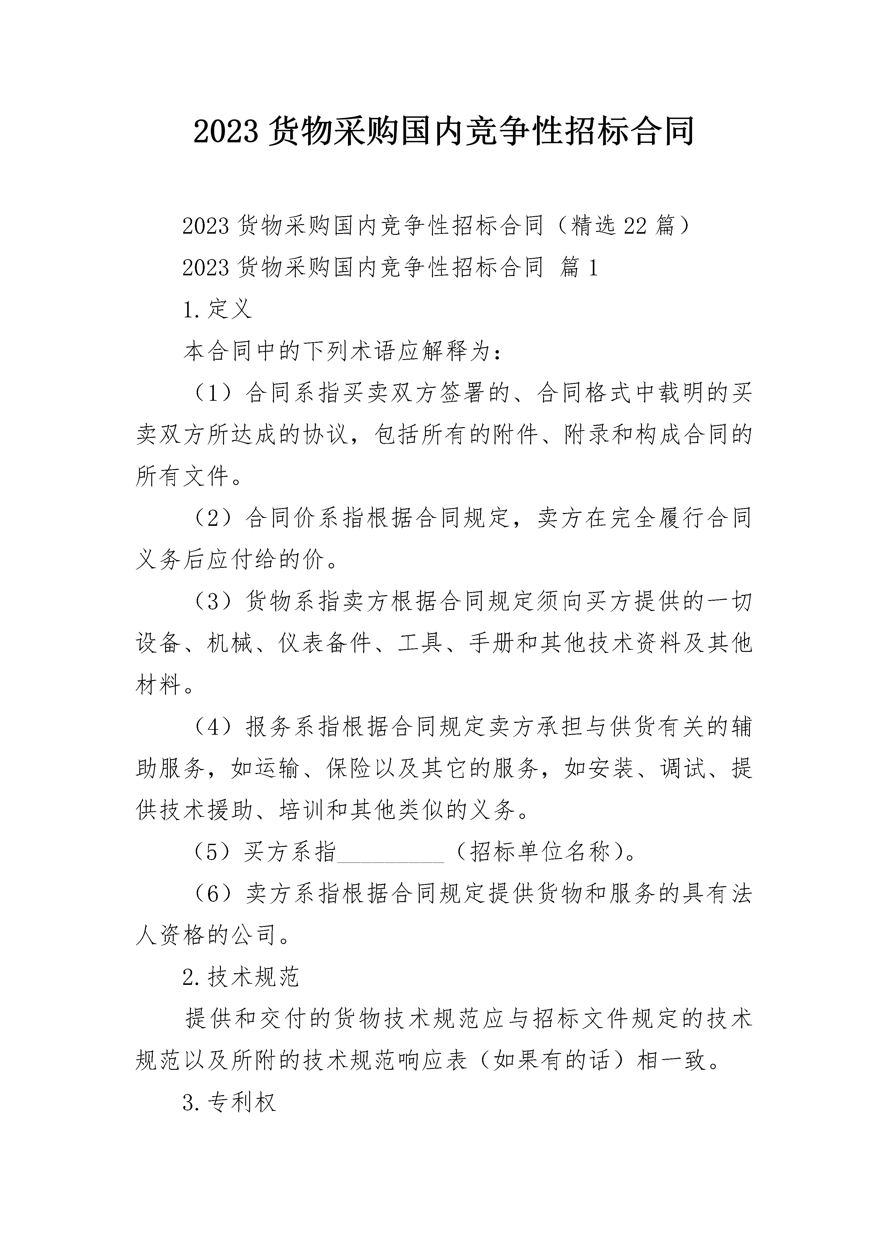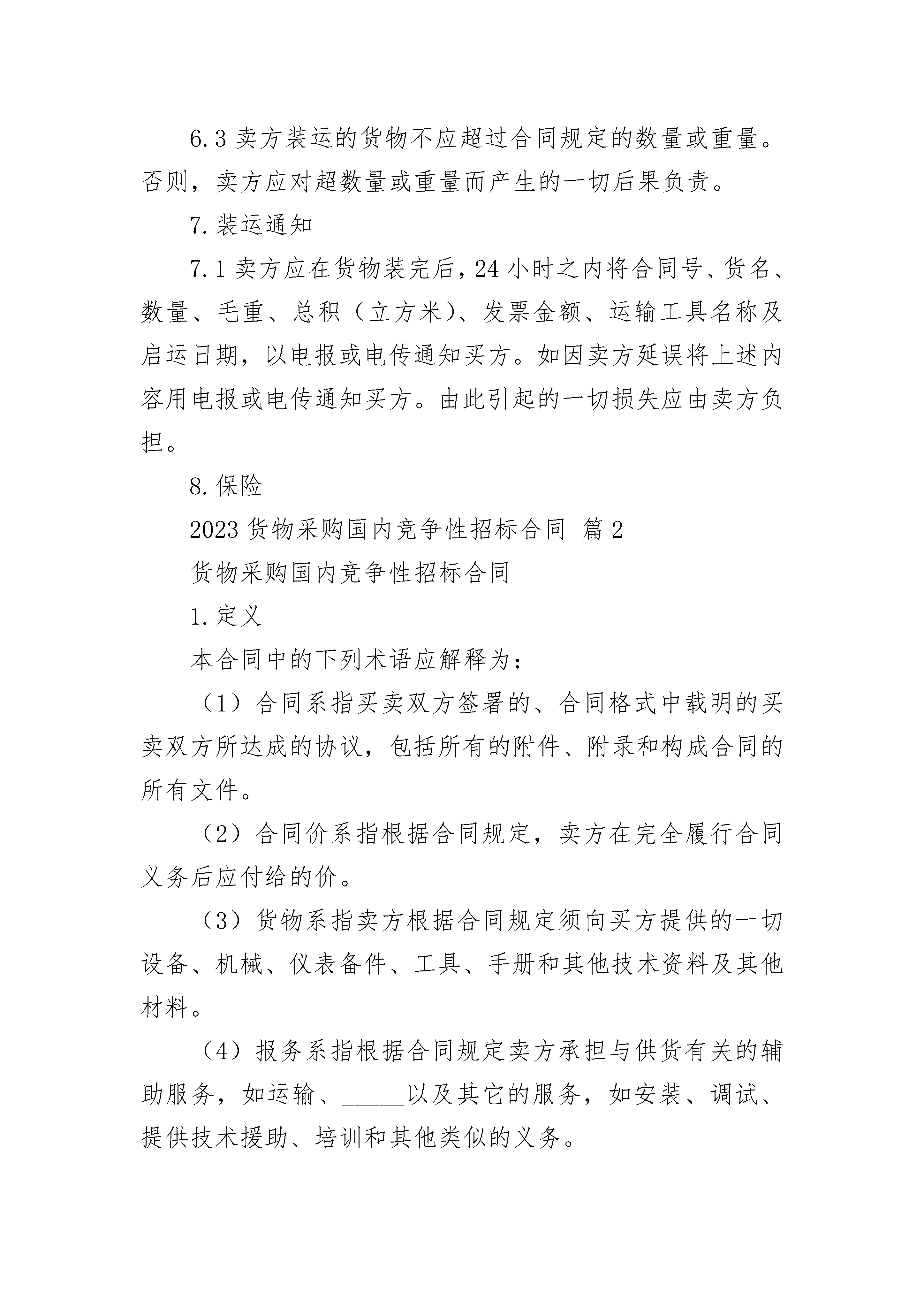 2023货物采购国内竞争性招标合同2023货物采购国内竞争性招标合同(精选22篇)2023货物采购国内竞争性招标合同篇11.定义本合同中的下列术语应解释为:(1)合同系指买卖双方签署的、合同格式中载明的买卖双方所达成的协议,包括所有的附件、附录和构成合同的所有文件。(2)合同价系指根据合同规定,卖方在完全履行合同义务后应付给的价。(3)货物系指卖方根据合同规定须向买方提供的一切设备、机械、仪表备件、工具、手册和其他技术资料及其他材料。(4)报务系指根据合同规定卖方承担与供货有关的辅助服务,如运输、保险以及其它的服务,如安装、调试、提供技术援助、培训和其他类似的义务。(5)买方系指_________(招标单位名称)。(6)卖方系指根据合同规定提供货物和服务的具有法人资格的公司。2.技术规范提供和交付的货物技术规范应与招标文件规定的技术规范以及所附的技术规范响应表(如果有的话)相一致。3.专利权卖方应保护买方在使用该货物或其任何一部分不受第三方提出侵犯其专利权、商标权和工业设计权的起诉。4.包装要求4.1除合同另有规定外,卖方提供的全部货物,均应按标难保护措施进行包装。该包装应适应于远距离运输、防潮、防震、防锈和防粗略装卸,确保货物安全无损运抵现场。由于包装不善所引起的货物锈蚀、损坏和损失均卖方承担。4.2每件包装箱内应附一份详细装箱单和质量合格证。5.唛头5.1卖方应在第一包装箱的四侧用不褪色的油漆以醒目的中文字样做出以下标记:A.收货人:_________;B.合同号:_________;C.唛头:_________;D.收货人代号:_________;E.目的地:_________;F.货物名称、品目号和箱号:_________;G.毛重/净重_________;H.尺寸(长×宽×高以厘米计):_________。5.2如果货物单件重量在2吨或2吨以上,卖方应在每件包装箱的两侧用中和适当的运输标记,标明重点和吊装点,以便装卸和搬运。根据货物的特点和运输的不同要求,卖方应在包装箱上清楚地标有小心轻放、防潮、勿倒置等字样和其他适当的标志。6.装运条件6.1如是外国货物:6.1.1卖方应在合同规定的装运日前30天以电报或电传形式将合同号、货名、数量、件数、总毛重、总体积(立方米)和备妥待运日期通知买方,同时,卖方应用挂号信把详细货单一式六份,包括合同号、货名、规格、数量、总体积、每箱尺寸(长×宽×高)、单价、总价、备妥待运日期和货物的运输、储存中的特殊要求和注意事项等寄给买方。6.1.2卖方负责安排运输和交付运费,以确保按照合同规定的交货期交货。6.1.3卖方应在租订的运输工具抵达前7天以电报或电传形式把运输工具名称、装货日期、合同号、货物名称、数量、总重量和总体积通知买方。6.1.4装单日期应为实际交货日期。6.2如是国内货物:6.2.1卖方应在合同规定的交货期前30天以电报或电传形式将合同号、货物名称、数量、包装箱号、总毛量、总体积和备妥贷日期通知买方。同时卖方应用挂号信将详细交货清单包括合同号、货物名称、规格、数量、总毛量、总体积(立米)和每个包装箱的尺寸(长×宽×高)、单价、总价和备妥待交日期以及对货物在输和仓储的特殊要求和注意事项通知买方。6.2.2卖方负责安排运输,运输费由卖方承担。6.2.3运输部门出具运单的日期应视为货物交货日期。6.3卖方装运的货物不应超过合同规定的数量或重量。否则,卖方应对超数量或重量而产生的一切后果负责。7.装运通知7.1卖方应在货物装完后,24小时之内将合同号、货名、数量、毛重、总积(立方米)、发票金额、运输工具名称及启运日期,以电报或电传通知买方。如因卖方延误将上述内容用电报或电传通知买方。由此引起的一切损失应由卖方负担。8.保险2023货物采购国内竞争性招标合同篇2货物采购国内竞争性招标合同1.定义本合同中的下列术语应解释为:(1)合同系指买卖双方签署的、合同格式中载明的买卖双方所达成的协议,包括所有的附件、附录和构成合同的所有文件。(2)合同价系指根据合同规定,卖方在完全履行合同义务后应付给的价。(3)货物系指卖方根据合同规定须向买方提供的一切设备、机械、仪表备件、工具、手册和其他技术资料及其他材料。(4)报务系指根据合同规定卖方承担与供货有关的辅助服务,如运输、_____以及其它的服务,如安装、调试、提供技术援助、培训和其他类似的义务。(5)买方系指_________(招标单位名称)。(6)卖方系指根据合同规定提供货物和服务的具有法人资格的公司。2.技术规范提供和交付的货物技术规范应与招标文件规定的技术规范以及所附的技术规范响应表(如果有的话)相一致。3.专利权卖方应保护买方在使用该货物或其任何一部分不受第三方提出侵犯其专利权、_____权和工业设计权的起诉。4.包装要求4.1?