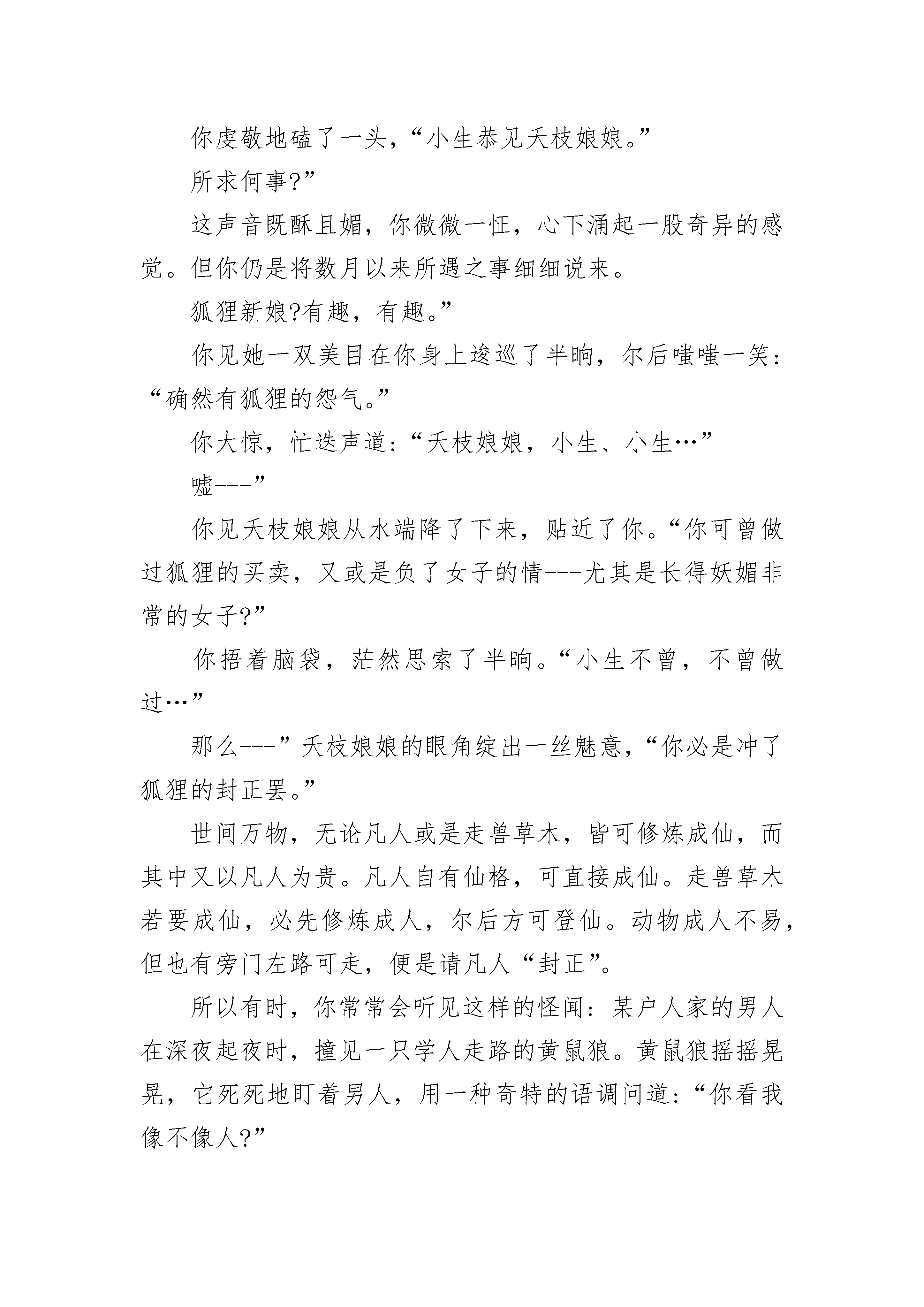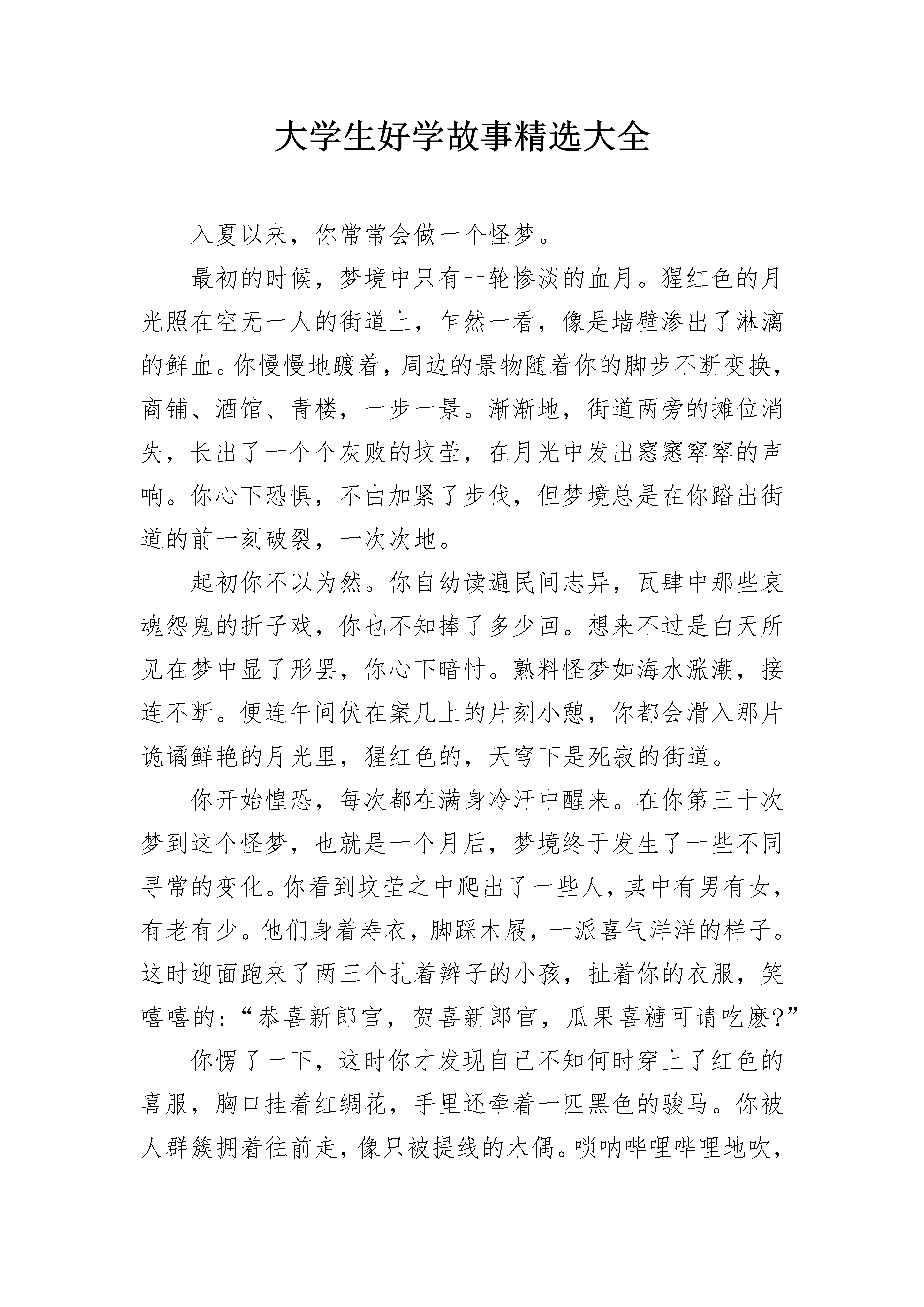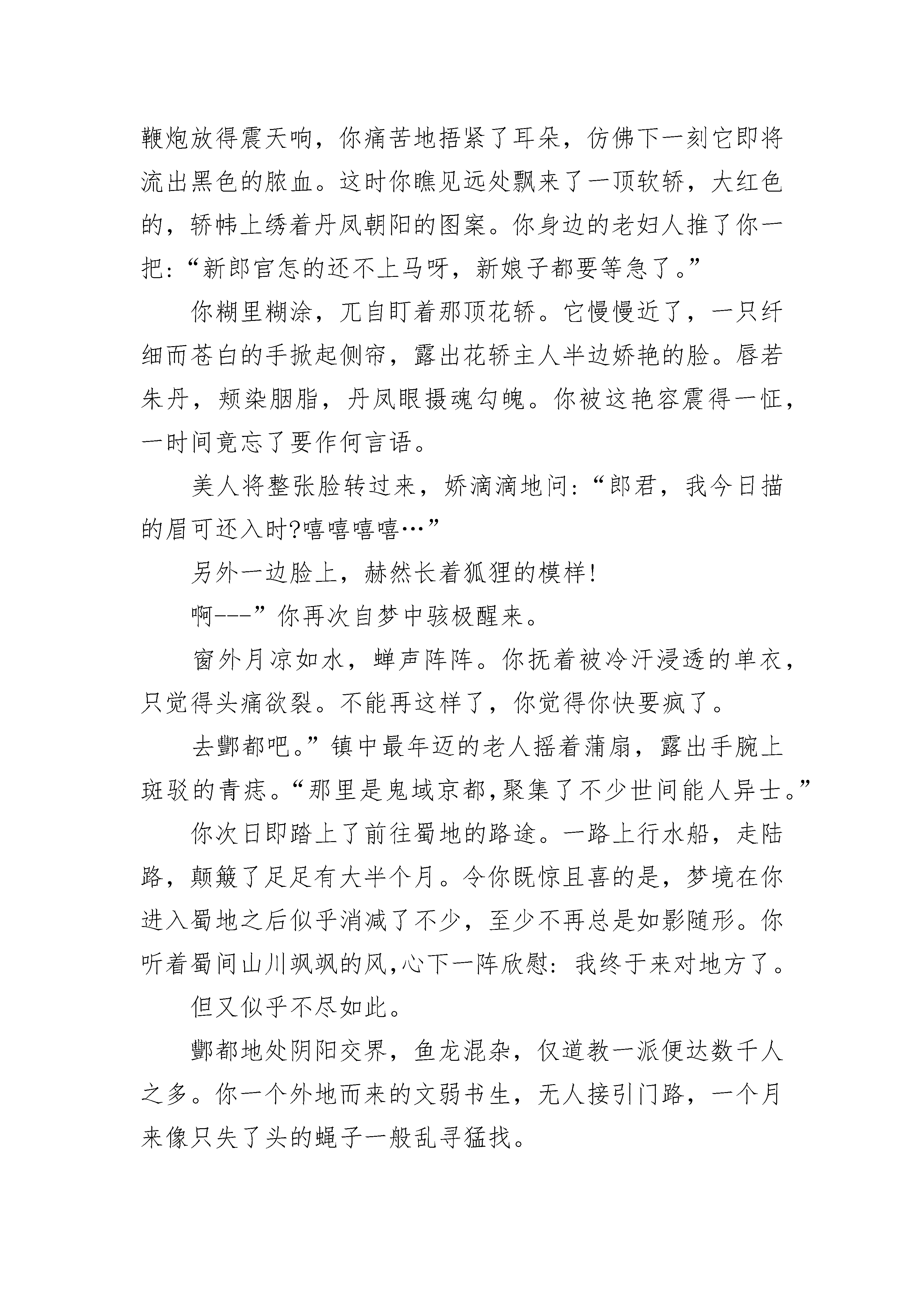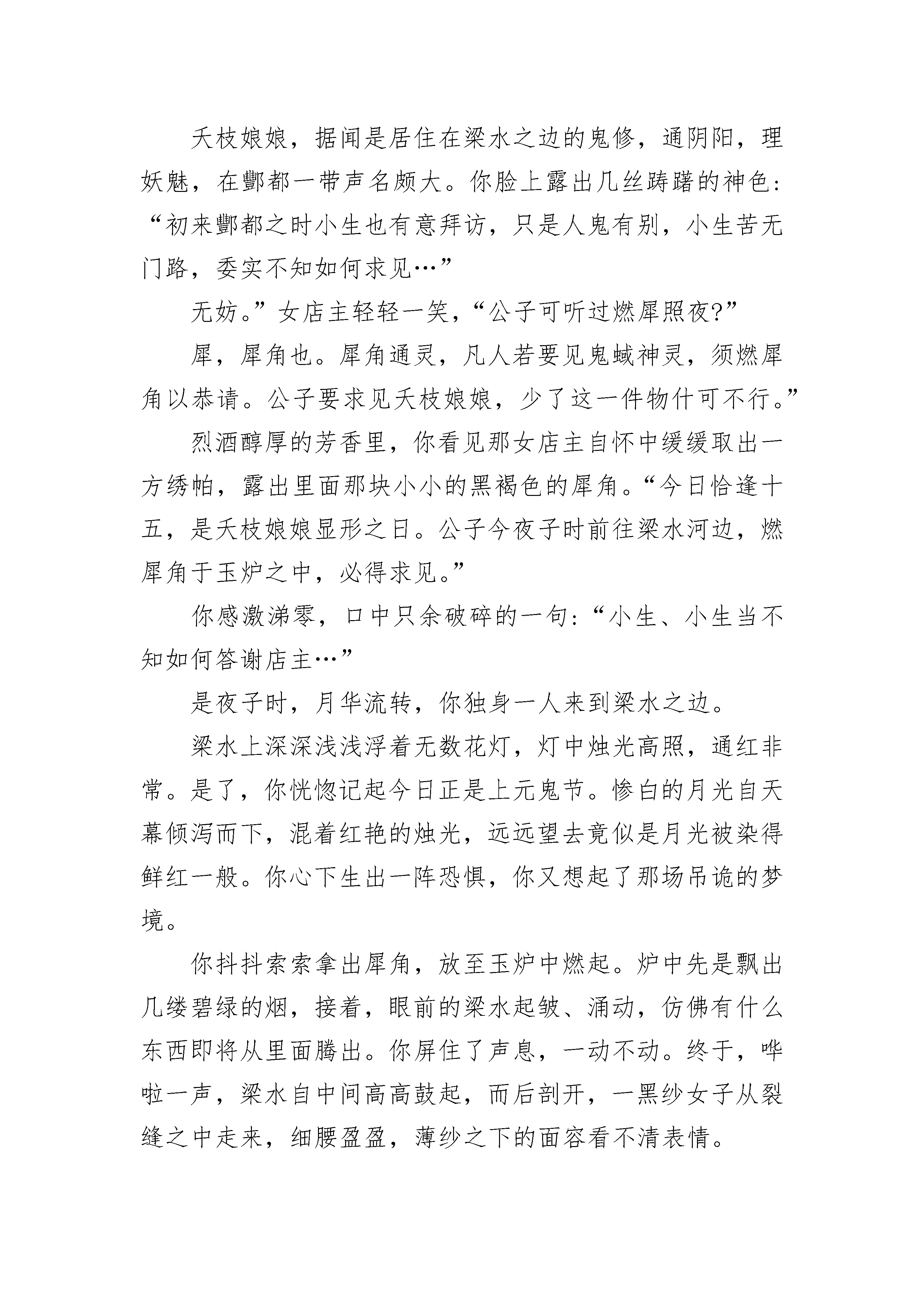 大学生好学故事精选大全入夏以来,你常常会做一个怪梦。最初的时候,梦境中只有一轮惨淡的血月。猩红色的月光照在空无一人的街道上,乍然一看,像是墙壁渗出了淋漓的鲜血。你慢慢地踱着,周边的景物随着你的脚步不断变换,商铺、酒馆、青楼,一步一景。渐渐地,街道两旁的摊位消失,长出了一个个灰败的坟茔,在月光中发出窸窸窣窣的声响。你心下恐惧,不由加紧了步伐,但梦境总是在你踏出街道的前一刻破裂,一次次地。起初你不以为然。你自幼读遍民间志异,瓦肆中那些哀魂怨鬼的折子戏,你也不知捧了多少回。想来不过是白天所见在梦中显了形罢,你心下暗忖。熟料怪梦如海水涨潮,接连不断。便连午间伏在案几上的片刻小憩,你都会滑入那片诡谲鲜艳的月光里,猩红色的,天穹下是死寂的街道。你开始惶恐,每次都在满身冷汗中醒来。在你第三十次梦到这个怪梦,也就是一个月后,梦境终于发生了一些不同寻常的变化。你看到坟茔之中爬出了一些人,其中有男有女,有老有少。他们身着寿衣,脚踩木屐,一派喜气洋洋的样子。这时迎面跑来了两三个扎着辫子的小孩,扯着你的衣服,笑嘻嘻的:“恭喜新郎官,贺喜新郎官,瓜果喜糖可请吃麽?”你愣了一下,这时你才发现自己不知何时穿上了红色的喜服,胸口挂着红绸花,手里还牵着一匹黑色的骏马。你被人群簇拥着往前走,像只被提线的木偶。唢呐哔哩哔哩地吹,鞭炮放得震天响,你痛苦地捂紧了耳朵,仿佛下一刻它即将流出黑色的脓血。这时你瞧见远处飘来了一顶软轿,大红色的,轿帏上绣着丹凤朝阳的图案。你身边的老妇人推了你一把:“新郎官怎的还不上马呀,新娘子都要等急了。”你糊里糊涂,兀自盯着那顶花轿。它慢慢近了,一只纤细而苍白的手掀起侧帘,露出花轿主人半边娇艳的脸。唇若朱丹,颊染胭脂,丹凤眼摄魂勾魄。你被这艳容震得一怔,一时间竟忘了要作何言语。美人将整张脸转过来,娇滴滴地问:“郎君,我今日描的眉可还入时?嘻嘻嘻嘻…”另外一边脸上,赫然长着狐狸的模样!啊---”你再次自梦中骇极醒来。窗外月凉如水,蝉声阵阵。你抚着被冷汗浸透的单衣,只觉得头痛欲裂。不能再这样了,你觉得你快要疯了。去酆都吧。”镇中最年迈的老人摇着蒲扇,露出手腕上斑驳的青痣。“那里是鬼域京都,聚集了不少世间能人异士。”你次日即踏上了前往蜀地的路途。一路上行水船,走陆路,颠簸了足足有大半个月。令你既惊且喜的是,梦境在你进入蜀地之后似乎消减了不少,至少不再总是如影随形。你听着蜀间山川飒飒的风,心下一阵欣慰:我终于来对地方了。但又似乎不尽如此。酆都地处阴阳交界,鱼龙混杂,仅道教一派便达数千人之多。你一个外地而来的文弱书生,无人接引门路,一个月来像只失了头的蝇子一般乱寻猛找。银子如流水散了大半,寻到的却统共不过是些伪道士、假和尚之流,施法布阵了十余次,得到的也不过一堆黄符纸。而那梦境却是越来越频繁了。你试尽了百般方法,甚至日日拿参汤吊着精气,免使自己昏睡过去。但仅过两天你便招架不住了,你仍是避无可避地滑入了那场诡谲的梦境里,鲜血淋漓的月光,花轿中启唇一笑的狐狸新娘。不见天日的担惊受怕逼得你心力交瘁,你终于承受不住了。那日你买了一坛烈酒,痛饮了七大碗,而后摇摇晃晃悬在梁上悬起了白绫。你乏了,你决意自尽。呀---”是客栈女主人的声音。公子缘何自寻短见?可是受了何人胁迫?”女店主妩媚而又娇柔的嗓音让你心下恍惚升起一股熟悉感。你睁开醉眼盯着她,寻常普通的面容,一双丹凤眼倒是生得格外别致。你见她施施然坐下,再施施然倒起了酒。不知怎的,你垂下了手中的白绫。世间万般愁事,不过一杯酒间。公子何必轻贱性命呢?”也许是女店主眼中的云淡风轻摄住了你。你吐着酒气,结结巴巴说完了那场吊诡的梦境。熟料女店主听完之后只是抿唇一笑:“这事倒也不难,可解。”何解?”女店主扬手倒了半盏酒,露出手腕上点点的青痣。“夭枝娘娘可解。”夭枝娘娘,据闻是居住在梁水之边的鬼修,通阴阳,理妖魅,在酆都一带声名颇大。你脸上露出几丝踌躇的神色:“初来酆都之时小生也有意拜访,只是人鬼有别,小生苦无门路,委实不知如何求见…”无妨。”女店主轻轻一笑,“公子可听过燃犀照夜?”犀,犀角也。犀角通灵,凡人若要见鬼蜮神灵,须燃犀角以恭请。公子要求见夭枝娘娘,少了这一件物什可不行。”烈酒醇厚的芳香里,你看见那女店主自怀中缓缓取出一方绣帕,露出里面那块小小的黑褐色的犀角。“今日恰逢十五,是夭枝娘娘显形之日。公子今夜子时前往梁水河边,燃犀角于玉炉之中,必得求见。”你感激涕零,口中只余破碎的一句:“小生、小生当不知如何答谢店主…”是夜子时,月华流转,你独身一人来到梁水之边。梁水上深深浅浅浮着无数花灯,灯中烛光高照,通红非常。是了,你恍惚记起今日正是上元鬼节。惨白的月光自天幕倾泻而下,混着红艳的烛光,远远望去竟似是月光被染得鲜红一般。你心下生出一阵恐惧,你又想起了那场吊诡的梦境。你抖抖索索拿出犀角,放至玉炉中燃起。炉中先是飘出几