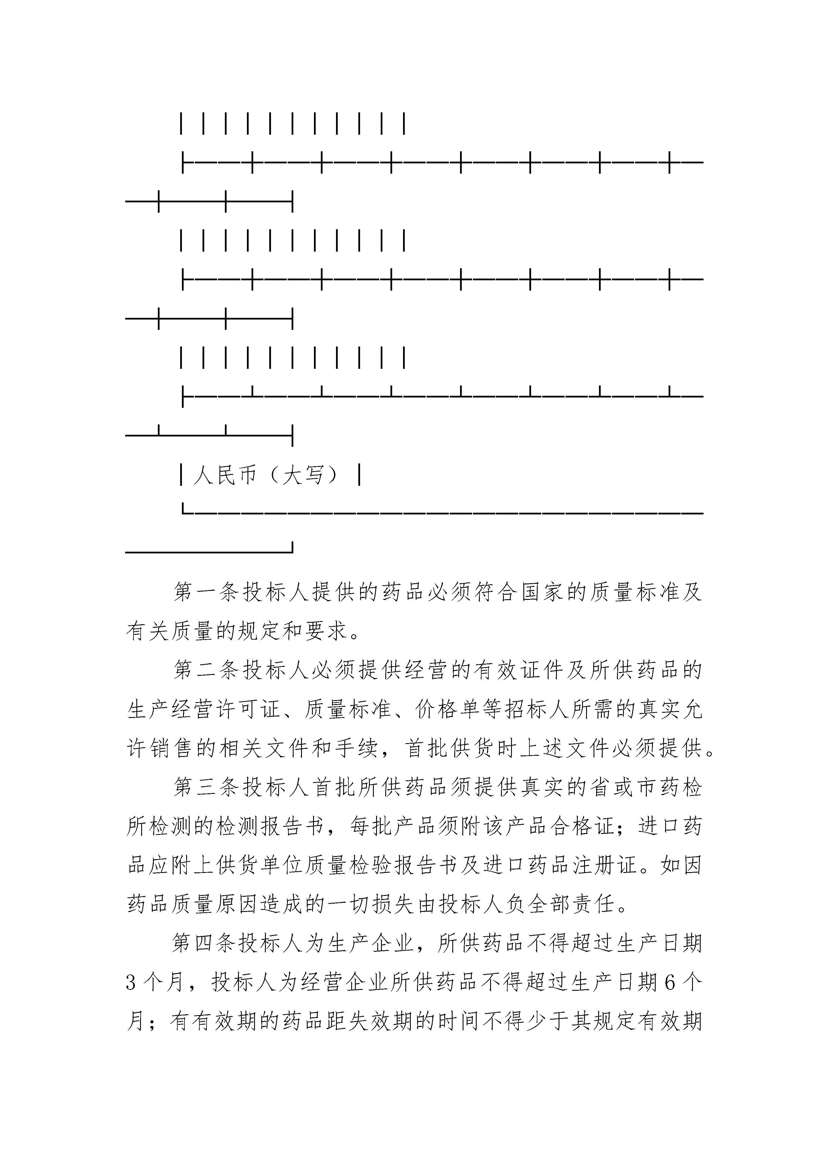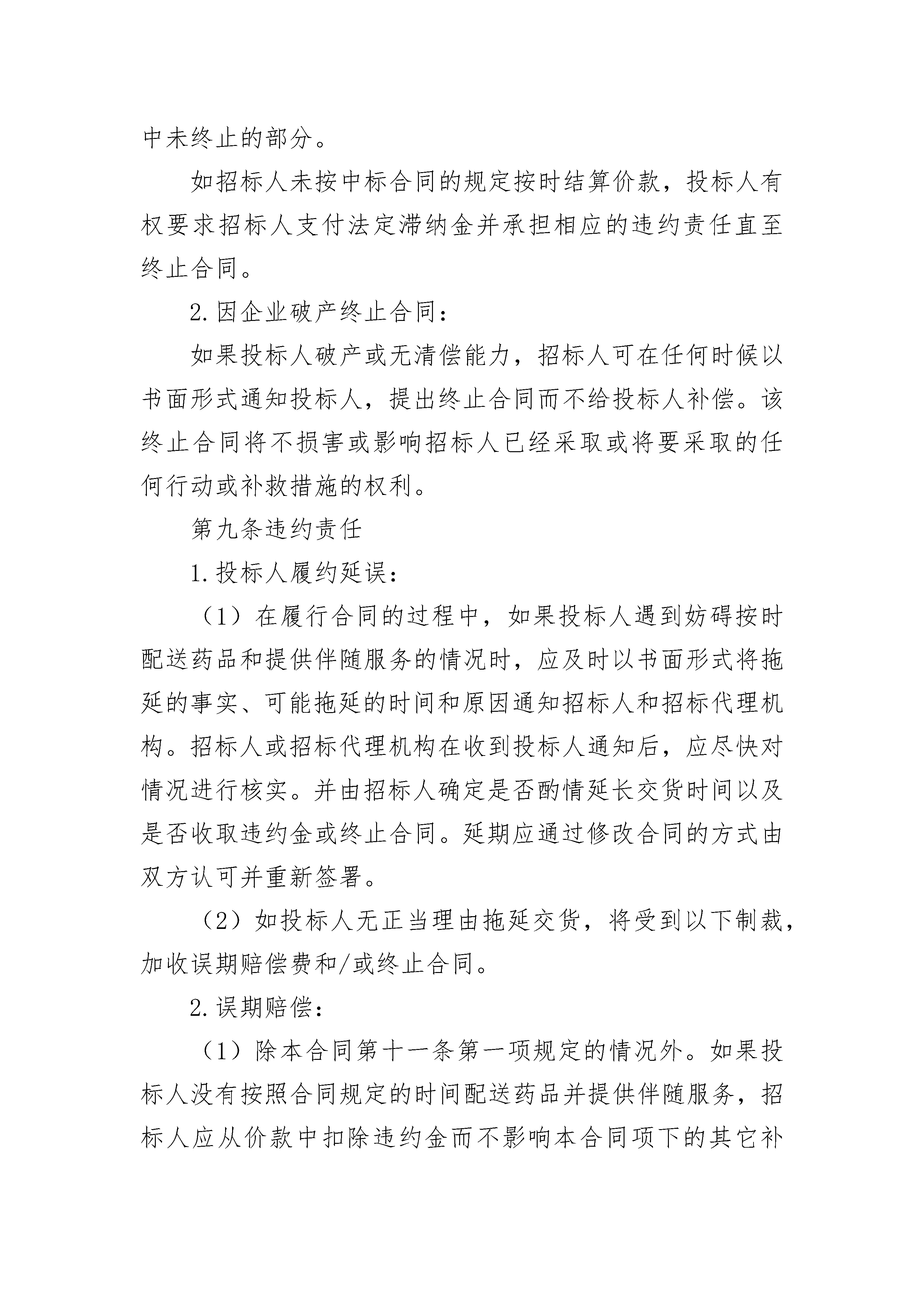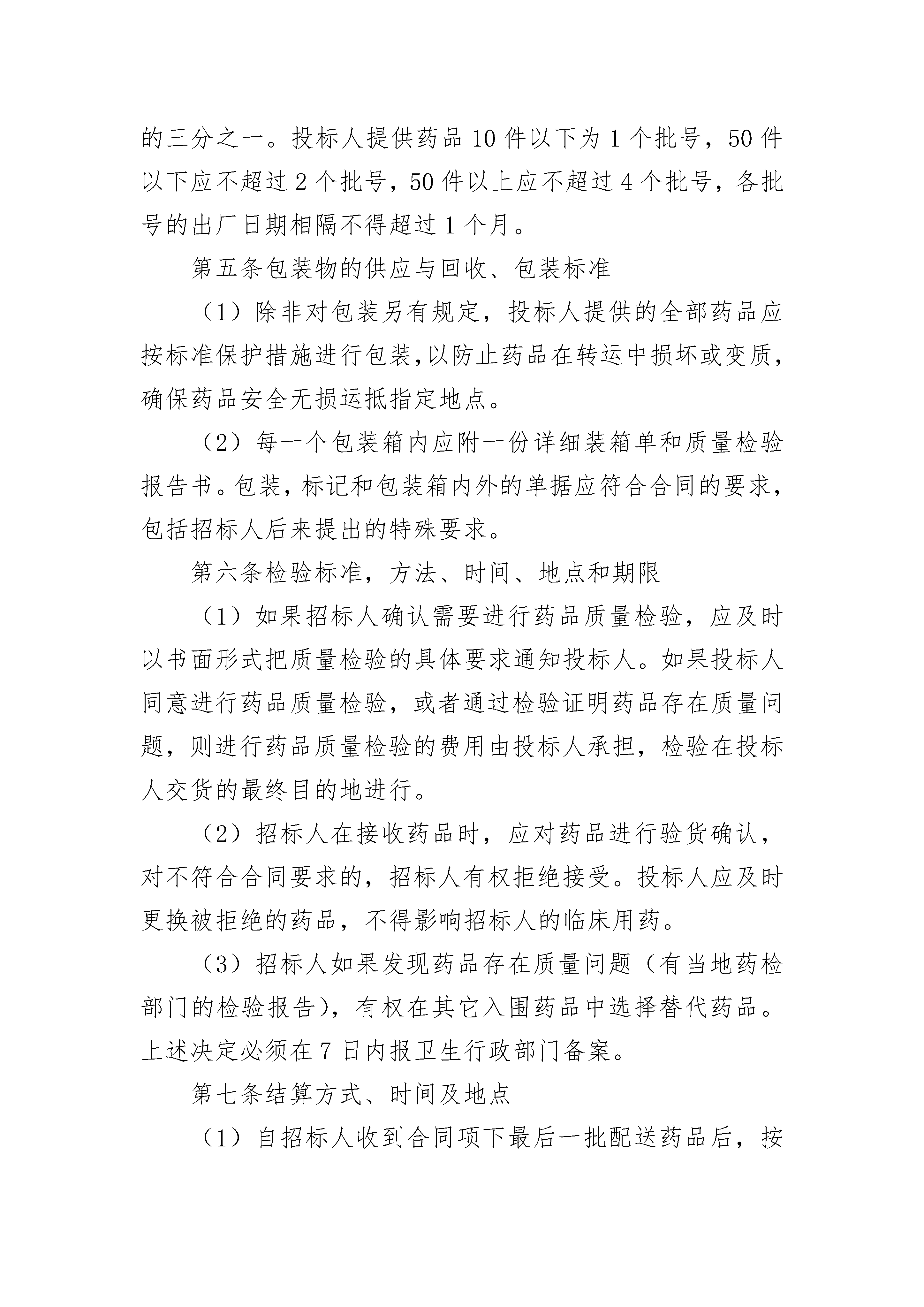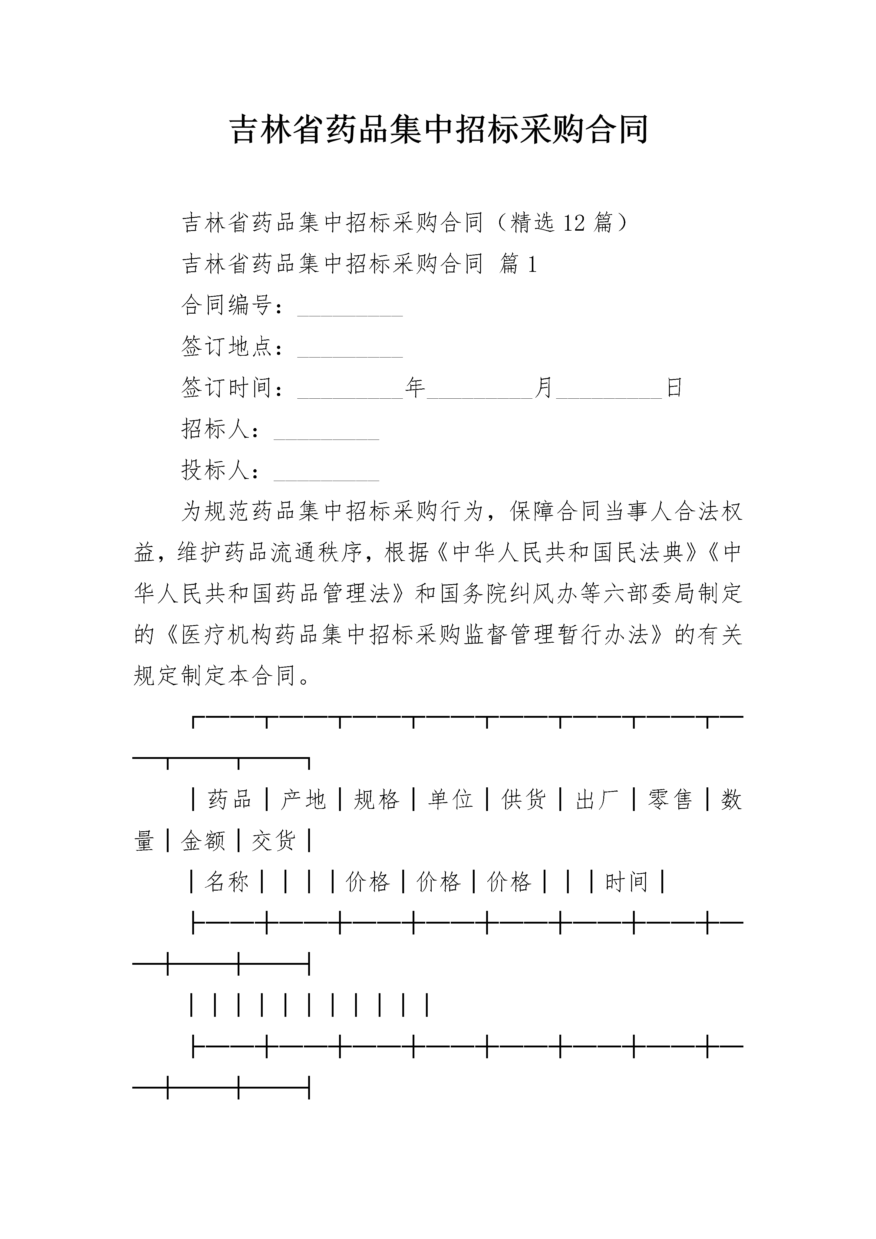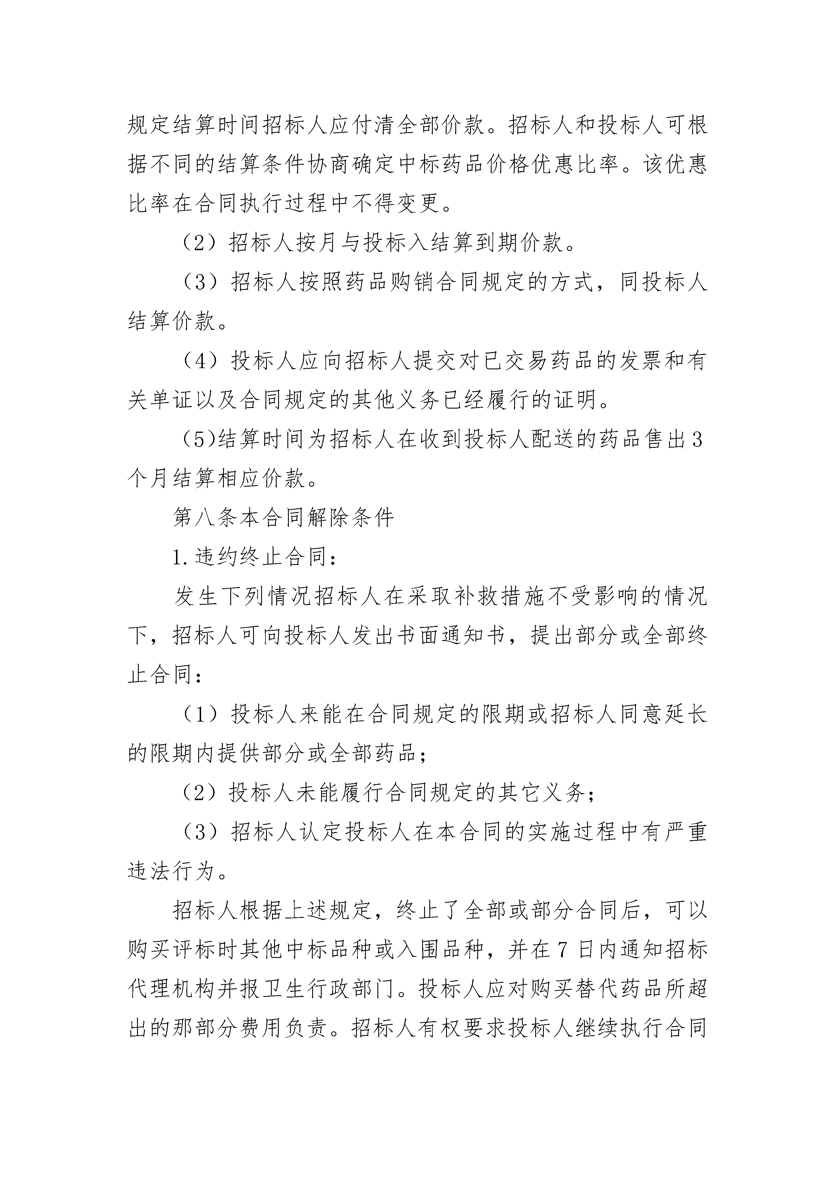 吉林省药品集中招标采购合同吉林省药品集中招标采购合同(精选12篇)吉林省药品集中招标采购合同篇1合同编号:_________签订地点:_________签订时间:_________年_________月_________日招标人:_________投标人:_________为规范药品集中招标采购行为,保障合同当事人合法权益,维护药品流通秩序,根据《中华人民共和国民法典》《中华人民共和国药品管理法》和国务院纠风办等六部委局制定的《医疗机构药品集中招标采购监督管理暂行办法》的有关规定制定本合同。┌──┬──┬──┬──┬──┬──┬──┬──┬──┬──┐│药品│产地│规格│单位│供货│出厂│零售│数量│金额│交货││名称││││价格│价格│价格│││时间│├──┼──┼──┼──┼──┼──┼──┼──┼──┼──┤│││││││││││├──┼──┼──┼──┼──┼──┼──┼──┼──┼──┤│││││││││││├──┼──┼──┼──┼──┼──┼──┼──┼──┼──┤│││││││││││├──┼──┼──┼──┼──┼──┼──┼──┼──┼──┤│││││││││││├──┴──┴──┴──┴──┴──┴──┴──┴──┴──┤│人民币(大写)│└─────────────────────────────┘第一条投标人提供的药品必须符合国家的质量标准及有关质量的规定和要求。第二条投标人必须提供经营的有效证件及所供药品的生产经营许可证、质量标准、价格单等招标人所需的真实允许销售的相关文件和手续,首批供货时上述文件必须提供。第三条投标人首批所供药品须提供真实的省或市药检所检测的检测报告书,每批产品须附该产品合格证;进口药品应附上供货单位质量检验报告书及进口药品注册证。如因药品质量原因造成的一切损失由投标人负全部责任。第四条投标人为生产企业,所供药品不得超过生产日期3个月,投标人为经营企业所供药品不得超过生产日期6个月;有有效期的药品距失效期的时间不得少于其规定有效期的三分之一。投标人提供药品10件以下为1个批号,50件以下应不超过2个批号,50件以上应不超过4个批号,各批号的出厂日期相隔不得超过1个月。第五条包装物的供应与回收、包装标准(1)除非对包装另有规定,投标人提供的全部药品应按标准保护措施进行包装,以防止药品在转运中损坏或变质,确保药品安全无损运抵指定地点。(2)每一个包装箱内应附一份详细装箱单和质量检验报告书。包装,标记和包装箱内外的单据应符合合同的要求,包括招标人后来提出的特殊要求。第六条检验标准,方法、时间、地点和期限(1)如果招标人确认需要进行药品质量检验,应及时以书面形式把质量检验的具体要求通知投标人。如果投标人同意进行药品质量检验,或者通过检验证明药品存在质量问题,则进行药品质量检验的费用由投标人承担,检验在投标人交货的最终目的地进行。(2)招标人在接收药品时,应对药品进行验货确认,对不符合合同要求的,招标人有权拒绝接受。投标人应及时更换被拒绝的药品,不得影响招标人的临床用药。(3)招标人如果发现药品存在质量问题(有当地药检部门的检验报告),有权在其它入围药品中选择替代药品。上述决定必须在7日内报卫生行政部门备案。第七条结算方式、时间及地点(1)自招标人收到合同项下最后一批配送药品后,按规定结算时间招标人应付清全部价款。招标人和投标人可根据不同的结算条件协商确定中标药品价格优惠比率。该优惠比率在合同执行过程中不得变更。(2)招标人按月与投标入结算到期价款。(3)招标人按照药品购销合同规定的方式,同投标人结算价款。(4)投标人应向招标人提交对已交易药品的发票和有关单证以及合同规定的其他义务已经履行的证明。(5)结算时间为招标人在收到投标人配送的药品售出3个月结算相应价款。第八条本合同解除条件1.违约终止合同:发生下列情况招标人在采取补救措施不受影响的情况下,招标人可向投标人发出书面通知书,提出部分或全部终止合同:(1)投标人来能在合同规定的限期或招标人同意延长的限期内提供部分或全部药品;(2)投标人未能履行合同规定的其它义务;(3)招标人认定投标人在本合同的实施过程中有严重违法行为。招标人根据上述规定,终止了全部或部分合同后,可以购买评标时其他中标品种或入围品种,并在7日内通知招标代理机构并报卫生行政部门。投标人应对购买替代药品所超出的那部分费用负责。招标人有权要求投标人继续执行合同中未终止的部分。如招标人未按中标合同的规定按时结算价款,投标人有权要求招标人支付法定滞纳金并承担相应的违约责任直至终止合同。2.因企业破产终止合同:如果投标人破产或无清偿能力,招标人可在任何时候以书面形式通知投标人,提出终止合同而不给投标人补偿。该终止合同将不损害或影响招标人已经采取或将要采取的任何行动或补救措施的