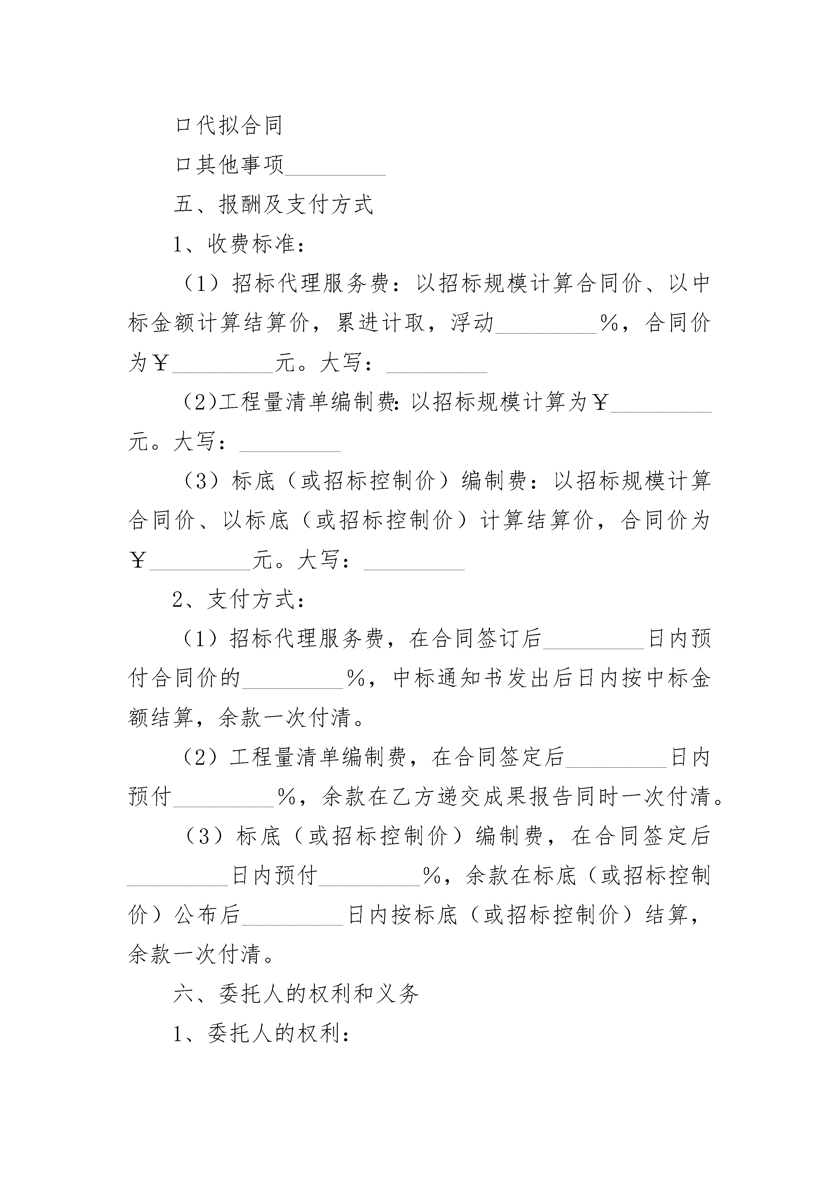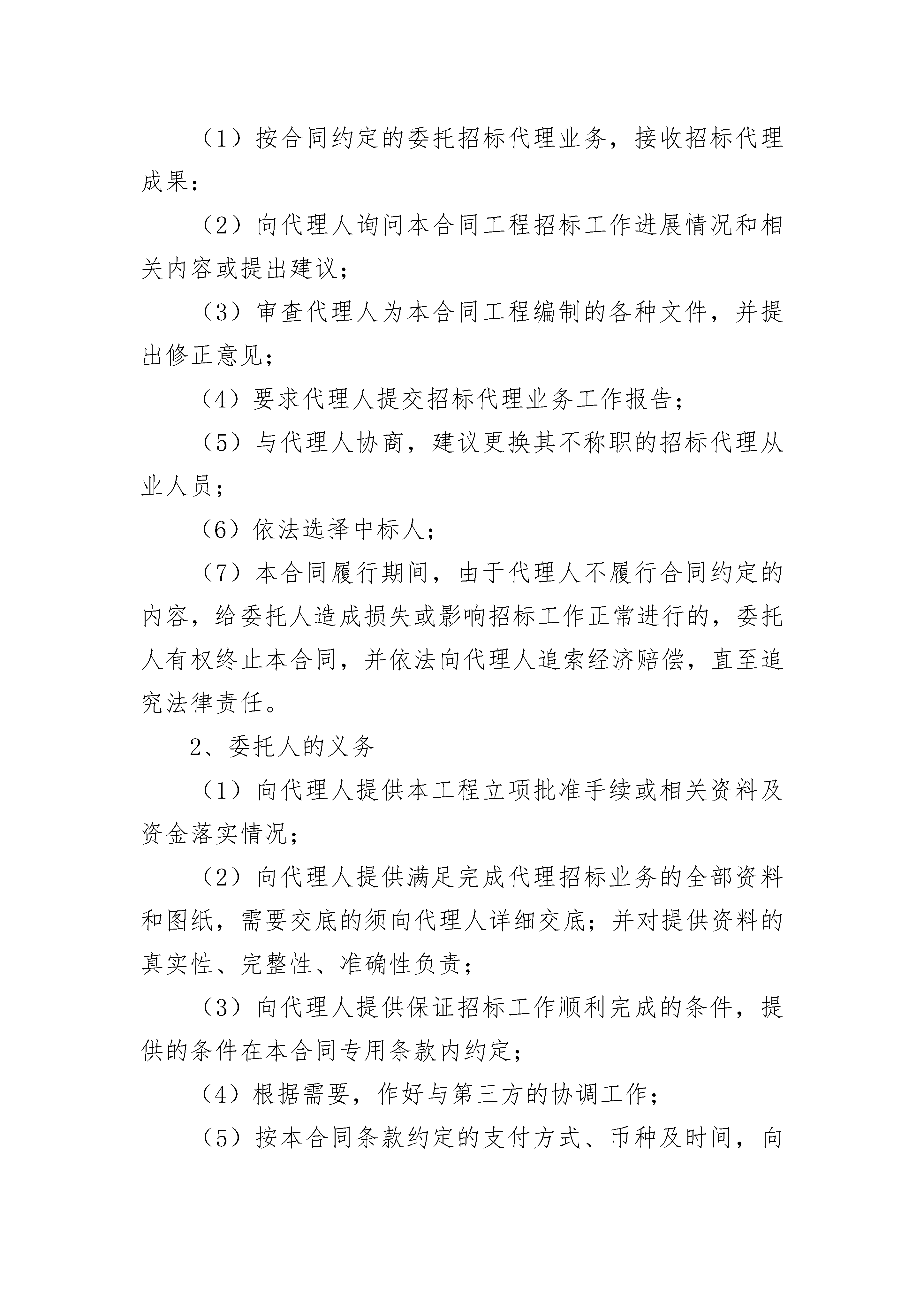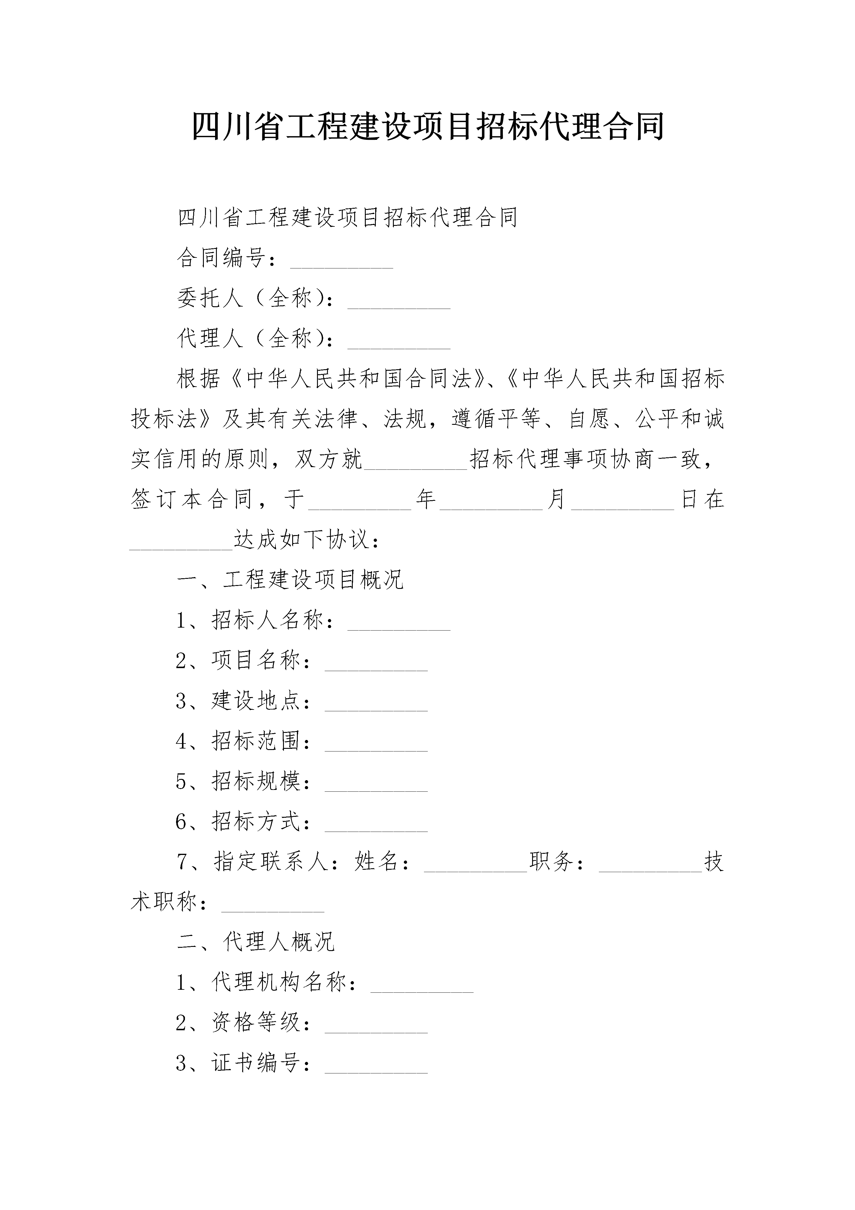 四川省工程建设项目招标代理合同四川省工程建设项目招标代理合同合同编号:_________委托人(全称):_________代理人(全称):_________根据《中华人民共和国合同法》、《中华人民共和国招标投标法》及其有关法律、法规,遵循平等、自愿、公平和诚实信用的原则,双方就_________招标代理事项协商一致,签订本合同,于_________年_________月_________日在_________达成如下协议:一、工程建设项目概况1、招标人名称:_________2、项目名称:_________3、建设地点:_________4、招标范围:_________5、招标规模:_________6、招标方式:_________7、指定联系人:姓名:_________职务:_________技术职称:_________二、代理人概况1、代理机构名称:_________2、资格等级:_________3、证书编号:_________4、拟派专职人员:(1)姓名:_________技术职称:_________身份证号:_________(2)姓名:_________技术职称:_________身份证号:_________(3)姓名:_________技术职称:_________身份证号:_________三、委托人委托代理人为_________工程建设项目的招标代理人,承担本工程的_________招标工作。四、委托范围委托范围如下口中划√者:口起草招标公告口代拟投标邀请书口编制资格预审文件口协助招标人评审投标资格预审文件口编制和发售招标文件口编制工程量清单或标底口组织投标人踏勘现场、答疑、草拟答疑纪要口协助招标人或受招标人委托依法组建评标委员会口协助招标人或受招标人委托组织开标、评标、定标会口向中标人发出中标通知书,向未中标的投标人发出中标结果通知书口编制招标报告口办理招标的备案手续和有关事项的公示手续口代拟合同口其他事项_________五、报酬及支付方式1、收费标准:(1)招标代理服务费:以招标规模计算合同价、以中标金额计算结算价,累进计取,浮动_________%,合同价为¥_________元。大写:_________(2)工程量清单编制费:以招标规模计算为¥_________元。大写:_________(3)标底(或招标控制价)编制费:以招标规模计算合同价、以标底(或招标控制价)计算结算价,合同价为¥_________元。大写:_________2、支付方式:(1)招标代理服务费,在合同签订后_________日内预付合同价的_________%,中标通知书发出后日内按中标金额结算,余款一次付清。(2)工程量清单编制费,在合同签定后_________日内预付_________%,余款在乙方递交成果报告同时一次付清。(3)标底(或招标控制价)编制费,在合同签定后_________日内预付_________%,余款在标底(或招标控制价)公布后_________日内按标底(或招标控制价)结算,余款一次付清。六、委托人的权利和义务1、委托人的权利:(1)按合同约定的委托招标代理业务,接收招标代理成果:(2)向代理人询问本合同工程招标工作进展情况和相关内容或提出建议;(3)审查代理人为本合同工程编制的各种文件,并提出修正意见;(4)要求代理人提交招标代理业务工作报告;(5)与代理人协商,建议更换其不称职的招标代理从业人员;(6)依法选择中标人;(7)本合同履行期间,由于代理人不履行合同约定的内容,给委托人造成损失或影响招标工作正常进行的,委托人有权终止本合同,并依法向代理人追索经济赔偿,直至追究法律责任。2、委托人的义务(1)向代理人提供本工程立项批准手续或相关资料及资金落实情况;(2)向代理人提供满足完成代理招标业务的全部资料和图纸,需要交底的须向代理人详细交底;并对提供资料的真实性、完整性、准确性负责;(3)向代理人提供保证招标工作顺利完成的条件,提供的条件在本合同专用条款内约定;(4)根据需要,作好与第三方的协调工作;(5)按本合同条款约定的支付方式、币种及时间,向代理人支付代理报酬;(6)委托人不得提出违反法律、行政法规的要求,否则代理人有权拒绝其这类要求;(7)依法应尽的其他义务。七、代理人的权利和义务1、代理人的权利(1)按合同约定收取委托代理报酬;(2)对招标过程中应由委托人做出的决定,代理人有权提出建议;(3)当委托人提供的资料不足或不明确时,有权提出补足资料或作出明确的答复;(4)拒绝委托人提出的违反法律、行政法规的要求,并向委托人作出解释;(5)有权参加委托人组织的涉及招标工作的所有会议和活动;(6)对于为本合同工程编制的所有文件拥有版权,委托人仅有使用或复制的权利;2、代理人的义务(1)选择有足够经