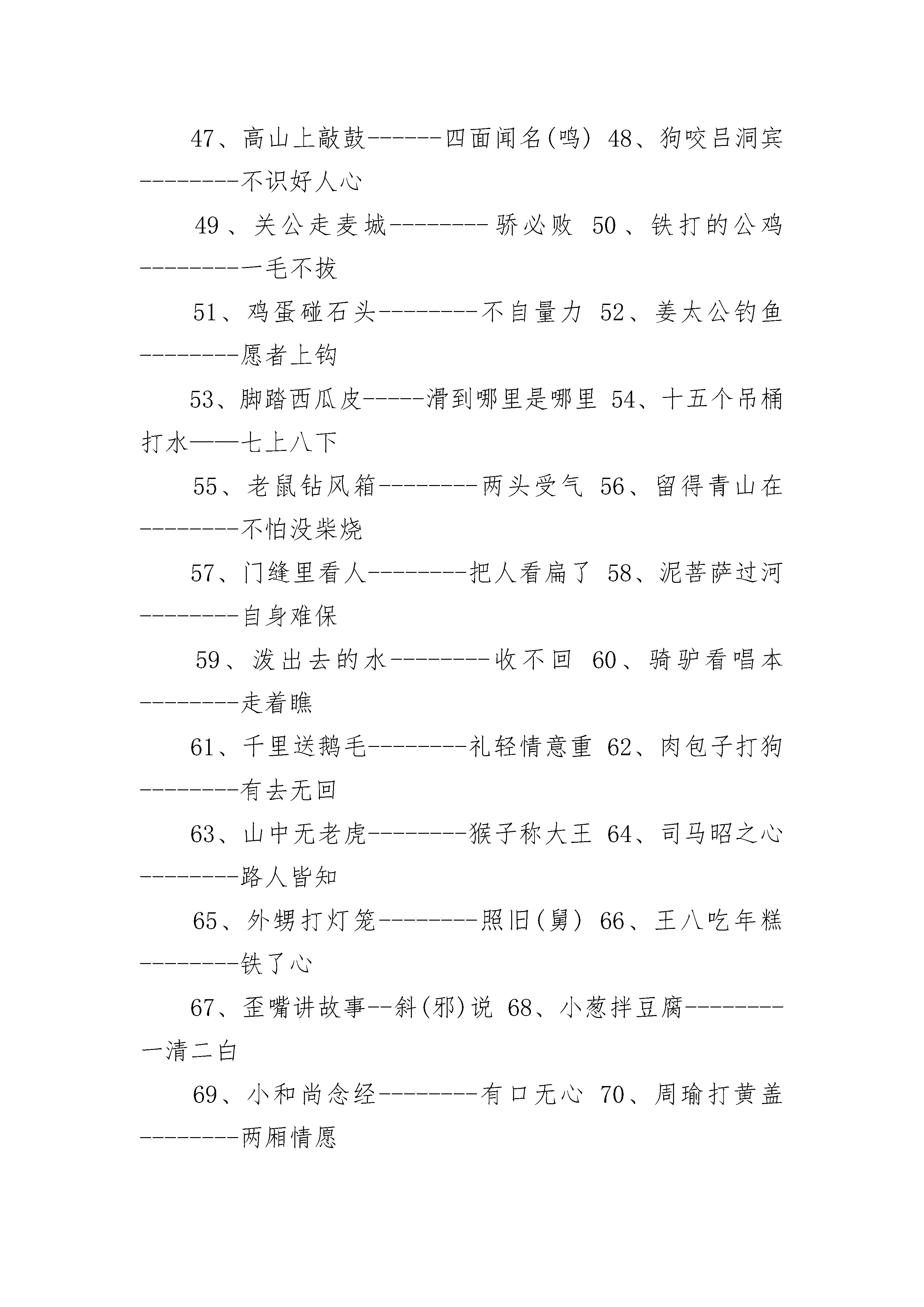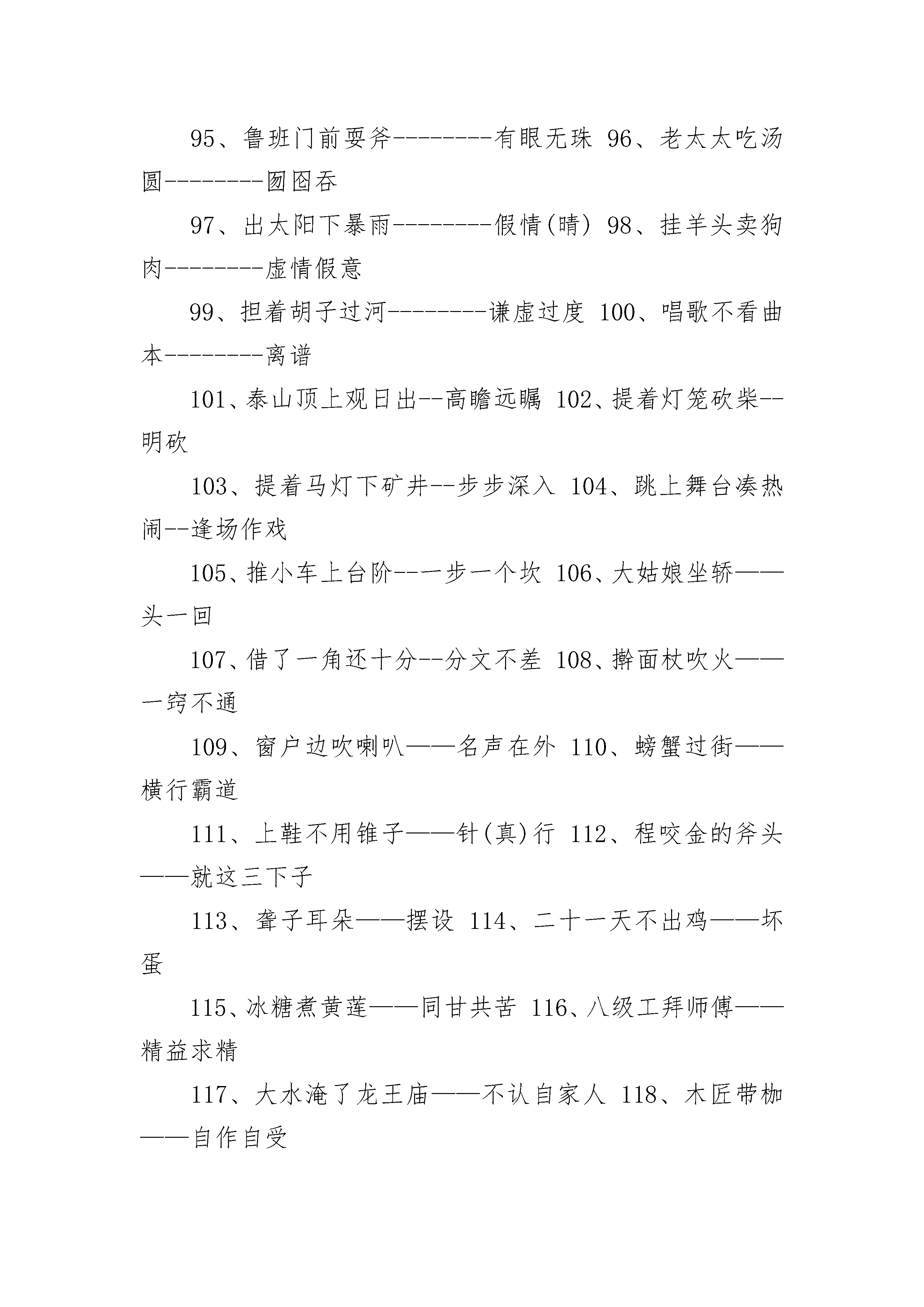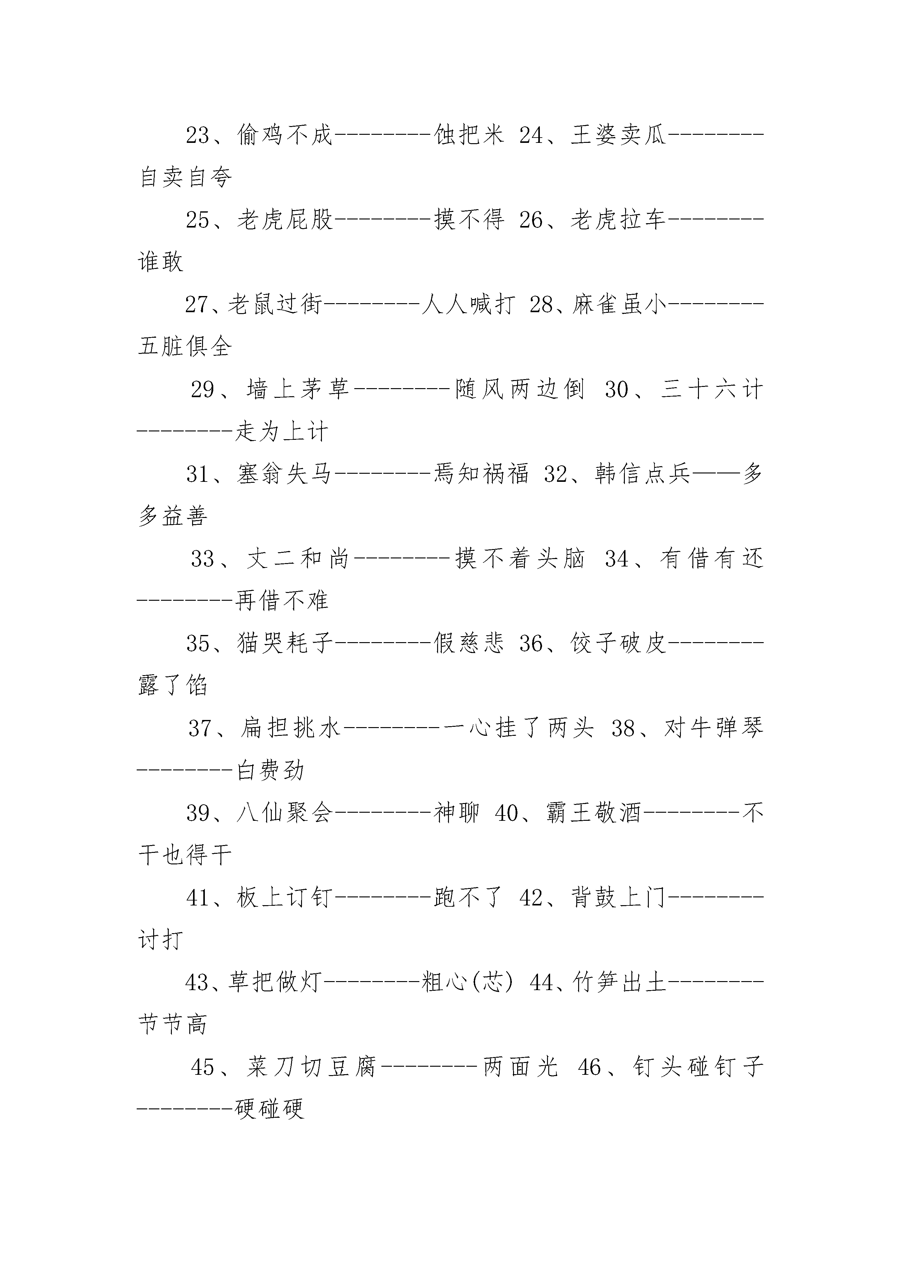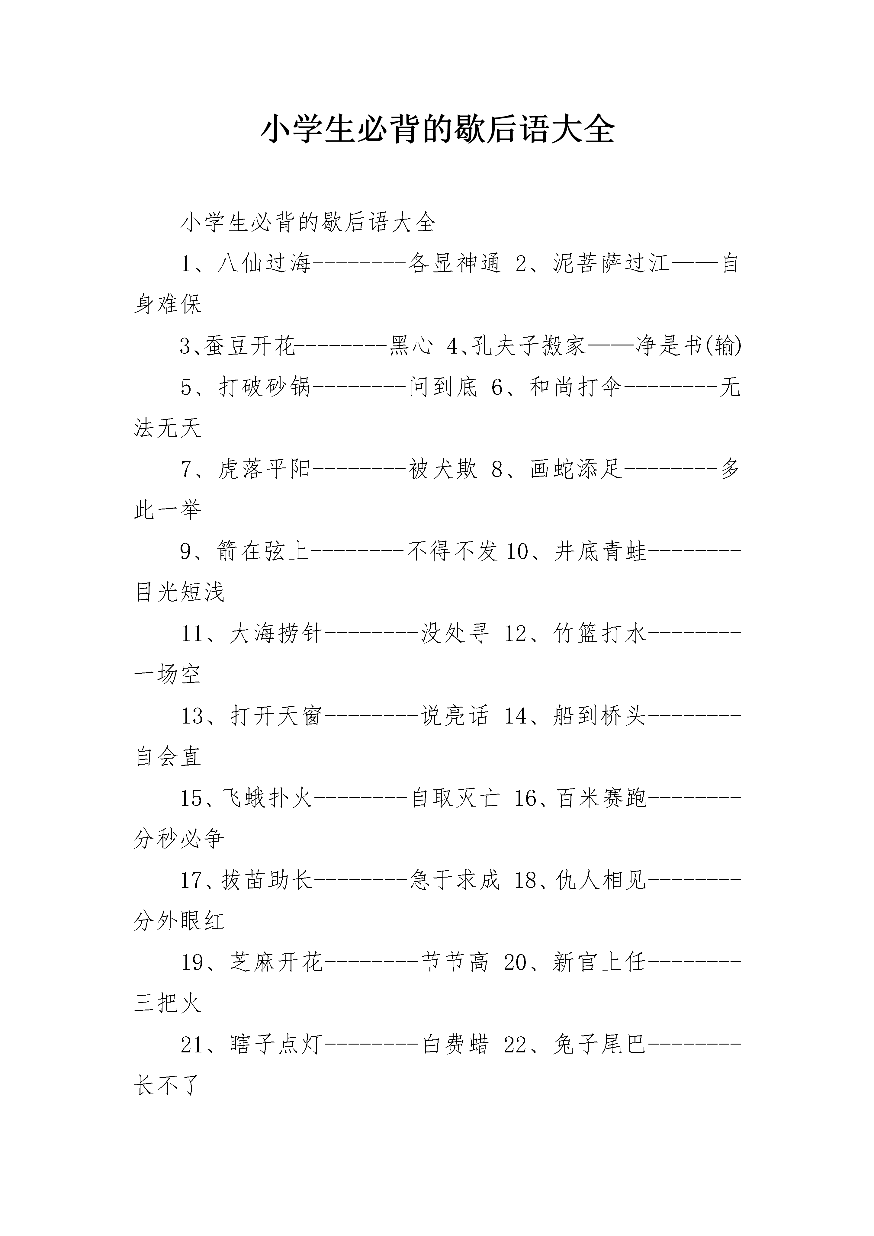 小学生必背的歇后语大全小学生必背的歇后语大全1、八仙过海--------各显神通2、泥菩萨过江——自身难保3、蚕豆开花--------黑心4、孔夫子搬家——净是书(输)5、打破砂锅--------问到底6、和尚打伞--------无法无天7、虎落平阳--------被犬欺8、画蛇添足--------多此一举9、箭在弦上--------不得不发10、井底青蛙--------目光短浅11、大海捞针--------没处寻12、竹篮打水--------一场空13、打开天窗--------说亮话14、船到桥头--------自会直15、飞蛾扑火--------自取灭亡16、百米赛跑--------分秒必争17、拔苗助长--------急于求成18、仇人相见--------分外眼红19、芝麻开花--------节节高20、新官上任--------三把火21、瞎子点灯--------白费蜡22、兔子尾巴--------长不了23、偷鸡不成--------蚀把米24、王婆卖瓜--------自卖自夸25、老虎屁股--------摸不得26、老虎拉车--------谁敢27、老鼠过街--------人人喊打28、麻雀虽小--------五脏俱全29、墙上茅草--------随风两边倒30、三十六计--------走为上计31、塞翁失马--------焉知祸福32、韩信点兵——多多益善33、丈二和尚--------摸不着头脑34、有借有还--------再借不难35、猫哭耗子--------假慈悲36、饺子破皮--------露了馅37、扁担挑水--------一心挂了两头38、对牛弹琴--------白费劲39、八仙聚会--------神聊40、霸王敬酒--------不干也得干41、板上订钉--------跑不了42、背鼓上门--------讨打43、草把做灯--------粗心(芯)44、竹笋出土--------节节高45、菜刀切豆腐--------两面光46、钉头碰钉子--------硬碰硬47、高山上敲鼓------四面闻名(鸣)48、狗咬吕洞宾--------不识好人心49、关公走麦城--------骄必败50、铁打的公鸡--------一毛不拔51、鸡蛋碰石头--------不自量力52、姜太公钓鱼--------愿者上钩53、脚踏西瓜皮-----滑到哪里是哪里54、十五个吊桶打水——七上八下55、老鼠钻风箱--------两头受气56、留得青山在--------不怕没柴烧57、门缝里看人--------把人看扁了58、泥菩萨过河--------自身难保59、泼出去的水--------收不回60、骑驴看唱本--------走着瞧61、千里送鹅毛--------礼轻情意重62、肉包子打狗--------有去无回63、山中无老虎--------猴子称大王64、司马昭之心--------路人皆知65、外甥打灯笼--------照旧(舅)66、王八吃年糕--------铁了心67、歪嘴讲故事--斜(邪)说68、小葱拌豆腐--------一清二白69、小和尚念经--------有口无心70、周瑜打黄盖--------两厢情愿71、赶鸭子上架--------吃力不讨好72、擀面杖吹火--------一窍不通73、瞎子戴眼镜--------装饰74、猴子捞月亮--------空忙一场75、秀才遇到兵--------有理讲不清76、三个臭皮匠--------顶个诸葛亮77、小和尚念经——有口无心78、和尚训道士--------管得宽79、过年娶媳妇--------双喜临门80、聋子见哑巴--------不闻不问81、铜钣上钉铆钉---一是一,二是二82、里弄里扛竹竿--------直来直去83、苦水里泡黄连--------苦上加苦84、我解缆,你推船--顺水人情85、猪鼻子里插葱--------装象86、只许州官放火-----不许百姓点灯87、猪八戒照镜子-------里外不是人88、放风筝断了线--------没指望了89、池塘里的风波--------大不了90、谈心不点灯--说黑话91、顶风顶水划船--------硬撑92、八仙过海——各显神通93、东洋人戴高帽--------假充大个94、到火神庙求雨--------找错了门95、鲁班门前耍斧--------有眼无珠96、老太太吃汤圆--------囫囵吞97、出太阳下暴雨--------假情(晴)98、挂羊头卖狗肉--------虚情假意99、担着胡子过河--------谦虚过度100、唱歌不看曲本--------离谱101、泰山顶上观日出--高瞻远瞩102、提着灯笼砍柴--明砍103、提着马灯下矿井--步步深入104、跳上舞台凑热闹--逢场作戏105、推小车上台阶--一步一个坎106、