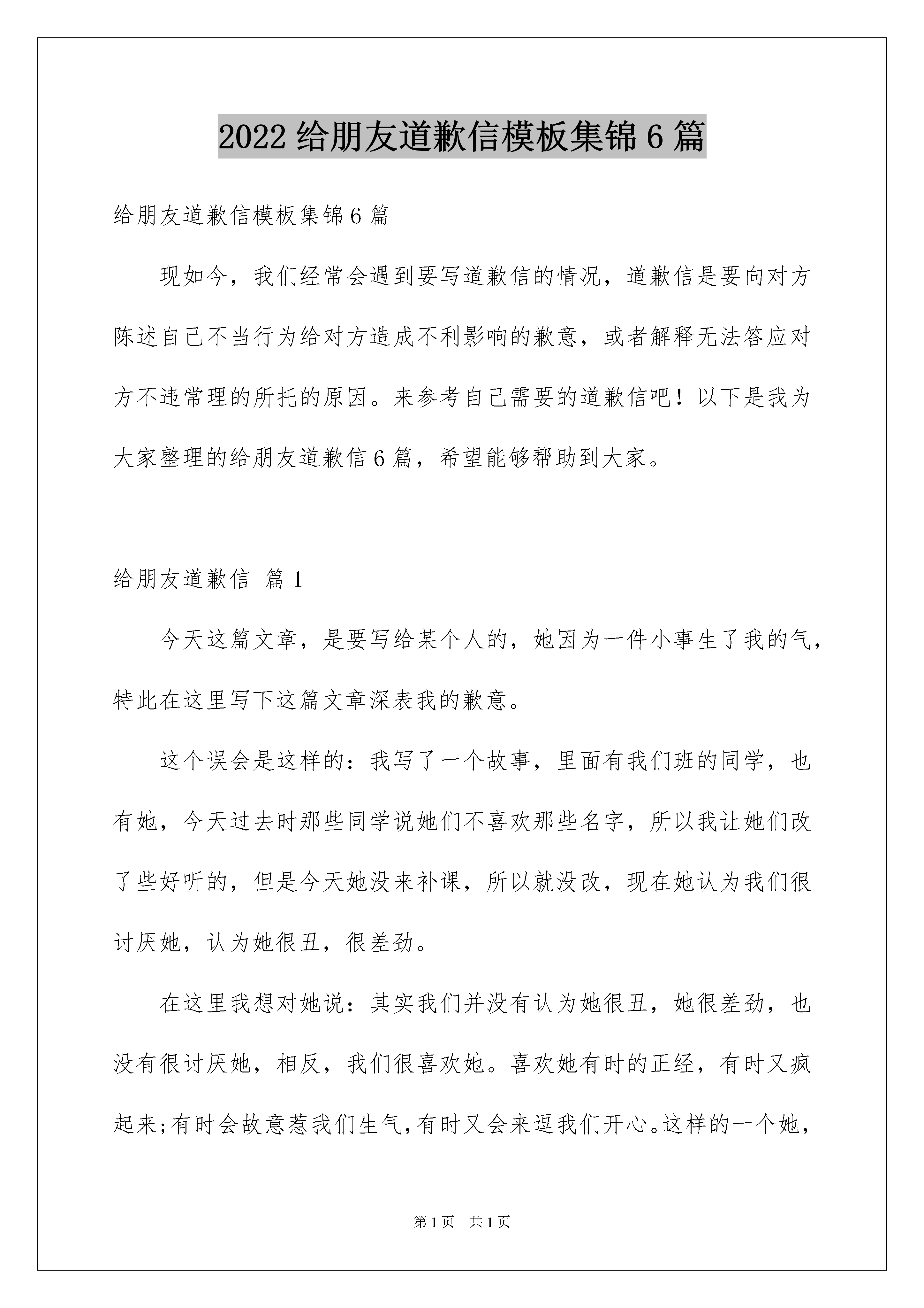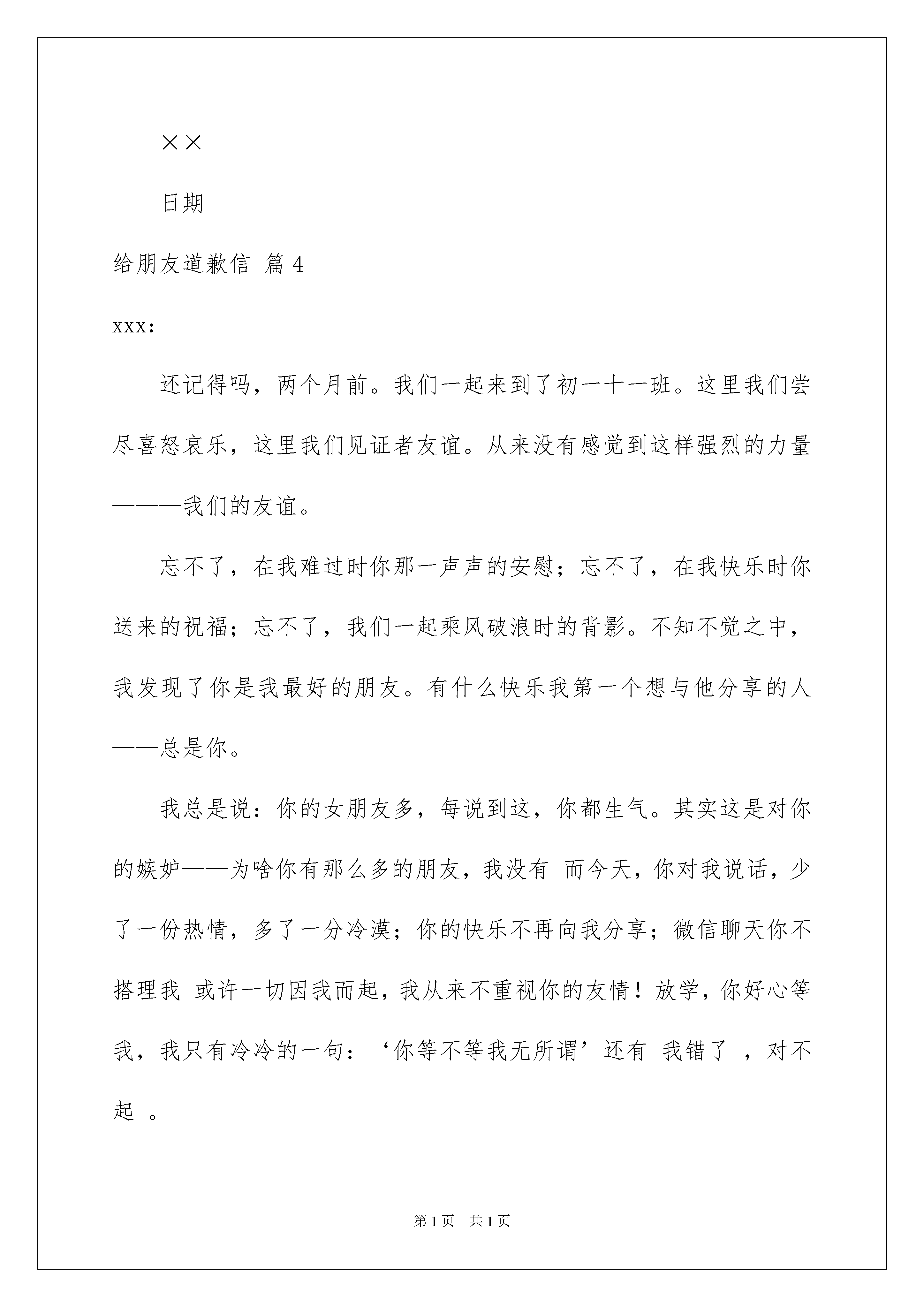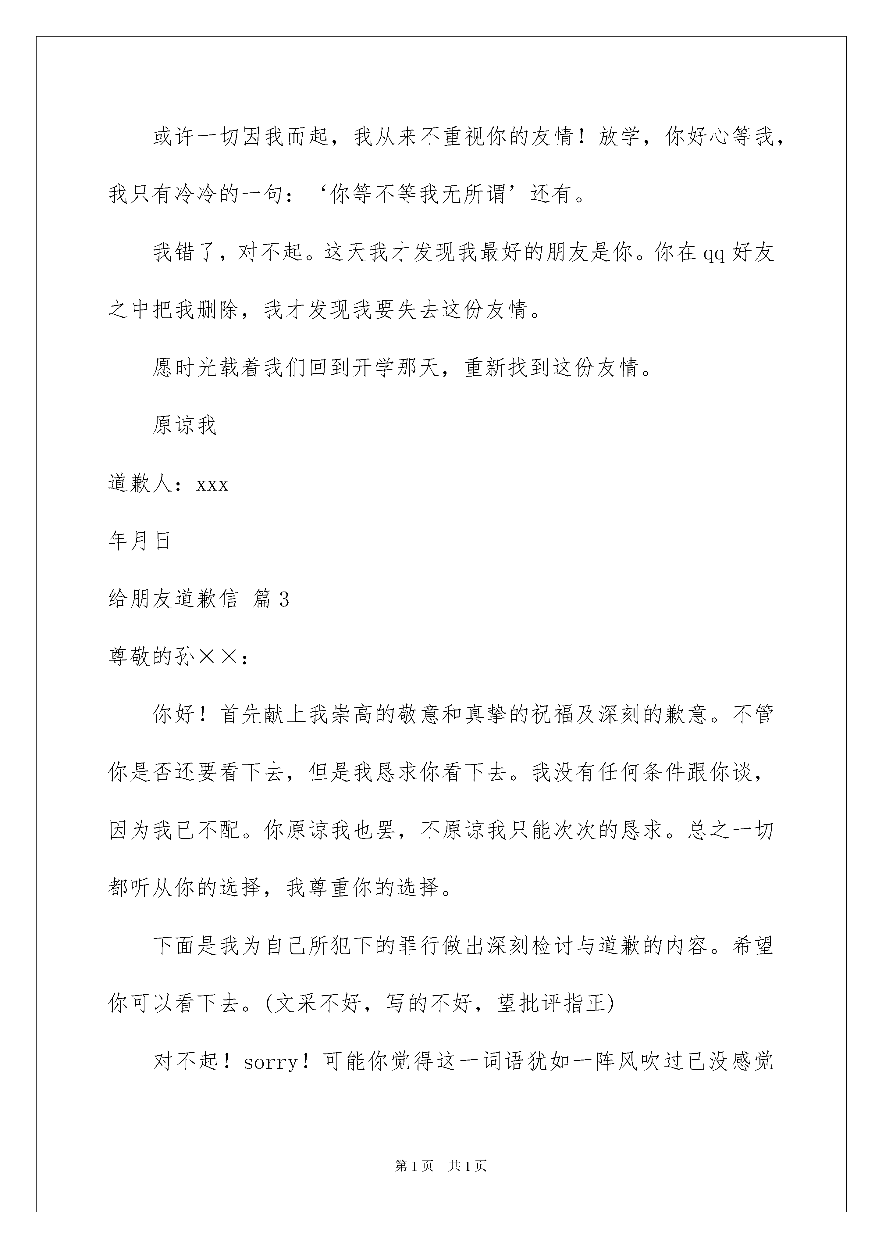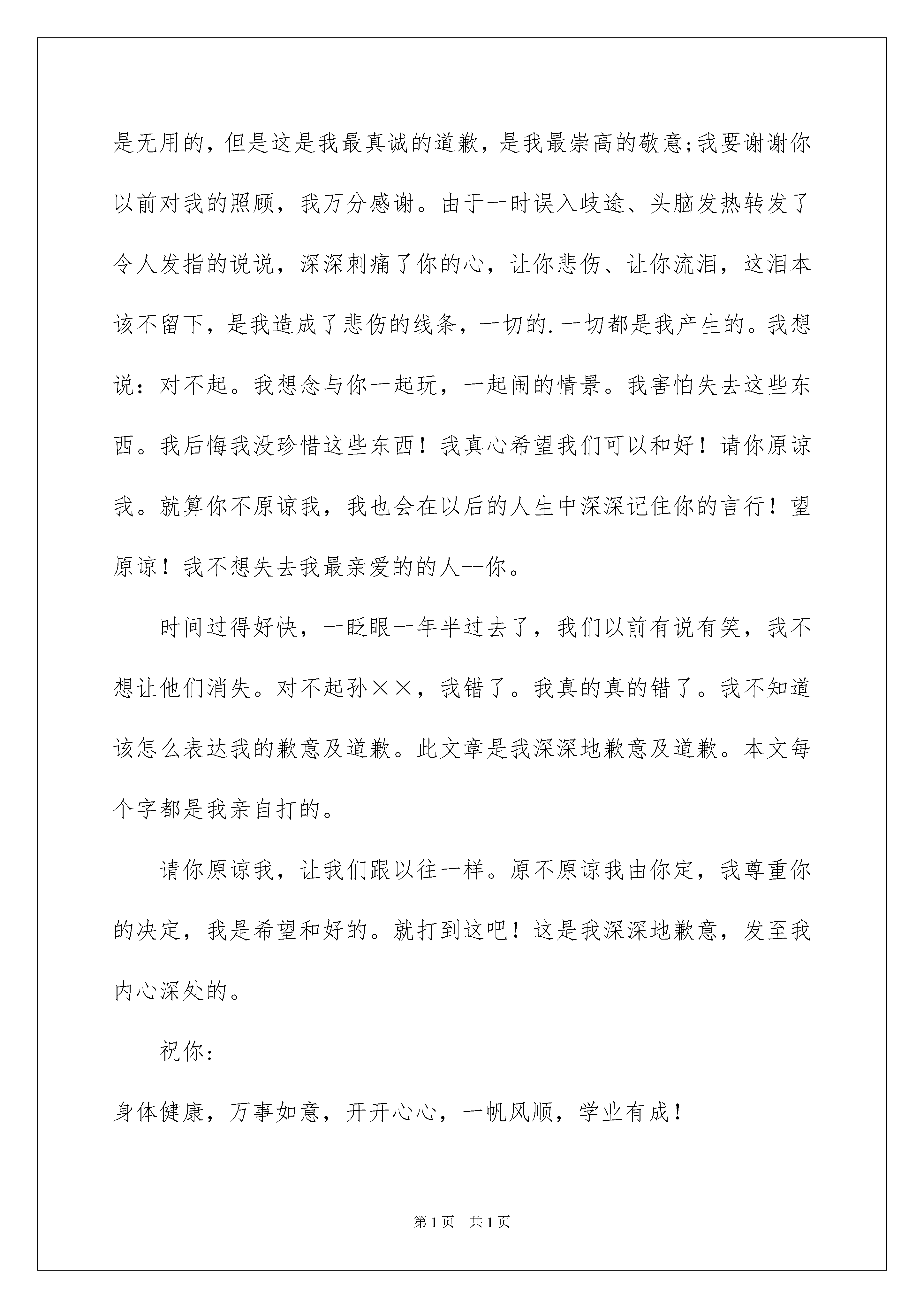2022给朋友道歉信模板集锦6篇给朋友道歉信模板集锦6篇现如今,我们经常会遇到要写道歉信的情况,道歉信是要向对方陈述自己不当行为给对方造成不利影响的歉意,或者解释无法答应对方不违常理的所托的原因。来参考自己需要的道歉信吧!以下是我为大家整理的给朋友道歉信6篇,希望能够帮助到大家。给朋友道歉信篇1今天这篇文章,是要写给某个人的,她因为一件小事生了我的气,特此在这里写下这篇文章深表我的歉意。这个误会是这样的:我写了一个故事,里面有我们班的同学,也有她,今天过去时那些同学说她们不喜欢那些名字,所以我让她们改了些好听的,但是今天她没来补课,所以就没改,现在她认为我们很讨厌她,认为她很丑,很差劲。在这里我想对她说:其实我们并没有认为她很丑,她很差劲,也没有很讨厌她,相反,我们很喜欢她。喜欢她有时的正经,有时又疯起来;有时会故意惹我们生气,有时又会来逗我们开心。这样的一个她,我觉得才是完美的。她人确实很好,能为我们排忧解难,尽管我们有时会发生些小冲突,但那仅仅是我们朋友路上的一颗绊脚石,我们也许会摔一跤,但摔了之后,能有个真心愿意扶你起来的人,那才是好的。给朋友道歉信篇2给张xx:我这几天对你的冷漠。期望我们还能像从前一样好。我这天晚上在百忙之中抽出一点宝贵的时光给你写这封道歉信。期望你看了以后能及时原谅我的过错,我会以此为鉴,厉精图志,改过自新,重新做人,请求你给我一次机会,我会用我的实际行动证明,你的决定是无比英明神武的!在我难过时你那一声声的安慰;忘不了,在我快乐时你送来的祝福;忘不了,我们一齐乘风破浪时的背影。不知不觉之中,我发现了你是我最好的朋友。有什么快乐我第一个想与他分享的人——总是你。我总是说:你的女朋友多,每说到这,你都生气。其实这是对你的嫉妒——为啥你有那么多的朋友,我没有。而这天,你对我说话,少了一份热情,多了一分冷漠;你的快乐不再向我分享;qq聊天你不搭理我。或许一切因我而起,我从来不重视你的友情!放学,你好心等我,我只有冷冷的一句:‘你等不等我无所谓’还有。我错了,对不起。这天我才发现我最好的朋友是你。你在qq好友之中把我删除,我才发现我要失去这份友情。愿时光载着我们回到开学那天,重新找到这份友情。原谅我道歉人:xxx年月日给朋友道歉信篇3尊敬的孙××:你好!首先献上我崇高的敬意和真挚的祝福及深刻的歉意。不管你是否还要看下去,但是我恳求你看下去。我没有任何条件跟你谈,因为我已不配。你原谅我也罢,不原谅我只能次次的恳求。总之一切都听从你的选择,我尊重你的选择。下面是我为自己所犯下的罪行做出深刻检讨与道歉的内容。希望你可以看下去。(文采不好,写的不好,望批评指正)对不起!sorry!可能你觉得这一词语犹如一阵风吹过已没感觉是无用的,但是这是我最真诚的道歉,是我最崇高的敬意;我要谢谢你以前对我的照顾,我万分感谢。由于一时误入歧途、头脑发热转发了令人发指的说说,深深刺痛了你的心,让你悲伤、让你流泪,这泪本该不留下,是我造成了悲伤的线条,一切的.一切都是我产生的。我想说:对不起。我想念与你一起玩,一起闹的情景。我害怕失去这些东西。我后悔我没珍惜这些东西!我真心希望我们可以和好!请你原谅我。就算你不原谅我,我也会在以后的人生中深深记住你的言行!望原谅!我不想失去我最亲爱的的人--你。时间过得好快,一眨眼一年半过去了,我们以前有说有笑,我不想让他们消失。对不起孙××,我错了。我真的真的错了。我不知道该怎么表达我的歉意及道歉。此文章是我深深地歉意及道歉。本文每个字都是我亲自打的。请你原谅我,让我们跟以往一样。原不原谅我由你定,我尊重你的决定,我是希望和好的。就打到这吧!这是我深深地歉意,发至我内心深处的。祝你:身体健康,万事如意,开开心心,一帆风顺,学业有成!××日期给朋友道歉信篇4xxx:还记得吗,两个月前。我们一起来到了初一十一班。这里我们尝尽喜怒哀乐,这里我们见证者友谊。从来没有感觉到这样强烈的力量———我们的友谊。忘不了,在我难过时你那一声声的安慰;忘不了,在我快乐时你送来的祝福;忘不了,我们一起乘风破浪时的背影。不知不觉之中,我发现了你是我最好的朋友。有什么快乐我第一个想与他分享的人——总是你。我总是说:你的女朋友多,每说到这,你都生气。其实这是对你的嫉妒——为啥你有那么多的朋友,我没有而今天,你对我说话,少了一份热情,多了一分冷漠;你的快乐不再向我分享;微信聊天你不搭理我或许一切因我而起,我从来不重视你的友情!放学,你好心等我,我只有冷冷的一句:‘你等不等我无所谓’还有我错了,对不起。今天我才发现我最好的朋友是你。你在微信好友之中把我删除,我才发现我要失去这份友
