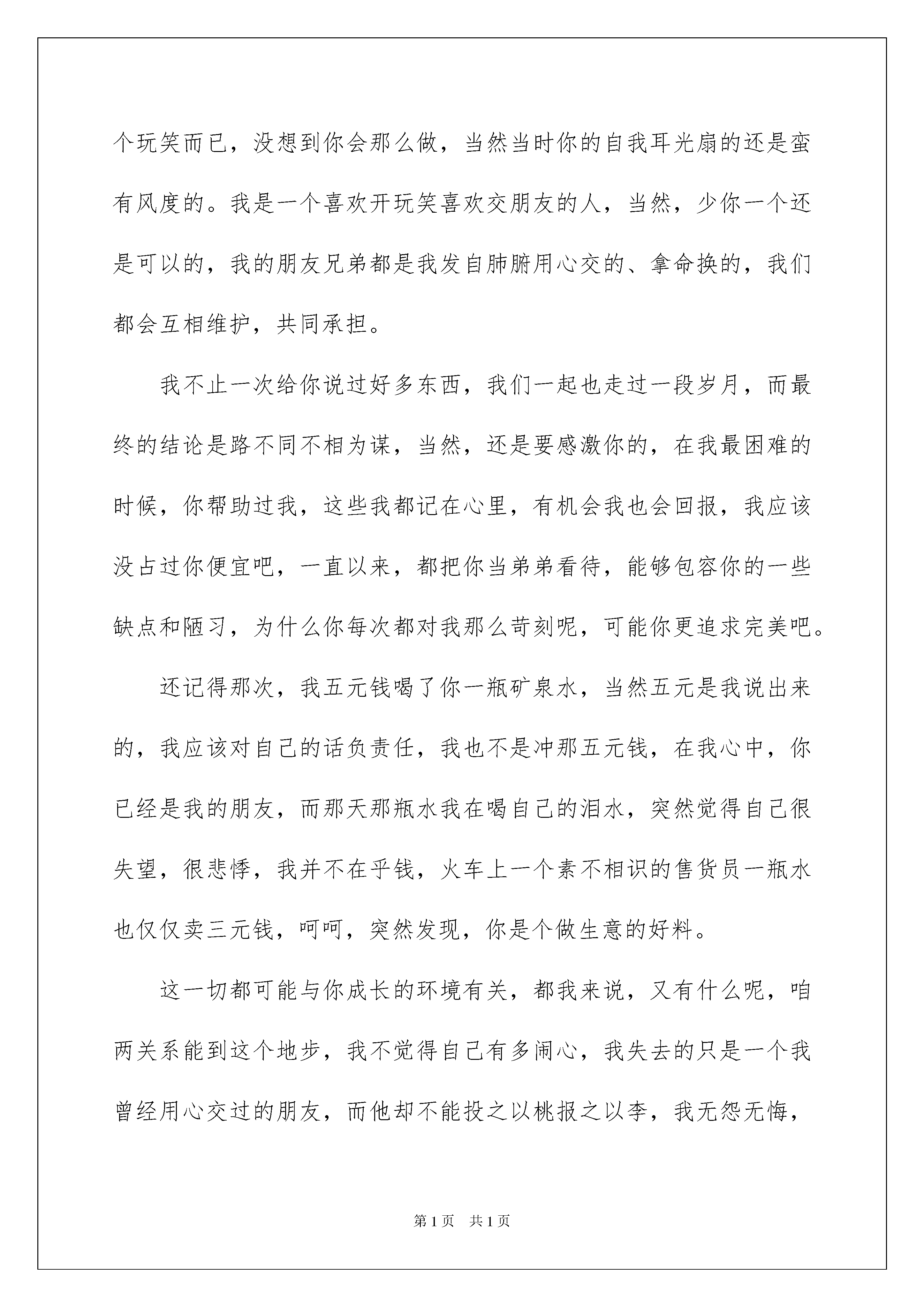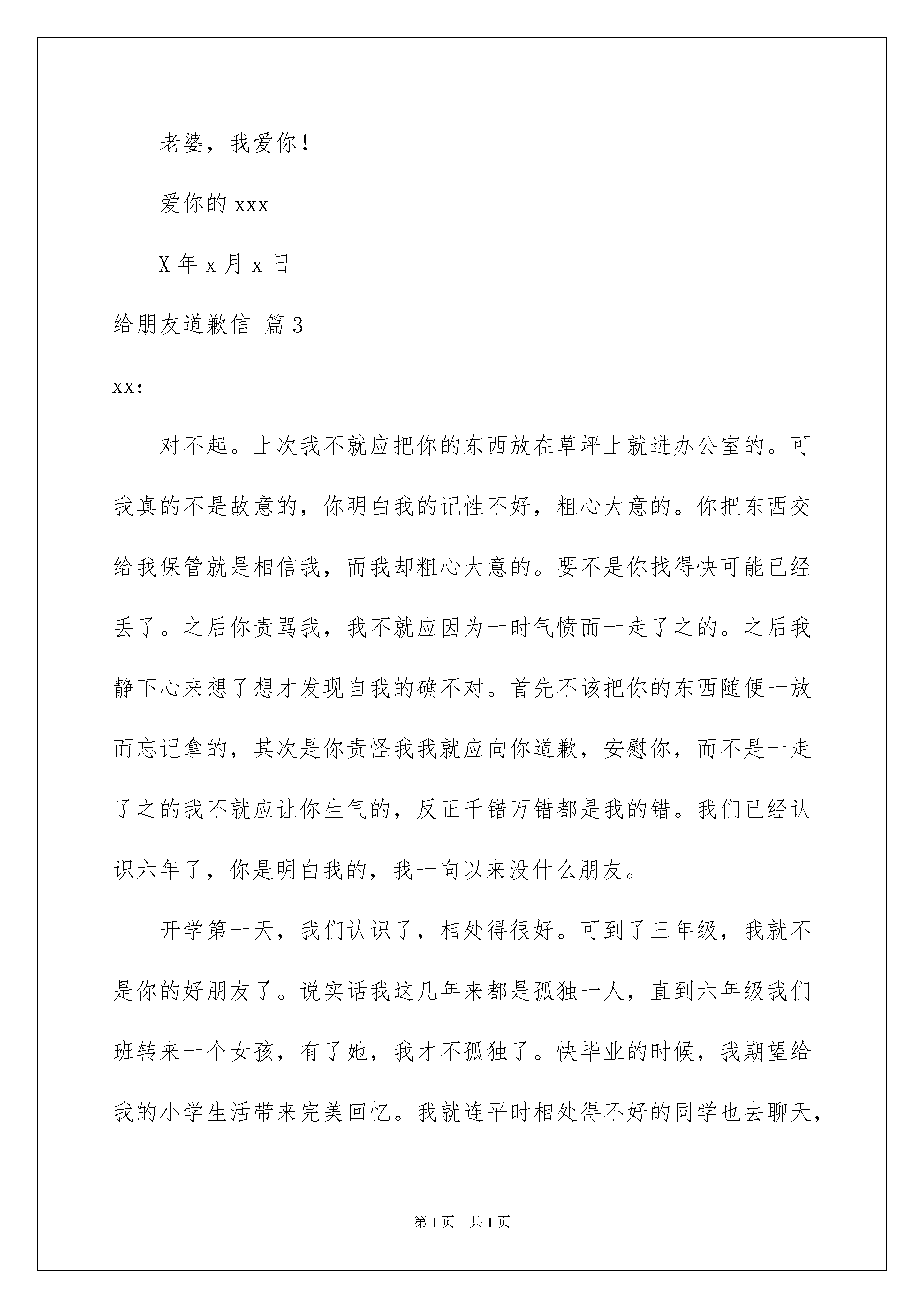 2022给朋友道歉信汇编七篇给朋友道歉信汇编七篇在人们往来越来越密切的今天,用到道歉信的地方越来越多,道歉信都有实事求是,简明扼要的特点。在写之前,可以先参考范文,下面是我帮大家整理的给朋友道歉信7篇,供大家参考借鉴,希望可以帮助到有需要的朋友。给朋友道歉信篇1亲爱的朋友:对不起。亲爱的朋友,前段时间的事哥给你赔不是,希望你能原谅。每个人都有自己的想法,作为男性,我想我们都需要面子,或许你不太在乎这些,这段时间,闲暇的时间我也在自我反省,我的缺点确实挺多,在大学,抑或是在寝室这种环境下,我们都在发展自己,用四年的时间见证我们的成长,其实说实话,你那天的举措我真想一把把你从床上拽下来,可是我选择了“忍”,一时的冲动只会让你遭受皮肤之苦,而我会为自己的行为付出更多,完全没有必要,仅仅是一个玩笑而已,没想到你会那么做,当然当时你的自我耳光扇的还是蛮有风度的。我是一个喜欢开玩笑喜欢交朋友的人,当然,少你一个还是可以的,我的朋友兄弟都是我发自肺腑用心交的、拿命换的,我们都会互相维护,共同承担。我不止一次给你说过好多东西,我们一起也走过一段岁月,而最终的结论是路不同不相为谋,当然,还是要感激你的,在我最困难的时候,你帮助过我,这些我都记在心里,有机会我也会回报,我应该没占过你便宜吧,一直以来,都把你当弟弟看待,能够包容你的一些缺点和陋习,为什么你每次都对我那么苛刻呢,可能你更追求完美吧。还记得那次,我五元钱喝了你一瓶矿泉水,当然五元是我说出来的,我应该对自己的话负责任,我也不是冲那五元钱,在我心中,你已经是我的朋友,而那天那瓶水我在喝自己的泪水,突然觉得自己很失望,很悲悸,我并不在乎钱,火车上一个素不相识的售货员一瓶水也仅仅卖三元钱,呵呵,突然发现,你是个做生意的好料。这一切都可能与你成长的环境有关,都我来说,又有什么呢,咱两关系能到这个地步,我不觉得自己有多闹心,我失去的只是一个我曾经用心交过的朋友,而他却不能投之以桃报之以李,我无怨无悔,甘心放弃,而你,失去的是一个很少有人能够如此包容你的缺点、对你好的人,如果你愿意,我何乐而不为呢,最起码我再不会做更多的无用功于一个不值得的人。道歉人:__20__年_月_日给朋友道歉信篇2亲爱的:自从认识你以后,我才知道自己身上的缺点这么多,一时间都无法相信自己的耳朵,无法相信自己的过错,写给女朋友的道歉信。在一连串的事情发生后,才渐渐意识到是自己的错,但当时没勇气向你承认和低头,害怕被批评、害怕言语上的正面冲突。古人云“良药苦口利于病,忠言逆耳利于行”,你说的`话都很有道理,也能确凿真实的感情,每当听进“逆耳”的话后,我就感觉浑身不自在,因而在你说我时候就产生一种负面情绪,激动得控制不了自己,从而考虑不到你内心的感受,往往因为自己的固执,说出那些严重的损伤彼此的感情的话……在此,我真诚地向你说一声:老婆,对不起!是我不好,都是我的错!事情过后,我是多么的后悔,多么的自责,可在你面前我仍无法表达出来,那种承认错误的勇气还是不够足。经常听你说,男人要勇于承担、包揽责任,知错认错,做到真诚,道歉信《写给女朋友的道歉信》。也许,在你心中我就是一个情感胆小鬼,怕这怕那,拿不起放不下,斤斤计较,这些怎么能成为一个男子汉,怎么保护你,怎么能做你未来的老公,怎么支撑一个家呢?没错,你心中的顾虑也是我的顾虑。“不服输,不认软”是我性格的一面,在正面竞争中可以激励我奋进,但遇到过失、过错就难于承认,是我要命的缺点。现在,我已经明确认识到自身问题,我想摆脱这样的“高姿态”,做到真正的真诚,和你在一起。习惯是自小养成的,改掉这些弊病对我来说就像别人戒烟、戒酒一样,但我已经痛下决心要改掉那些缺点,并在我们发生矛盾时不再逃避,虽然我不太会哄人,但我会尽力去哄你的,宝贝!我给自己定了期限,从现在起一个月内调整自己的性格、说话方式以及对你的态度,看我的表现吧。我想做的更好!我想好好爱你,因为你在我心里很重要,你是我的唯一,我最在乎的就是你,我舍不得你,没有你我的生活一片狼藉!老婆,我爱你!爱你的xxxX年x月x日给朋友道歉信篇3xx:对不起。上次我不就应把你的东西放在草坪上就进办公室的。可我真的不是故意的,你明白我的记性不好,粗心大意的。你把东西交给我保管就是相信我,而我却粗心大意的。要不是你找得快可能已经丢了。之后你责骂我,我不就应因为一时气愤而一走了之的。之后我静下心来想了想才发现自我的确不对。首先不该把你的东西随便一放而忘记拿的,其次是你责怪我我就应向你道歉,安慰你,而不是一走了之的我不就应让你生气的,反正千错万错都是我的错。我们已经认识六年了,你是明白我的,我一向以