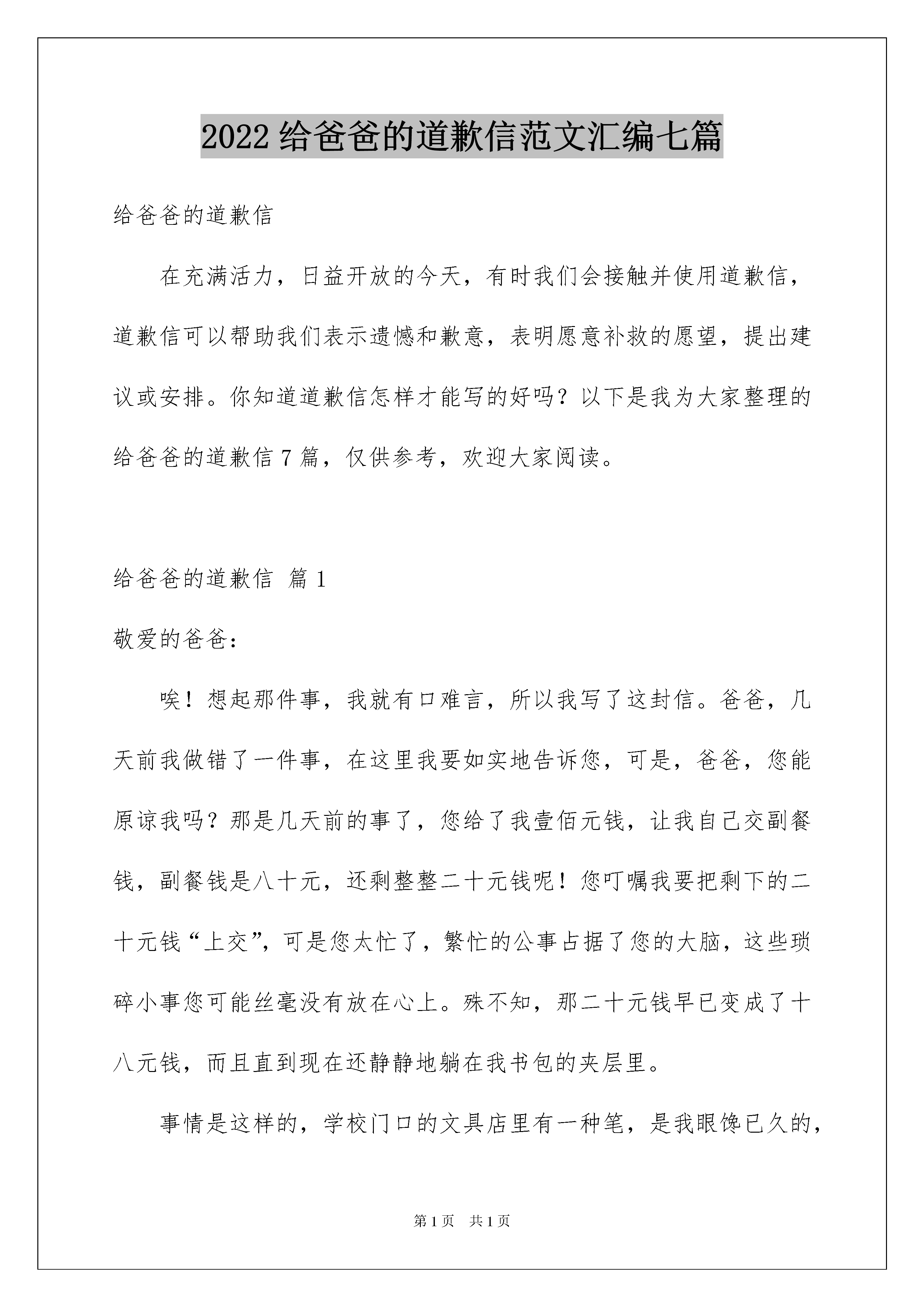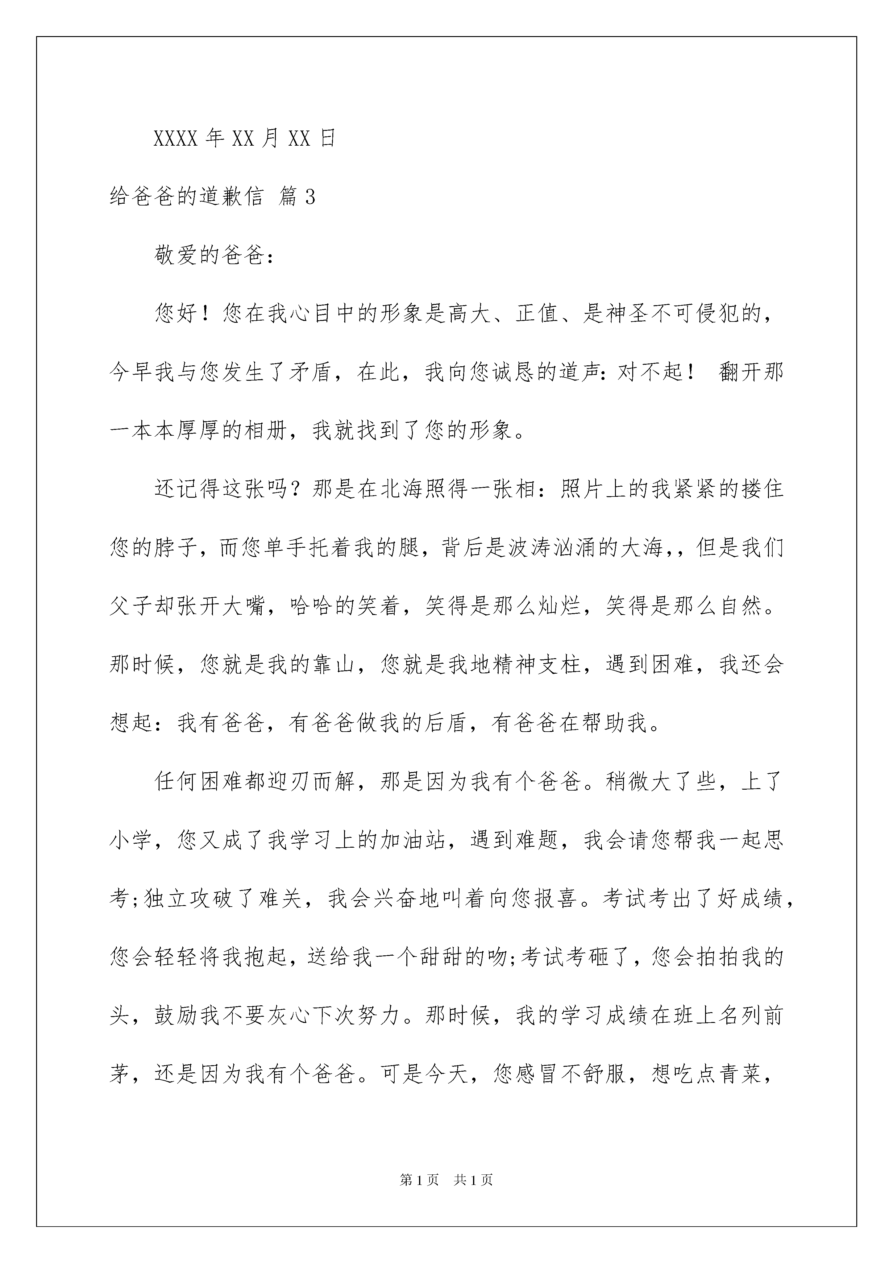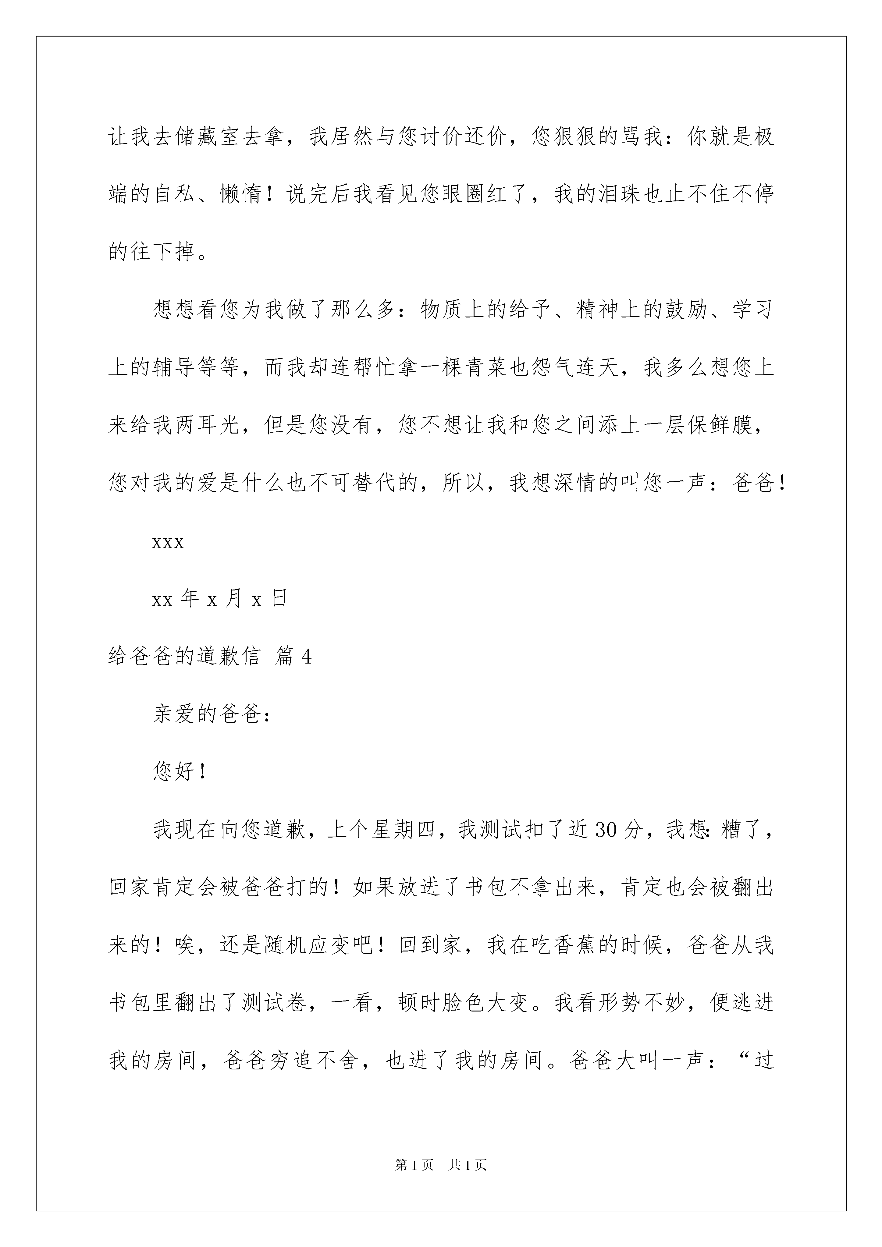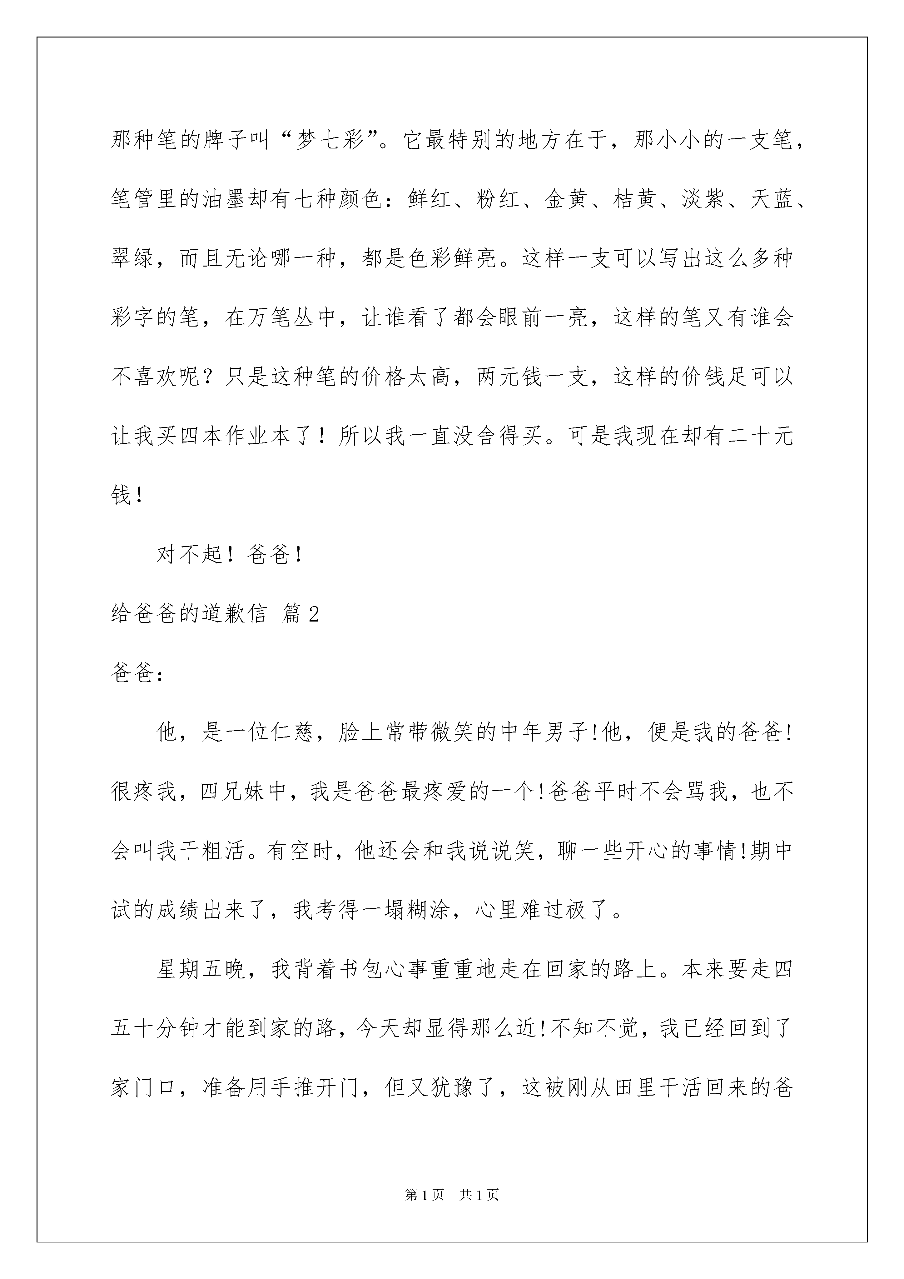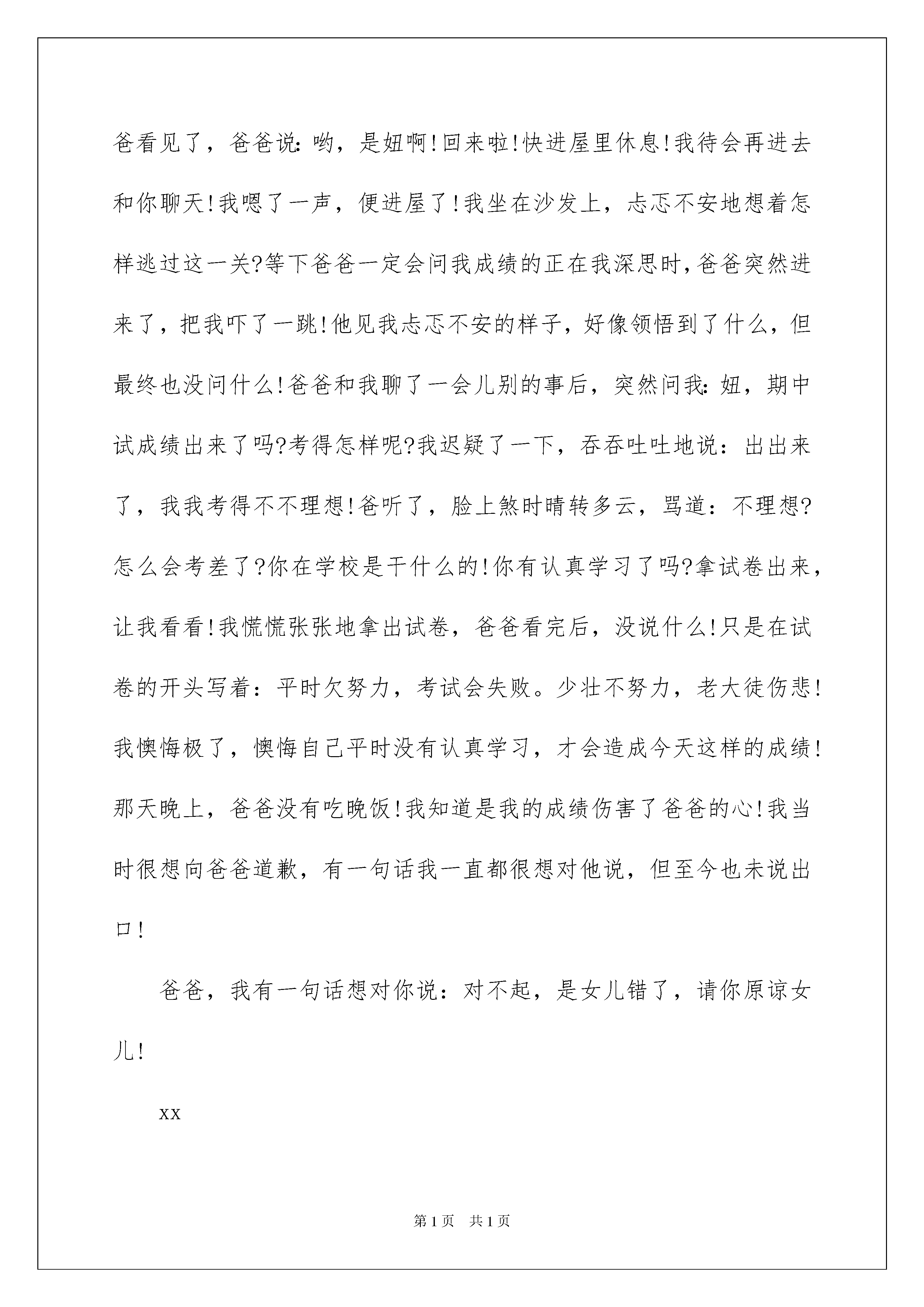 2022给爸爸的道歉信范文汇编七篇给爸爸的道歉信在充满活力,日益开放的今天,有时我们会接触并使用道歉信,道歉信可以帮助我们表示遗憾和歉意,表明愿意补救的愿望,提出建议或安排。你知道道歉信怎样才能写的好吗?以下是我为大家整理的给爸爸的道歉信7篇,仅供参考,欢迎大家阅读。给爸爸的道歉信篇1敬爱的爸爸:唉!想起那件事,我就有口难言,所以我写了这封信。爸爸,几天前我做错了一件事,在这里我要如实地告诉您,可是,爸爸,您能原谅我吗?那是几天前的事了,您给了我壹佰元钱,让我自己交副餐钱,副餐钱是八十元,还剩整整二十元钱呢!您叮嘱我要把剩下的二十元钱“上交”,可是您太忙了,繁忙的公事占据了您的大脑,这些琐碎小事您可能丝毫没有放在心上。殊不知,那二十元钱早已变成了十八元钱,而且直到现在还静静地躺在我书包的夹层里。事情是这样的,学校门口的文具店里有一种笔,是我眼馋已久的,那种笔的牌子叫“梦七彩”。它最特别的地方在于,那小小的一支笔,笔管里的油墨却有七种颜色:鲜红、粉红、金黄、桔黄、淡紫、天蓝、翠绿,而且无论哪一种,都是色彩鲜亮。这样一支可以写出这么多种彩字的笔,在万笔丛中,让谁看了都会眼前一亮,这样的笔又有谁会不喜欢呢?只是这种笔的价格太高,两元钱一支,这样的价钱足可以让我买四本作业本了!所以我一直没舍得买。可是我现在却有二十元钱!对不起!爸爸!给爸爸的道歉信篇2爸爸:他,是一位仁慈,脸上常带微笑的中年男子!他,便是我的爸爸!很疼我,四兄妹中,我是爸爸最疼爱的一个!爸爸平时不会骂我,也不会叫我干粗活。有空时,他还会和我说说笑,聊一些开心的事情!期中试的成绩出来了,我考得一塌糊涂,心里难过极了。星期五晚,我背着书包心事重重地走在回家的路上。本来要走四五十分钟才能到家的路,今天却显得那么近!不知不觉,我已经回到了家门口,准备用手推开门,但又犹豫了,这被刚从田里干活回来的爸爸看见了,爸爸说:哟,是妞啊!回来啦!快进屋里休息!我待会再进去和你聊天!我嗯了一声,便进屋了!我坐在沙发上,忐忑不安地想着怎样逃过这一关?等下爸爸一定会问我成绩的正在我深思时,爸爸突然进来了,把我吓了一跳!他见我忐忑不安的样子,好像领悟到了什么,但最终也没问什么!爸爸和我聊了一会儿别的事后,突然问我:妞,期中试成绩出来了吗?考得怎样呢?我迟疑了一下,吞吞吐吐地说:出出来了,我我考得不不理想!爸听了,脸上煞时晴转多云,骂道:不理想?怎么会考差了?你在学校是干什么的!你有认真学习了吗?拿试卷出来,让我看看!我慌慌张张地拿出试卷,爸爸看完后,没说什么!只是在试卷的开头写着:平时欠努力,考试会失败。少壮不努力,老大徒伤悲!我懊悔极了,懊悔自己平时没有认真学习,才会造成今天这样的成绩!那天晚上,爸爸没有吃晚饭!我知道是我的成绩伤害了爸爸的心!我当时很想向爸爸道歉,有一句话我一直都很想对他说,但至今也未说出口!爸爸,我有一句话想对你说:对不起,是女儿错了,请你原谅女儿!xxXXXX年XX月XX日给爸爸的道歉信篇3敬爱的爸爸:您好!您在我心目中的形象是高大、正值、是神圣不可侵犯的,今早我与您发生了矛盾,在此,我向您诚恳的道声:对不起!翻开那一本本厚厚的相册,我就找到了您的形象。还记得这张吗?那是在北海照得一张相:照片上的我紧紧的搂住您的脖子,而您单手托着我的腿,背后是波涛汹涌的大海,,但是我们父子却张开大嘴,哈哈的笑着,笑得是那么灿烂,笑得是那么自然。那时候,您就是我的靠山,您就是我地精神支柱,遇到困难,我还会想起:我有爸爸,有爸爸做我的后盾,有爸爸在帮助我。任何困难都迎刃而解,那是因为我有个爸爸。稍微大了些,上了小学,您又成了我学习上的加油站,遇到难题,我会请您帮我一起思考;独立攻破了难关,我会兴奋地叫着向您报喜。考试考出了好成绩,您会轻轻将我抱起,送给我一个甜甜的吻;考试考砸了,您会拍拍我的头,鼓励我不要灰心下次努力。那时候,我的学习成绩在班上名列前茅,还是因为我有个爸爸。可是今天,您感冒不舒服,想吃点青菜,让我去储藏室去拿,我居然与您讨价还价,您狠狠的骂我:你就是极端的自私、懒惰!说完后我看见您眼圈红了,我的泪珠也止不住不停的往下掉。想想看您为我做了那么多:物质上的给予、精神上的鼓励、学习上的辅导等等,而我却连帮忙拿一棵青菜也怨气连天,我多么想您上来给我两耳光,但是您没有,您不想让我和您之间添上一层保鲜膜,您对我的爱是什么也不可替代的,所以,我想深情的叫您一声:爸爸!xxxxx年x月x日给爸爸的道歉信篇4亲爱的爸爸:您好!我现在向您道歉,上个星期四,我测试扣了近30分,我想:糟了,回家肯定会被爸爸打的!如果放进了书包不拿出来,肯定也会