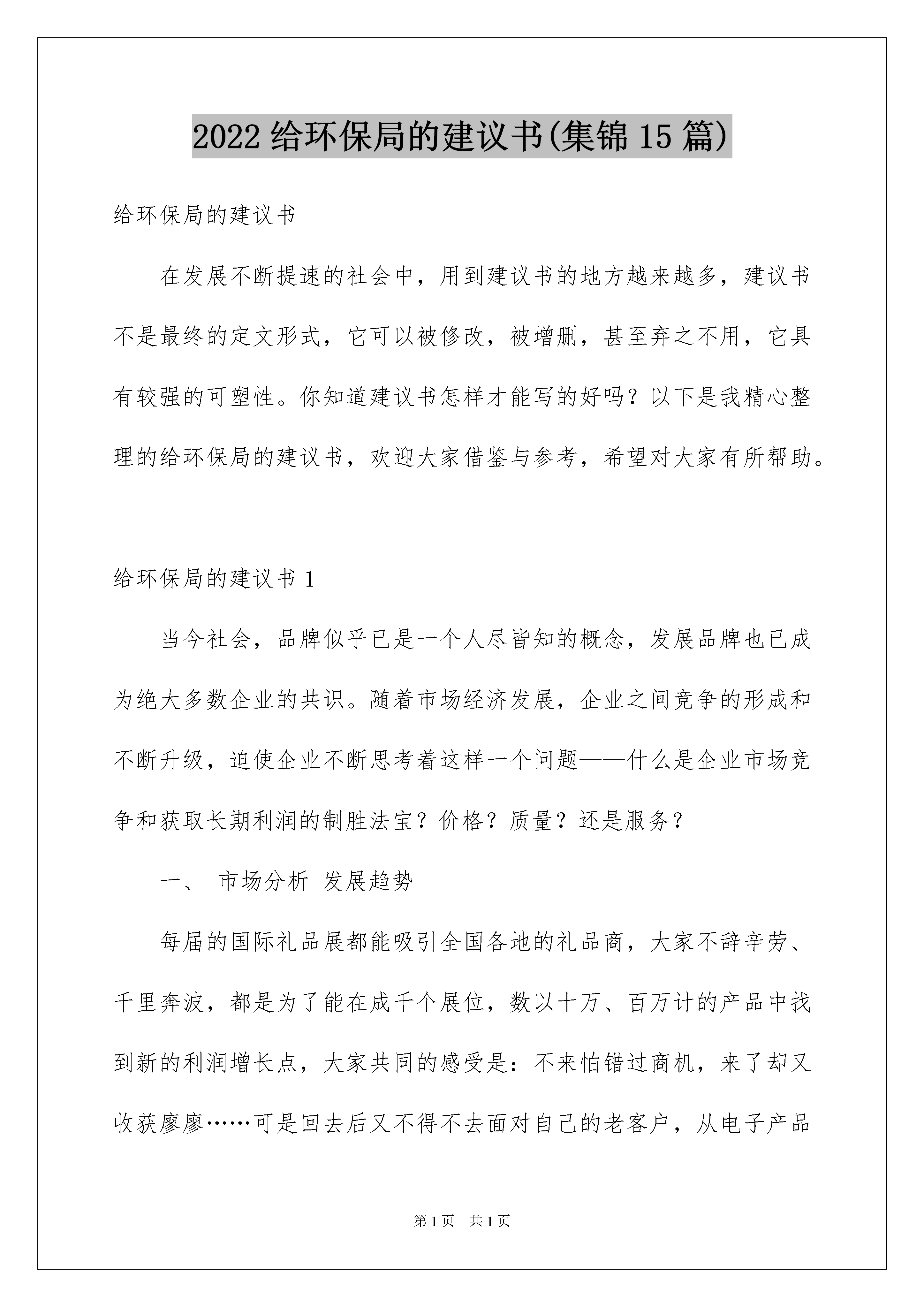 2022给环保局的建议书(集锦15篇)给环保局的建议书在发展不断提速的社会中,用到建议书的地方越来越多,建议书不是最终的定文形式,它可以被修改,被增删,甚至弃之不用,它具有较强的可塑性。你知道建议书怎样才能写的好吗?以下是我精心整理的给环保局的建议书,欢迎大家借鉴与参考,希望对大家有所帮助。给环保局的建议书1当今社会,品牌似乎已是一个人尽皆知的概念,发展品牌也已成为绝大多数企业的共识。随着市场经济发展,企业之间竞争的形成和不断升级,迫使企业不断思考着这样一个问题——什么是企业市场竞争和获取长期利润的制胜法宝?价格?质量?还是服务?一、市场分析发展趋势每届的国际礼品展都能吸引全国各地的礼品商,大家不辞辛劳、千里奔波,都是为了能在成千个展位,数以十万、百万计的产品中找到新的利润增长点,大家共同的感受是:不来怕错过商机,来了却又收获廖廖……可是回去后又不得不去面对自己的老客户,从电子产品到床上用品,再到精美厨具等等,我们都推荐过了,也做过了很多,而且十有九家礼品公司拿出的东西都一样,如果产品都一样、业务费用不断增长、另一方面利润空间不断的被削薄的前提下,试问我们的优势在哪里?纵观礼品行业近几年的发展趋势不难发现人们对礼品的需求已不再停留在物质上的需求,而更多的是对健康的向往和追求。礼品行业也顺应了这样的发展潮流,许多与健康有关的产品不断的应运而生。市场需求特点:礼品行业最大的特点就是新、奇、特……当今市场产品品种繁多,但产品同质化严重、了无新意,礼品行业又缺乏相应的法律、法规,竞争显得无秩序。另一方面客户的需求不断多元,对服务的要求和品质不断提高,创新、规范成了礼品行业的首要课题……抓住了趋势,就抓住了成功的机会!蓝海智远本着"关注健康品位生活"的理念,在结合中华民族几千年的中医文化精髓——"药食同源"和现代人们生活习惯的基础上,选用优质的天然材料,研发、生产出的"源生泰"健康食疗系列产品,是顺应礼品行业发展趋势的新产物,她在礼品行业率先提出了其实健康就是一种生活方式的全新理念!你可以拒绝金钱、权势、地位……但试问有谁能拒绝一份健康的心意呢?二、产品利润空间"源生泰"做为蓝海公司旗下的第一个研发品牌,是公司上下全体工作人员针对国内市场在经过无数的调查和研究后研发的呕心之作。1、"源生泰"是市场的唯一,全新的健康理念,全新的产品系列,我们的产品可以说是一种新生事物,具极强的生命力,我们是市场的唯一,具有广阔的利润操作空间,因本产品的独特性,本次展会很多礼品界的权威人士认为本产品是能带来回单的好产品。事实证明也是如此,从深圳回来不到一周的时间,已有数家在展会上拿样的礼品商签下了定单。2、"源生泰"的品牌监控——公司有严格规范的管理,已通过iso9001:xx国际质量管理体系认证;有严格的产品监控制度;每盒产品都配有相应的认证资料及语音查询的防伪标识。也是您面对客户的信心的充分保障!3、产品价格体系丰富,能满足高、中、低客户的需求。(具体经销价格备索)4、实施品牌战略:运用国际质量管理标准,树立品牌形象。三、目标客户企、事业单位、政府部门、会议、福利、庆典、商务馈赠……拥有广泛且具潜力的客户群。我们的服务与支持1。专注、高效、敬业的团队——拥有资深国宝级的老中医、经验丰富的营养师、锐意进取的团队精神;2。我们会最大限度的满足您各方面的需求,每个地区都有专业的销售人员及客服人员为您服务,可以为您的团队提供专业培训,以解决您在销售过程当中遇到的问题;3。每份定单我们都有指定的专业驻厂跟单员进行全程监控和追踪,定期、随时针对产品的生产、质量监督等向您汇报最新的跟进情况,以保证你的定单按您的要求保质保量的交付到您的手中;4。我们的物流人员会根据您的具体要求为您安排快捷、安全的货运渠道,让您在您的客户面前更加自信!现公司正面向全国各地诚寻有实力、有开拓精神的合作伙伴,愿我们能携起手来,共同努力,共创辉煌!给环保局的建议书2环保部门的叔叔阿姨们:我是来自南山外国语学校的一名学生,我看到生活当中有很多不良的现象,想说说自己的看法和建议。我们家周围本来有一块很漂亮的地方,很多树,鸟儿会经常在林间里飞来飞去,人们会经常到树底下沉凉,但是现在,出现了一个很不好的现象就是有人在这里摆了一个摊,晚上卖烧烤,很多浓烟到处飘,给过路的人带来很多的麻烦,路过那里的时候,感觉特别难受,这一块地方也搞得乱七八糟,客人吃完后,随便乱扔,到处是方便盒、方便筷和垃圾袋,觉得特别恶心,白天蚊子到处飞来飞去,并且有时候晚上很多人饮酒取乐,闹得很晚,影响人们无法进入睡眠,所以请你们部门,关注此事,做一个考察,做出相应的措施或规定