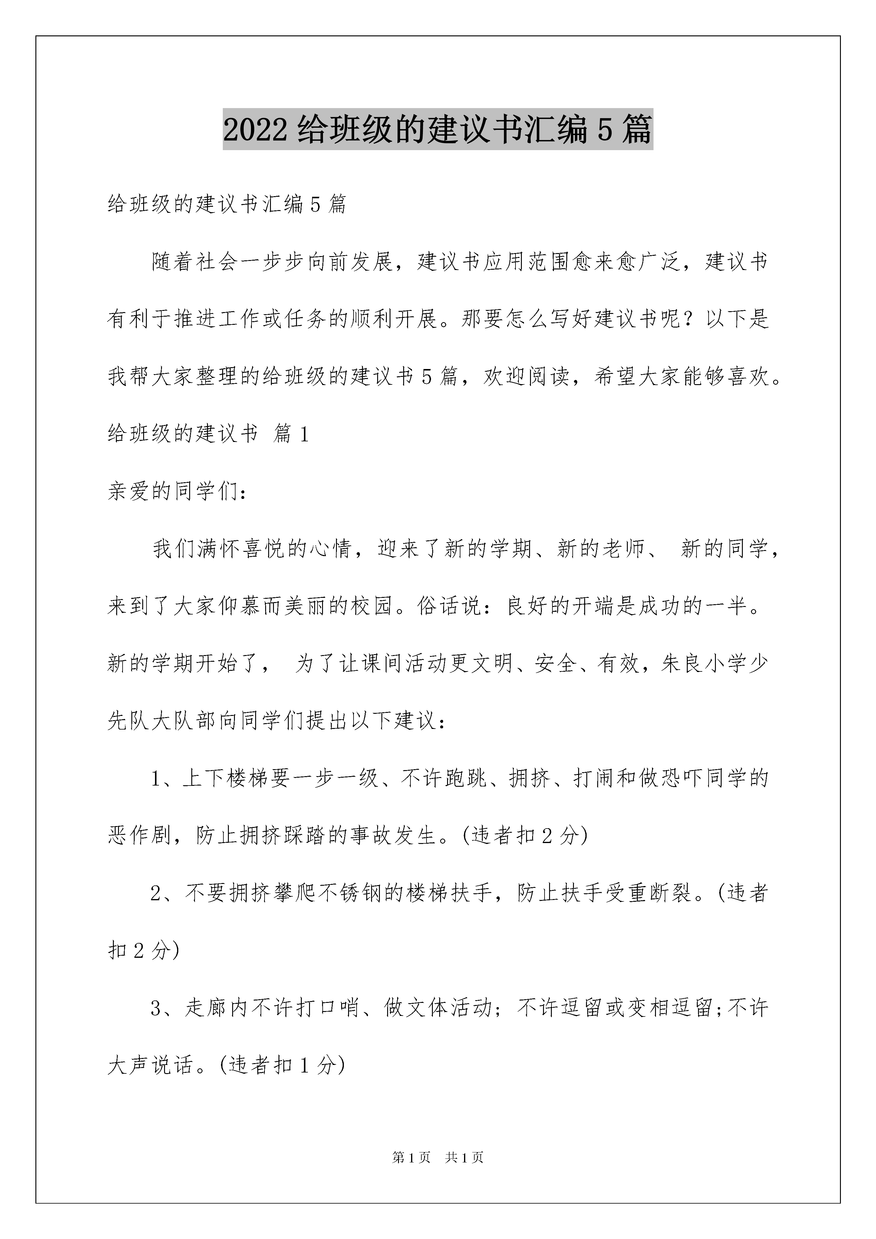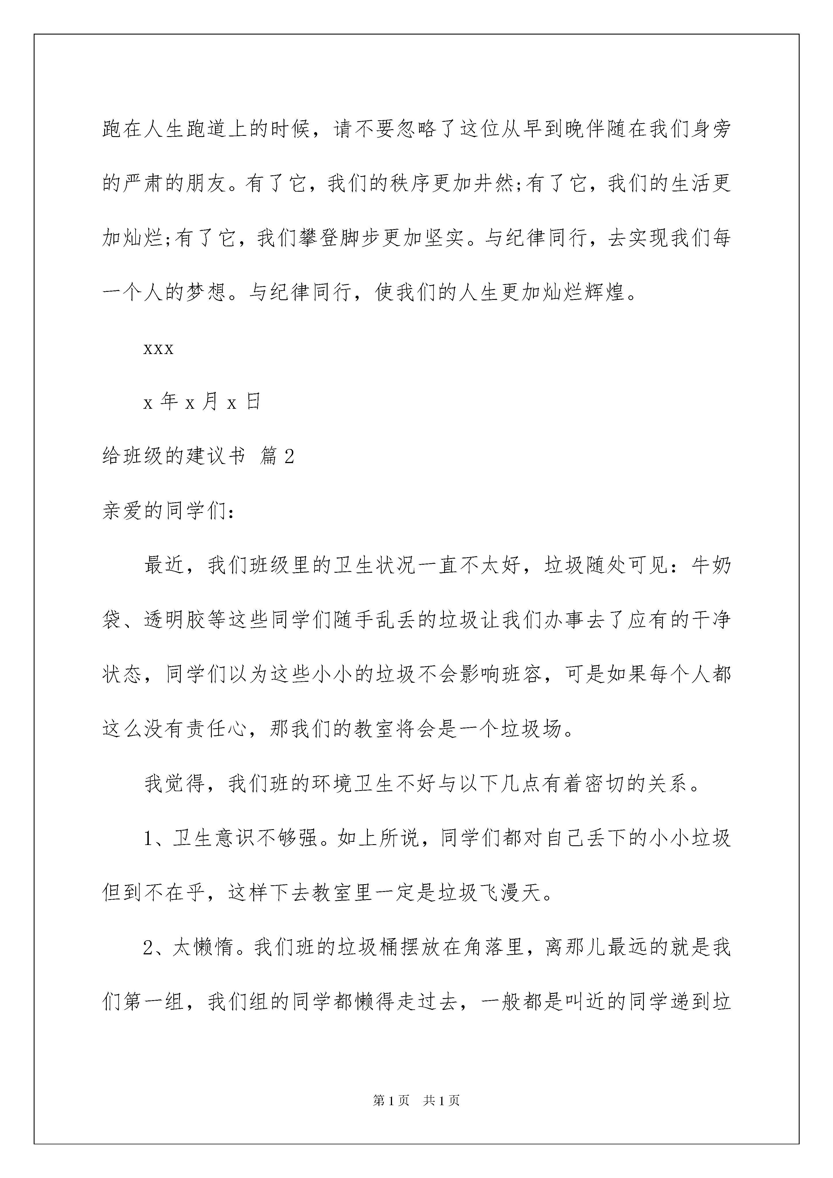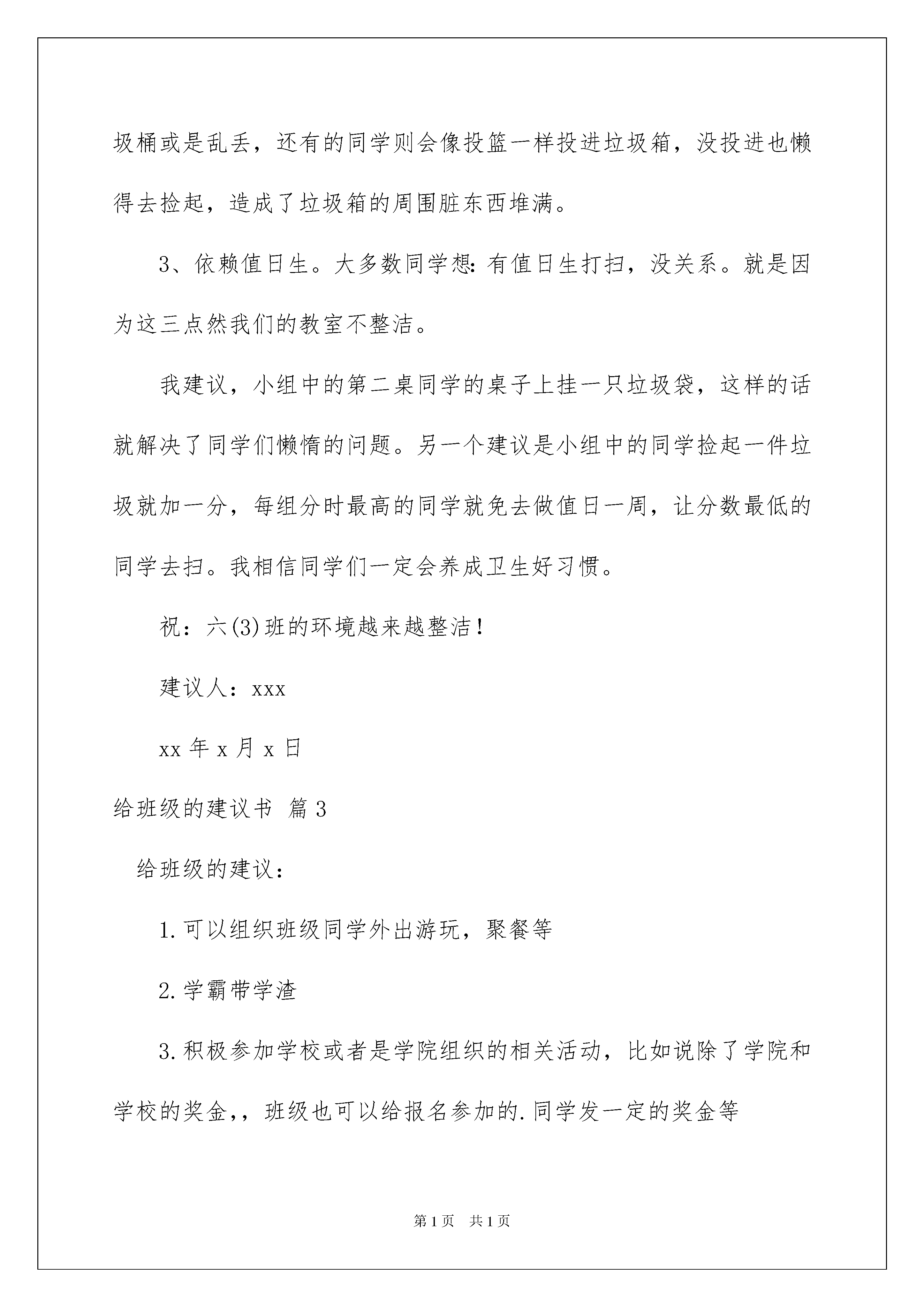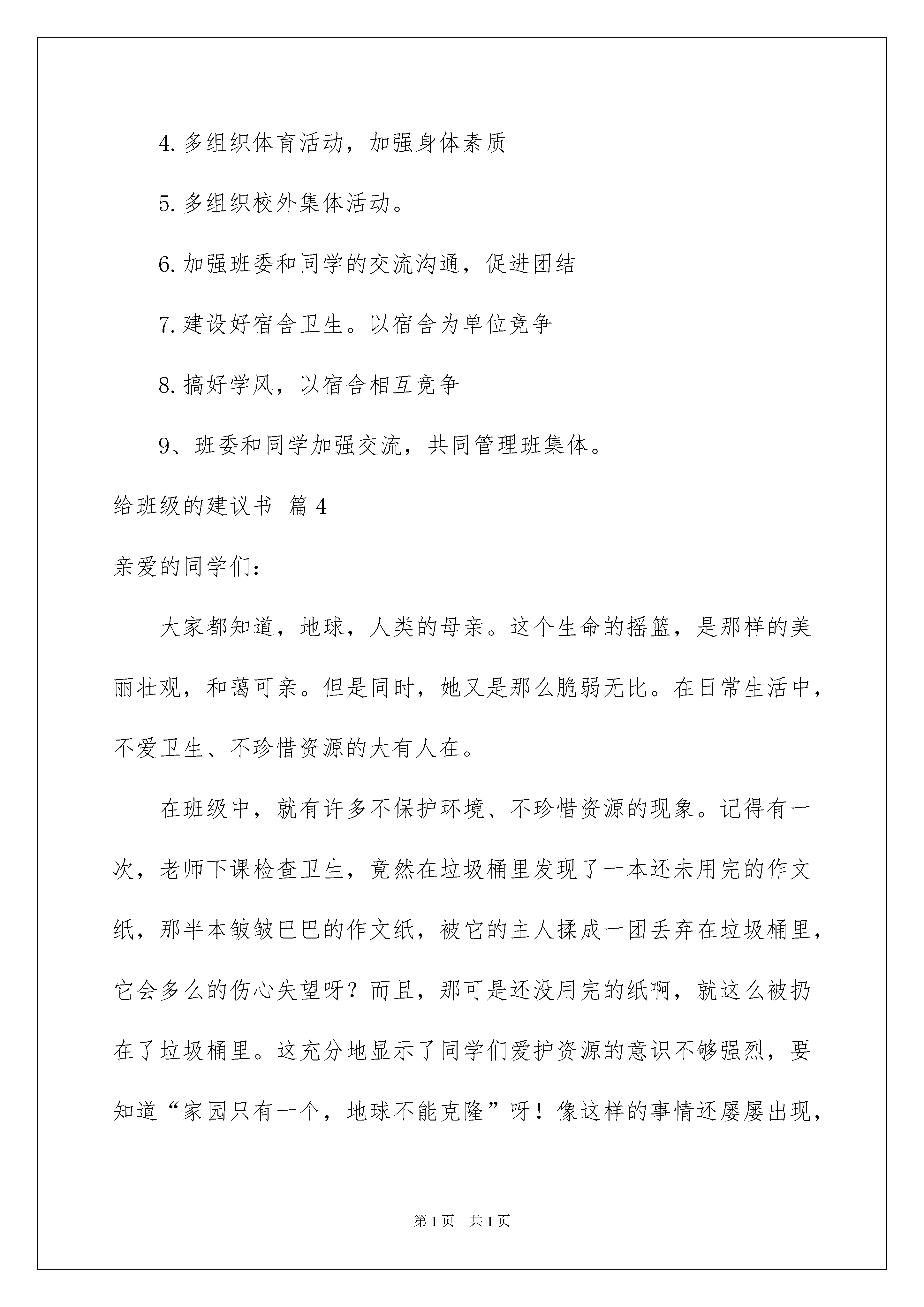 2022给班级的建议书汇编5篇给班级的建议书汇编5篇随着社会一步步向前发展,建议书应用范围愈来愈广泛,建议书有利于推进工作或任务的顺利开展。那要怎么写好建议书呢?以下是我帮大家整理的给班级的建议书5篇,欢迎阅读,希望大家能够喜欢。给班级的建议书篇1亲爱的同学们:我们满怀喜悦的心情,迎来了新的学期、新的老师、新的同学,来到了大家仰慕而美丽的校园。俗话说:良好的开端是成功的一半。新的学期开始了,为了让课间活动更文明、安全、有效,朱良小学少先队大队部向同学们提出以下建议:1、上下楼梯要一步一级、不许跑跳、拥挤、打闹和做恐吓同学的恶作剧,防止拥挤踩踏的事故发生。(违者扣2分)2、不要拥挤攀爬不锈钢的楼梯扶手,防止扶手受重断裂。(违者扣2分)3、走廊内不许打口哨、做文体活动;不许逗留或变相逗留;不许大声说话。(违者扣1分)4、走廊右侧通行,脚步要轻,不许搂肩、扯手而行。(违者扣1分)5、教室内不许打闹、做文体活动乃至大声说话。(违者扣1分)6、不许往窗外扔垃圾、倒水。(违者扣1分)7、教室在楼上的,不要将身体探出窗外,谨防不慎发生坠楼的危险。(违者扣5分)8、教室空间比较狭小,又置放了许多桌椅等,所以不应在教室中追逐、打闹,做剧烈的运动和游戏,防止磕碰受伤。切不可猛然关门,以防伤及他人。(违者扣1分)9、按时上操,课间操回归时要有秩序、不许大声说喧哗。(违者扣1分)10、上下楼层学生不许乱窜。(违者扣1分)11、少先队员每天必须佩戴红领巾。(违者扣1分)以上规定,学校少先队大队部将在课间派文明监督员配合值班老师共同管理同学们的课间纪律,并开展课间纪律评比,每周评出六个文明班级,并颁发流动红旗,每得流动红旗一次,班级考核得1分。在此基础上,各班也可设立课间监督员对本班的活动进行监督。同学们,在我们充满豪情壮志向理想奋进的时候,在我们满怀自信积极奔跑在人生跑道上的时候,请不要忽略了这位从早到晚伴随在我们身旁的严肃的朋友。有了它,我们的秩序更加井然;有了它,我们的生活更加灿烂;有了它,我们攀登脚步更加坚实。与纪律同行,去实现我们每一个人的梦想。与纪律同行,使我们的人生更加灿烂辉煌。xxxx年x月x日给班级的建议书篇2亲爱的同学们:最近,我们班级里的卫生状况一直不太好,垃圾随处可见:牛奶袋、透明胶等这些同学们随手乱丢的垃圾让我们办事去了应有的干净状态,同学们以为这些小小的垃圾不会影响班容,可是如果每个人都这么没有责任心,那我们的教室将会是一个垃圾场。我觉得,我们班的环境卫生不好与以下几点有着密切的关系。1、卫生意识不够强。如上所说,同学们都对自己丢下的小小垃圾但到不在乎,这样下去教室里一定是垃圾飞漫天。2、太懒惰。我们班的垃圾桶摆放在角落里,离那儿最远的就是我们第一组,我们组的同学都懒得走过去,一般都是叫近的同学递到垃圾桶或是乱丢,还有的同学则会像投篮一样投进垃圾箱,没投进也懒得去捡起,造成了垃圾箱的周围脏东西堆满。3、依赖值日生。大多数同学想:有值日生打扫,没关系。就是因为这三点然我们的教室不整洁。我建议,小组中的第二桌同学的桌子上挂一只垃圾袋,这样的话就解决了同学们懒惰的问题。另一个建议是小组中的同学捡起一件垃圾就加一分,每组分时最高的同学就免去做值日一周,让分数最低的同学去扫。我相信同学们一定会养成卫生好习惯。祝:六(3)班的环境越来越整洁!建议人:xxxxx年x月x日给班级的建议书篇3给班级的建议:1.可以组织班级同学外出游玩,聚餐等2.学霸带学渣3.积极参加学校或者是学院组织的相关活动,比如说除了学院和学校的奖金,,班级也可以给报名参加的.同学发一定的奖金等4.多组织体育活动,加强身体素质5.多组织校外集体活动。6.加强班委和同学的交流沟通,促进团结7.建设好宿舍卫生。以宿舍为单位竞争8.搞好学风,以宿舍相互竞争9、班委和同学加强交流,共同管理班集体。给班级的建议书篇4亲爱的同学们:大家都知道,地球,人类的母亲。这个生命的摇篮,是那样的美丽壮观,和蔼可亲。但是同时,她又是那么脆弱无比。在日常生活中,不爱卫生、不珍惜资源的大有人在。在班级中,就有许多不保护环境、不珍惜资源的现象。记得有一次,老师下课检查卫生,竟然在垃圾桶里发现了一本还未用完的作文纸,那半本皱皱巴巴的作文纸,被它的主人揉成一团丢弃在垃圾桶里,它会多么的伤心失望呀?而且,那可是还没用完的纸啊,就这么被扔在了垃圾桶里。这充分地显示了同学们爱护资源的意识不够强烈,要知道“家园只有一个,地球不能克隆”呀!像这样的事情还屡屡出现,像:值日生忘记将电灯、电扇关掉;有同学不把水及时喝光,把剩下的半瓶水就扔在了垃圾桶中;地上随处可见