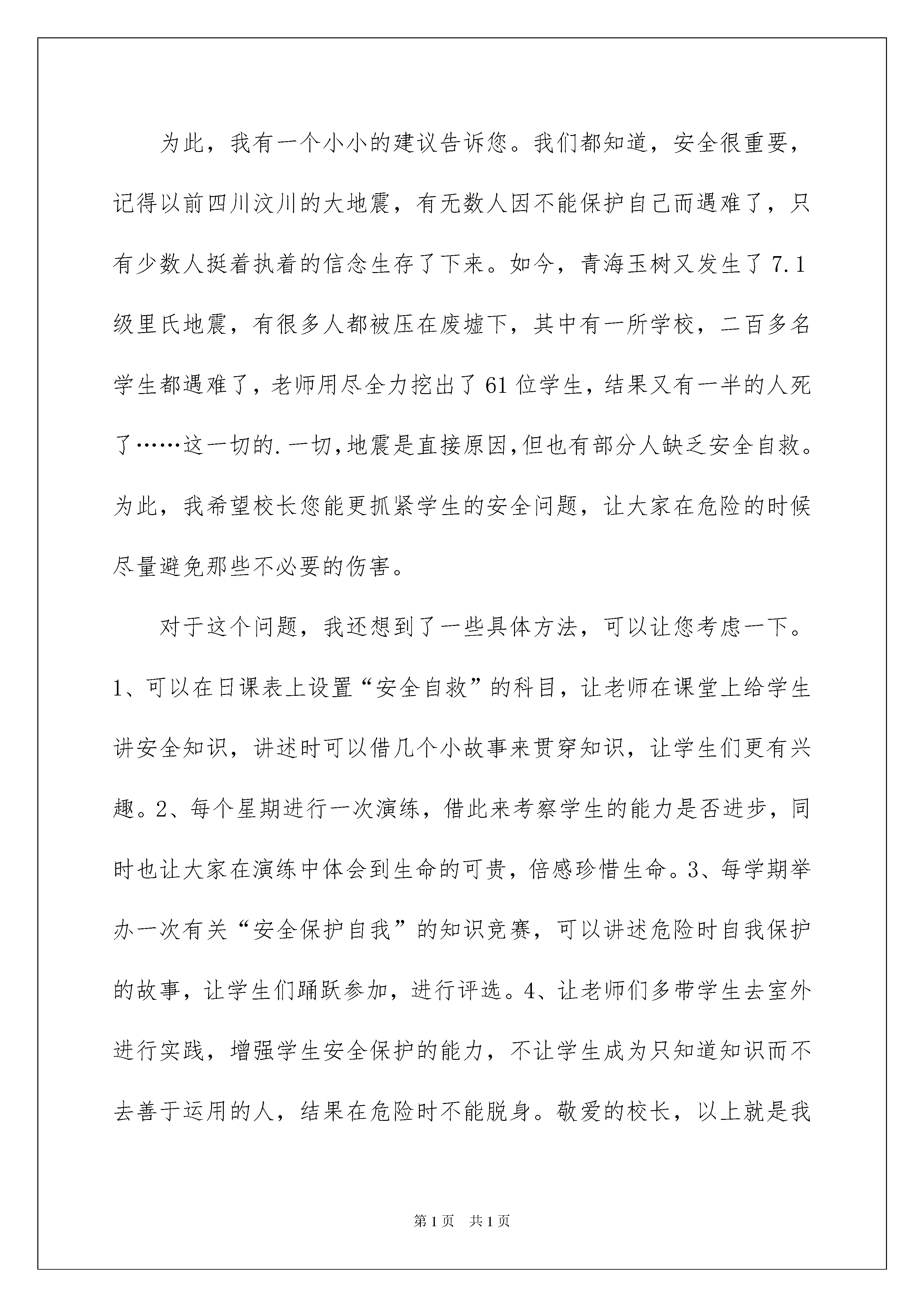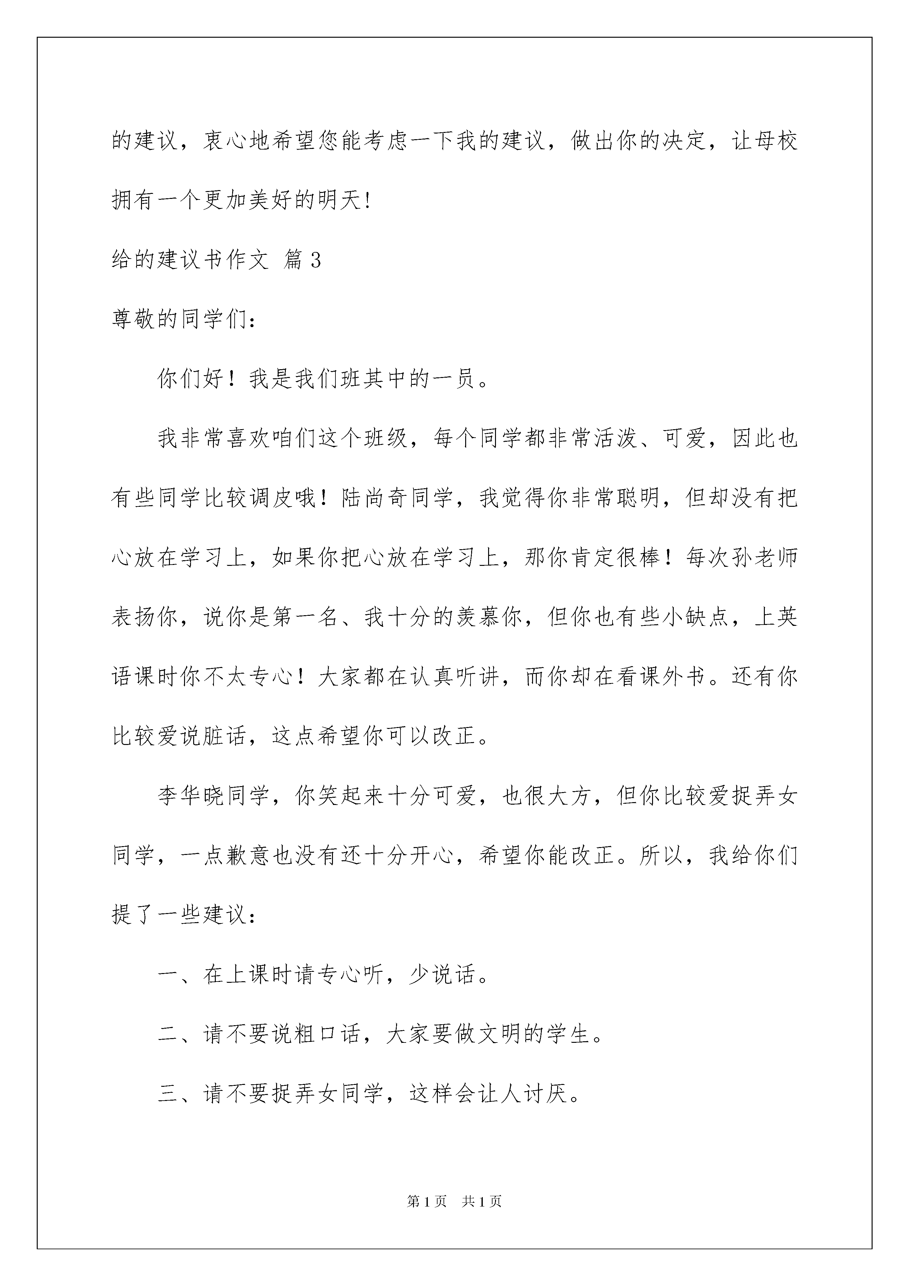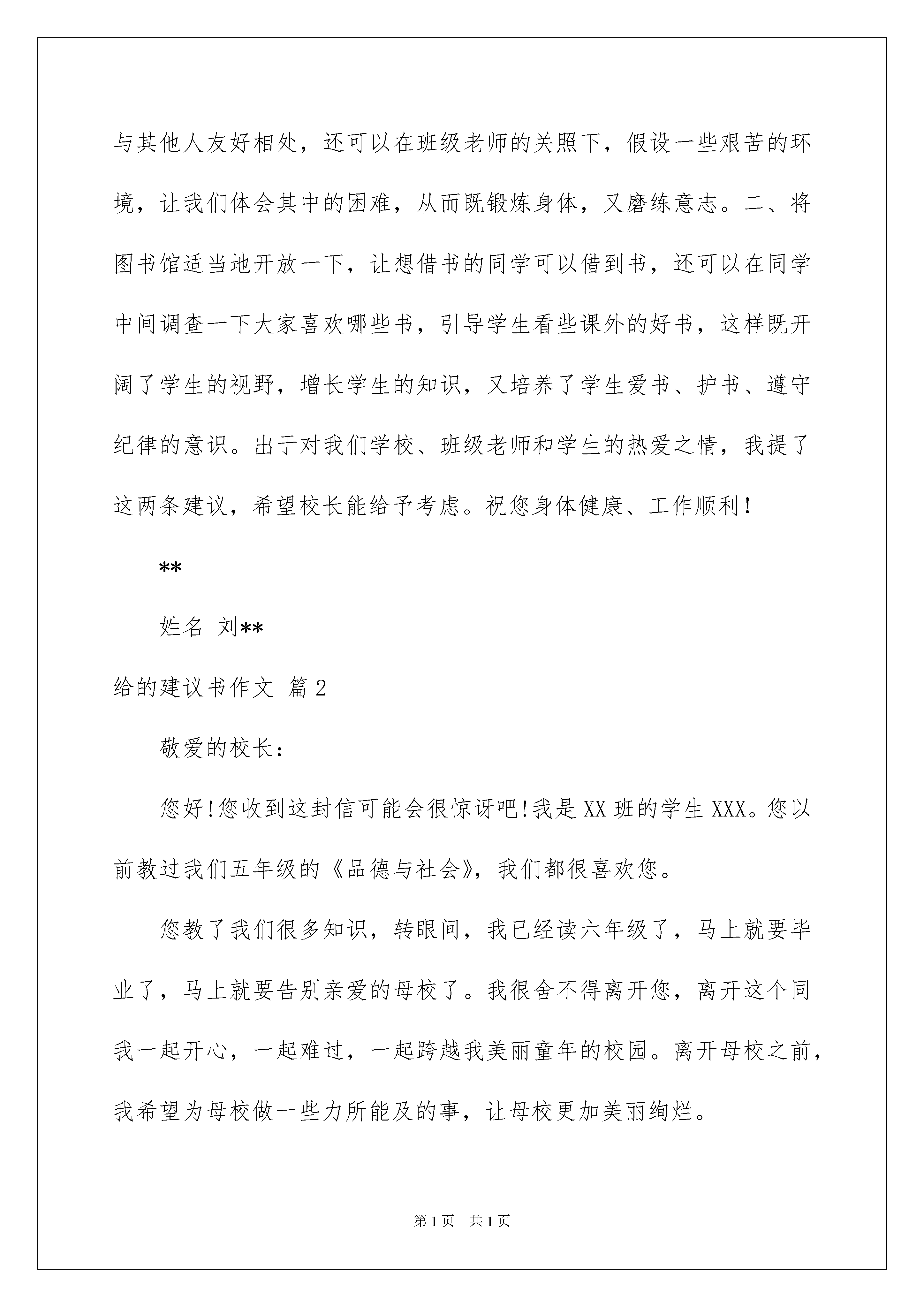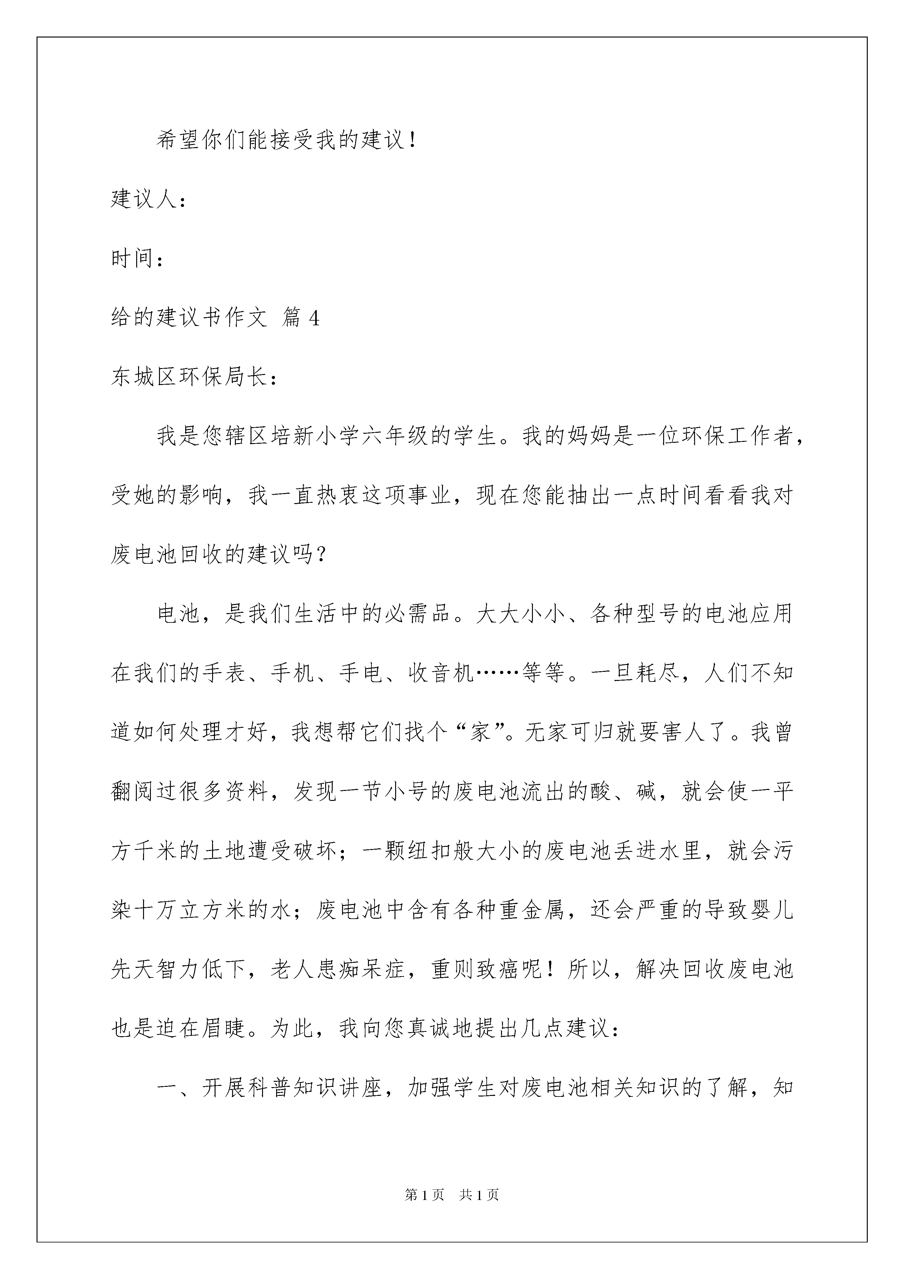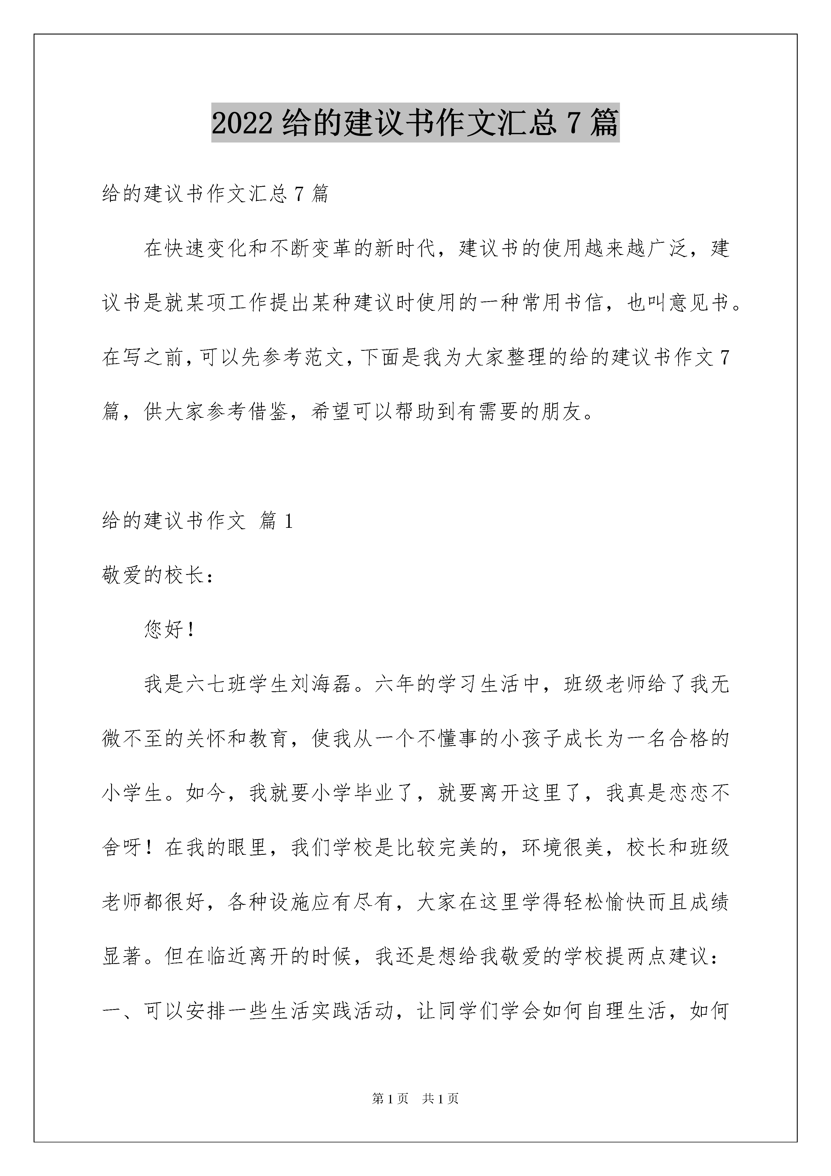 2022给的建议书作文汇总7篇给的建议书作文汇总7篇在快速变化和不断变革的新时代,建议书的使用越来越广泛,建议书是就某项工作提出某种建议时使用的一种常用书信,也叫意见书。在写之前,可以先参考范文,下面是我为大家整理的给的建议书作文7篇,供大家参考借鉴,希望可以帮助到有需要的朋友。给的建议书作文篇1敬爱的校长:您好!我是六七班学生刘海磊。六年的学习生活中,班级老师给了我无微不至的关怀和教育,使我从一个不懂事的小孩子成长为一名合格的小学生。如今,我就要小学毕业了,就要离开这里了,我真是恋恋不舍呀!在我的眼里,我们学校是比较完美的,环境很美,校长和班级老师都很好,各种设施应有尽有,大家在这里学得轻松愉快而且成绩显著。但在临近离开的时候,我还是想给我敬爱的学校提两点建议:一、可以安排一些生活实践活动,让同学们学会如何自理生活,如何与其他人友好相处,还可以在班级老师的关照下,假设一些艰苦的环境,让我们体会其中的困难,从而既锻炼身体,又磨练意志。二、将图书馆适当地开放一下,让想借书的同学可以借到书,还可以在同学中间调查一下大家喜欢哪些书,引导学生看些课外的好书,这样既开阔了学生的视野,增长学生的知识,又培养了学生爱书、护书、遵守纪律的意识。出于对我们学校、班级老师和学生的热爱之情,我提了这两条建议,希望校长能给予考虑。祝您身体健康、工作顺利!**姓名刘**给的建议书作文篇2敬爱的校长:您好!您收到这封信可能会很惊讶吧!我是XX班的学生XXX。您以前教过我们五年级的《品德与社会》,我们都很喜欢您。您教了我们很多知识,转眼间,我已经读六年级了,马上就要毕业了,马上就要告别亲爱的母校了。我很舍不得离开您,离开这个同我一起开心,一起难过,一起跨越我美丽童年的校园。离开母校之前,我希望为母校做一些力所能及的事,让母校更加美丽绚烂。为此,我有一个小小的建议告诉您。我们都知道,安全很重要,记得以前四川汶川的大地震,有无数人因不能保护自己而遇难了,只有少数人挺着执着的信念生存了下来。如今,青海玉树又发生了7.1级里氏地震,有很多人都被压在废墟下,其中有一所学校,二百多名学生都遇难了,老师用尽全力挖出了61位学生,结果又有一半的人死了……这一切的.一切,地震是直接原因,但也有部分人缺乏安全自救。为此,我希望校长您能更抓紧学生的安全问题,让大家在危险的时候尽量避免那些不必要的伤害。对于这个问题,我还想到了一些具体方法,可以让您考虑一下。1、可以在日课表上设置“安全自救”的科目,让老师在课堂上给学生讲安全知识,讲述时可以借几个小故事来贯穿知识,让学生们更有兴趣。2、每个星期进行一次演练,借此来考察学生的能力是否进步,同时也让大家在演练中体会到生命的可贵,倍感珍惜生命。3、每学期举办一次有关“安全保护自我”的知识竞赛,可以讲述危险时自我保护的故事,让学生们踊跃参加,进行评选。4、让老师们多带学生去室外进行实践,增强学生安全保护的能力,不让学生成为只知道知识而不去善于运用的人,结果在危险时不能脱身。敬爱的校长,以上就是我的建议,衷心地希望您能考虑一下我的建议,做出你的决定,让母校拥有一个更加美好的明天!给的建议书作文篇3尊敬的同学们:你们好!我是我们班其中的一员。我非常喜欢咱们这个班级,每个同学都非常活泼、可爱,因此也有些同学比较调皮哦!陆尚奇同学,我觉得你非常聪明,但却没有把心放在学习上,如果你把心放在学习上,那你肯定很棒!每次孙老师表扬你,说你是第一名、我十分的羡慕你,但你也有些小缺点,上英语课时你不太专心!大家都在认真听讲,而你却在看课外书。还有你比较爱说脏话,这点希望你可以改正。李华晓同学,你笑起来十分可爱,也很大方,但你比较爱捉弄女同学,一点歉意也没有还十分开心,希望你能改正。所以,我给你们提了一些建议:一、在上课时请专心听,少说话。二、请不要说粗口话,大家要做文明的学生。三、请不要捉弄女同学,这样会让人讨厌。希望你们能接受我的建议!建议人:时间:给的建议书作文篇4东城区环保局长:我是您辖区培新小学六年级的学生。我的妈妈是一位环保工作者,受她的影响,我一直热衷这项事业,现在您能抽出一点时间看看我对废电池回收的建议吗?电池,是我们生活中的必需品。大大小小、各种型号的电池应用在我们的手表、手机、手电、收音机……等等。一旦耗尽,人们不知道如何处理才好,我想帮它们找个“家”。无家可归就要害人了。我曾翻阅过很多资料,发现一节小号的废电池流出的酸、碱,就会使一平方千米的土地遭受破坏;一颗纽扣般大小的废电池丢进水里,就会污染十万立方米的水;废电池中含有各种重金属,还会严重的导致婴儿先天智力低下,老人患痴呆症,重则