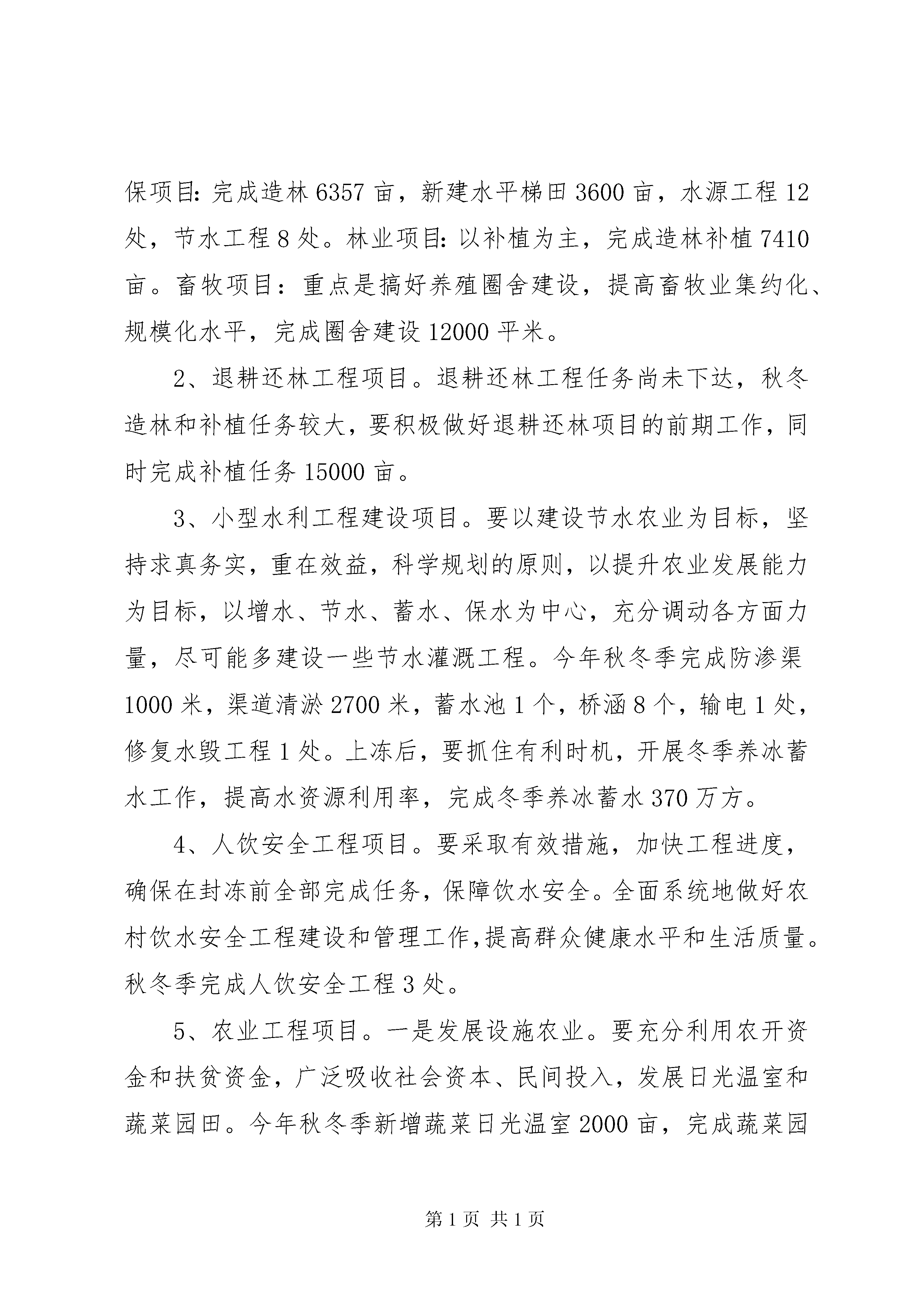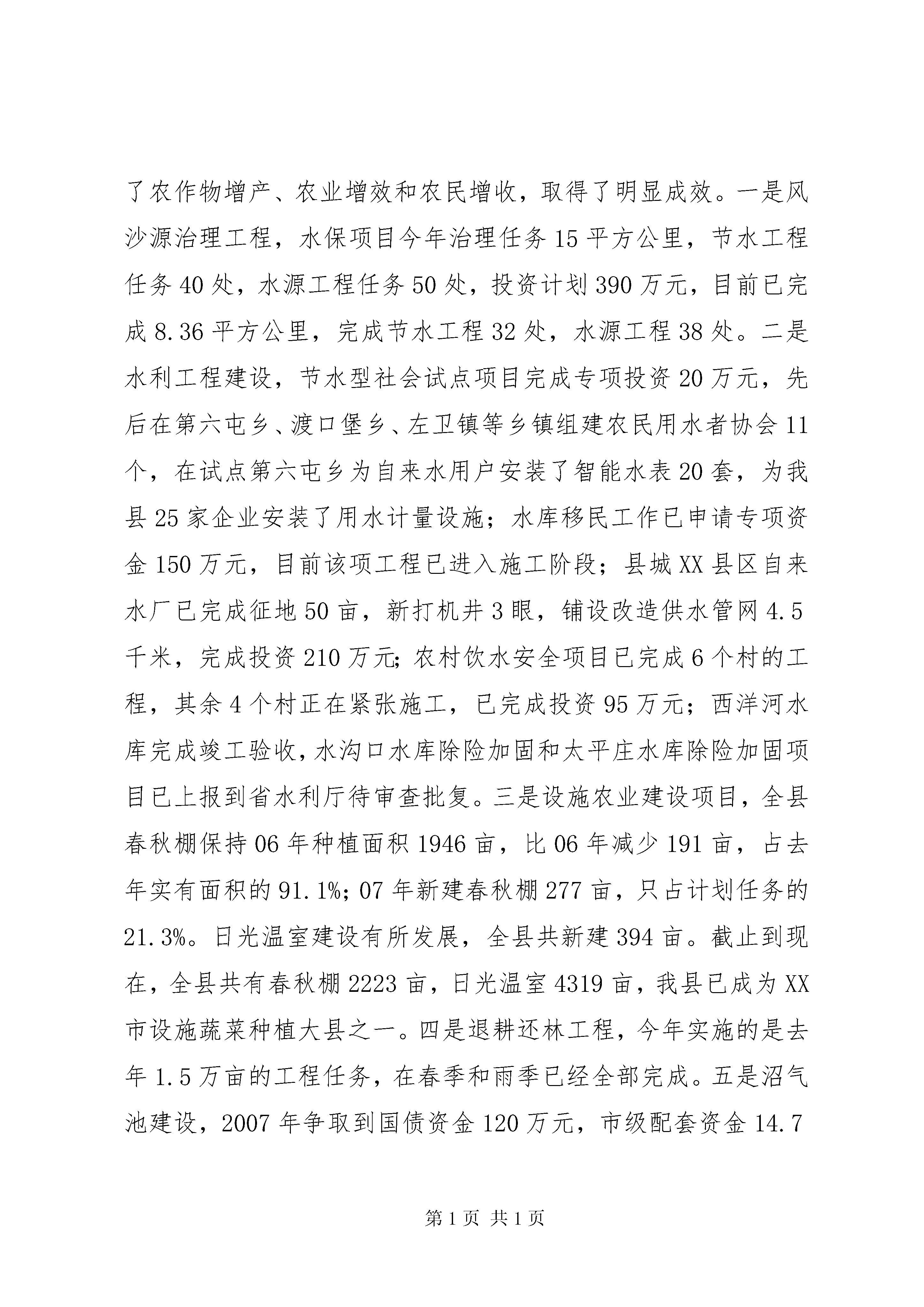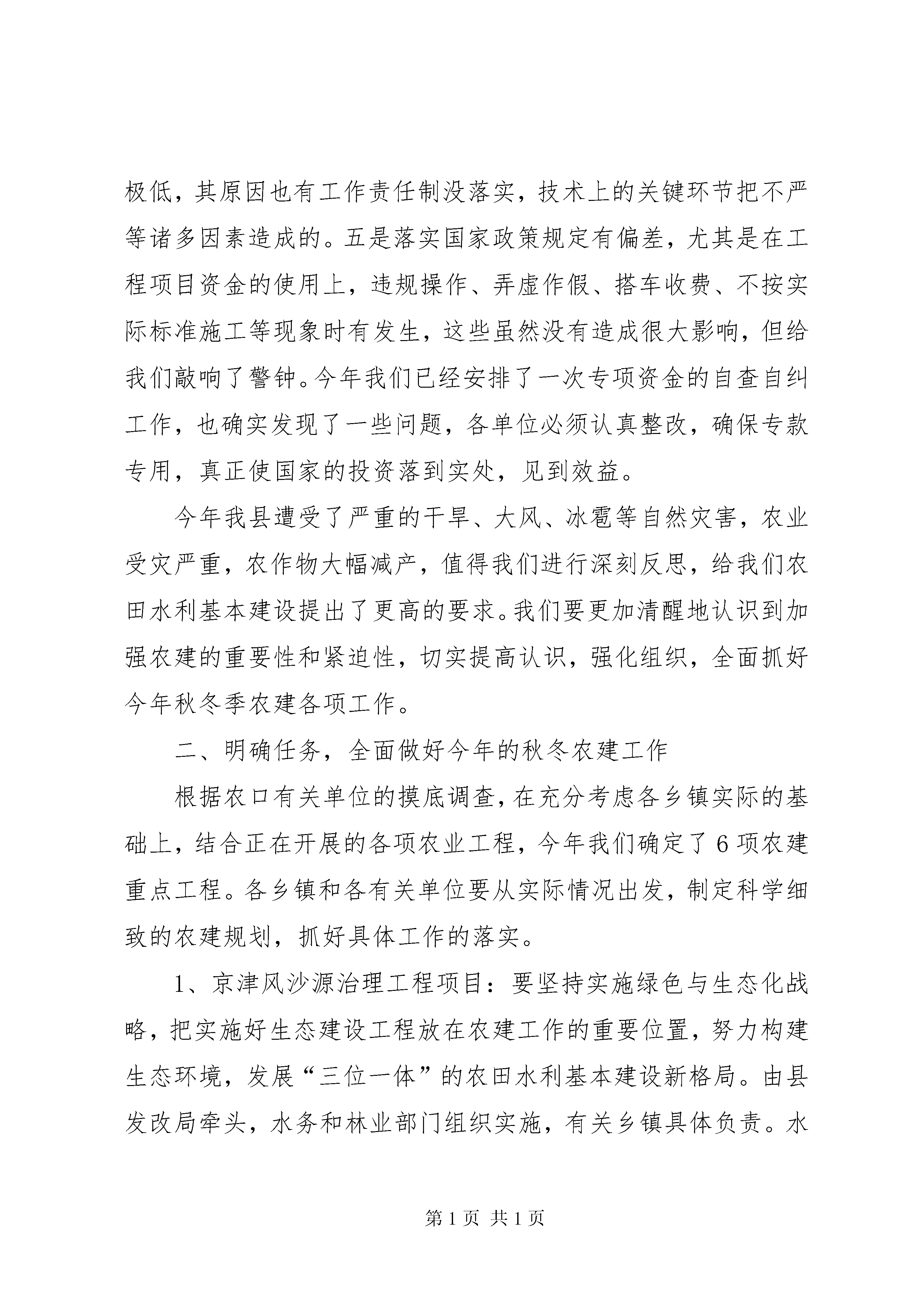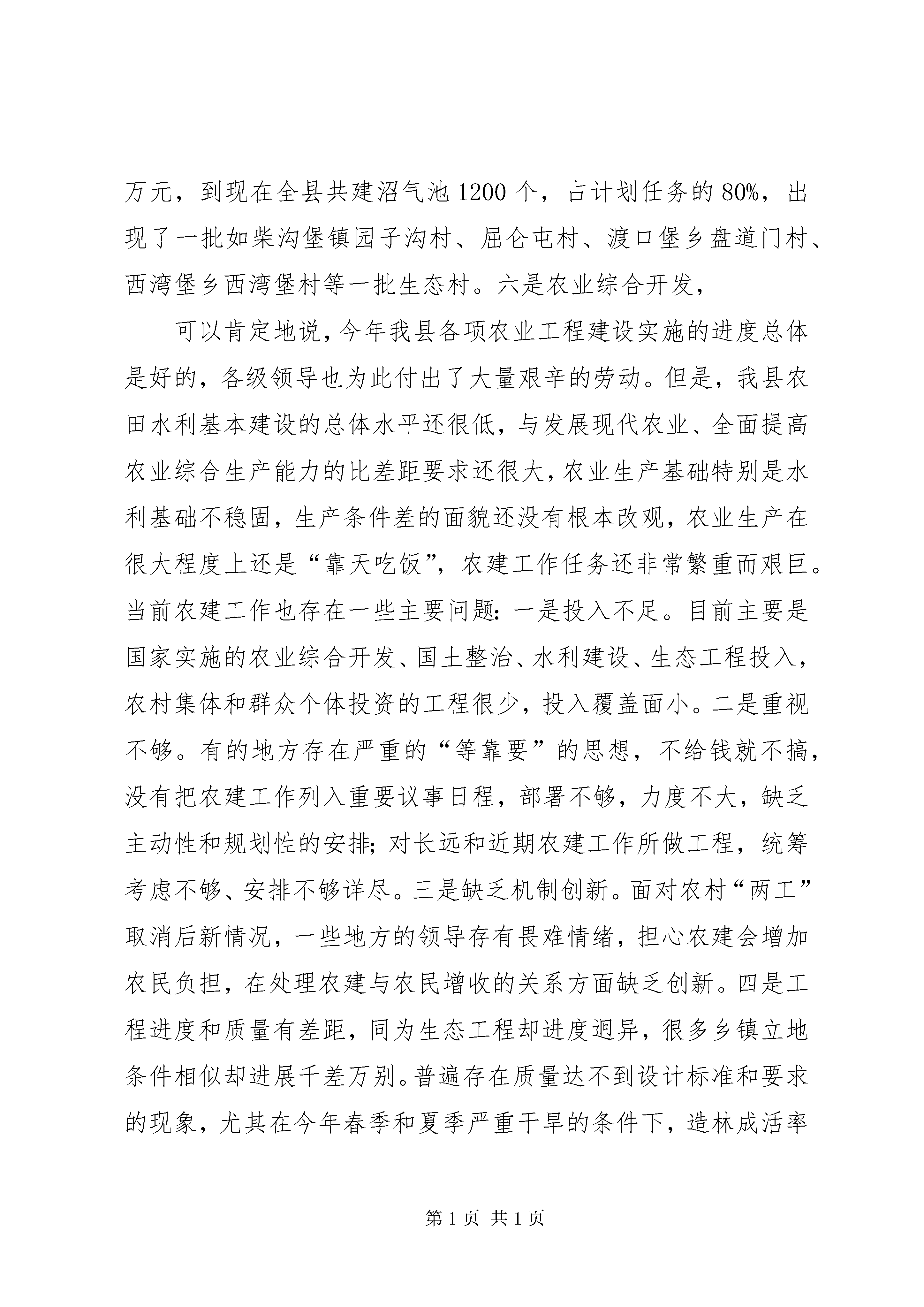 县秋冬农建工作动员会上的讲话同志们:今天我们召开全县秋冬农田水利基本建设工作会议,主要是贯彻落实9月24日全市秋冬季农田水利基本建设工作电视电话会议精神,研究部署我县今年的秋冬季农建工作,动员全市各级各部门和广大农民积极投入到秋冬季农建工作中来,迅速掀起农田水利基本建设高潮,全面做好今年秋冬季农田水利建设各项任务。下面,我讲几点意见:一、认清形势,切实增强做好农建工作的紧迫感近年来,我县抓住着国家农业产业政策调整的机遇,实施了退耕还林、京津风沙源治理、二十一世纪初期首都水资源可持续利用规划等一大批生态建设项目,被列入国家扶贫开工作重点县,全县农村全面实行了税费改革,我县农业和农村工作呈现出良好的发展态势。可以说农田水利基本建设的内容、形式及其工作方式都发生了根本性变化,工作时间也由原来的季节性突击向常年性建设转变,投入机制和建设模式呈现出多元化的发展格局,工程的设计标准、质量要求、时间安排、后期管理也更趋于严格和规范,这些都对我们开展农建工作提出了更高的要求。今年我县紧紧围绕提高农业综合生产能力,结合各项重点工程建设,积极动员和组织广大人民群众,开展和实施了一大批农田水利基本建设工程,有效地提高了农业抵御灾害的能力,促进了农作物增产、农业增效和农民增收,取得了明显成效。一是风沙源治理工程,水保项目今年治理任务15平方公里,节水工程任务40处,水源工程任务50处,投资计划390万元,目前已完成8.36平方公里,完成节水工程32处,水源工程38处。二是水利工程建设,节水型社会试点项目完成专项投资20万元,先后在第六屯乡、渡口堡乡、左卫镇等乡镇组建农民用水者协会11个,在试点第六屯乡为自来水用户安装了智能水表20套,为我县25家企业安装了用水计量设施;水库移民工作已申请专项资金150万元,目前该项工程已进入施工阶段;县城XX县区自来水厂已完成征地50亩,新打机井3眼,铺设改造供水管网4.5千米,完成投资210万元;农村饮水安全项目已完成6个村的工程,其余4个村正在紧张施工,已完成投资95万元;西洋河水库完成竣工验收,水沟口水库除险加固和太平庄水库除险加固项目已上报到省水利厅待审查批复。三是设施农业建设项目,全县春秋棚保持06年种植面积1946亩,比06年减少191亩,占去年实有面积的91.1%;07年新建春秋棚277亩,只占计划任务的21.3%。日光温室建设有所发展,全县共新建394亩。截止到现在,全县共有春秋棚2223亩,日光温室4319亩,我县已成为XX市设施蔬菜种植大县之一。四是退耕还林工程,今年实施的是去年1.5万亩的工程任务,在春季和雨季已经全部完成。五是沼气池建设,2007年争取到国债资金120万元,市级配套资金14.7万元,到现在全县共建沼气池1200个,占计划任务的80%,出现了一批如柴沟堡镇园子沟村、屈仑屯村、渡口堡乡盘道门村、西湾堡乡西湾堡村等一批生态村。六是农业综合开发,可以肯定地说,今年我县各项农业工程建设实施的进度总体是好的,各级领导也为此付出了大量艰辛的劳动。但是,我县农田水利基本建设的总体水平还很低,与发展现代农业、全面提高农业综合生产能力的比差距要求还很大,农业生产基础特别是水利基础不稳固,生产条件差的面貌还没有根本改观,农业生产在很大程度上还是“靠天吃饭”,农建工作任务还非常繁重而艰巨。当前农建工作也存在一些主要问题:一是投入不足。目前主要是国家实施的农业综合开发、国土整治、水利建设、生态工程投入,农村集体和群众个体投资的工程很少,投入覆盖面小。二是重视不够。有的地方存在严重的“等靠要”的思想,不给钱就不搞,没有把农建工作列入重要议事日程,部署不够,力度不大,缺乏主动性和规划性的安排;对长远和近期农建工作所做工程,统筹考虑不够、安排不够详尽。三是缺乏机制创新。面对农村“两工”取消后新情况,一些地方的领导存有畏难情绪,担心农建会增加农民负担,在处理农建与农民增收的关系方面缺乏创新。四是工程进度和质量有差距,同为生态工程却进度迥异,很多乡镇立地条件相似却进展千差万别。普遍存在质量达不到设计标准和要求的现象,尤其在今年春季和夏季严重干旱的条件下,造林成活率极低,其原因也有工作责任制没落实,技术上的关键环节把不严等诸多因素造成的。五是落实国家政策规定有偏差,尤其是在工程项目资金的使用上,违规操作、弄虚作假、搭车收费、不按实际标准施工等现象时有发生,这些虽然没有造成很大影响,但给我们敲响了警钟。今年我们已经安排了一次专项资金的自查自纠工作,也确实发现了一些问题,各单位必须认真整改,确保专款专用,真正使国家的投资落到实处,见到效益。今年我县遭受了严重的干旱、大风、冰雹等自然灾害,农业受灾严重,农作物大幅减产,值得我们进行深刻反思,给我们农田水利基本建设提出了更高的要求。我们要更加清醒地