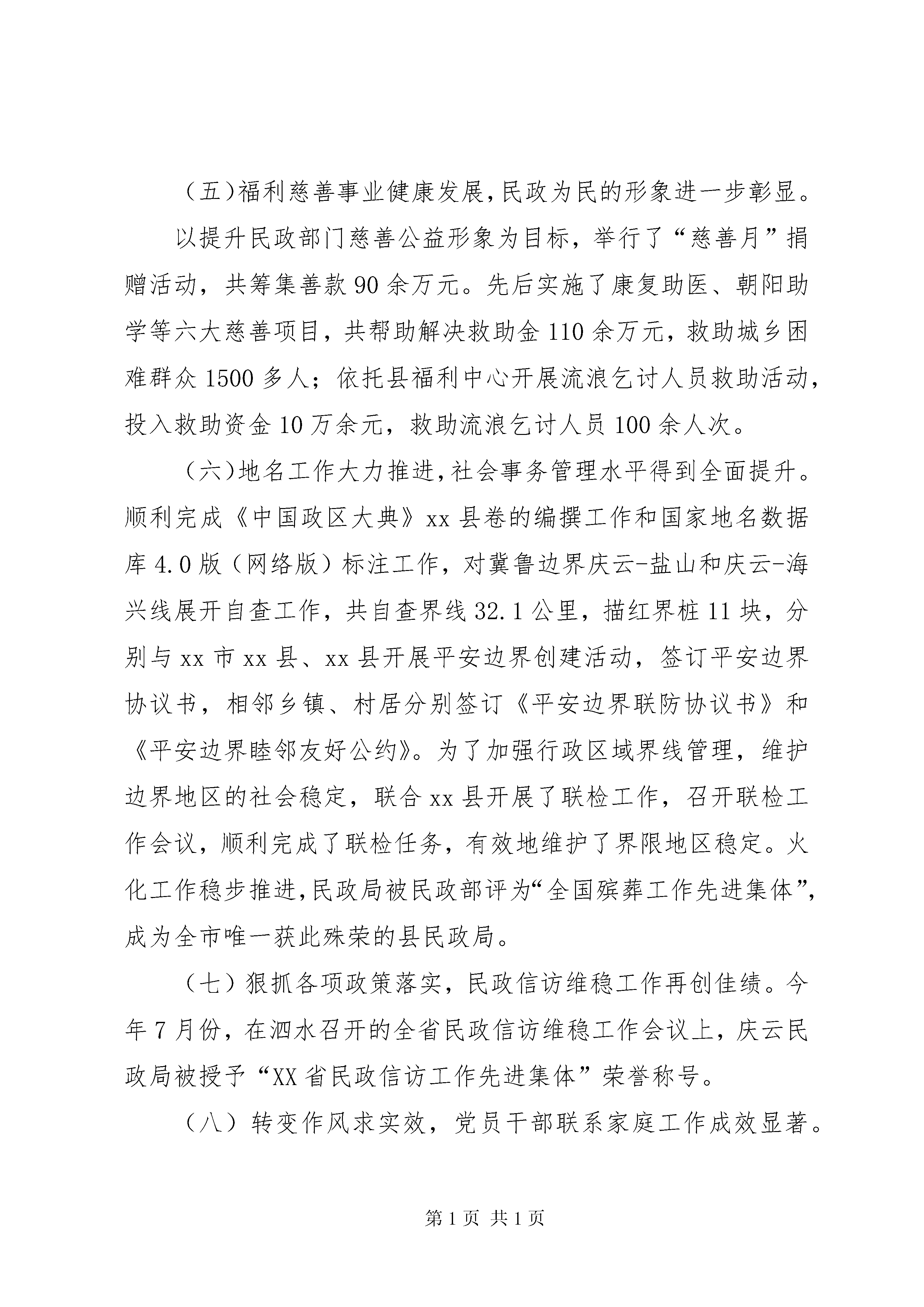 县民政局工作报告(一)坚定不移地狠抓招商引资,招商工作取得明显成效。一是引进工业项目一个。即pccp管生产项目,主要生产pccp管及其他混凝土管材,项目总投资15亿元,由河北客商朱俊鑫投资兴建,拟占地600亩。二是续建项目一个。今年以来,我局积极为庆龙食品有限公司抓好跟踪服务,帮助企业协调资金,办理相关手续,增资扩产。20xx年,该公司又投资600万元,新建设3600平方米的综合办公楼一处,目前已经竣工。三是引进总部经济一家。即德州恒旭商贸有限公司,注册资金500万元,现已缴纳税金60万元。四是无偿资金争取成效显著。截止到11月份,共争取上级各类无偿资金2390.53万元。(二)社会救助体系日臻完善,困难群众的生活幸福指数显著提高。一是“霞光营养早餐计划”稳步实施。按照市里要求,及时落实了农村五保供养老人每人每天早餐一袋牛奶、一个鸡蛋,不断提升老人的生活标准和水平。二是农村低保实现动态管理。对全县农村低保对象9271户11815人进行全面审核,取消不符合条件人员405户519人,新审批431户517人,做到了动态管理下的应保尽保。三是按照市里要求进一步对城市低保实施提标,将城市低保标准由260元/月提高到300元/月,农村低保由1800元提高到2000元,五保集中供养标准由每人每年3000元提高到3500元,保障标准进一步提高。四是各项临时救助政策有效落实。春节前夕,向生活困难职工、群众发放面粉200吨、食用油12600桶及救灾资金共计106万元;向城乡低保对象、五保对象发放了一次性生活补助,确保了他们安全过节。五是城乡困难群众医疗救助投入持续加大。今年1-10月份,全县医疗救助累计报销1682人次,报销金额190余万元,有效地解决了困难群众“看病难、看病贵”问题。五是孤儿生活待遇全面落实。严格按照上级提高孤儿基本生活费标准,由2012年每人每月600元提高到每人每月720元,并全部发放到位。(三)民生项目建设实现突破,民政公共服务能力得到全面提升。一是xx县殡仪馆即将投入使用。按照“设计园林化、设施现代化、功能齐全化、管理规范化”理念,投资2000多万元对县殡仪馆实施搬迁新建,新殡仪馆占地120亩,其中70亩为殡仪区、50亩为公墓区。目前,殡仪区主体工程已基本完工,总建筑面积7000余平方米,今年年底前即可投入使用。二是养老服务机构建设全面开花。依托县福利中心建设了xx县福利中心老年人日间照料中心,设计床位50张,现已投入使用。通过改扩建建设乡镇中心敬老院3处。其中,尚堂镇中心敬老院总投资150万元,设计床位100张。一期工程已正式投入使用,供养五保老人58名,二期工程主体已经完工,今年年底前投入使用。徐园子乡中心敬老院总投资105万元,设计床位80张,主体工程已经完工,已投入使用。常家镇养老服务中心总投资1400万元,该中心敬老院位于205国道、距离XX县区仅5公里,鉴于其优越的地理位置,我们在建设标准、规模和功能上按照集五保供养、社会养老、生活、休闲、娱乐和康复医疗为一体的花园式、综合性养老服务机构进行建设。目前,中心主体工程已完工,总建筑面积5000多平方米,设计床位300张,预计2014年上半年正式投入使用。(四)优抚安置政策全面落实,双拥创建工作水平进一步提升。一是春节前夕,按照上级要求向老复员军人、伤残军人、烈属等优抚对象及时发放了一次性生活补助金。二是以解决优抚对象的生活难、住房难和医疗难等“三难”问题为抓手,积极开展“三解三送”活动,先后为优抚对象集中办理医疗补助338人次,解决医疗费用40余万元;为优抚对象新建房屋45间、维修房屋39间,帮助28户优抚对象解决了住房难问题。同时,将2013年新增60周岁以上退役士兵和烈士子女全部纳入新农合“一站式”服务。三是散葬烈士墓集中管理工作成效显著。按照规划高标准、设计园林化的工作要求,圆满完成了散葬烈士墓的集中统一管理工作。全县690座散葬烈士墓全部迁入庆云纪念馆实现了统一集中管理。5月17日,全市散葬烈士墓集中管理工作现场会在庆云成功召开,学习推广了我县的经验和做法。四是双拥工作水平不断提高。6月18日-19日,省双拥模xx县考评组来我县考核双拥工作,对我县的双拥创建工作给予了充分肯定。(五)福利慈善事业健康发展,民政为民的形象进一步彰显。以提升民政部门慈善公益形象为目标,举行了“慈善月”捐赠活动,共筹集善款90余万元。先后实施了康复助医、朝阳助学等六大慈善项目,共帮助解决救助金110余万元,救助城乡困难群众1500多人;依托县福利中心开展流浪乞讨人员救助活动,投入救助资金10万余元,救助流浪乞讨人员100余人次。(六)地名工作大力推进,社会事务管理水平得到全面提升。顺利完成《中国政区大典》xx县卷的编撰工作和国家地名数据库4.0版(网络