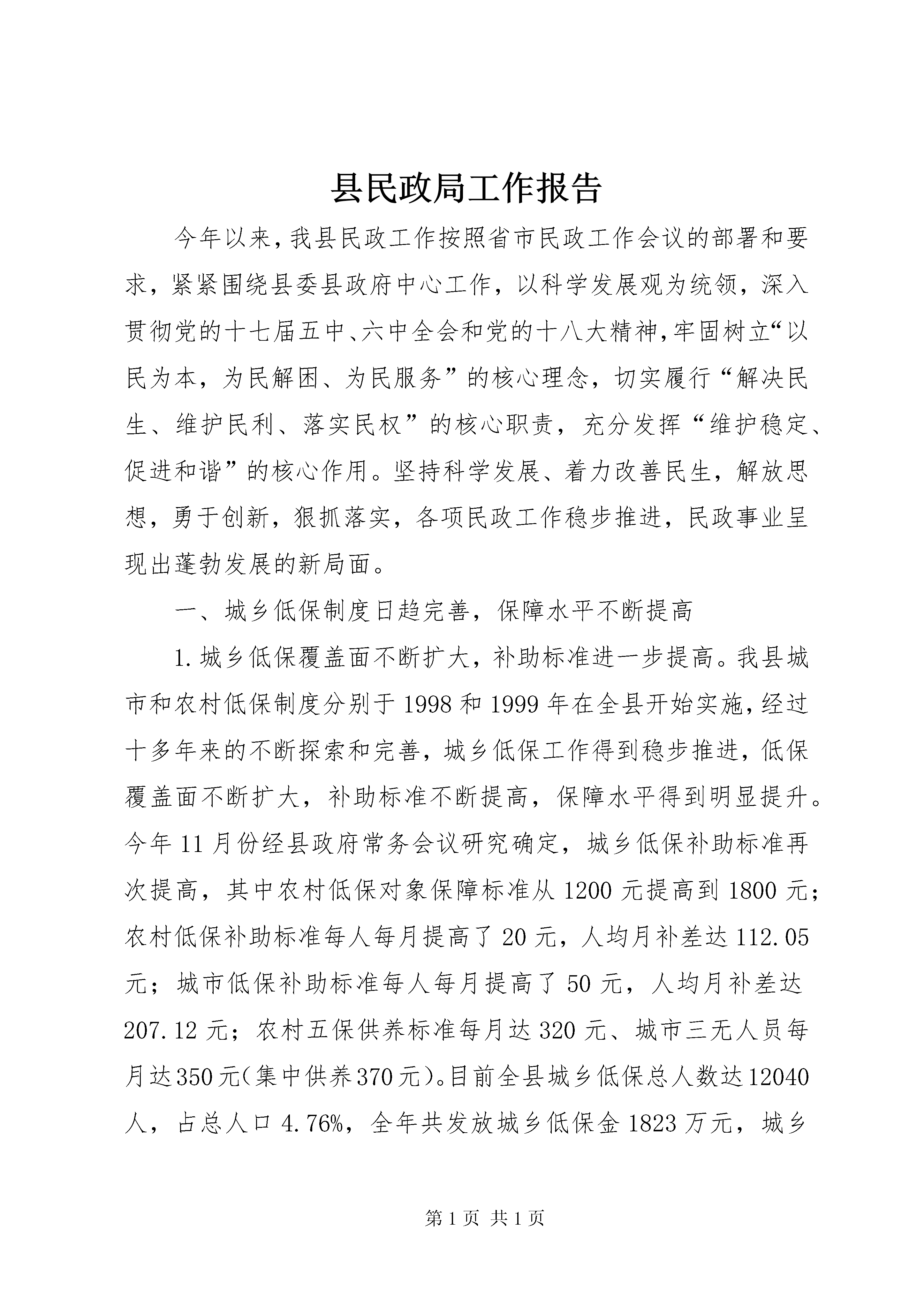 县民政局工作报告今年以来,我县民政工作按照省市民政工作会议的部署和要求,紧紧围绕县委县政府中心工作,以科学发展观为统领,深入贯彻党的十七届五中、六中全会和党的十八大精神,牢固树立“以民为本,为民解困、为民服务”的核心理念,切实履行“解决民生、维护民利、落实民权”的核心职责,充分发挥“维护稳定、促进和谐”的核心作用。坚持科学发展、着力改善民生,解放思想,勇于创新,狠抓落实,各项民政工作稳步推进,民政事业呈现出蓬勃发展的新局面。一、城乡低保制度日趋完善,保障水平不断提高1.城乡低保覆盖面不断扩大,补助标准进一步提高。我县城市和农村低保制度分别于1998和1999年在全县开始实施,经过十多年来的不断探索和完善,城乡低保工作得到稳步推进,低保覆盖面不断扩大,补助标准不断提高,保障水平得到明显提升。今年11月份经县政府常务会议研究确定,城乡低保补助标准再次提高,其中农村低保对象保障标准从1200元提高到1800元;农村低保补助标准每人每月提高了20元,人均月补差达112.05元;城市低保补助标准每人每月提高了50元,人均月补差达207.12元;农村五保供养标准每月达320元、城市三无人员每月达350元(集中供养370元)。目前全县城乡低保总人数达12040人,占总人口4.76%,全年共发放城乡低保金1823万元,城乡低保覆盖率和人均补差标准位列全省中上水平。2.城乡低保动态管理成效明显。为确保最低生活保障能真正落实到最困难群众手中,我县严格落实低保动态管理工作,自2007年以来,连续五年对城乡低保进行年度复核公示,严格工作程序,接受群众监督,至2012年底累计动态调整低保人数5516人(其中2012年动态管理调整1046人,增员690人,减员356人),基本实现“应保尽保、应退尽退”。3.城乡最低生活保障信息系统不断完善。为实现低保数据的信息化,完善和规范低保家庭的分类施保,按照省、市要求扎实开展低保信息采集和信息卡录入工作,推进城乡低保信息系统建设工作,不断健全低保档案资料,及时将动态后低保对象资料进行更新、整理、归档,做到一人一袋,一村一盒,一镇一柜。二、救灾救济措施逐步完善,抗灾救灾能力不断提升1.抗灾救灾措施有力,救援救济及时有效。我县自然灾害主要是热带风暴和台风带来的强降雨。灾情发生时我县立即启动救灾应急预案,采取应急措施,迅速转移人员,将低洼地带、地质灾害点、矿山、危房等处群众紧急转移到安全地带,确保群众生命财产安全。今年我县主要受5号台风“泰利”影响造成部分村居受灾,在灾情发生后,我们立即组织人员第一时间深入受灾地区了解灾情,根据有关乡镇及村居灾情报告,及时下拨自然灾害救济补助款,全年累计下拨救灾救济补助款242万元,积极帮助受灾户解决生活困难,确保受灾地区群众正常生活。入冬以来,为帮助解决困难群众的冬令御寒问题,今年还提早下达了冬令救济棉被1950床。2.县乡村三级自然灾害避灾点建设取得实效。为了认真贯彻党的十七大“关于强化减灾防灾工作”和省委省政府关于做好事关群众利益十项实事的要求,切实做好防灾、备灾、减灾、救灾工作,保障人民群众生命财产安全。我们扎实推进县、乡、村自然灾害避灾点建设工作,全县已建立240个避灾点,其中县级4个,乡级22个,村级214个。所有避灾点已健全机构、人员配备、物资储备、指示牌、标示牌、规章制度等,应对突发自然灾害的整体防御能力得到提升。3.认真做好备灾工作,切实提高灾害应急救助水平。为进一步加强救灾物资储备,我局已建立约300平方米的救灾物资储备仓库,目前备有棉被、床架、单被、单衣、救灾帐篷等物品,可供随时应急使用。同时每年与商家签订救灾应急物资购销合同,确保灾害发生24小时内受灾群众得到及时救助,全面提高灾害应急救助水平。三、医疗救助制度进一步完善,医疗救助水平不断提高我县的城乡困难家庭医疗救助工作从2005年正式启动后,通过在实践中不断地调查研究、总结经验,已基本形成了与新型农村合作医疗制度和城市居民医疗保险制度相衔接,相配套的运行机制。医疗救助“一站式”服务服务系统全面开通,进一步简化城乡困难家庭医疗救助手续,救助内容更加明确,救助效果更加明显,困难群众无钱看病和看不起病的问题进一步得到缓解。2012年累计救助2274人次,救助金额154.58万元,救助总人数和总金额比2011年有较大幅度的增长。四、优抚安置政策进一步落实,优抚安置保障能力不断提高1.按规定及时发放义务兵优待金。2012年度全县在部队服役的义务兵共有176人。根据“城乡一体化”的优抚政策,今年全县城乡义务兵优待金统一标准12500元/人,并全额由县财政负担,全县全年应发放义务兵优待金220万元。2.扎实落实优抚对象抚恤补助标准自然增长机制。为切实保证优抚对象的生活水平达到或略高于当地群众的平均生