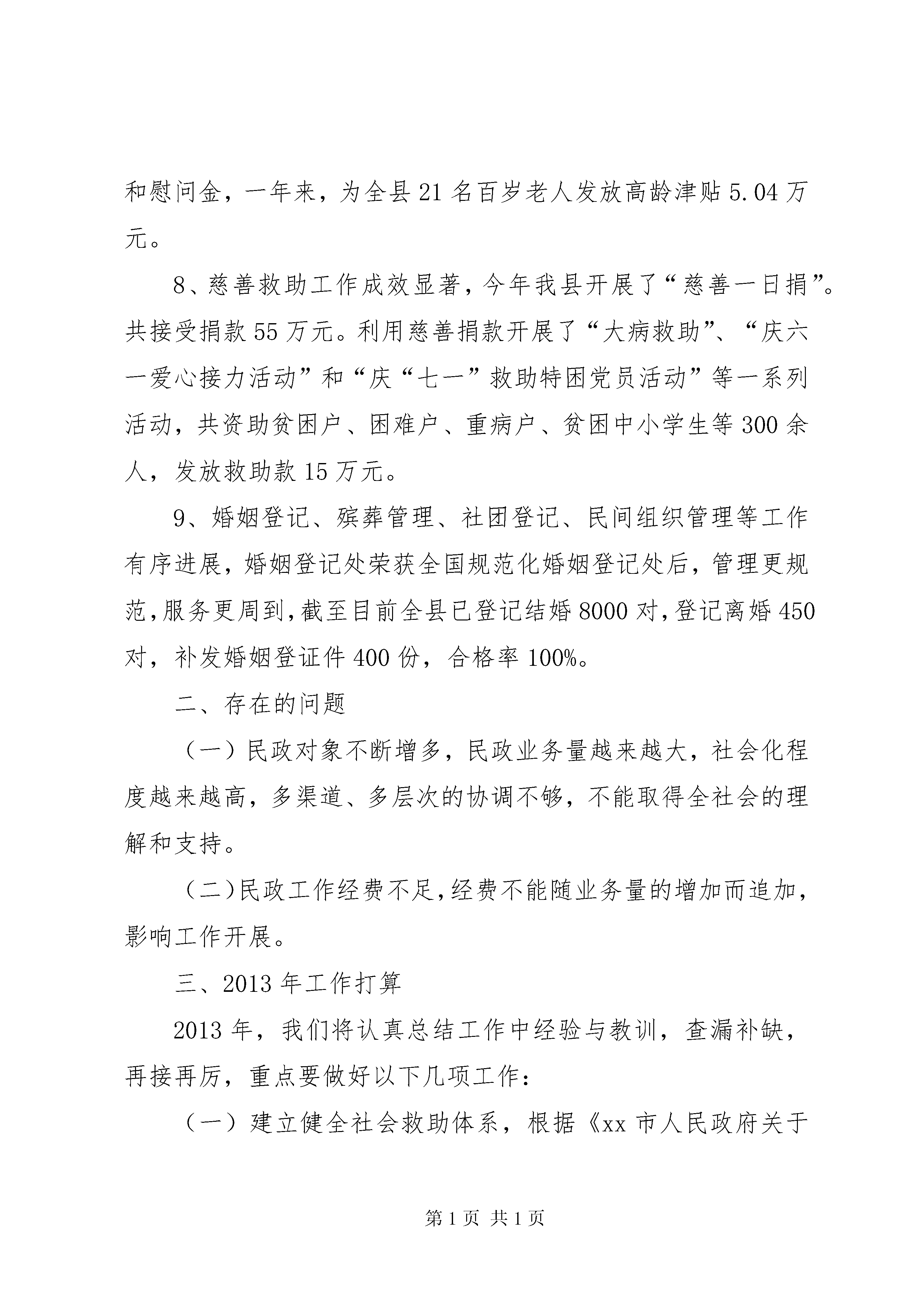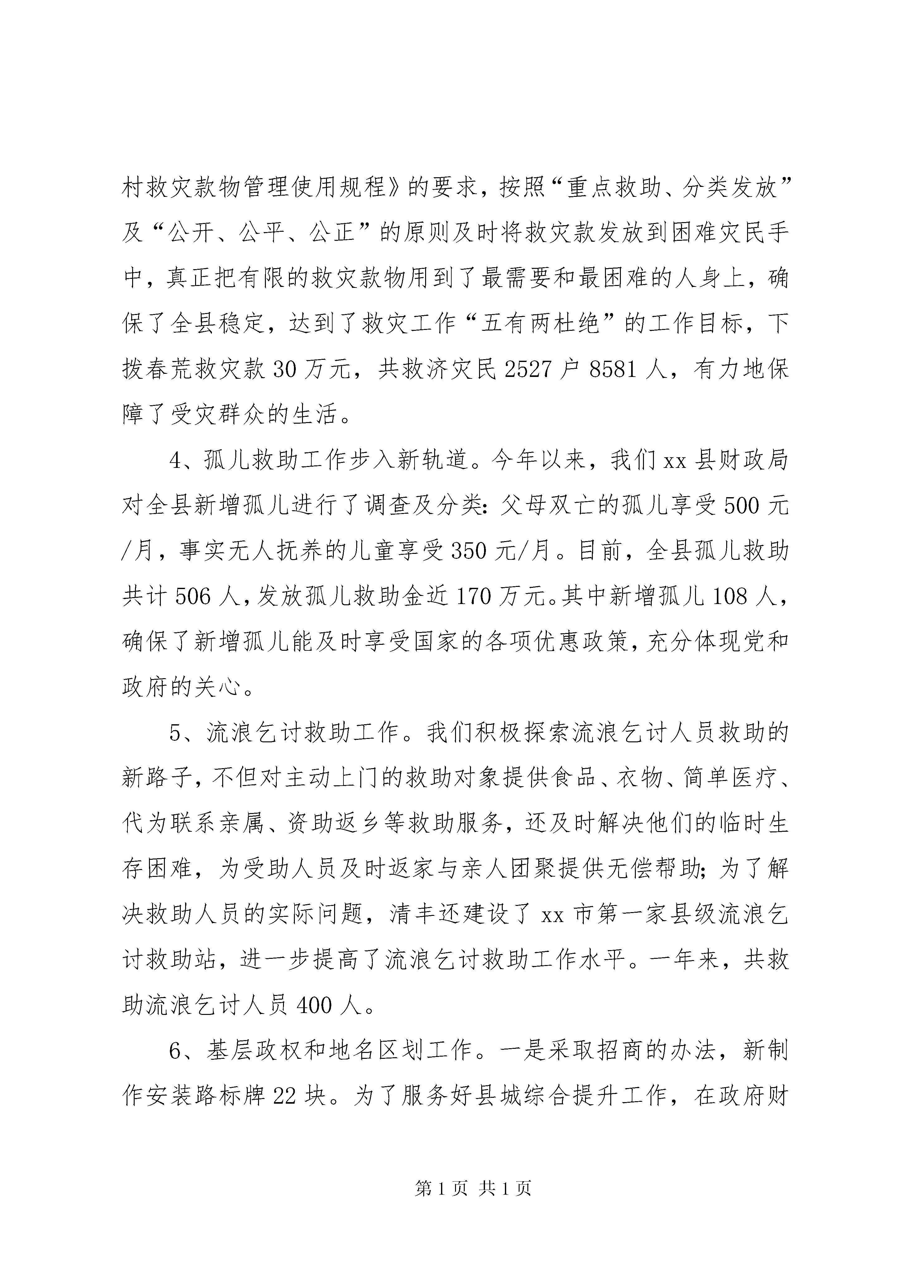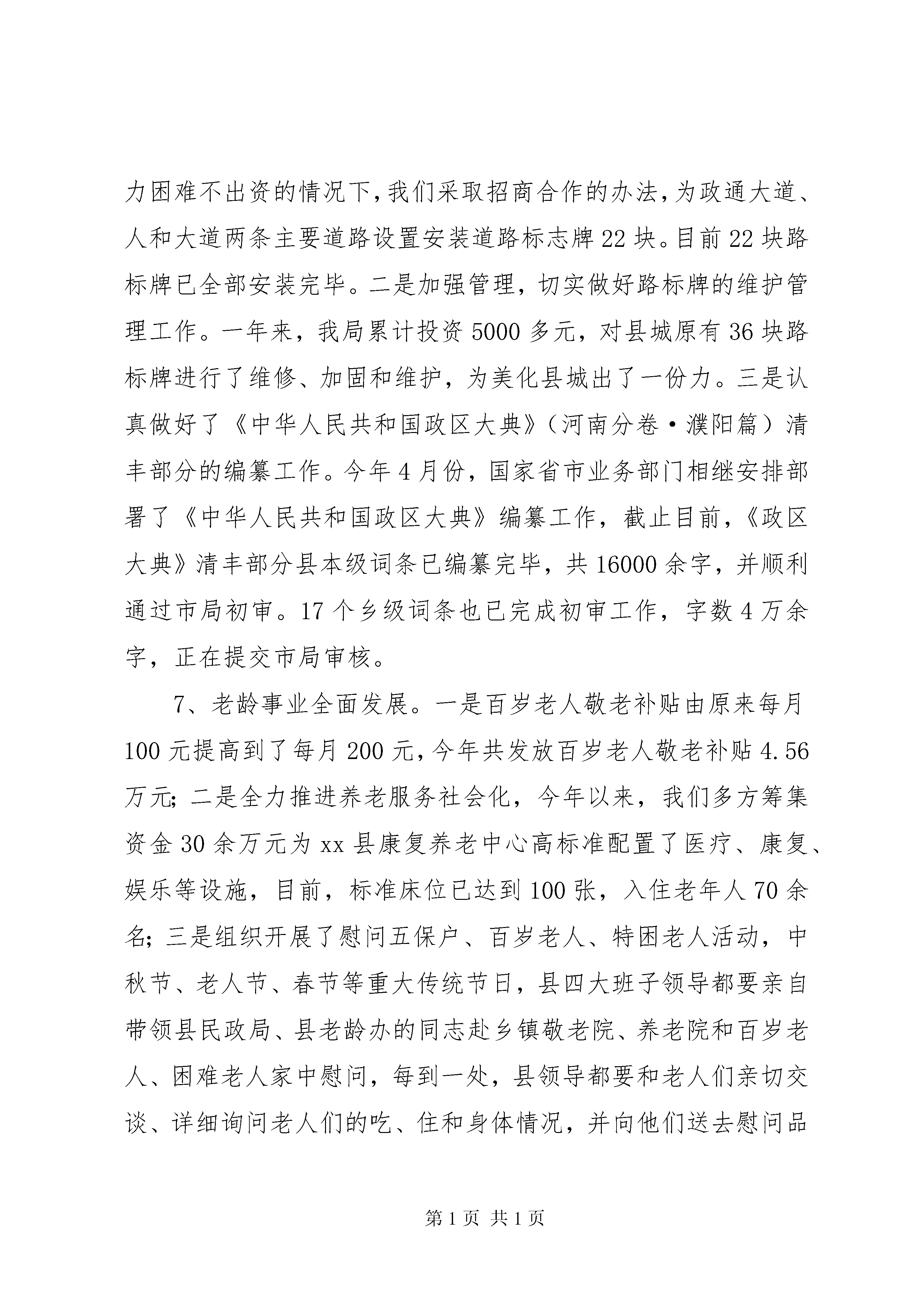 县民政局年度工作报告20xx年,我县民政工作在县委、县政府的正确领导下,在县人大、县政协的监督下,市民政局的支持帮助下,按照县委、政府确定的目标和任务,坚持依法行政,执政为民的工作理念,以持续开展“一创双优”活动作为总抓手,充分发挥民政部门职能作用,认真做好了民政各项工作,切实保障了人民群众的基本生活权益和民主政治权利,推动了全县民政工作又好又快发展,为维护全县社会稳定、促进经济发展做出了积极的贡献。现将工作情况总结如下:一、20xx年主要工作成绩1、社会救助工作取得新的进展。一是为进一步推进城乡低保工作管理规范化、操作程序化,我们强力推行“三级民委”工作机制和长期公示制度,有效地保障了困难群众的基本权益,真正地做到了应保尽保。今年,我县城市低保标准由原来人均每月160元提高到180元,农村低保标准由原来人均每月72元提高到87元;一年来,累计为全县167990人次发放农村低保金3485.8万元;为52317人次发放城市低保金917.4万元。二是农村五保集中供养标准再次提高,农村五保集中供养标准由每人每年2400元调整为2520元,分散供养标准由每人每年1320元调整为1500元。同时,我局全额资助全县五保对象参加新农合。一年来,共资助全县五保对象4016人,资助五保户参合资金共计20.3万元,发放五保供养资金802.3万元,23393人次。三是城乡医疗救助工作在全市率先实行同步结算,帮助困难群众缓解医疗难问题,一年来,累计发放救助资金355.8万元,救助3216人次。2、优抚安置及军休工作稳步推进。一是今年我县全面提高了全县优抚对象在定点医院就医所发生的门诊医疗费用,截至目前,为190余名优抚对象发放医疗补助10万多元。二是为进一步缓解60周岁以上烈士子女的实际困难,依据民发﹝2012﹞27号、民办发﹝2012﹞3号文件和省市有关通知精神,我局认真完成了428名烈士子女身份的核查认定、统计上报及数据录入工作。三是根据民发〔2011〕110号文件精神,从2011年8月1日起,为符合条件的2332名60周岁农村籍退役士兵发放老年生活补助。四是帮助优抚对象解决实际困难,今年资助优抚对象参合参保资金合计9.8万元。五是“八一”前,为全县374名农村义务兵和129名城镇义务兵发放优待金3436206元。六是对132名农村籍退役士兵进行了免费技能培训,使他们提高了自身素质,增强了就业能力。向74名待安置期间的城镇退役士兵发放了生活费84360元,对17名自谋职业人员发放了自谋职业金49.5万元。七是积极为军队离退休干部搞好服务。利用军休服务站这个平台,积极为军休干部开展医疗、住房、文化、娱乐等多方面的服务。3、创新救灾工作理念,保障受灾群众的基本生活。根据《乡、村救灾款物管理使用规程》的要求,按照“重点救助、分类发放”及“公开、公平、公正”的原则及时将救灾款发放到困难灾民手中,真正把有限的救灾款物用到了最需要和最困难的人身上,确保了全县稳定,达到了救灾工作“五有两杜绝”的工作目标,下拨春荒救灾款30万元,共救济灾民2527户8581人,有力地保障了受灾群众的生活。4、孤儿救助工作步入新轨道。今年以来,我们xx县财政局对全县新增孤儿进行了调查及分类:父母双亡的孤儿享受500元/月,事实无人抚养的儿童享受350元/月。目前,全县孤儿救助共计506人,发放孤儿救助金近170万元。其中新增孤儿108人,确保了新增孤儿能及时享受国家的各项优惠政策,充分体现党和政府的关心。5、流浪乞讨救助工作。我们积极探索流浪乞讨人员救助的新路子,不但对主动上门的救助对象提供食品、衣物、简单医疗、代为联系亲属、资助返乡等救助服务,还及时解决他们的临时生存困难,为受助人员及时返家与亲人团聚提供无偿帮助;为了解决救助人员的实际问题,清丰还建设了xx市第一家县级流浪乞讨救助站,进一步提高了流浪乞讨救助工作水平。一年来,共救助流浪乞讨人员400人。6、基层政权和地名区划工作。一是采取招商的办法,新制作安装路标牌22块。为了服务好县城综合提升工作,在政府财力困难不出资的情况下,我们采取招商合作的办法,为政通大道、人和大道两条主要道路设置安装道路标志牌22块。目前22块路标牌已全部安装完毕。二是加强管理,切实做好路标牌的维护管理工作。一年来,我局累计投资5000多元,对县城原有36块路标牌进行了维修、加固和维护,为美化县城出了一份力。三是认真做好了《中华人民共和国政区大典》(河南分卷·濮阳篇)清丰部分的编纂工作。今年4月份,国家省市业务部门相继安排部署了《中华人民共和国政区大典》编纂工作,截止目前,《政区大典》清丰部分县本级词条已编纂完毕,共16000余字,并顺利通过市局初审。17个乡级词条也已完成初审工作,字数4万余字,正在提交市局审核。7、老龄事