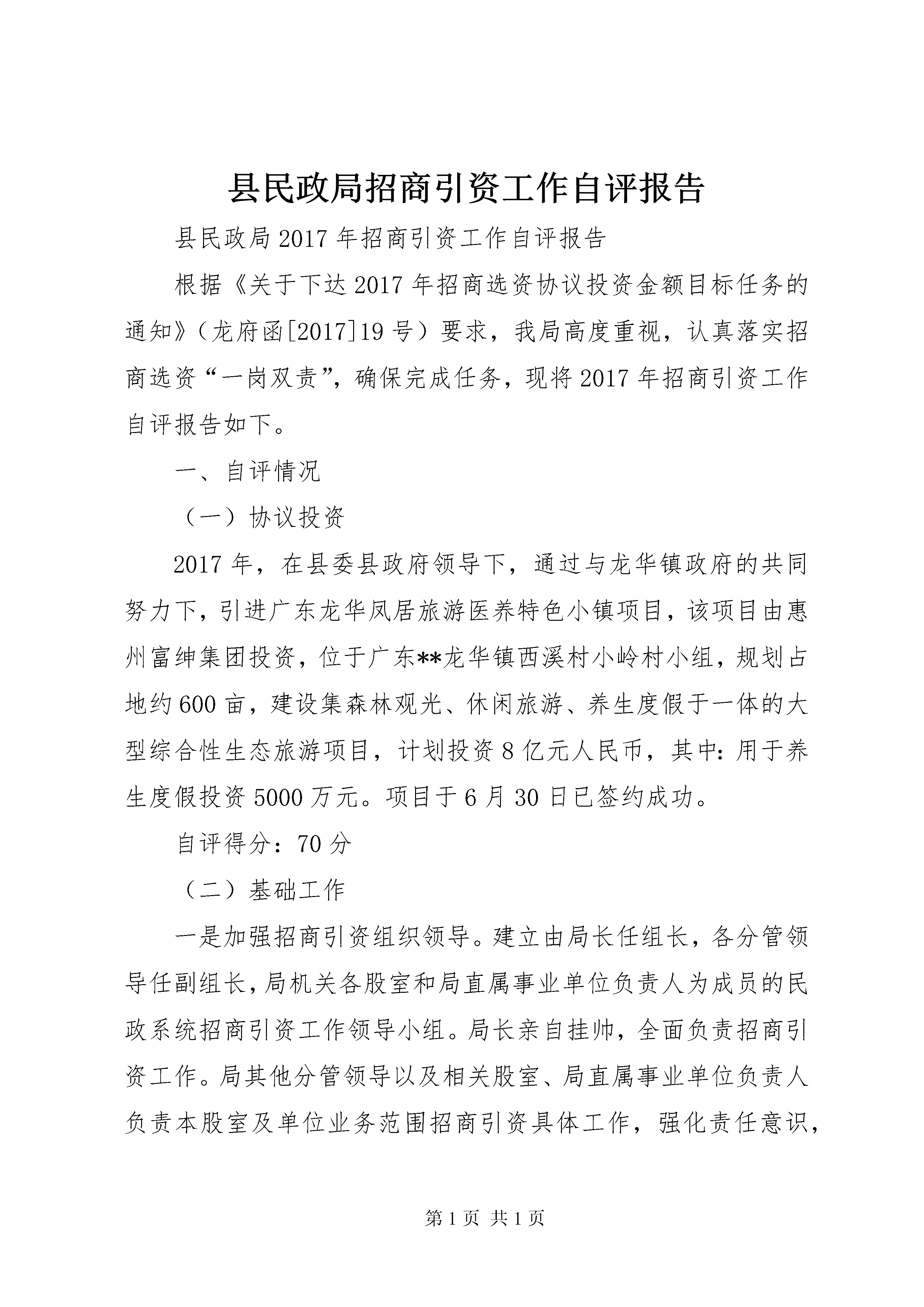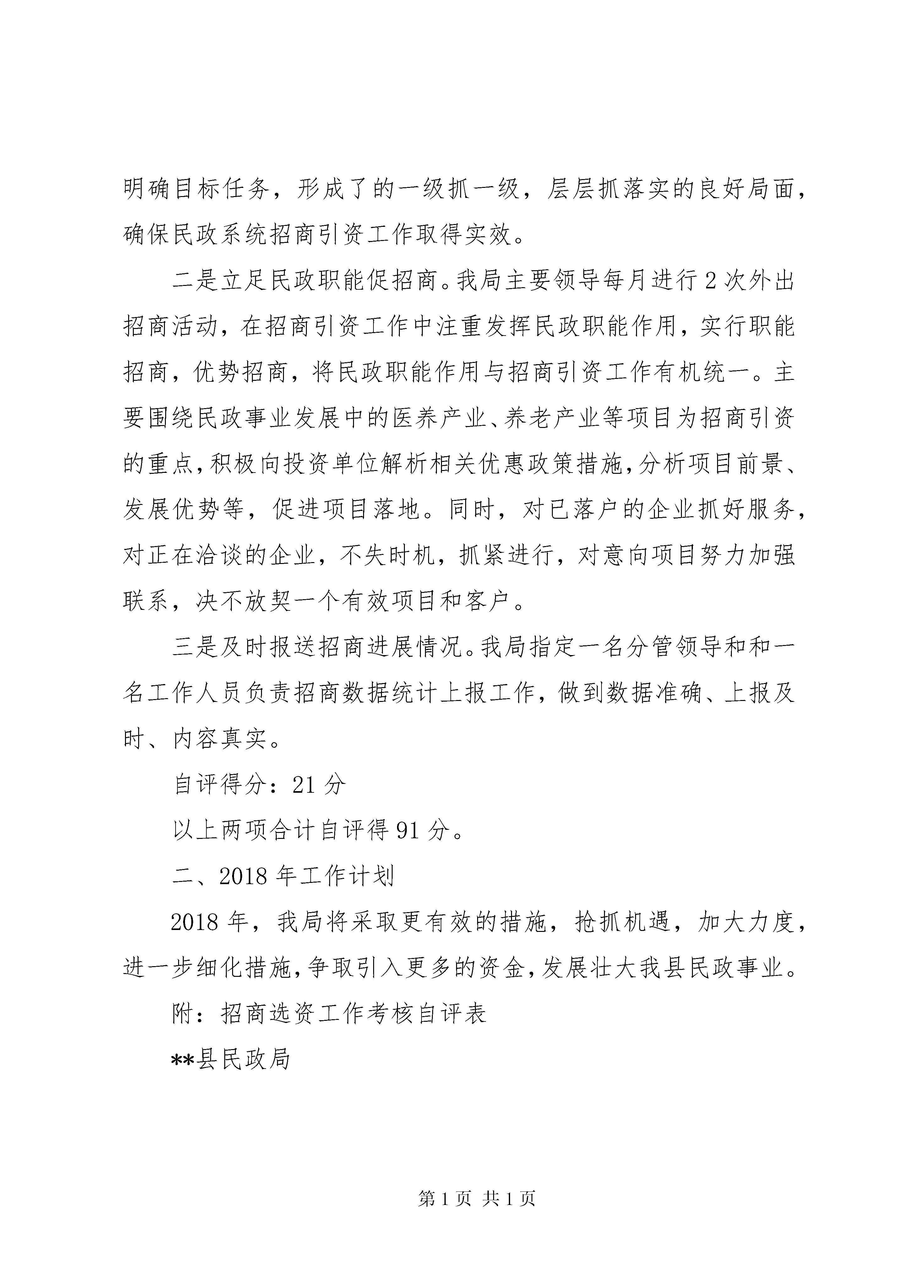县民政局招商引资工作自评报告县民政局2017年招商引资工作自评报告根据《关于下达2017年招商选资协议投资金额目标任务的通知》(龙府函[2017]19号)要求,我局高度重视,认真落实招商选资“一岗双责”,确保完成任务,现将2017年招商引资工作自评报告如下。一、自评情况(一)协议投资2017年,在县委县政府领导下,通过与龙华镇政府的共同努力下,引进广东龙华凤居旅游医养特色小镇项目,该项目由惠州富绅集团投资,位于广东**龙华镇西溪村小岭村小组,规划占地约600亩,建设集森林观光、休闲旅游、养生度假于一体的大型综合性生态旅游项目,计划投资8亿元人民币,其中:用于养生度假投资5000万元。项目于6月30日已签约成功。自评得分:70分(二)基础工作一是加强招商引资组织领导。建立由局长任组长,各分管领导任副组长,局机关各股室和局直属事业单位负责人为成员的民政系统招商引资工作领导小组。局长亲自挂帅,全面负责招商引资工作。局其他分管领导以及相关股室、局直属事业单位负责人负责本股室及单位业务范围招商引资具体工作,强化责任意识,明确目标任务,形成了的一级抓一级,层层抓落实的良好局面,确保民政系统招商引资工作取得实效。二是立足民政职能促招商。我局主要领导每月进行2次外出招商活动,在招商引资工作中注重发挥民政职能作用,实行职能招商,优势招商,将民政职能作用与招商引资工作有机统一。主要围绕民政事业发展中的医养产业、养老产业等项目为招商引资的重点,积极向投资单位解析相关优惠政策措施,分析项目前景、发展优势等,促进项目落地。同时,对已落户的企业抓好服务,对正在洽谈的企业,不失时机,抓紧进行,对意向项目努力加强联系,决不放契一个有效项目和客户。三是及时报送招商进展情况。我局指定一名分管领导和和一名工作人员负责招商数据统计上报工作,做到数据准确、上报及时、内容真实。自评得分:21分以上两项合计自评得91分。二、2018年工作计划2018年,我局将采取更有效的措施,抢抓机遇,加大力度,进一步细化措施,争取引入更多的资金,发展壮大我县民政事业。附:招商选资工作考核自评表**县民政局2017年3月5日