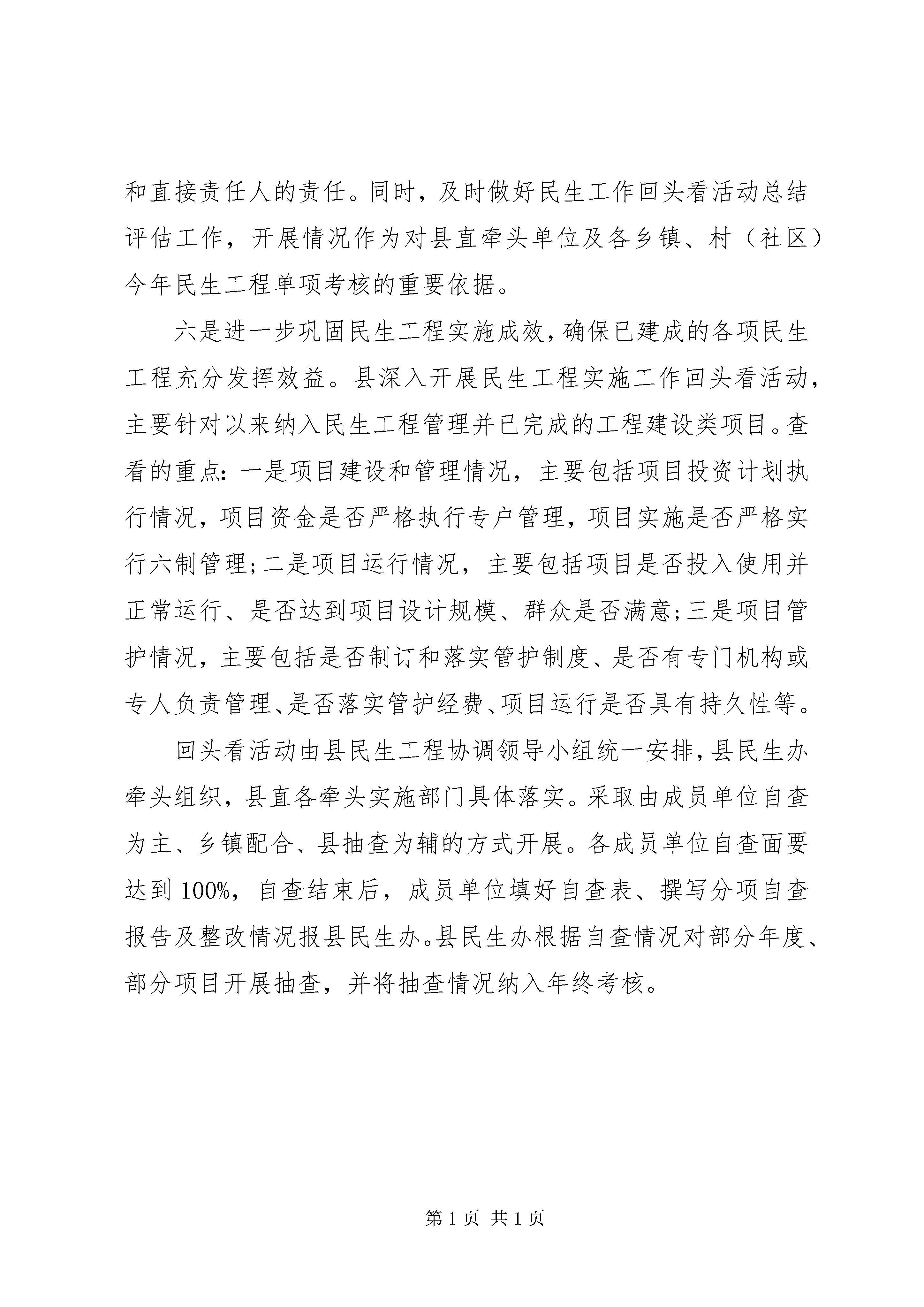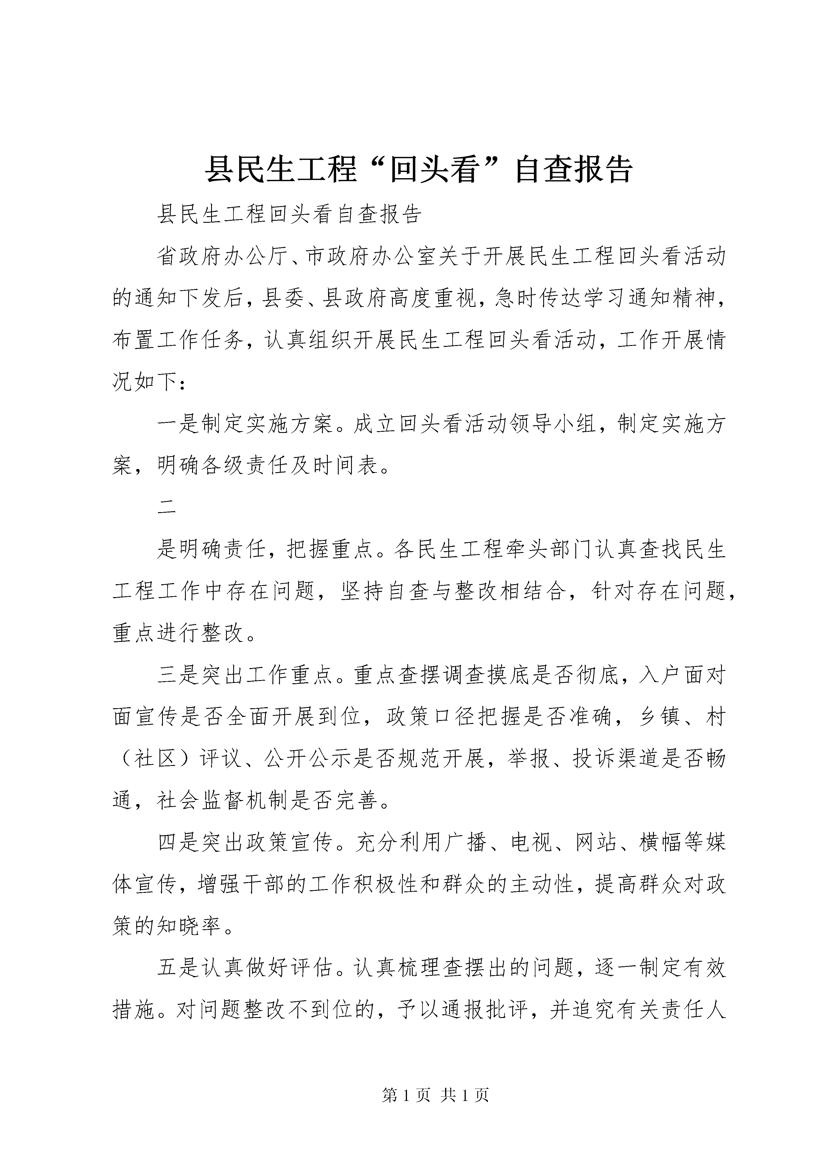 县民生工程“回头看”自查报告县民生工程回头看自查报告省政府办公厅、市政府办公室关于开展民生工程回头看活动的通知下发后,县委、县政府高度重视,急时传达学习通知精神,布置工作任务,认真组织开展民生工程回头看活动,工作开展情况如下:一是制定实施方案。成立回头看活动领导小组,制定实施方案,明确各级责任及时间表。二是明确责任,把握重点。各民生工程牵头部门认真查找民生工程工作中存在问题,坚持自查与整改相结合,针对存在问题,重点进行整改。三是突出工作重点。重点查摆调查摸底是否彻底,入户面对面宣传是否全面开展到位,政策口径把握是否准确,乡镇、村(社区)评议、公开公示是否规范开展,举报、投诉渠道是否畅通,社会监督机制是否完善。四是突出政策宣传。充分利用广播、电视、网站、横幅等媒体宣传,增强干部的工作积极性和群众的主动性,提高群众对政策的知晓率。五是认真做好评估。认真梳理查摆出的问题,逐一制定有效措施。对问题整改不到位的,予以通报批评,并追究有关责任人和直接责任人的责任。同时,及时做好民生工作回头看活动总结评估工作,开展情况作为对县直牵头单位及各乡镇、村(社区)今年民生工程单项考核的重要依据。六是进一步巩固民生工程实施成效,确保已建成的各项民生工程充分发挥效益。县深入开展民生工程实施工作回头看活动,主要针对以来纳入民生工程管理并已完成的工程建设类项目。查看的重点:一是项目建设和管理情况,主要包括项目投资计划执行情况,项目资金是否严格执行专户管理,项目实施是否严格实行六制管理;二是项目运行情况,主要包括项目是否投入使用并正常运行、是否达到项目设计规模、群众是否满意;三是项目管护情况,主要包括是否制订和落实管护制度、是否有专门机构或专人负责管理、是否落实管护经费、项目运行是否具有持久性等。回头看活动由县民生工程协调领导小组统一安排,县民生办牵头组织,县直各牵头实施部门具体落实。采取由成员单位自查为主、乡镇配合、县抽查为辅的方式开展。各成员单位自查面要达到100%,自查结束后,成员单位填好自查表、撰写分项自查报告及整改情况报县民生办。县民生办根据自查情况对部分年度、部分项目开展抽查,并将抽查情况纳入年终考核。
