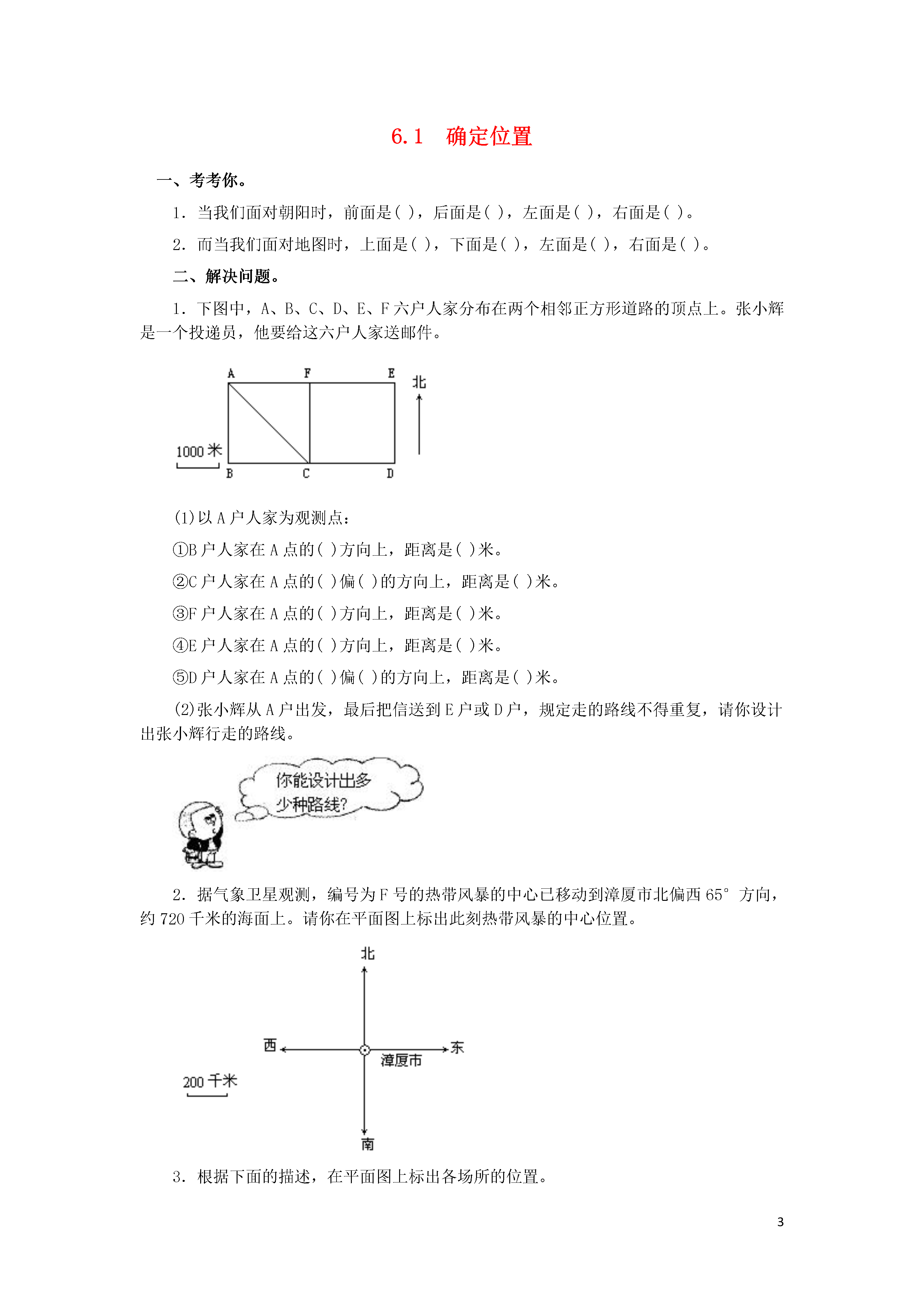 36.1确定位置一、考考你。1.当我们面对朝阳时,前面是(),后面是(),左面是(),右面是()。2.而当我们面对地图时,上面是(),下面是(),左面是(),右面是()。二、解决问题。1.下图中,A、B、C、D、E、F六户人家分布在两个相邻正方形道路的顶点上。张小辉是一个投递员,他要给这六户人家送邮件。(1)以A户人家为观测点:①B户人家在A点的()方向上,距离是()米。②C户人家在A点的()偏()的方向上,距离是()米。③F户人家在A点的()方向上,距离是()米。④E户人家在A点的()方向上,距离是()米。⑤D户人家在A点的()偏()的方向上,距离是()米。(2)张小辉从A户出发,最后把信送到E户或D户,规定走的路线不得重复,请你设计出张小辉行走的路线。2.据气象卫星观测,编号为F号的热带风暴的中心已移动到漳厦市北偏西65°方向,约720千米的海面上。请你在平面图上标出此刻热带风暴的中心位置。3.根据下面的描述,在平面图上标出各场所的位置。(1)实验小学在凤蝶公园的北偏东75°方向1500米处。(2)花卉市场在凤蝶公园的东偏北75°方向500米处。(3)圣水寺在凤蝶公园正南方向1000米处。(4)明珠山庄在凤蝶公园东偏南15°方向2000米处。生活拓展滨海市的逸夫中学和逸夫小学分别位于大路的同侧(如下图)。现在要在大路上设一个公共汽车停靠站,这个站建在什么位置,可以使两所学校的学生到停靠站的距离相等。(1)请画出示意图,并说明理由。(2)这个站处于中学的什么方向上?处于小学的什么方向上?参考答案:略