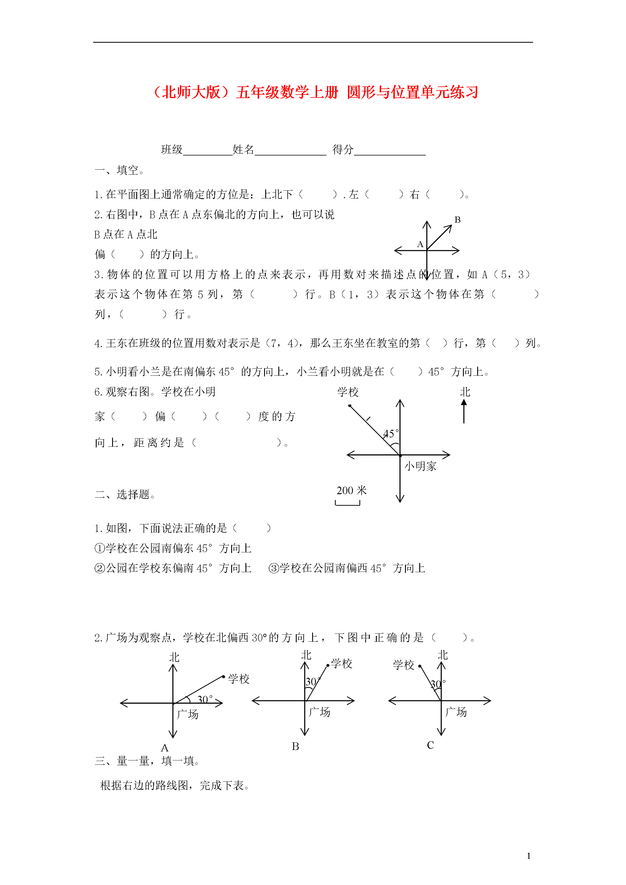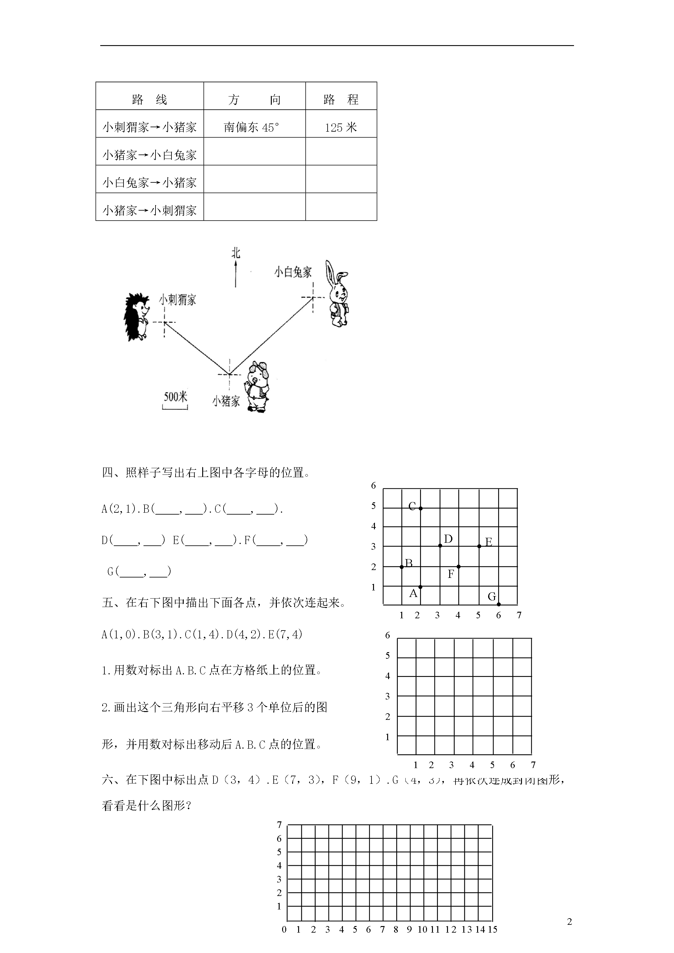 3(北师大版)五年级数学上册圆形与位置单元练习班级姓名得分一、填空。AB1.在平面图上通常确定的方位是:上北下().左()右()。2.右图中,B点在A点东偏北的方向上,也可以说B点在A点北偏()的方向上。3.物体的位置可以用方格上的点来表示,再用数对来描述点的位置,如A(5,3)表示这个物体在第5列,第()行。B(1,3)表示这个物体在第()列,()行。4.王东在班级的位置用数对表示是(7,4),那么王东坐在教室的第()行,第()列。5.小明看小兰是在南偏东45°的方向上,小兰看小明就是在()45°方向上。小明家北200米45°学校6.观察右图。学校在小明家()偏()()度的方向上,距离约是()。二、选择题。1.如图,下面说法正确的是()①学校在公园南偏东45°方向上②公园在学校东偏南45°方向上③学校在公园南偏西45°方向上学校学校学校ABC广场北30°广场北30°广场北30°2.广场为观察点,学校在北偏西30的方向上,下图中正确的是()。三、量一量,填一填。根据右边的路线图,完成下表。路线方向路程小刺猬家→小猪家南偏东45°125米小猪家→小白兔家小白兔家→小猪家小猪家→小刺猬家ABCDEFG1234567654321四、照样子写出右上图中各字母的位置。A(2,1).B(,).C(,).D(,)E(,).F(,)G(,)1234567654321五、在右下图中描出下面各点,并依次连起来。A(1,0).B(3,1).C(1,4).D(4,2).E(7,4)1.用数对标出A.B.C点在方格纸上的位置。2.画出这个三角形向右平移3个单位后的图形,并用数对标出移动后A.B.C点的位置。01234567891011121314157654321六、在下图中标出点D(3,4).E(7,3),F(9,1).G(4,3),再依次连成封闭图形,看看是什么图形?