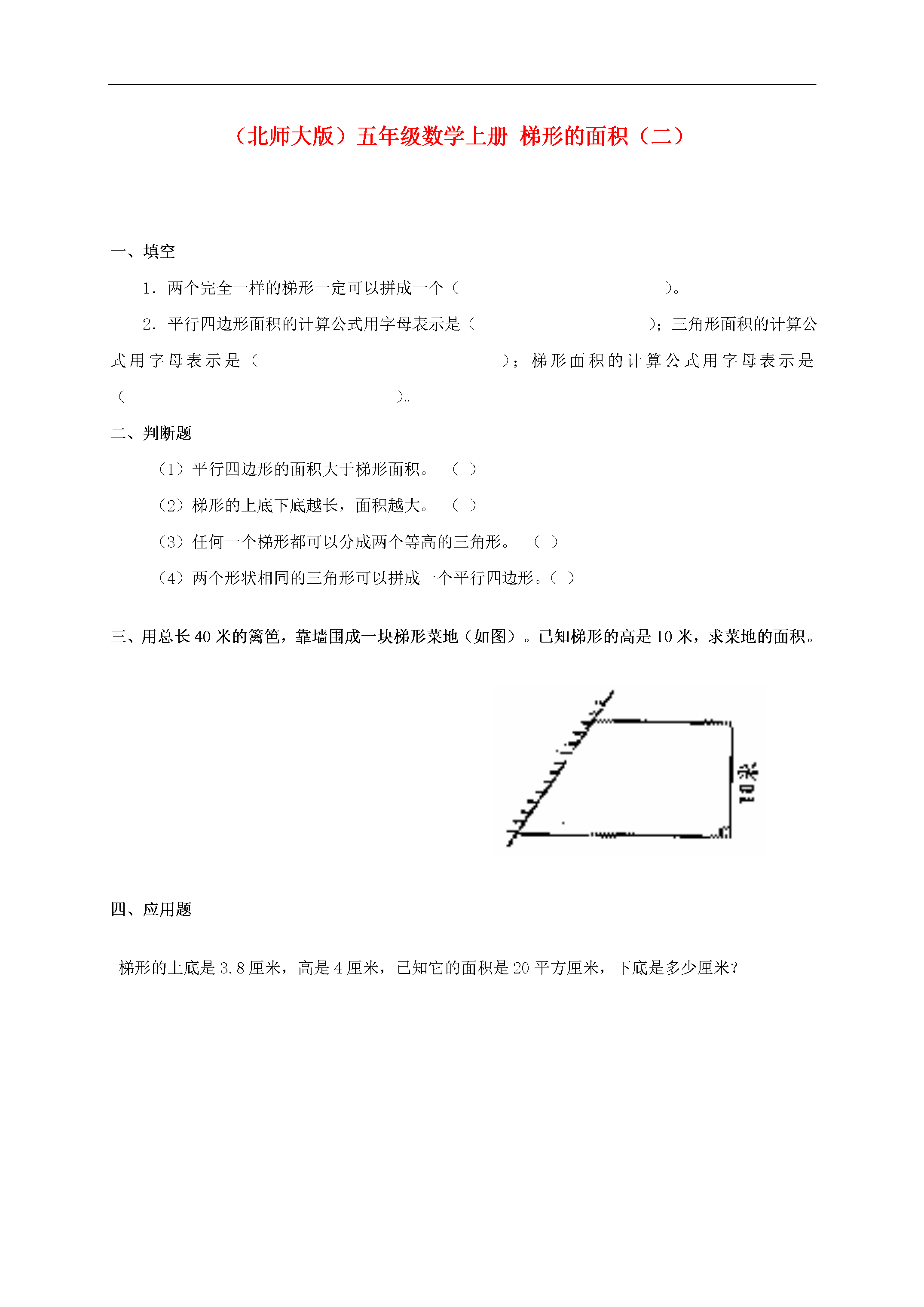 (北师大版)五年级数学上册梯形的面积(二)一、填空1.两个完全一样的梯形一定可以拼成一个()。2.平行四边形面积的计算公式用字母表示是();三角形面积的计算公式用字母表示是();梯形面积的计算公式用字母表示是()。二、判断题(1)平行四边形的面积大于梯形面积。()(2)梯形的上底下底越长,面积越大。()(3)任何一个梯形都可以分成两个等高的三角形。()(4)两个形状相同的三角形可以拼成一个平行四边形。()三、用总长40米的篱笆,靠墙围成一块梯形菜地(如图)。已知梯形的高是10米,求菜地的面积。四、应用题梯形的上底是3.8厘米,高是4厘米,已知它的面积是20平方厘米,下底是多少厘米?