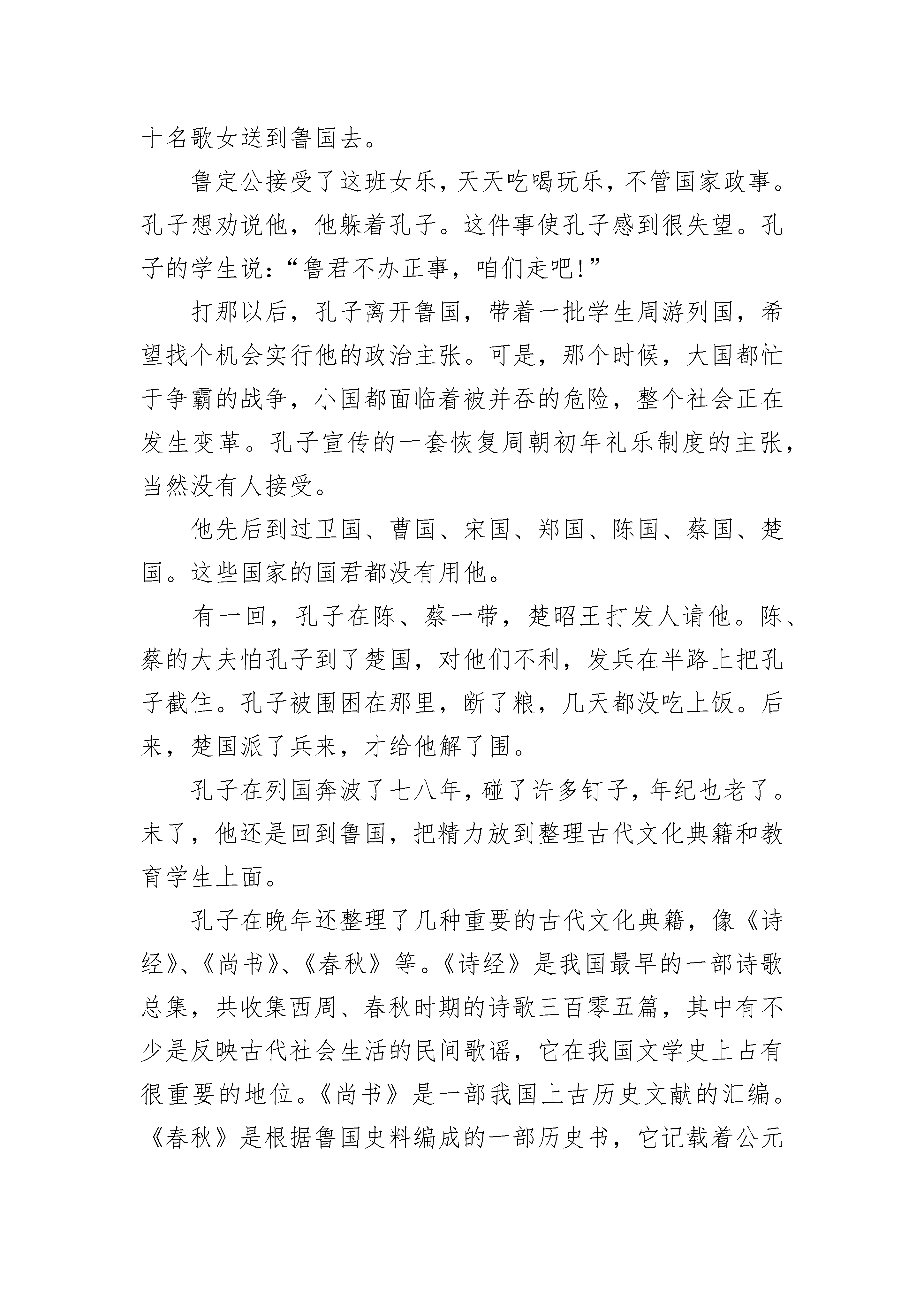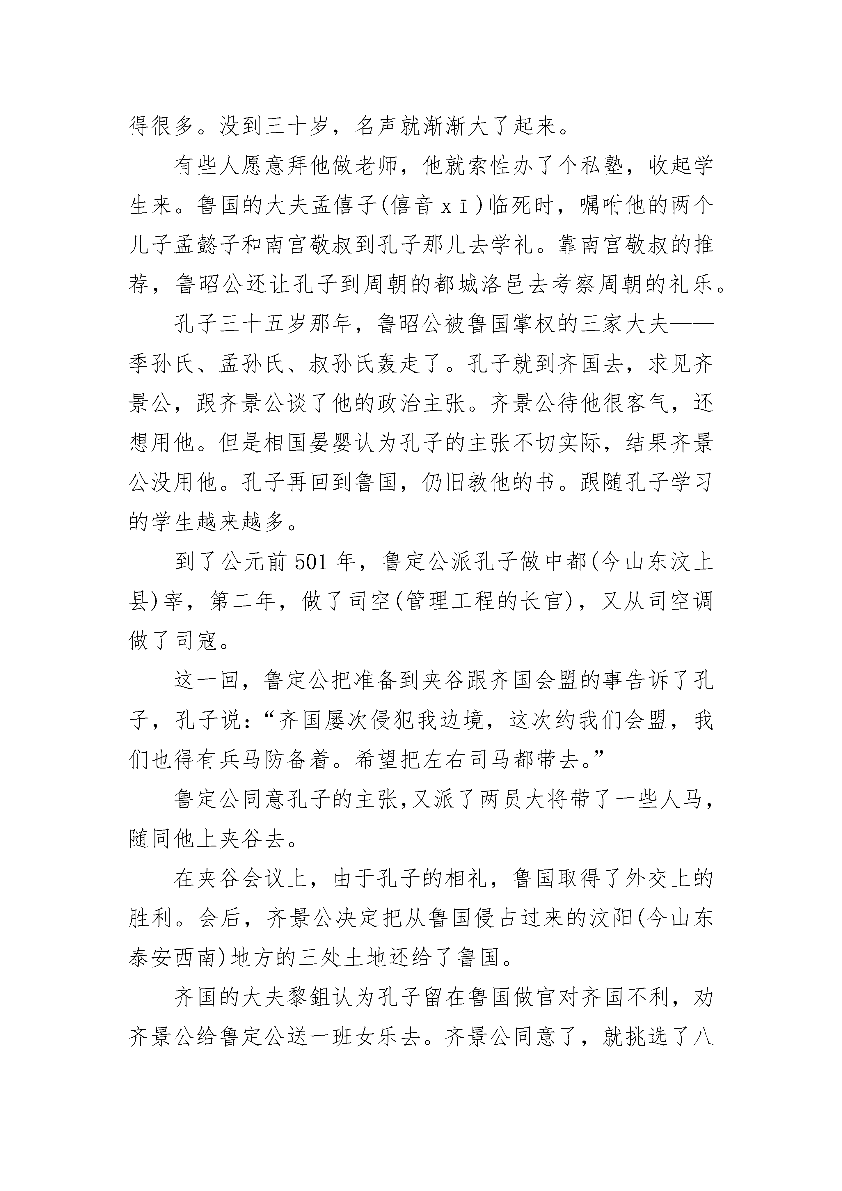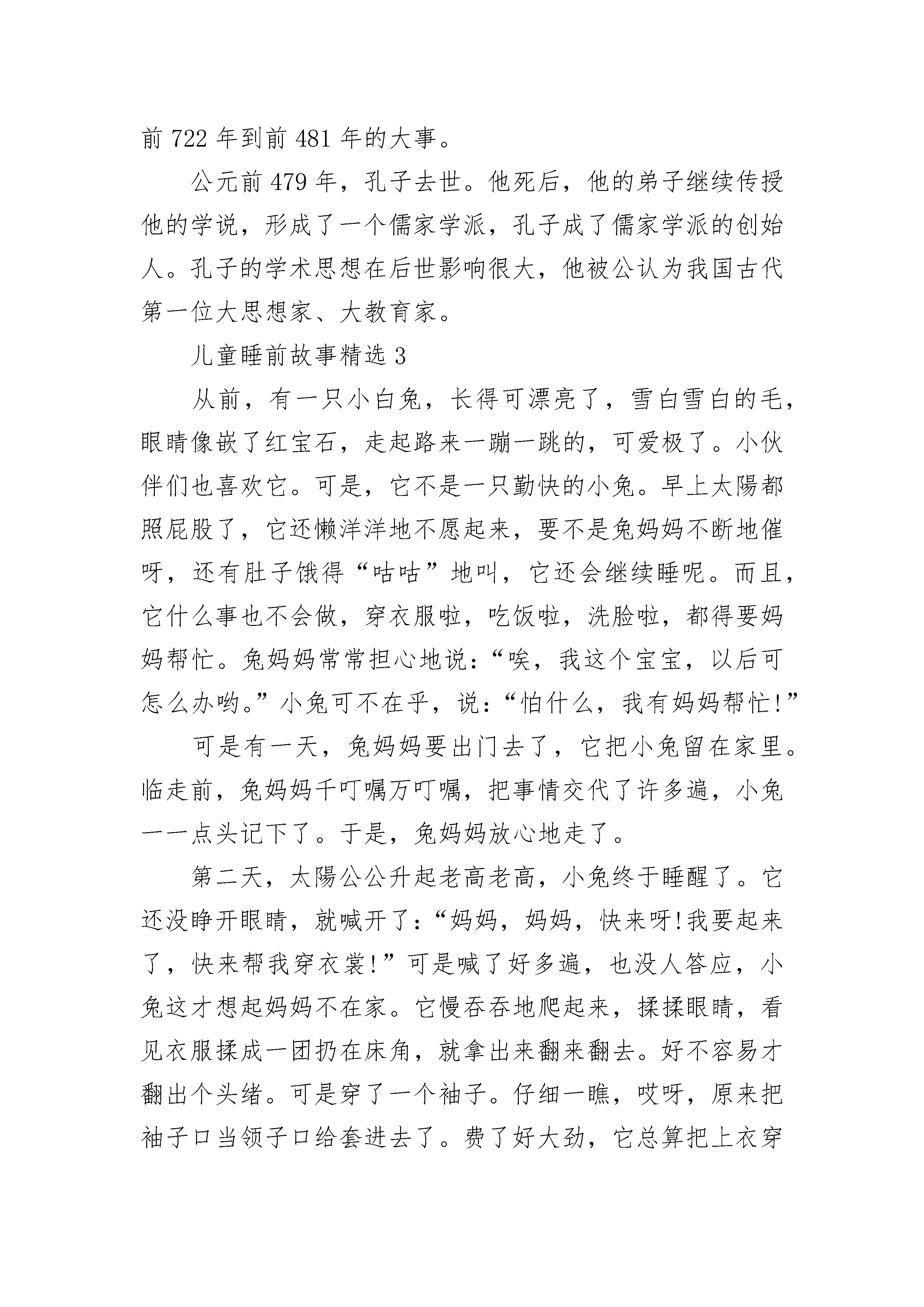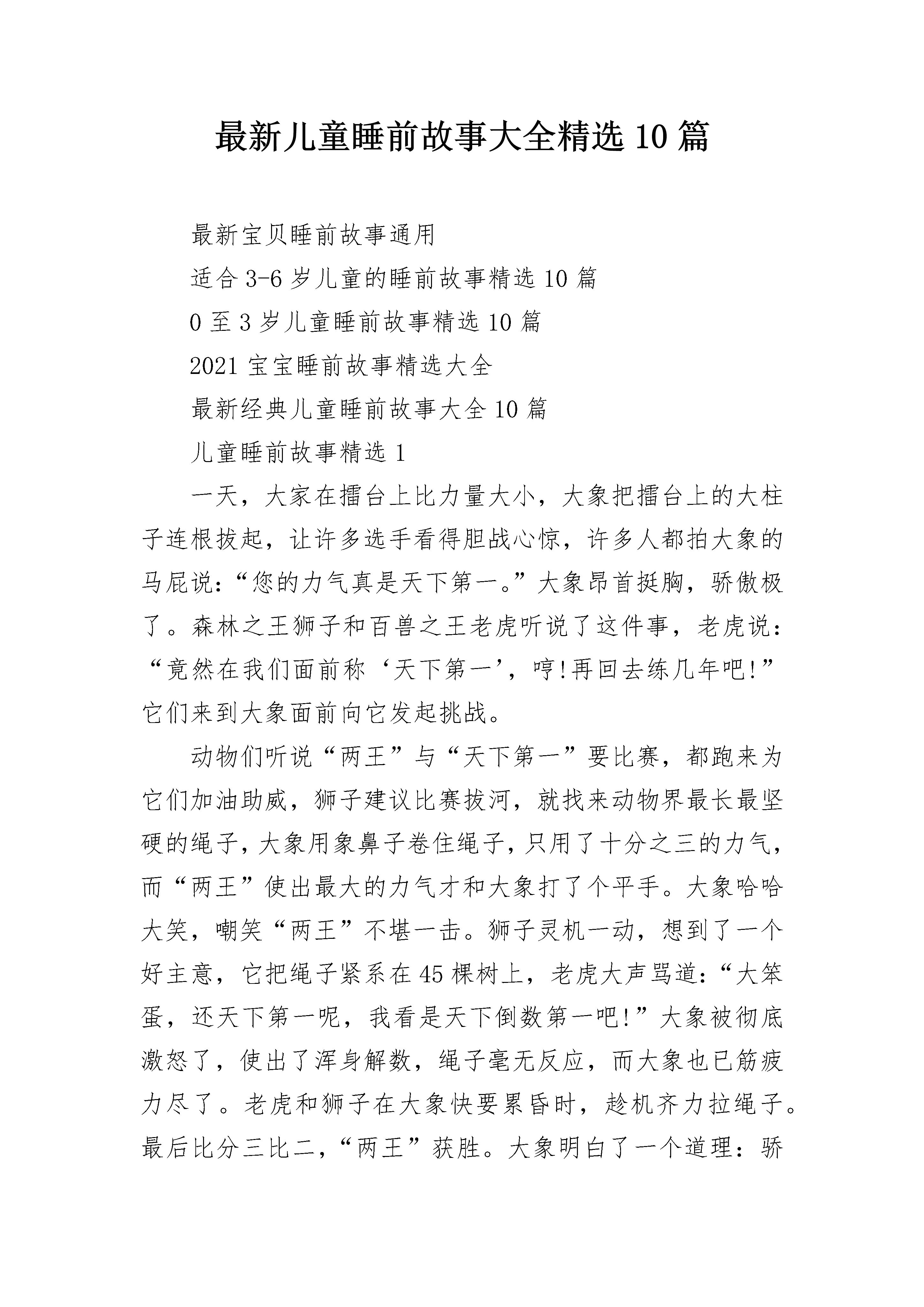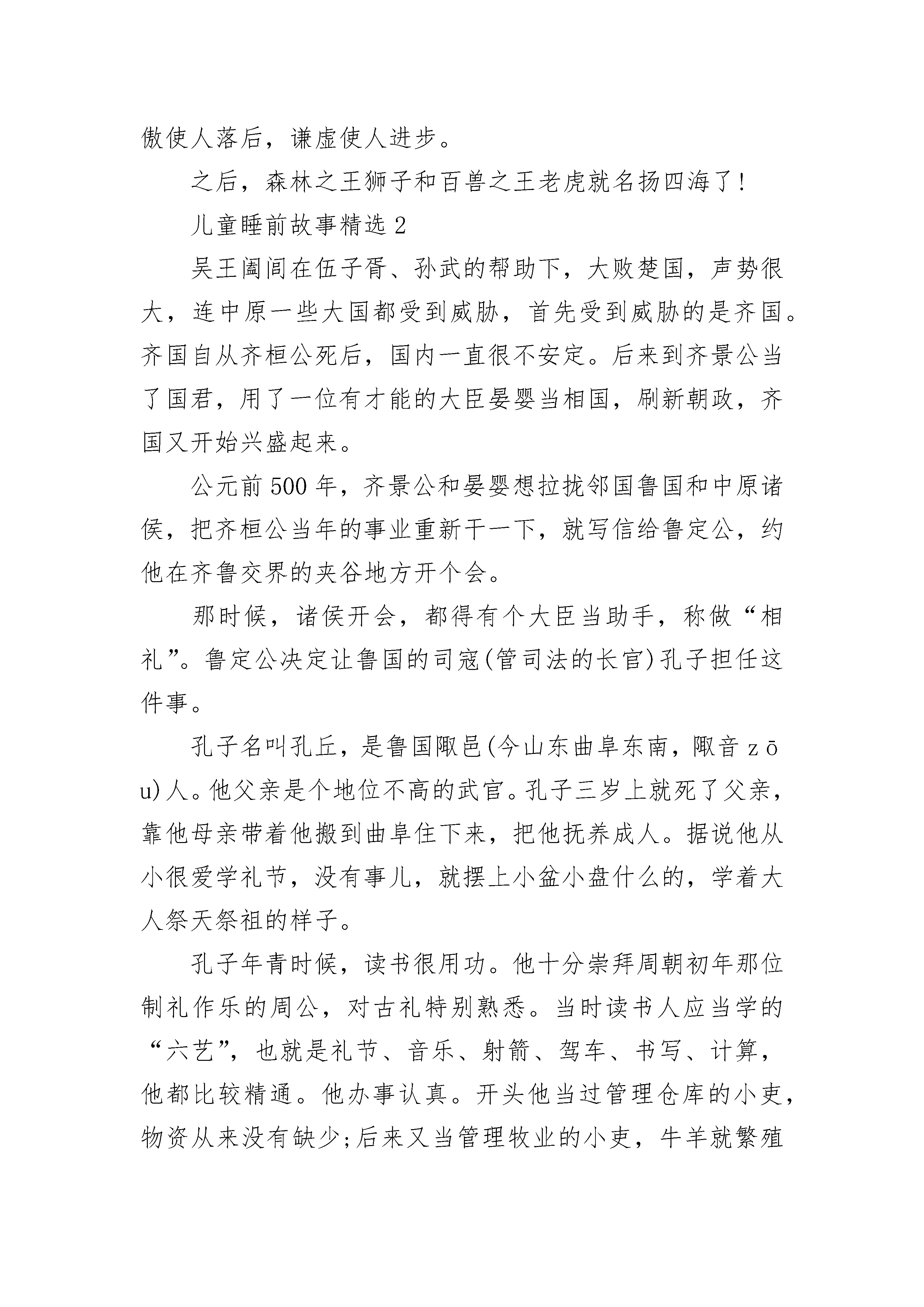 最新儿童睡前故事大全精选10篇最新宝贝睡前故事通用适合3-6岁儿童的睡前故事精选10篇0至3岁儿童睡前故事精选10篇2021宝宝睡前故事精选大全最新经典儿童睡前故事大全10篇儿童睡前故事精选1一天,大家在擂台上比力量大小,大象把擂台上的大柱子连根拔起,让许多选手看得胆战心惊,许多人都拍大象的马屁说:“您的力气真是天下第一。”大象昂首挺胸,骄傲极了。森林之王狮子和百兽之王老虎听说了这件事,老虎说:“竟然在我们面前称‘天下第一’,哼!再回去练几年吧!”它们来到大象面前向它发起挑战。动物们听说“两王”与“天下第一”要比赛,都跑来为它们加油助威,狮子建议比赛拔河,就找来动物界最长最坚硬的绳子,大象用象鼻子卷住绳子,只用了十分之三的力气,而“两王”使出最大的力气才和大象打了个平手。大象哈哈大笑,嘲笑“两王”不堪一击。狮子灵机一动,想到了一个好主意,它把绳子紧系在45棵树上,老虎大声骂道:“大笨蛋,还天下第一呢,我看是天下倒数第一吧!”大象被彻底激怒了,使出了浑身解数,绳子毫无反应,而大象也已筋疲力尽了。老虎和狮子在大象快要累昏时,趁机齐力拉绳子。最后比分三比二,“两王”获胜。大象明白了一个道理:骄傲使人落后,谦虚使人进步。之后,森林之王狮子和百兽之王老虎就名扬四海了!儿童睡前故事精选2吴王阖闾在伍子胥、孙武的帮助下,大败楚国,声势很大,连中原一些大国都受到威胁,首先受到威胁的是齐国。齐国自从齐桓公死后,国内一直很不安定。后来到齐景公当了国君,用了一位有才能的大臣晏婴当相国,刷新朝政,齐国又开始兴盛起来。公元前500年,齐景公和晏婴想拉拢邻国鲁国和中原诸侯,把齐桓公当年的事业重新干一下,就写信给鲁定公,约他在齐鲁交界的夹谷地方开个会。那时候,诸侯开会,都得有个大臣当助手,称做“相礼”。鲁定公决定让鲁国的司寇(管司法的长官)孔子担任这件事。孔子名叫孔丘,是鲁国陬邑(今山东曲阜东南,陬音zōu)人。他父亲是个地位不高的武官。孔子三岁上就死了父亲,靠他母亲带着他搬到曲阜住下来,把他抚养成人。据说他从小很爱学礼节,没有事儿,就摆上小盆小盘什么的,学着大人祭天祭祖的样子。孔子年青时候,读书很用功。他十分崇拜周朝初年那位制礼作乐的周公,对古礼特别熟悉。当时读书人应当学的“六艺”,也就是礼节、音乐、射箭、驾车、书写、计算,他都比较精通。他办事认真。开头他当过管理仓库的小吏,物资从来没有缺少;后来又当管理牧业的小吏,牛羊就繁殖得很多。没到三十岁,名声就渐渐大了起来。有些人愿意拜他做老师,他就索性办了个私塾,收起学生来。鲁国的大夫孟僖子(僖音xī)临死时,嘱咐他的两个儿子孟懿子和南宫敬叔到孔子那儿去学礼。靠南宫敬叔的推荐,鲁昭公还让孔子到周朝的都城洛邑去考察周朝的礼乐。孔子三十五岁那年,鲁昭公被鲁国掌权的三家大夫——季孙氏、孟孙氏、叔孙氏轰走了。孔子就到齐国去,求见齐景公,跟齐景公谈了他的政治主张。齐景公待他很客气,还想用他。但是相国晏婴认为孔子的主张不切实际,结果齐景公没用他。孔子再回到鲁国,仍旧教他的书。跟随孔子学习的学生越来越多。到了公元前501年,鲁定公派孔子做中都(今山东汶上县)宰,第二年,做了司空(管理工程的长官),又从司空调做了司寇。这一回,鲁定公把准备到夹谷跟齐国会盟的事告诉了孔子,孔子说:“齐国屡次侵犯我边境,这次约我们会盟,我们也得有兵马防备着。希望把左右司马都带去。”鲁定公同意孔子的主张,又派了两员大将带了一些人马,随同他上夹谷去。在夹谷会议上,由于孔子的相礼,鲁国取得了外交上的胜利。会后,齐景公决定把从鲁国侵占过来的汶阳(今山东泰安西南)地方的三处土地还给了鲁国。齐国的大夫黎鉏认为孔子留在鲁国做官对齐国不利,劝齐景公给鲁定公送一班女乐去。齐景公同意了,就挑选了八十名歌女送到鲁国去。鲁定公接受了这班女乐,天天吃喝玩乐,不管国家政事。孔子想劝说他,他躲着孔子。这件事使孔子感到很失望。孔子的学生说:“鲁君不办正事,咱们走吧!”打那以后,孔子离开鲁国,带着一批学生周游列国,希望找个机会实行他的政治主张。可是,那个时候,大国都忙于争霸的战争,小国都面临着被并吞的危险,整个社会正在发生变革。孔子宣传的一套恢复周朝初年礼乐制度的主张,当然没有人接受。他先后到过卫国、曹国、宋国、郑国、陈国、蔡国、楚国。这些国家的国君都没有用他。有一回,孔子在陈、蔡一带,楚昭王打发人请他。陈、蔡的大夫怕孔子到了楚国,对他们不利,发兵在半路上把孔子截住。孔子被围困在那里,断了粮,几天都没吃上饭。后来,楚国派了兵来,才给他解了围。孔子在列国奔波了七八年,碰了许多钉子,年纪也老了。末了,他还是回到鲁国,把精力放到整理古代文化典籍和教育学生上面。孔子在晚年还整理了几种重要的古代文化典籍,像《诗经》、《尚书》、《春秋》等。《诗经》是我国最早的一部诗歌总集,共收集西周、春秋