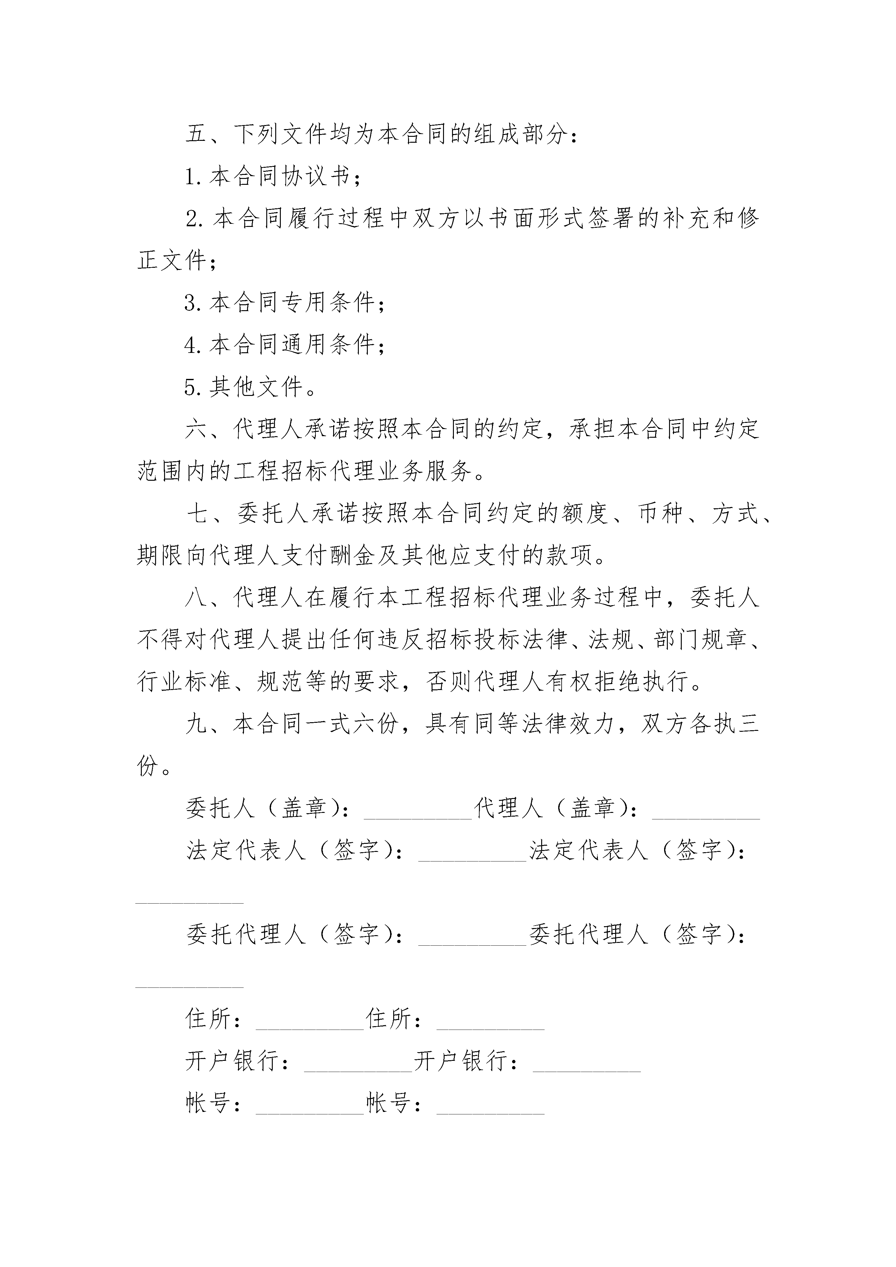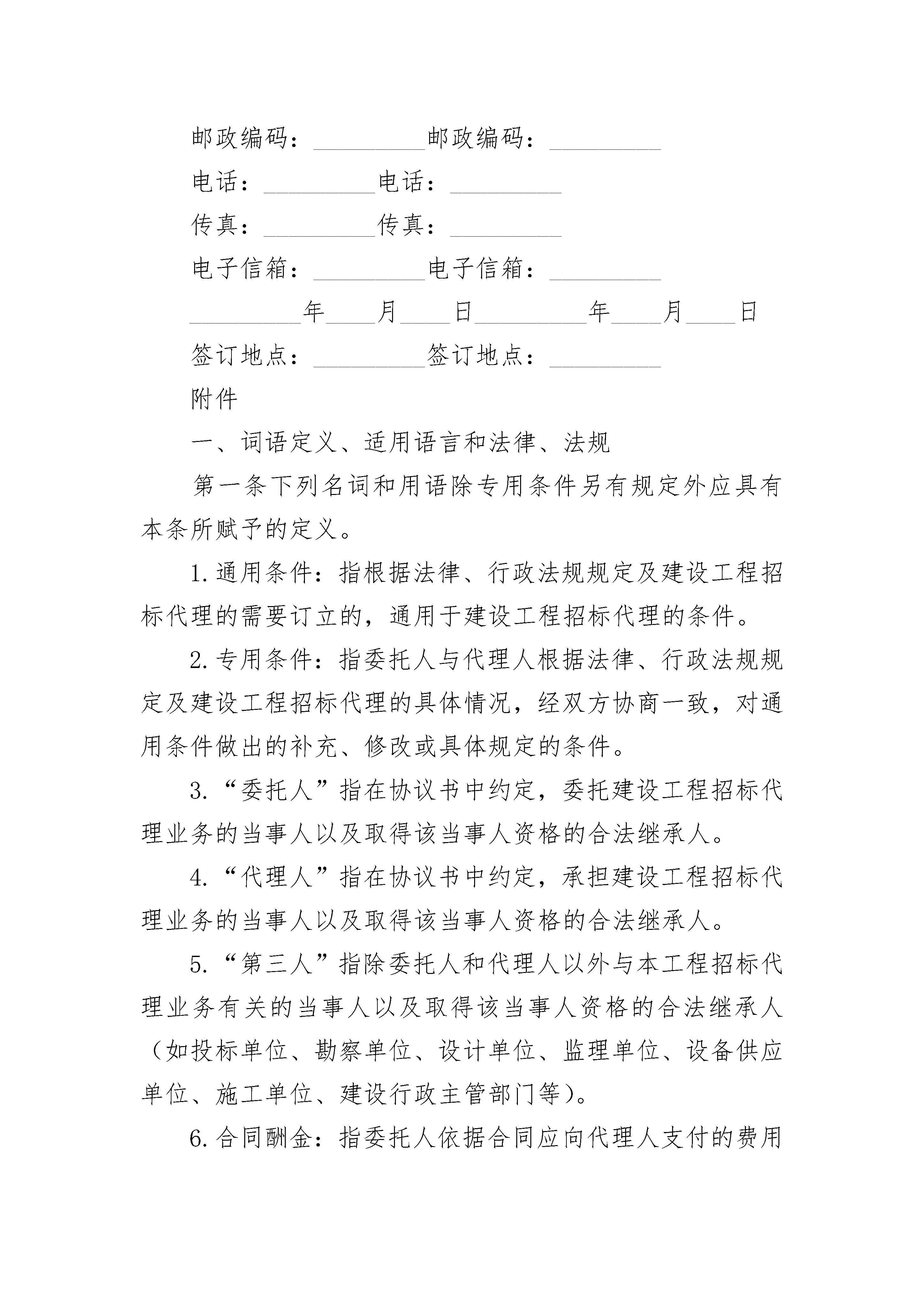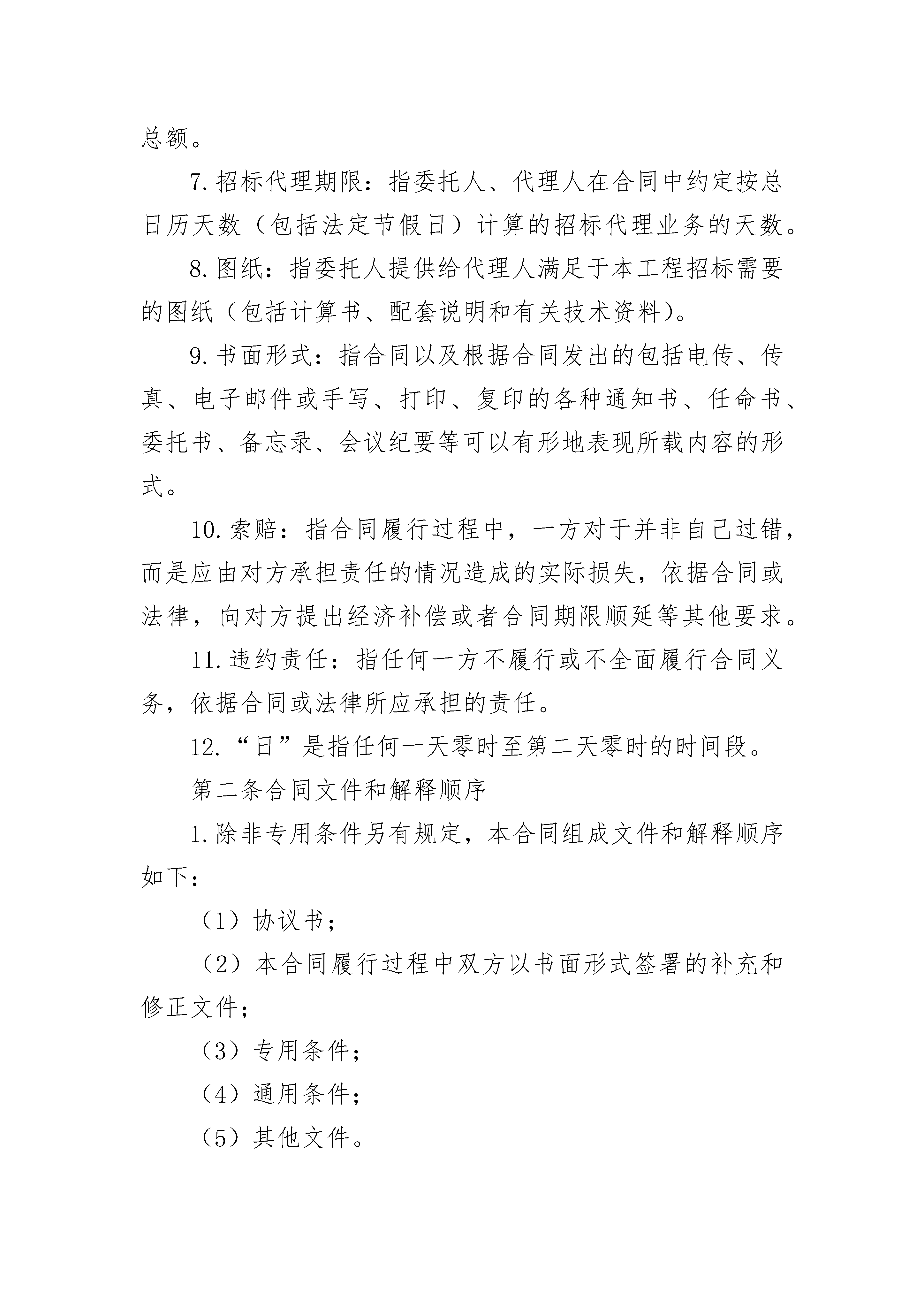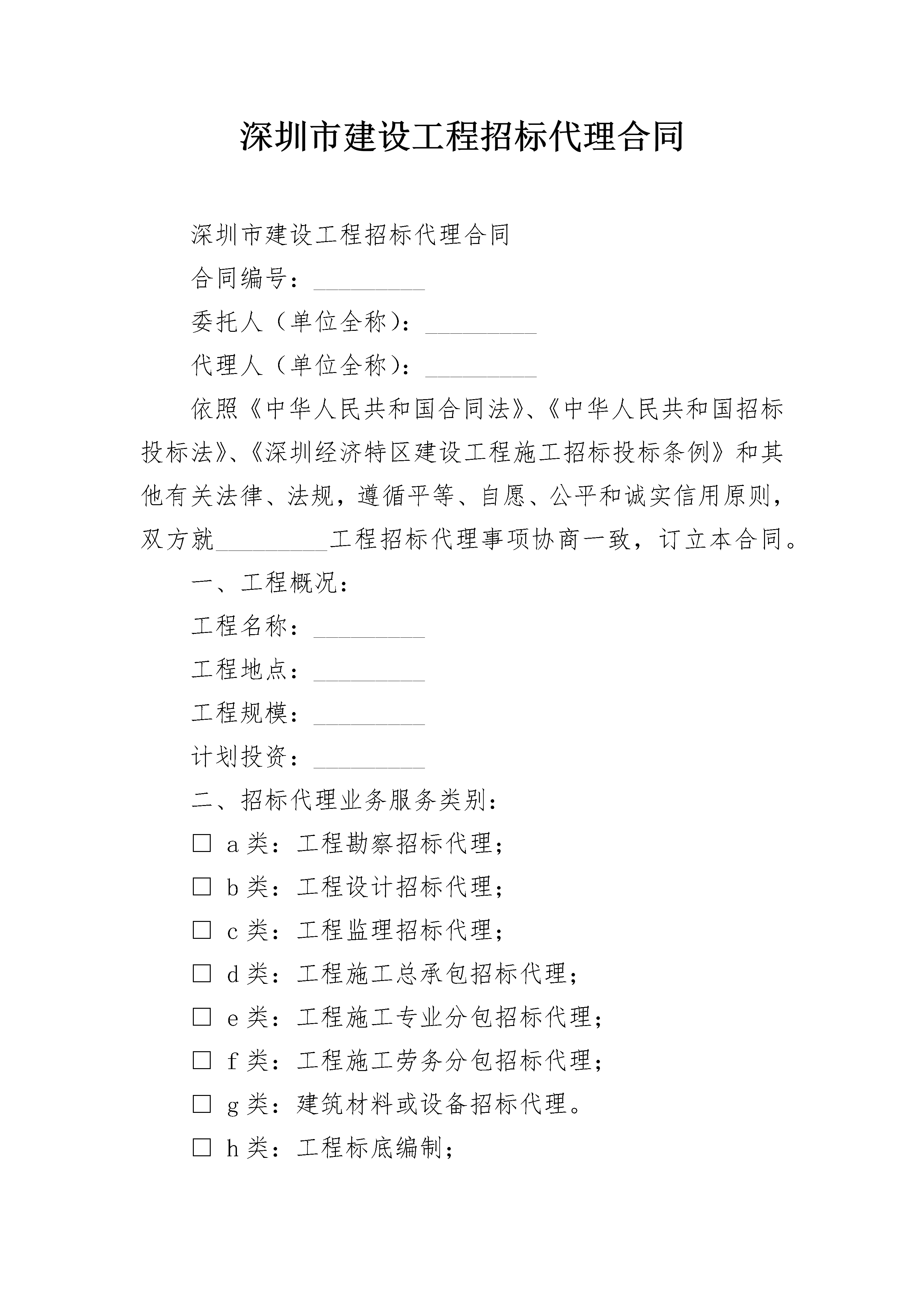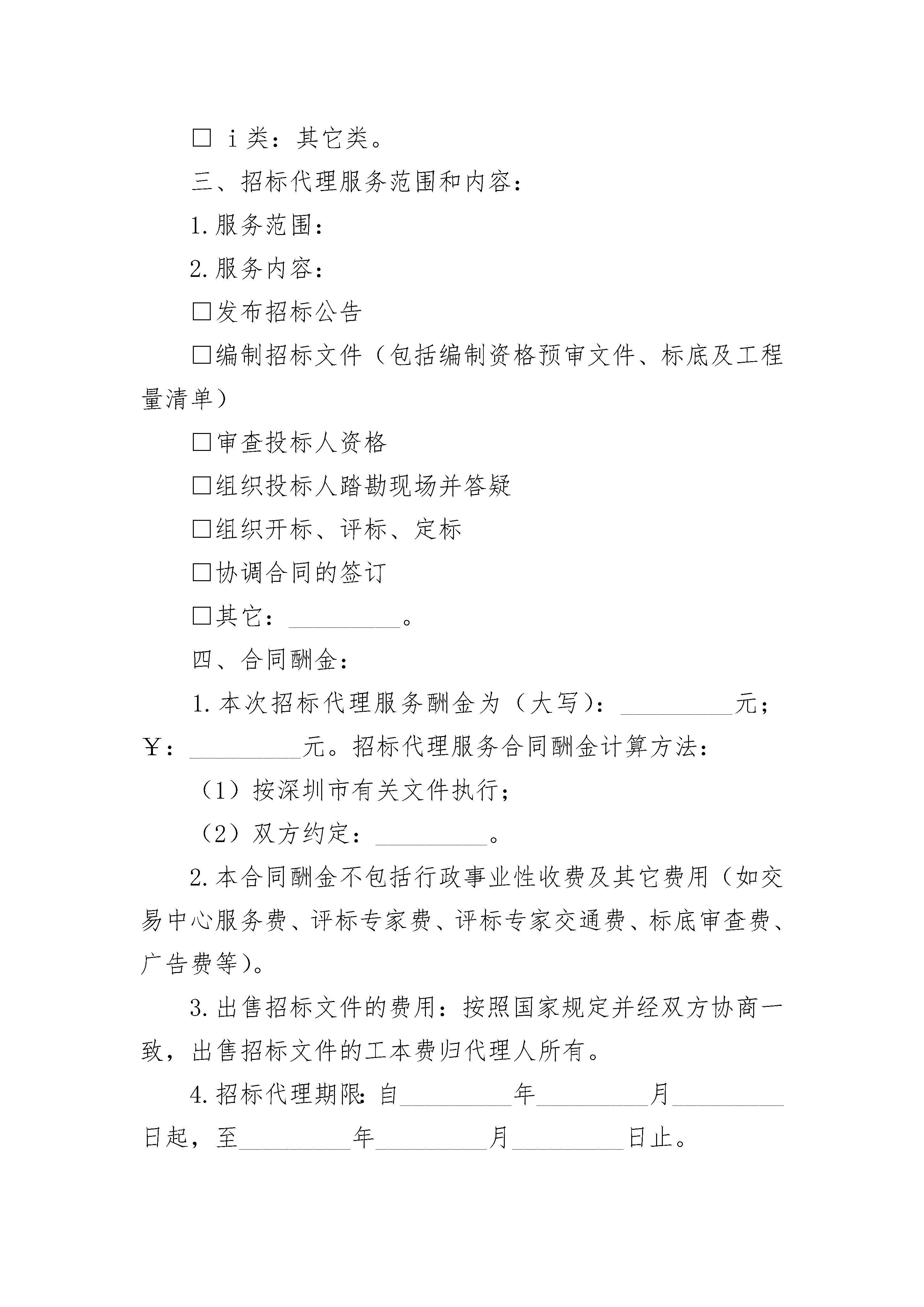 深圳市建设工程招标代理合同深圳市建设工程招标代理合同合同编号:_________委托人(单位全称):_________代理人(单位全称):_________依照《中华人民共和国合同法》、《中华人民共和国招标投标法》、《深圳经济特区建设工程施工招标投标条例》和其他有关法律、法规,遵循平等、自愿、公平和诚实信用原则,双方就_________工程招标代理事项协商一致,订立本合同。一、工程概况:工程名称:_________工程地点:_________工程规模:_________计划投资:_________二、招标代理业务服务类别:□a类:工程勘察招标代理;□b类:工程设计招标代理;□c类:工程监理招标代理;□d类:工程施工总承包招标代理;□e类:工程施工专业分包招标代理;□f类:工程施工劳务分包招标代理;□g类:建筑材料或设备招标代理。□h类:工程标底编制;□i类:其它类。三、招标代理服务范围和内容:1.服务范围:2.服务内容:□发布招标公告□编制招标文件(包括编制资格预审文件、标底及工程量清单)□审查投标人资格□组织投标人踏勘现场并答疑□组织开标、评标、定标□协调合同的签订□其它:_________。四、合同酬金:1.本次招标代理服务酬金为(大写):_________元;¥:_________元。招标代理服务合同酬金计算方法:(1)按深圳市有关文件执行;(2)双方约定:_________。2.本合同酬金不包括行政事业性收费及其它费用(如交易中心服务费、评标专家费、评标专家交通费、标底审查费、广告费等)。3.出售招标文件的费用:按照国家规定并经双方协商一致,出售招标文件的工本费归代理人所有。4.招标代理期限:自_________年_________月_________日起,至_________年_________月_________日止。五、下列文件均为本合同的组成部分:1.本合同协议书;2.本合同履行过程中双方以书面形式签署的补充和修正文件;3.本合同专用条件;4.本合同通用条件;5.其他文件。六、代理人承诺按照本合同的约定,承担本合同中约定范围内的工程招标代理业务服务。七、委托人承诺按照本合同约定的额度、币种、方式、期限向代理人支付酬金及其他应支付的款项。八、代理人在履行本工程招标代理业务过程中,委托人不得对代理人提出任何违反招标投标法律、法规、部门规章、行业标准、规范等的要求,否则代理人有权拒绝执行。九、本合同一式六份,具有同等法律效力,双方各执三份。委托人(盖章):_________代理人(盖章):_________法定代表人(签字):_________法定代表人(签字):_________委托代理人(签字):_________委托代理人(签字):_________住所:_________住所:_________开户银行:_________开户银行:_________帐号:_________帐号:_________邮政编码:_________邮政编码:_________电话:_________电话:_________传真:_________传真:_________电子信箱:_________电子信箱:__________________年____月____日_________年____月____日签订地点:_________签订地点:_________附件一、词语定义、适用语言和法律、法规第一条下列名词和用语除专用条件另有规定外应具有本条所赋予的定义。1.通用条件:指根据法律、行政法规规定及建设工程招标代理的需要订立的,通用于建设工程招标代理的条件。2.专用条件:指委托人与代理人根据法律、行政法规规定及建设工程招标代理的具体情况,经双方协商一致,对通用条件做出的补充、修改或具体规定的条件。3.“委托人”指在协议书中约定,委托建设工程招标代理业务的当事人以及取得该当事人资格的合法继承人。4.“代理人”指在协议书中约定,承担建设工程招标代理业务的当事人以及取得该当事人资格的合法继承人。5.“第三人”指除委托人和代理人以外与本工程招标代理业务有关的当事人以及取得该当事人资格的合法继承人(如投标单位、勘察单位、设计单位、监理单位、设备供应单位、施工单位、建设行政主管部门等)。6.合同酬金:指委托人依据合同应向代理人支付的费用总额。7.招标代理期限:指委托人、代理人在合同中约定按总日历天数(包括法定节假日)计算的招标代理业务的天数。8.图纸:指委托人提供给代理人满足于本工程招标需要的图纸(包括计算书、配套说明和有关技术资料)。9.书面形式:指合同以及根据合同发出的包括电传、传真、电子邮件或手写、打印、复印的各种通知书、任命书、委托书、备忘录、会议纪要等可以有形地表现所载内容的形式。10.索赔:指合同履行过程中,一方对于并非自己过错,