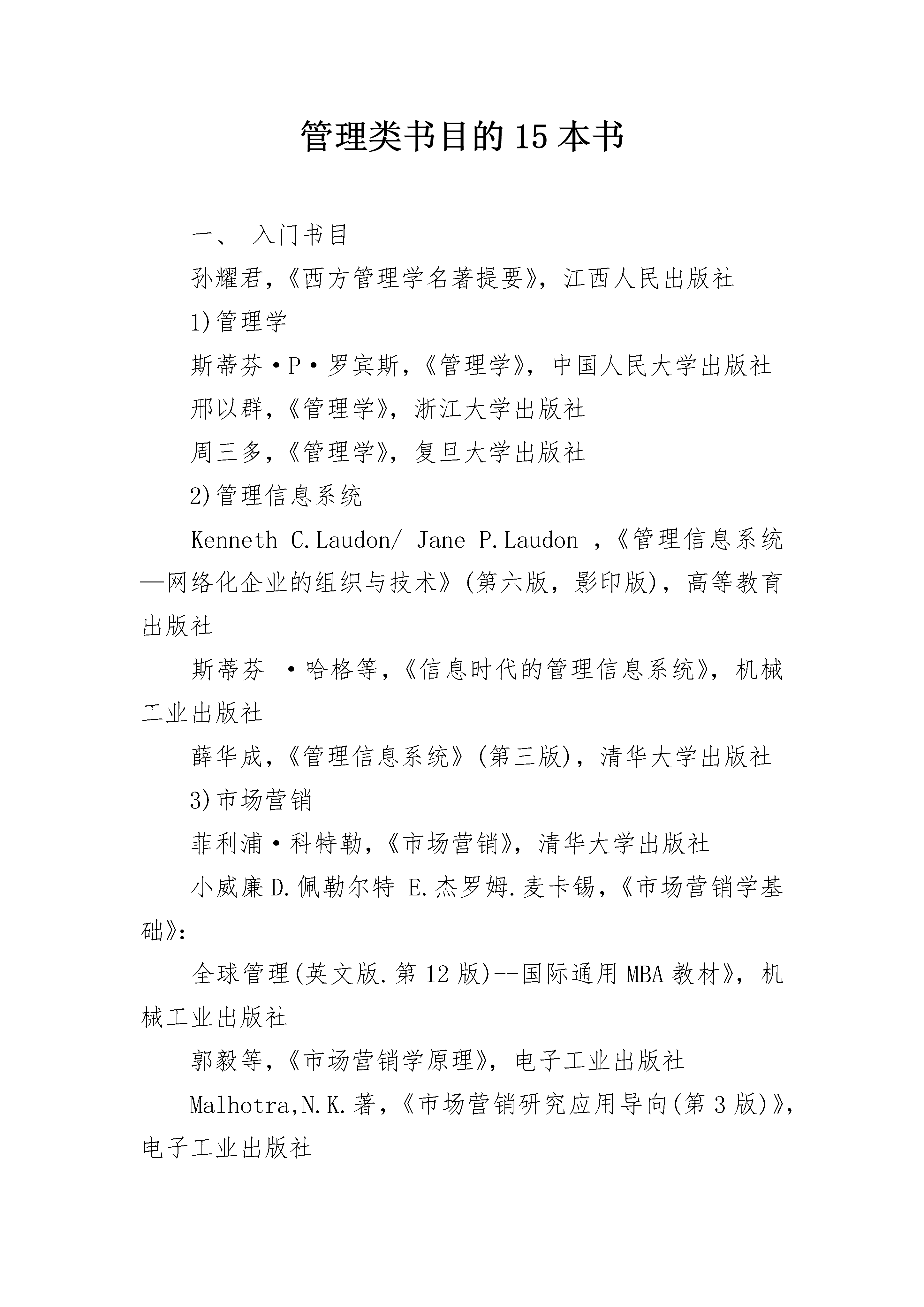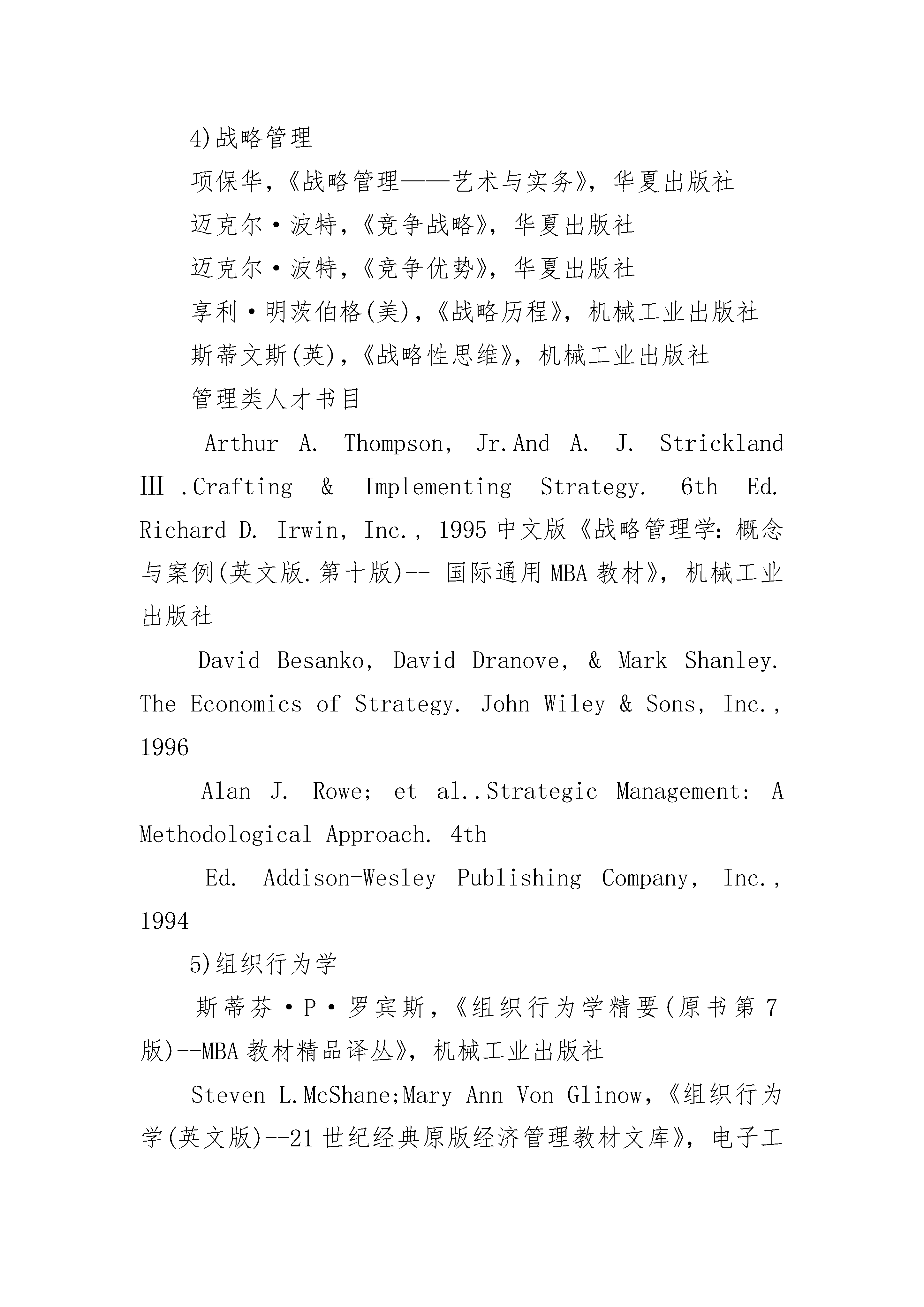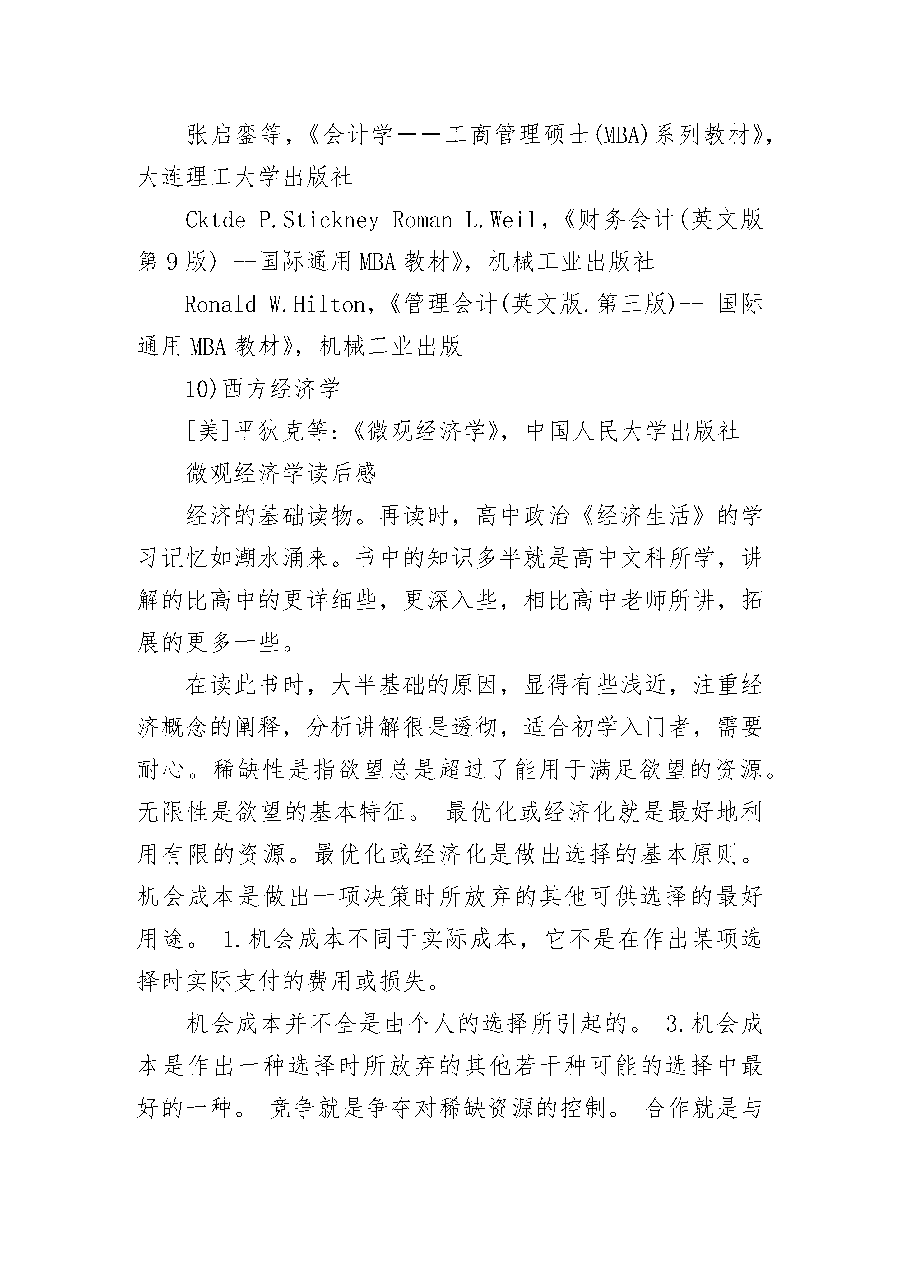 管理类书目的15本书一、入门书目孙耀君,《西方管理学名著提要》,江西人民出版社1)管理学斯蒂芬·P·罗宾斯,《管理学》,中国人民大学出版社邢以群,《管理学》,浙江大学出版社周三多,《管理学》,复旦大学出版社2)管理信息系统KennethC.Laudon/JaneP.Laudon,《管理信息系统—网络化企业的组织与技术》(第六版,影印版),高等教育出版社斯蒂芬·哈格等,《信息时代的管理信息系统》,机械工业出版社薛华成,《管理信息系统》(第三版),清华大学出版社3)市场营销菲利浦·科特勒,《市场营销》,清华大学出版社小威廉D.佩勒尔特E.杰罗姆.麦卡锡,《市场营销学基础》:全球管理(英文版.第12版)--国际通用MBA教材》,机械工业出版社郭毅等,《市场营销学原理》,电子工业出版社Malhotra,N.K.著,《市场营销研究应用导向(第3版)》,电子工业出版社4)战略管理项保华,《战略管理——艺术与实务》,华夏出版社迈克尔·波特,《竞争战略》,华夏出版社迈克尔·波特,《竞争优势》,华夏出版社享利·明茨伯格(美),《战略历程》,机械工业出版社斯蒂文斯(英),《战略性思维》,机械工业出版社管理类人才书目ArthurA.Thompson,Jr.AndA.J.StricklandⅢ.Crafting&ImplementingStrategy.6thEd.RichardD.Irwin,Inc.,1995中文版《战略管理学:概念与案例(英文版.第十版)--国际通用MBA教材》,机械工业出版社DavidBesanko,DavidDranove,&MarkShanley.TheEconomicsofStrategy.JohnWiley&Sons,Inc.,1996AlanJ.Rowe;etal..StrategicManagement:AMethodologicalApproach.4thEd.Addison-WesleyPublishingCompany,Inc.,19945)组织行为学斯蒂芬·P·罗宾斯,《组织行为学精要(原书第7版)--MBA教材精品译丛》,机械工业出版社StevenL.McShane;MaryAnnVonGlinow,《组织行为学(英文版)--21世纪经典原版经济管理教材文库》,电子工业出版社卢盛忠等,《组织行为学:理论与实践》,浙江教育出版社6)人力资源管理雷蒙德.A.诺伊,约翰.霍伦拜克,拜雷.格哈特,帕特雷克.莱特,《人力资源管理——赢得竞争优势》(第三版)中国人民大学出版社英文版《HumanResourceManagement:GainingaCompetitiveAdvantage》,清华大学出版社约翰.M.伊万切维奇,《人力资源管理(英文版.原书第8版)--国际通用MBA教材》,机械工业出版社LuisR.Gomez-Mejia,DavidB.Balkin,RobertL.Cardy,《管理人力资源ManagingHumanResources》(英文版第三版),北京大学出版社、培生教育出版集团7)财务管理斯蒂芬·罗丝,《公司理财》,机械工业出版社8)管理统计DavidR.AndersonDennisJ.SweeneyThomasA.William,《商务与经济统计(第七版)--经济教材译丛》,机械工业出版社DavidR.Anderson;DennisJ.Sweeney;ThomasA.William,《商务与经济统计(英文版.第8版)--21世纪经典原版经济管理教材文库》,机械工业出版9)会计学张启銮等,《会计学――工商管理硕士(MBA)系列教材》,大连理工大学出版社CktdeP.StickneyRomanL.Weil,《财务会计(英文版第9版)--国际通用MBA教材》,机械工业出版社RonaldW.Hilton,《管理会计(英文版.第三版)--国际通用MBA教材》,机械工业出版10)西方经济学[美]平狄克等:《微观经济学》,中国人民大学出版社微观经济学读后感经济的基础读物。再读时,高中政治《经济生活》的学习记忆如潮水涌来。书中的知识多半就是高中文科所学,讲解的比高中的更详细些,更深入些,相比高中老师所讲,拓展的更多一些。在读此书时,大半基础的原因,显得有些浅近,注重经济概念的阐释,分析讲解很是透彻,适合初学入门者,需要耐心。稀缺性是指欲望总是超过了能用于满足欲望的资源。无限性是欲望的基本特征。最优化或经济化就是最好地利用有限的资源。最优化或经济化是做出选择的基本原则。机会成本是做出一项决策时所放弃的其他可供选择的最好用途。1.机会成本不同于实际成本,它不是在作出某项选择时实际支付的费用或损失。机会成本并不全是由个人的选择所引起的。3.机会成本是作出一种选择时所放弃的其他若干种可能的选择中最好的一种。竞争就是
