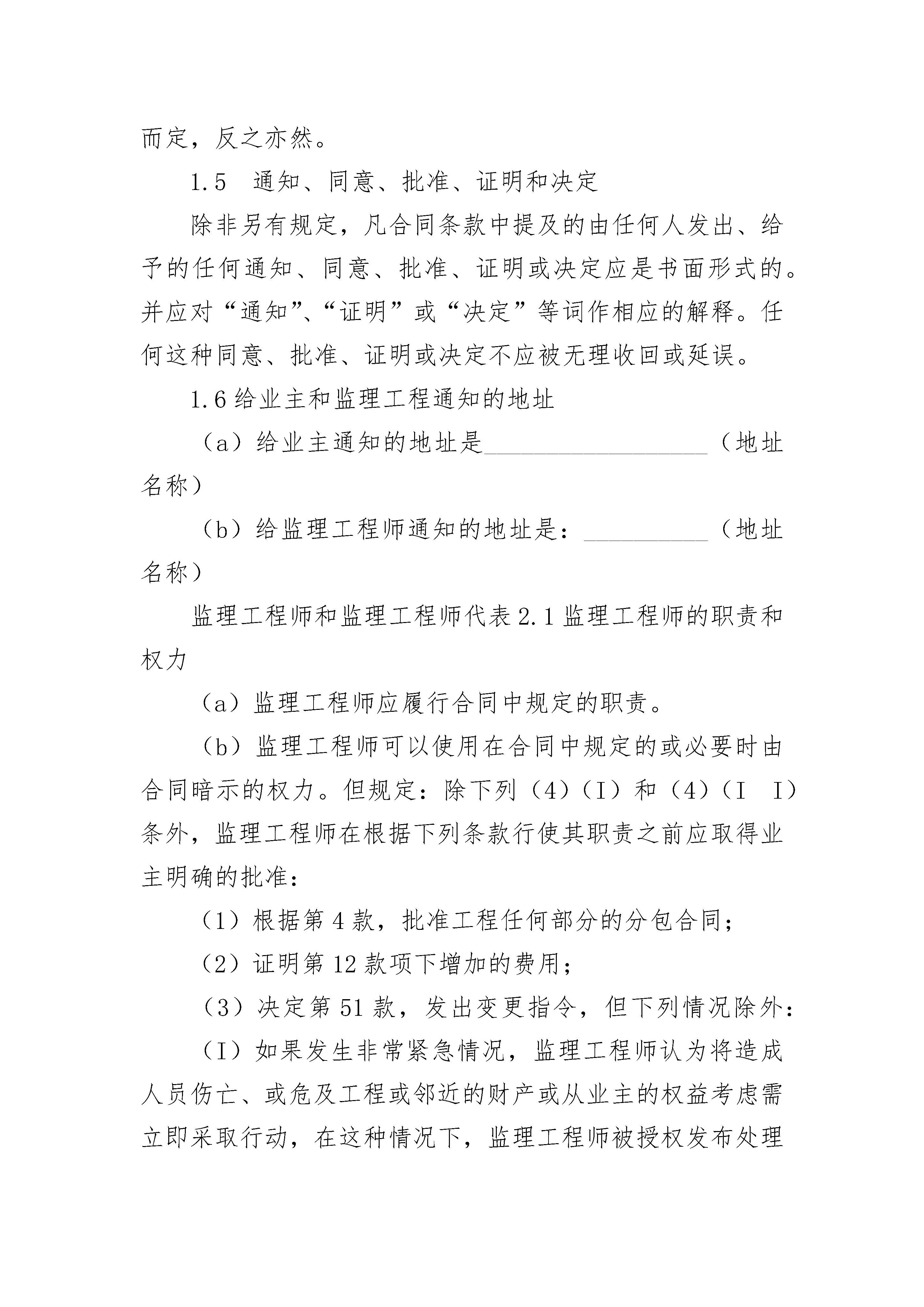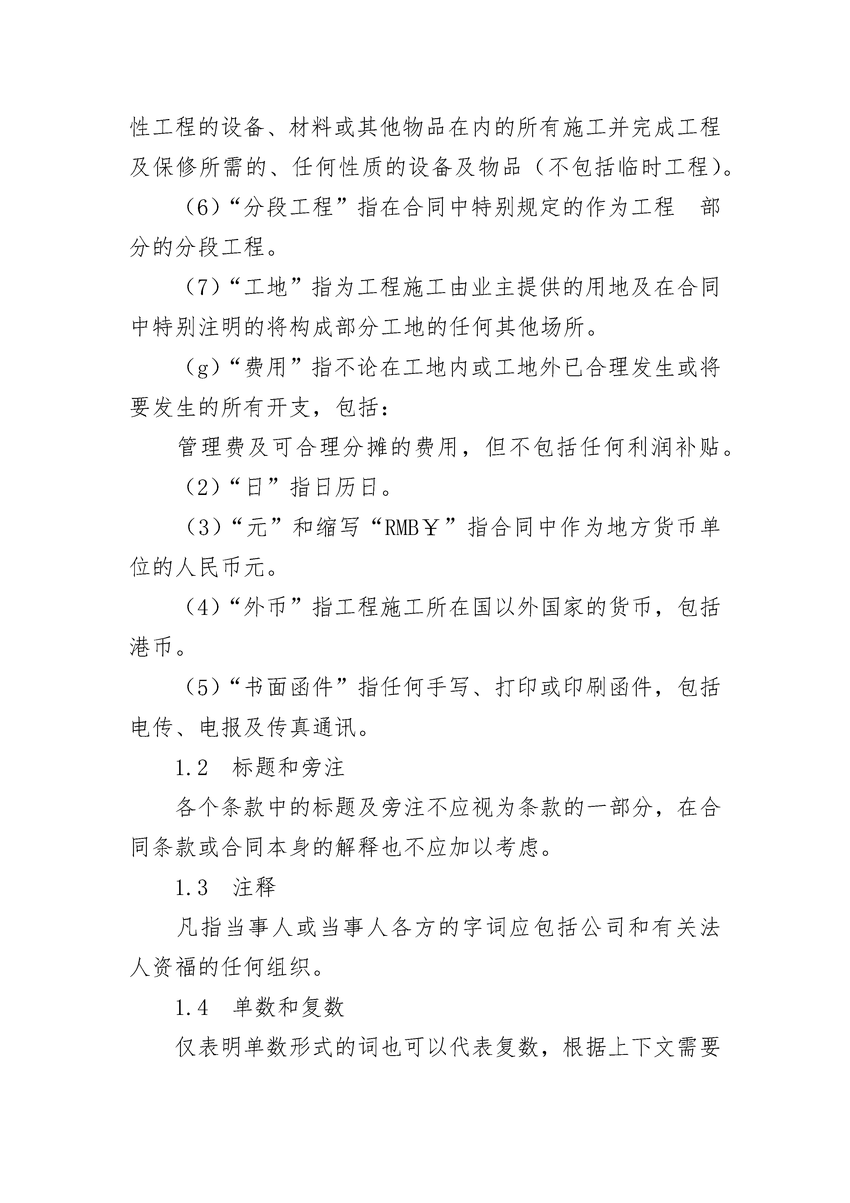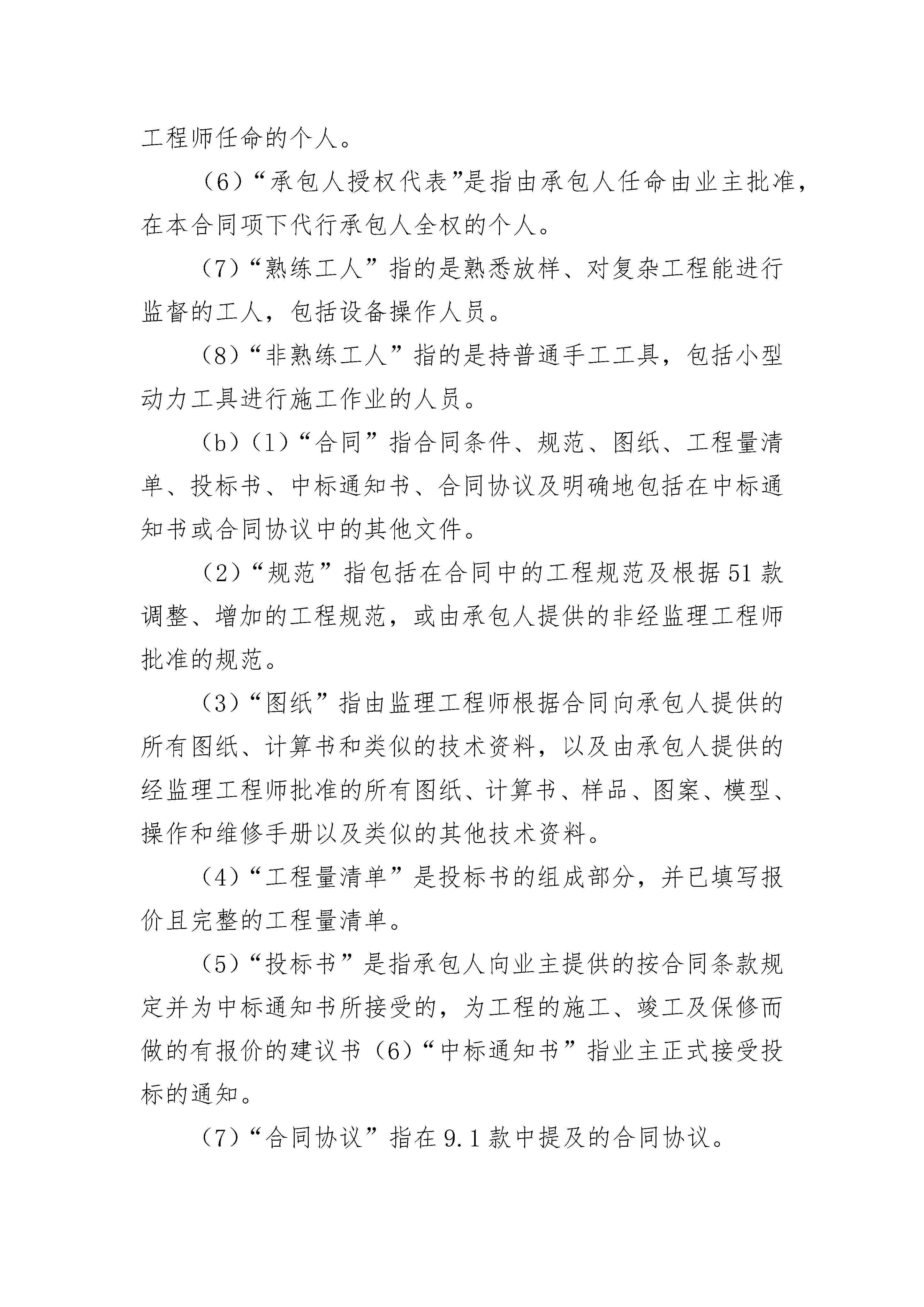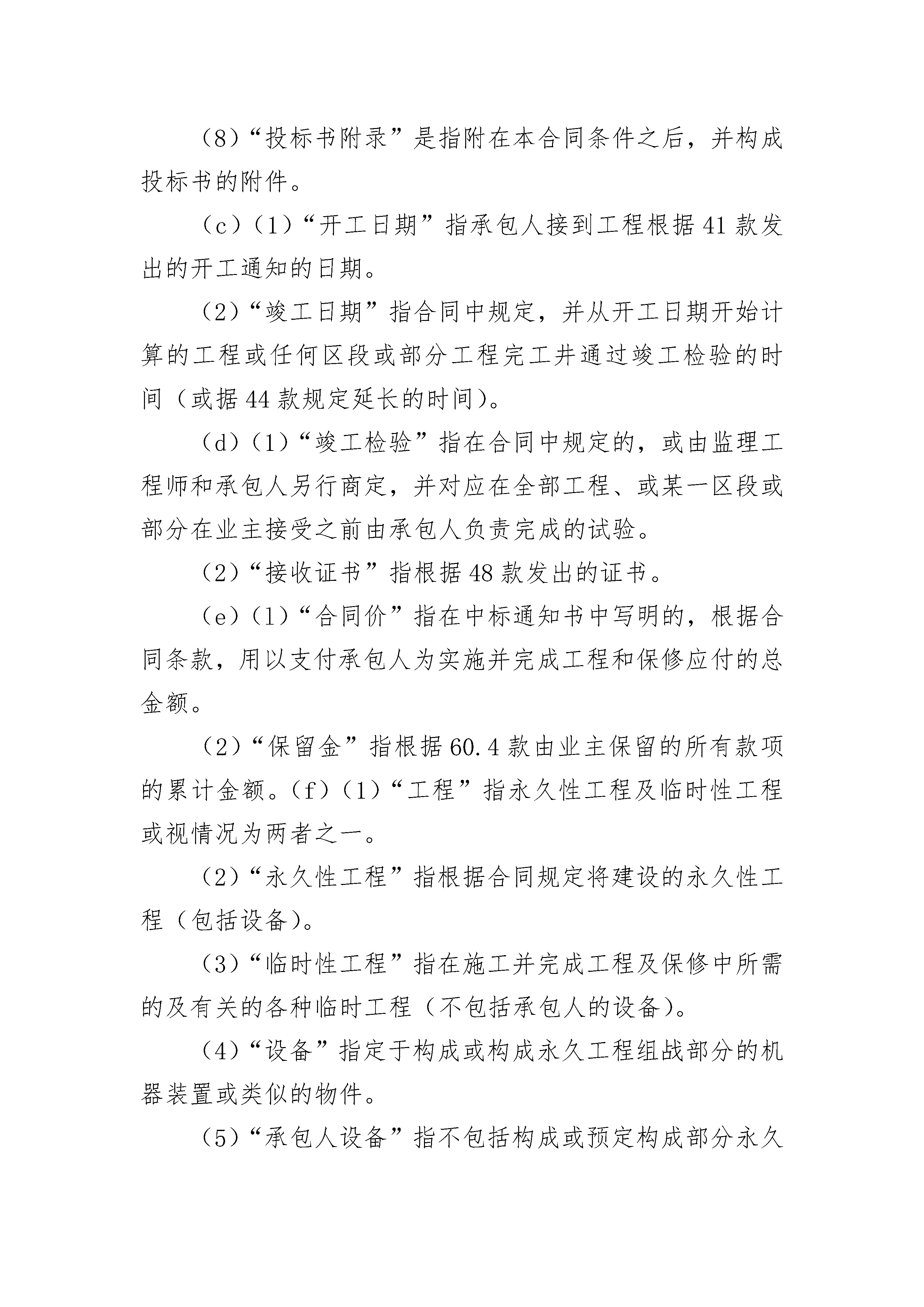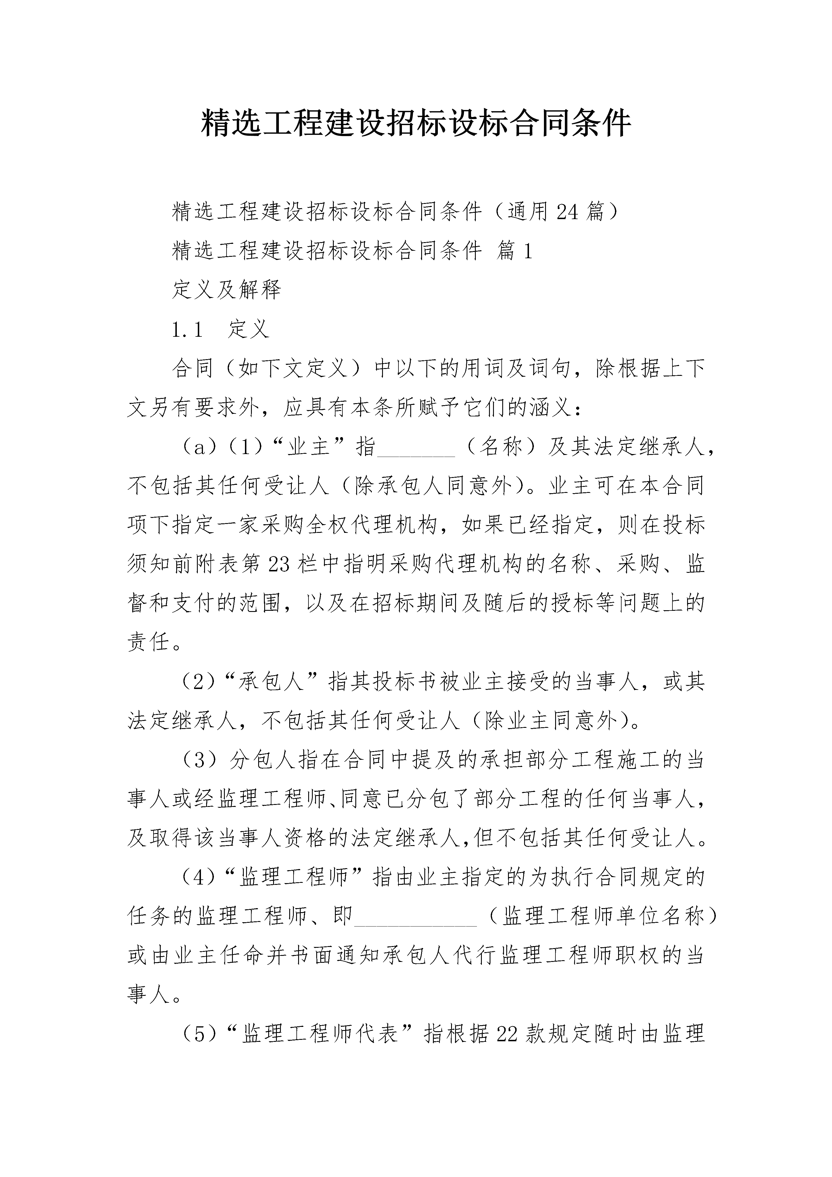 精选工程建设招标设标合同条件精选工程建设招标设标合同条件(通用24篇)精选工程建设招标设标合同条件篇1定义及解释1.1定义合同(如下文定义)中以下的用词及词句,除根据上下文另有要求外,应具有本条所赋予它们的涵义:(a)(1)“业主”指_______(名称)及其法定继承人,不包括其任何受让人(除承包人同意外)。业主可在本合同项下指定一家采购全权代理机构,如果已经指定,则在投标须知前附表第23栏中指明采购代理机构的名称、采购、监督和支付的范围,以及在招标期间及随后的授标等问题上的责任。(2)“承包人”指其投标书被业主接受的当事人,或其法定继承人,不包括其任何受让人(除业主同意外)。(3)分包人指在合同中提及的承担部分工程施工的当事人或经监理工程师、同意已分包了部分工程的任何当事人,及取得该当事人资格的法定继承人,但不包括其任何受让人。(4)“监理工程师”指由业主指定的为执行合同规定的任务的监理工程师、即___________(监理工程师单位名称)或由业主任命并书面通知承包人代行监理工程师职权的当事人。(5)“监理工程师代表”指根据22款规定随时由监理工程师任命的个人。(6)“承包人授权代表”是指由承包人任命由业主批准,在本合同项下代行承包人全权的个人。(7)“熟练工人”指的是熟悉放样、对复杂工程能进行监督的工人,包括设备操作人员。(8)“非熟练工人”指的是持普通手工工具,包括小型动力工具进行施工作业的人员。(b)(l)“合同”指合同条件、规范、图纸、工程量清单、投标书、中标通知书、合同协议及明确地包括在中标通知书或合同协议中的其他文件。(2)“规范”指包括在合同中的工程规范及根据51款调整、增加的工程规范,或由承包人提供的非经监理工程师批准的规范。(3)“图纸”指由监理工程师根据合同向承包人提供的所有图纸、计算书和类似的技术资料,以及由承包人提供的经监理工程师批准的所有图纸、计算书、样品、图案、模型、操作和维修手册以及类似的其他技术资料。(4)“工程量清单”是投标书的组成部分,并已填写报价且完整的工程量清单。(5)“投标书”是指承包人向业主提供的按合同条款规定并为中标通知书所接受的,为工程的施工、竣工及保修而做的有报价的建议书(6)“中标通知书”指业主正式接受投标的通知。(7)“合同协议”指在9.1款中提及的合同协议。(8)“投标书附录”是指附在本合同条件之后,并构成投标书的附件。(c)(1)“开工日期”指承包人接到工程根据41款发出的开工通知的日期。(2)“竣工日期”指合同中规定,并从开工日期开始计算的工程或任何区段或部分工程完工井通过竣工检验的时间(或据44款规定延长的时间)。(d)(1)“竣工检验”指在合同中规定的,或由监理工程师和承包人另行商定,并对应在全部工程、或某一区段或部分在业主接受之前由承包人负责完成的试验。(2)“接收证书”指根据48款发出的证书。(e)(l)“合同价”指在中标通知书中写明的,根据合同条款,用以支付承包人为实施并完成工程和保修应付的总金额。(2)“保留金”指根据60.4款由业主保留的所有款项的累计金额。(f)(1)“工程”指永久性工程及临时性工程或视情况为两者之一。(2)“永久性工程”指根据合同规定将建设的永久性工程(包括设备)。(3)“临时性工程”指在施工并完成工程及保修中所需的及有关的各种临时工程(不包括承包人的设备)。(4)“设备”指定于构成或构成永久工程组战部分的机器装置或类似的物件。(5)“承包人设备”指不包括构成或预定构成部分永久性工程的设备、材料或其他物品在内的所有施工并完成工程及保修所需的、任何性质的设备及物品(不包括临时工程)。(6)“分段工程”指在合同中特别规定的作为工程部分的分段工程。(7)“工地”指为工程施工由业主提供的用地及在合同中特别注明的将构成部分工地的任何其他场所。(g)“费用”指不论在工地内或工地外已合理发生或将要发生的所有开支,包括:管理费及可合理分摊的费用,但不包括任何利润补贴。(2)“日”指日历日。(3)“元”和缩写“RMB¥”指合同中作为地方货币单位的人民币元。(4)“外币”指工程施工所在国以外国家的货币,包括港币。(5)“书面函件”指任何手写、打印或印刷函件,包括电传、电报及传真通讯。1.2标题和旁注各个条款中的标题及旁注不应视为条款的一部分,在合同条款或合同本身的解释也不应加以考虑。1.3注释凡指当事人或当事人各方的字词应包括公司和有关法人资福的任何组织。1.4单数和复数仅表明单数形式的词也可以代表复数,根据上下文需要而定,反之亦然。1.5通知、同意、批准、证明和决定除非另有规定,凡合同条款中提及的由任何人发出、给予的任何通知、同意、批准、证明或决定应是书面形式的。并应对“通知”、“证明”或“决定”等词作相应的解释。任何这种同意、批准、