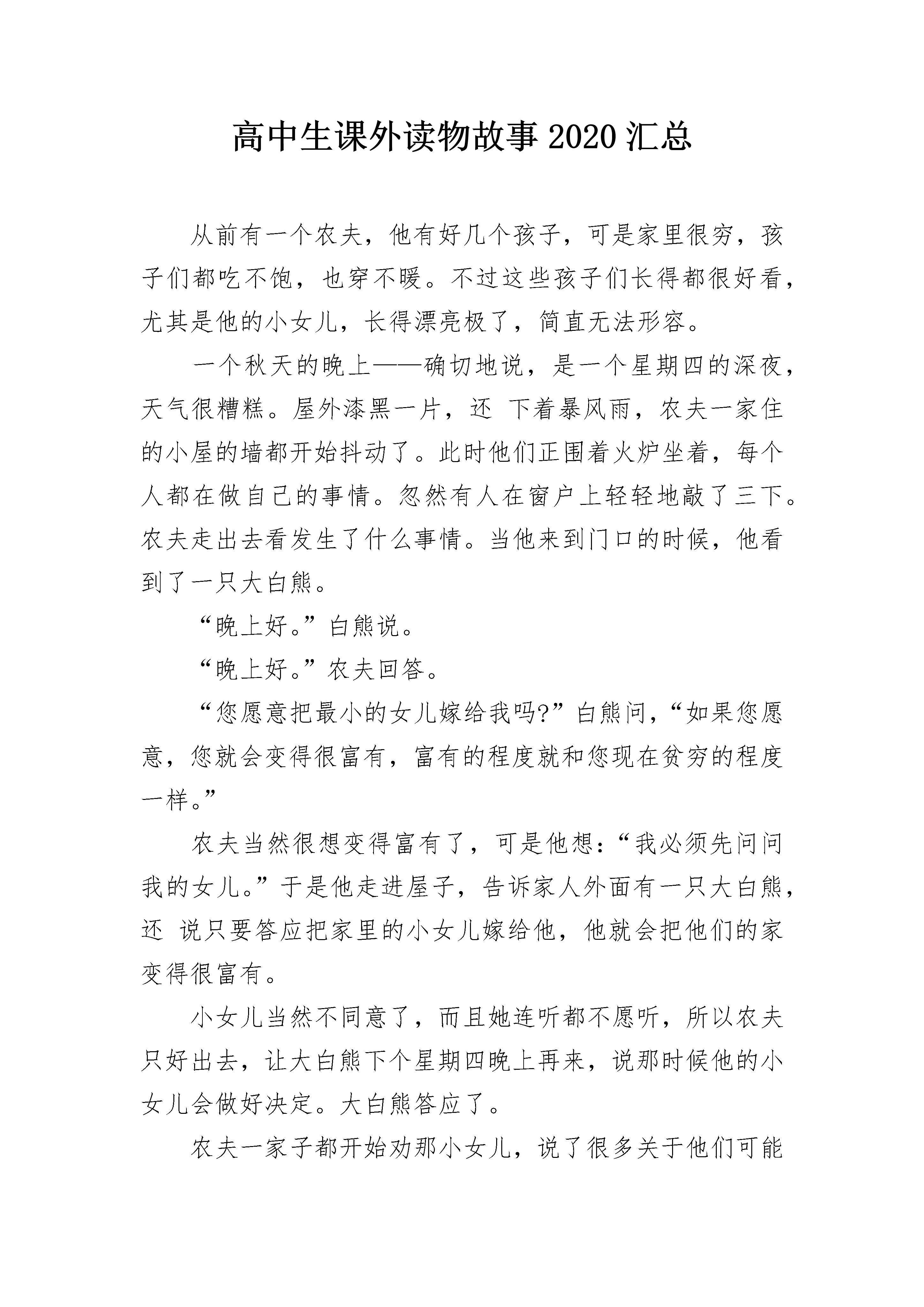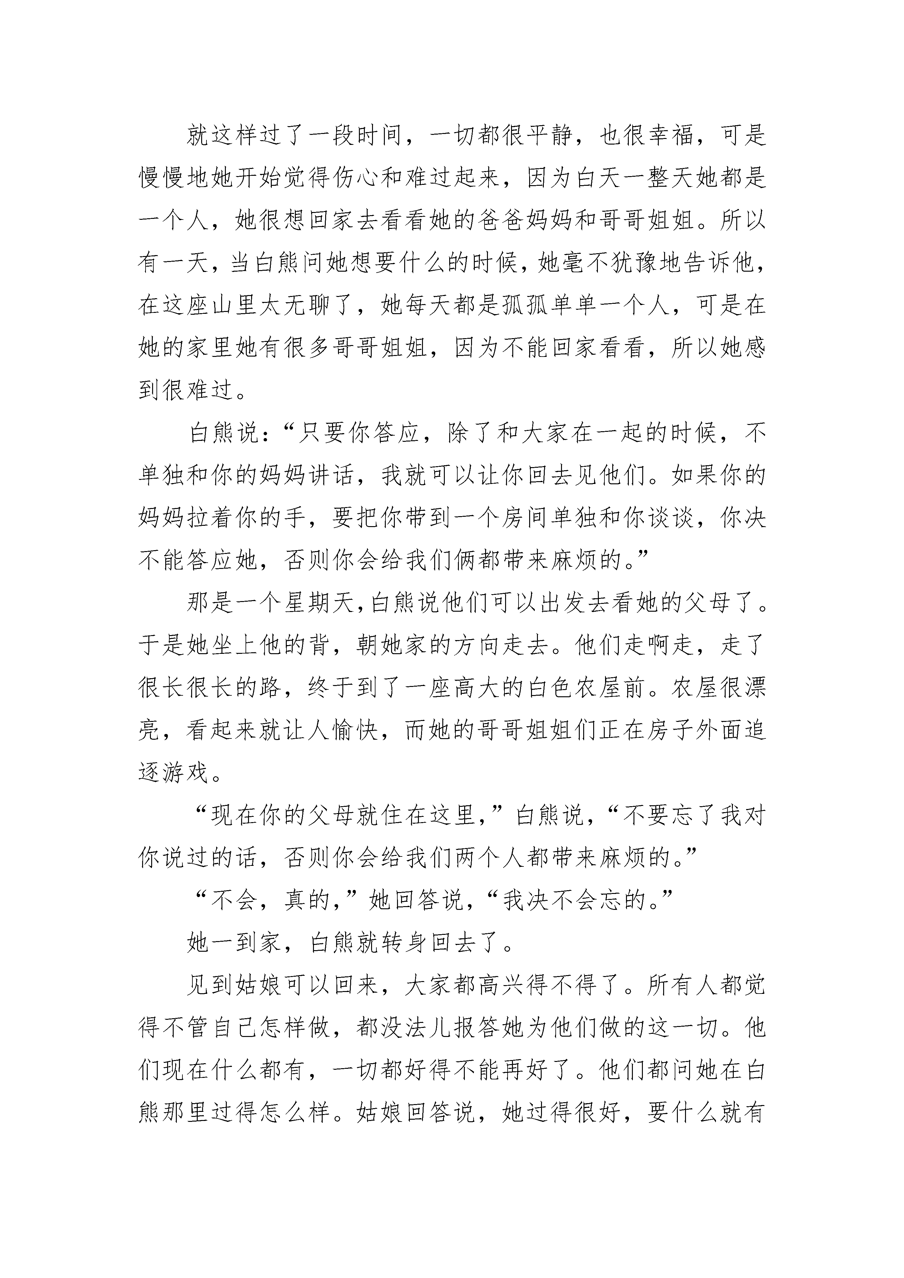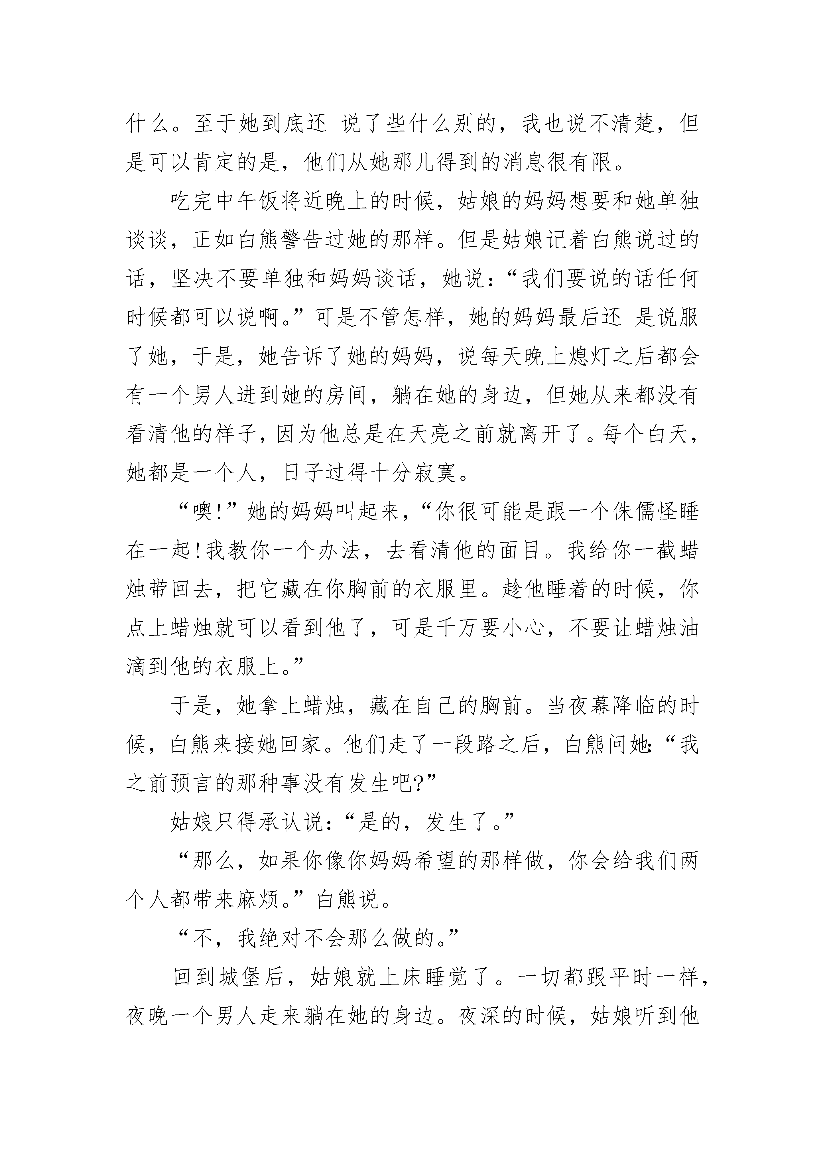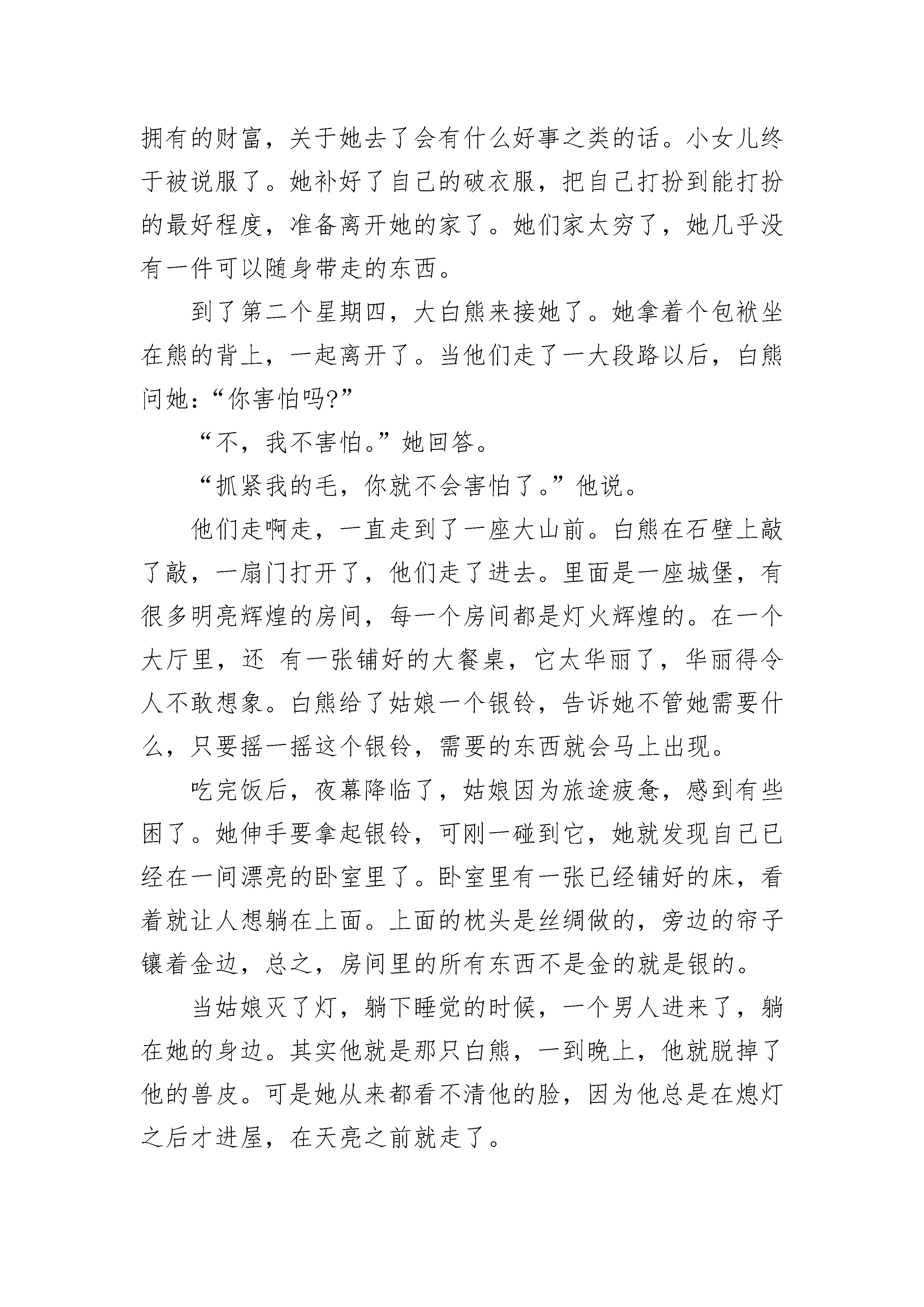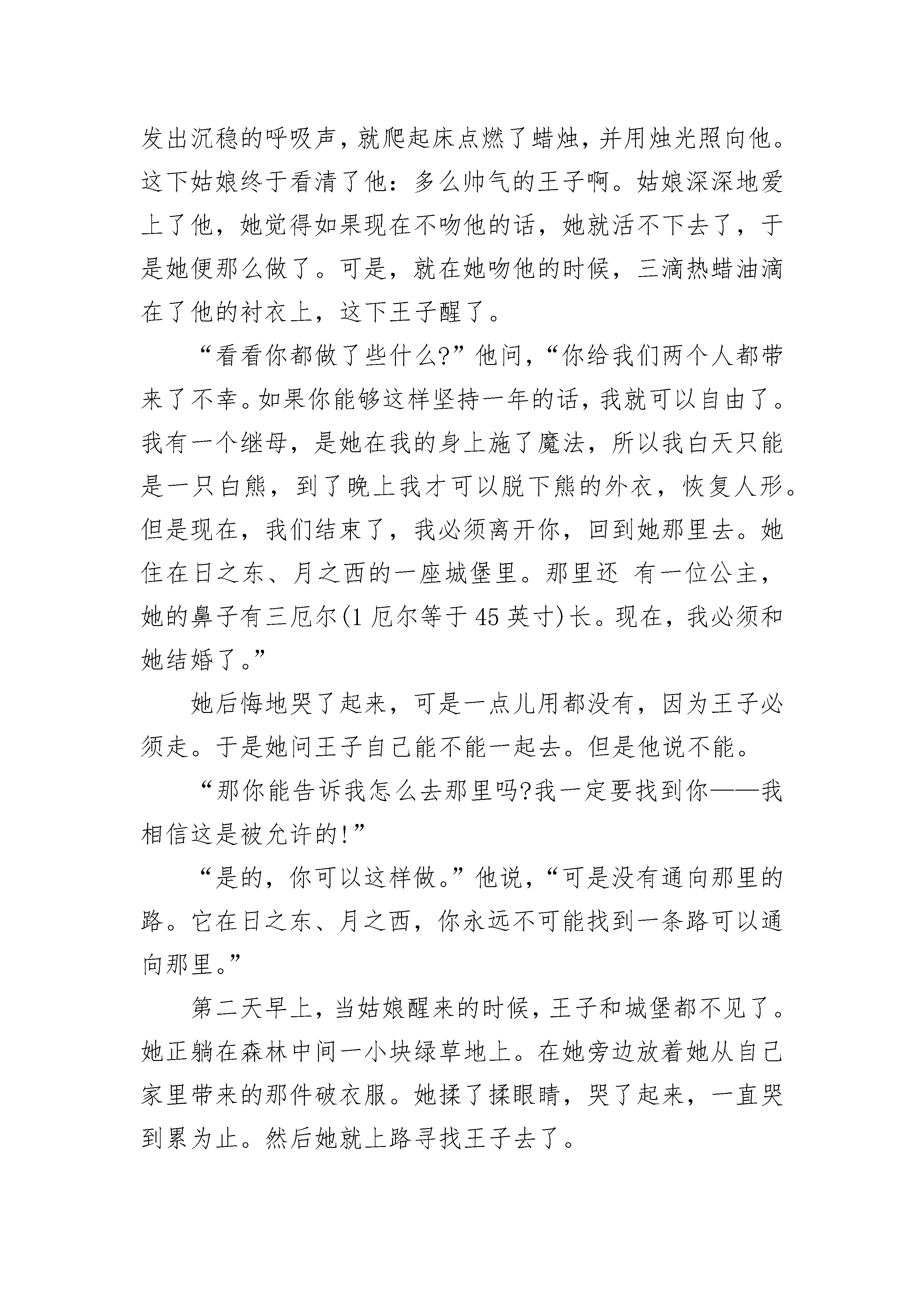 高中生课外读物故事2020汇总从前有一个农夫,他有好几个孩子,可是家里很穷,孩子们都吃不饱,也穿不暖。不过这些孩子们长得都很好看,尤其是他的小女儿,长得漂亮极了,简直无法形容。一个秋天的晚上——确切地说,是一个星期四的深夜,天气很糟糕。屋外漆黑一片,还下着暴风雨,农夫一家住的小屋的墙都开始抖动了。此时他们正围着火炉坐着,每个人都在做自己的事情。忽然有人在窗户上轻轻地敲了三下。农夫走出去看发生了什么事情。当他来到门口的时候,他看到了一只大白熊。“晚上好。”白熊说。“晚上好。”农夫回答。“您愿意把最小的女儿嫁给我吗?”白熊问,“如果您愿意,您就会变得很富有,富有的程度就和您现在贫穷的程度一样。”农夫当然很想变得富有了,可是他想:“我必须先问问我的女儿。”于是他走进屋子,告诉家人外面有一只大白熊,还说只要答应把家里的小女儿嫁给他,他就会把他们的家变得很富有。小女儿当然不同意了,而且她连听都不愿听,所以农夫只好出去,让大白熊下个星期四晚上再来,说那时候他的小女儿会做好决定。大白熊答应了。农夫一家子都开始劝那小女儿,说了很多关于他们可能拥有的财富,关于她去了会有什么好事之类的话。小女儿终于被说服了。她补好了自己的破衣服,把自己打扮到能打扮的最好程度,准备离开她的家了。她们家太穷了,她几乎没有一件可以随身带走的东西。到了第二个星期四,大白熊来接她了。她拿着个包袱坐在熊的背上,一起离开了。当他们走了一大段路以后,白熊问她:“你害怕吗?”“不,我不害怕。”她回答。“抓紧我的毛,你就不会害怕了。”他说。他们走啊走,一直走到了一座大山前。白熊在石壁上敲了敲,一扇门打开了,他们走了进去。里面是一座城堡,有很多明亮辉煌的房间,每一个房间都是灯火辉煌的。在一个大厅里,还有一张铺好的大餐桌,它太华丽了,华丽得令人不敢想象。白熊给了姑娘一个银铃,告诉她不管她需要什么,只要摇一摇这个银铃,需要的东西就会马上出现。吃完饭后,夜幕降临了,姑娘因为旅途疲惫,感到有些困了。她伸手要拿起银铃,可刚一碰到它,她就发现自己已经在一间漂亮的卧室里了。卧室里有一张已经铺好的床,看着就让人想躺在上面。上面的枕头是丝绸做的,旁边的帘子镶着金边,总之,房间里的所有东西不是金的就是银的。当姑娘灭了灯,躺下睡觉的时候,一个男人进来了,躺在她的身边。其实他就是那只白熊,一到晚上,他就脱掉了他的兽皮。可是她从来都看不清他的脸,因为他总是在熄灯之后才进屋,在天亮之前就走了。就这样过了一段时间,一切都很平静,也很幸福,可是慢慢地她开始觉得伤心和难过起来,因为白天一整天她都是一个人,她很想回家去看看她的爸爸妈妈和哥哥姐姐。所以有一天,当白熊问她想要什么的时候,她毫不犹豫地告诉他,在这座山里太无聊了,她每天都是孤孤单单一个人,可是在她的家里她有很多哥哥姐姐,因为不能回家看看,所以她感到很难过。白熊说:“只要你答应,除了和大家在一起的时候,不单独和你的妈妈讲话,我就可以让你回去见他们。如果你的妈妈拉着你的手,要把你带到一个房间单独和你谈谈,你决不能答应她,否则你会给我们俩都带来麻烦的。”那是一个星期天,白熊说他们可以出发去看她的父母了。于是她坐上他的背,朝她家的方向走去。他们走啊走,走了很长很长的路,终于到了一座高大的白色农屋前。农屋很漂亮,看起来就让人愉快,而她的哥哥姐姐们正在房子外面追逐游戏。“现在你的父母就住在这里,”白熊说,“不要忘了我对你说过的话,否则你会给我们两个人都带来麻烦的。”“不会,真的,”她回答说,“我决不会忘的。”她一到家,白熊就转身回去了。见到姑娘可以回来,大家都高兴得不得了。所有人都觉得不管自己怎样做,都没法儿报答她为他们做的这一切。他们现在什么都有,一切都好得不能再好了。他们都问她在白熊那里过得怎么样。姑娘回答说,她过得很好,要什么就有什么。至于她到底还说了些什么别的,我也说不清楚,但是可以肯定的是,他们从她那儿得到的消息很有限。吃完中午饭将近晚上的时候,姑娘的妈妈想要和她单独谈谈,正如白熊警告过她的那样。但是姑娘记着白熊说过的话,坚决不要单独和妈妈谈话,她说:“我们要说的话任何时候都可以说啊。”可是不管怎样,她的妈妈最后还是说服了她,于是,她告诉了她的妈妈,说每天晚上熄灯之后都会有一个男人进到她的房间,躺在她的身边,但她从来都没有看清他的样子,因为他总是在天亮之前就离开了。每个白天,她都是一个人,日子过得十分寂寞。“噢!”她的妈妈叫起来,“你很可能是跟一个侏儒怪睡在一起!我教你一个办法,去看清他的面目。我给你一截蜡烛带回去,把它藏在你胸前的衣服里。趁他睡着的时候,你点上蜡烛就可以看到他了,可是千万要小心,不要让蜡烛油滴到他的衣服上。”于是,她拿上蜡烛,藏在自己的胸前。当夜幕降临的时候,白熊来接她回家。他们走了一段路之后,白熊问她:“我之前预言的那种事没有发生吧?”姑