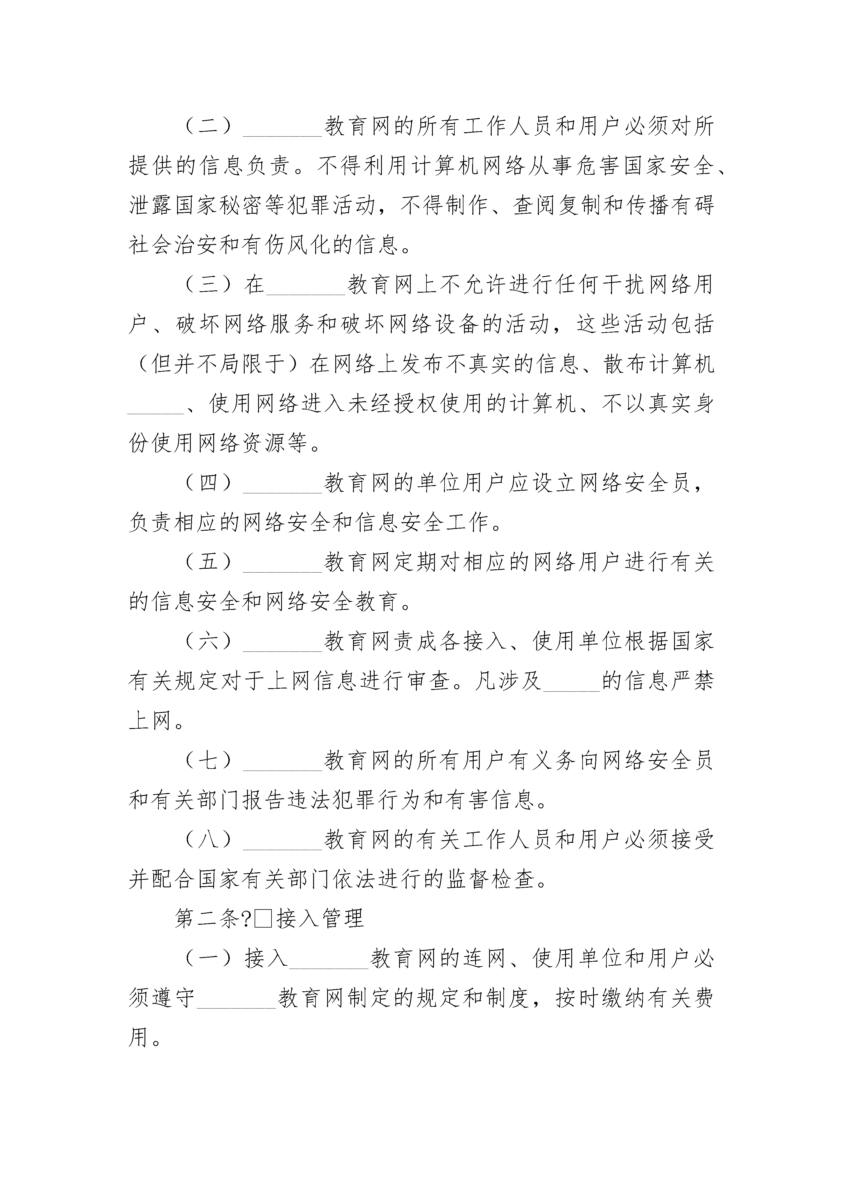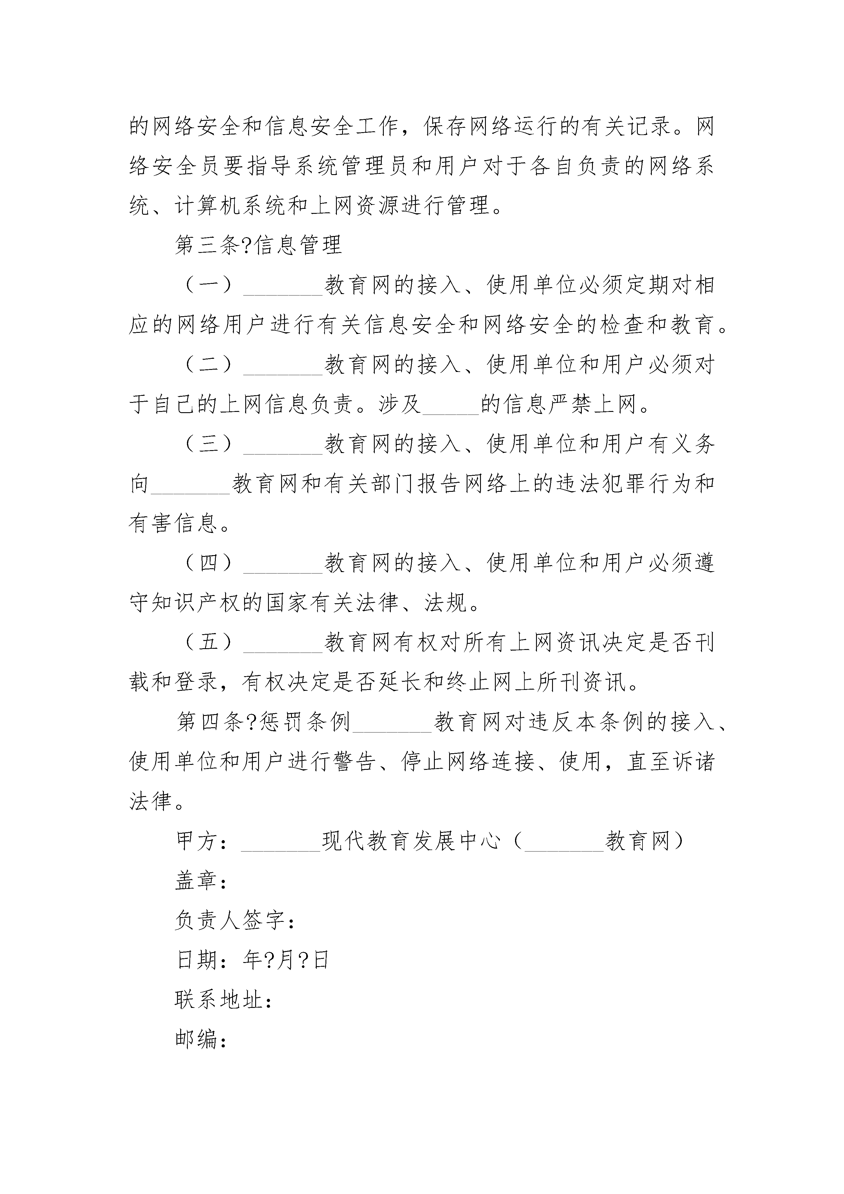 ____教育网安全管理协议____教育网安全管理协议(精选21篇)____教育网安全管理协议篇1甲方:_______现代教育发展中心(_______教育网)乙方:_______教育网是_______省教育厅直接领导的全省公共教育计算机网络,其目的是利用先进实用的计算机技术和网络通信技术,实现校园网间计算机连网、信息资源共享,促进教育与社会双向交互服务,其服务对象主要是我省的教育、科研机构和全社会教育需求。_______教育网的所有接入、使用单位必须签署本项协议,并报教育行政部门备案。第一条?总则?(一)_______教育网接入、使用单位的所有工作人员和用户必须遵守国家有关法律、法规,严格执行安全保密制度,并对所提供的信息负责。(二)_______教育网的所有工作人员和用户必须对所提供的信息负责。不得利用计算机网络从事危害国家安全、泄露国家秘密等犯罪活动,不得制作、查阅复制和传播有碍社会治安和有伤风化的信息。(三)在_______教育网上不允许进行任何干扰网络用户、破坏网络服务和破坏网络设备的活动,这些活动包括(但并不局限于)在网络上发布不真实的信息、散布计算机_____、使用网络进入未经授权使用的计算机、不以真实身份使用网络资源等。(四)_______教育网的单位用户应设立网络安全员,负责相应的网络安全和信息安全工作。(五)_______教育网定期对相应的网络用户进行有关的信息安全和网络安全教育。(六)_______教育网责成各接入、使用单位根据国家有关规定对于上网信息进行审查。凡涉及_____的信息严禁上网。(七)_______教育网的所有用户有义务向网络安全员和有关部门报告违法犯罪行为和有害信息。(八)_______教育网的有关工作人员和用户必须接受并配合国家有关部门依法进行的监督检查。第二条?接入管理(一)接入_______教育网的连网、使用单位和用户必须遵守_______教育网制定的规定和制度,按时缴纳有关费用。(二)_______教育网的接入、使用单位和用户不允许在网页上刊载与己无关的广告资讯。(三)与_______教育网中止连网接入、使用的单位和用户必须把相应的ip地址、专用电子邮箱和互联网址退还。(四)_______教育网的接入单位必须严格执行《_______教育网管理办法》的规定,不允许发展授权范围以外的任何用户。(五)_______教育网的接入、使用单位必须设立管理人员对网络进行严格管理;必须设立网络安全员,负责相应的网络安全和信息安全工作,保存网络运行的有关记录。网络安全员要指导系统管理员和用户对于各自负责的网络系统、计算机系统和上网资源进行管理。第三条?信息管理(一)_______教育网的接入、使用单位必须定期对相应的网络用户进行有关信息安全和网络安全的检查和教育。(二)_______教育网的接入、使用单位和用户必须对于自己的上网信息负责。涉及_____的信息严禁上网。(三)_______教育网的接入、使用单位和用户有义务向_______教育网和有关部门报告网络上的违法犯罪行为和有害信息。(四)_______教育网的接入、使用单位和用户必须遵守知识产权的国家有关法律、法规。(五)_______教育网有权对所有上网资讯决定是否刊载和登录,有权决定是否延长和终止网上所刊资讯。第四条?惩罚条例_______教育网对违反本条例的接入、使用单位和用户进行警告、停止网络连接、使用,直至诉诸法律。甲方:_______现代教育发展中心(_______教育网)盖章:负责人签字:日期:年?月?日联系地址:邮编:电话:传真:乙方:盖章:负责人签字:日期:年?月?日联系地址:邮编:电话:传真:使用日期:____教育网安全管理协议篇2教育网安全管理协议(试行)甲方:_______现代教育发展中心(_______教育网)乙方:_______教育网是_______省教育厅直接领导的全省公共教育计算机网络,其目的是利用先进实用的计算机技术和网络通信技术,实现校园网间计算机连网、信息资源共享,促进教育与社会双向交互服务,其服务对象主要是我省的教育、科研机构和全社会教育需求。_______教育网的所有接入、使用单位必须签署本项协议,并报教育行政部门备案。第一条?总则?(一)_______教育网接入、使用单位的所有工作人员和用户必须遵守国家有关法律、法规,严格执行安全保密制度,并对所提供的信息负责。(二)_______教育网的所有工作人员和用户必须对所提供的信息负责。不得利用计算机网络从事危害国家安全、泄露国家秘密等犯罪活动,不得制作、查阅复制和传播有碍社会治安和有伤风化的信息。(三)在_______教育网上不允许进行任何干扰网络用户、破坏网络服务和破坏网络设备的活动,这些活动包括(但并不局限于)在网络上发布不真实的信息、散布计算机__