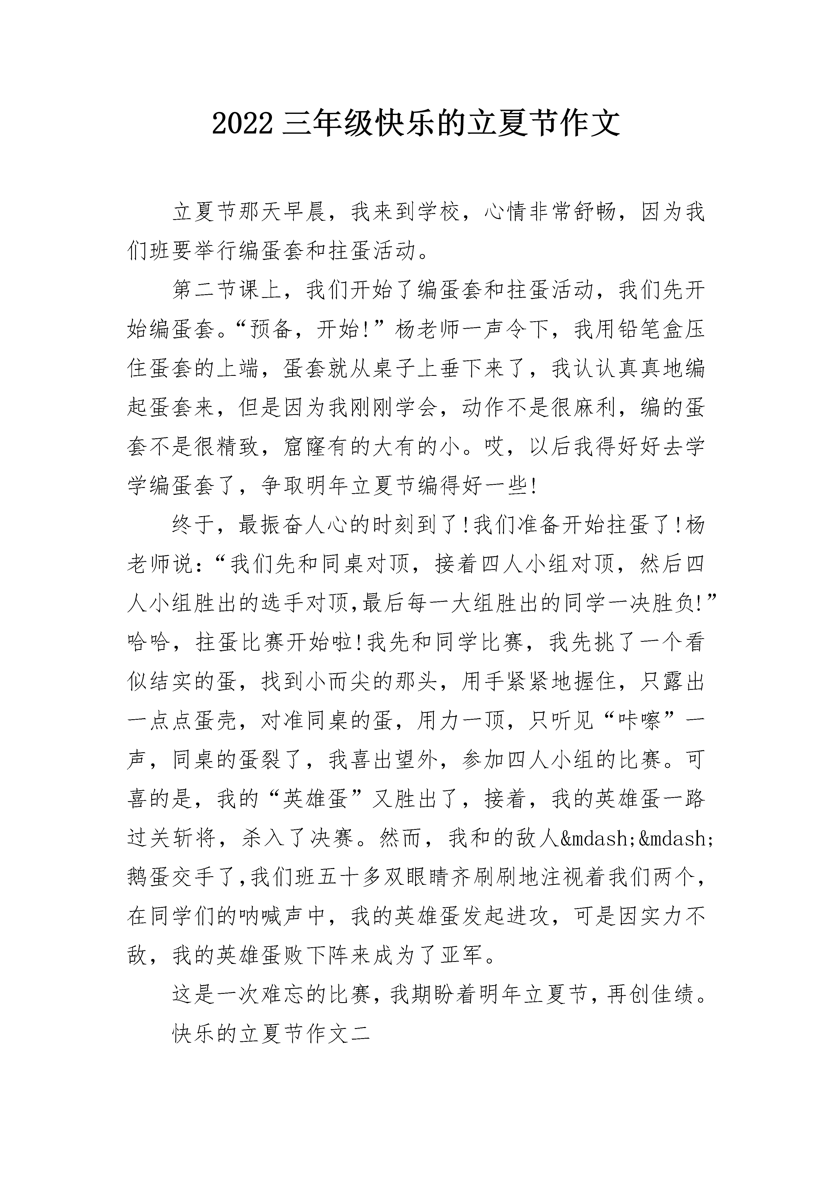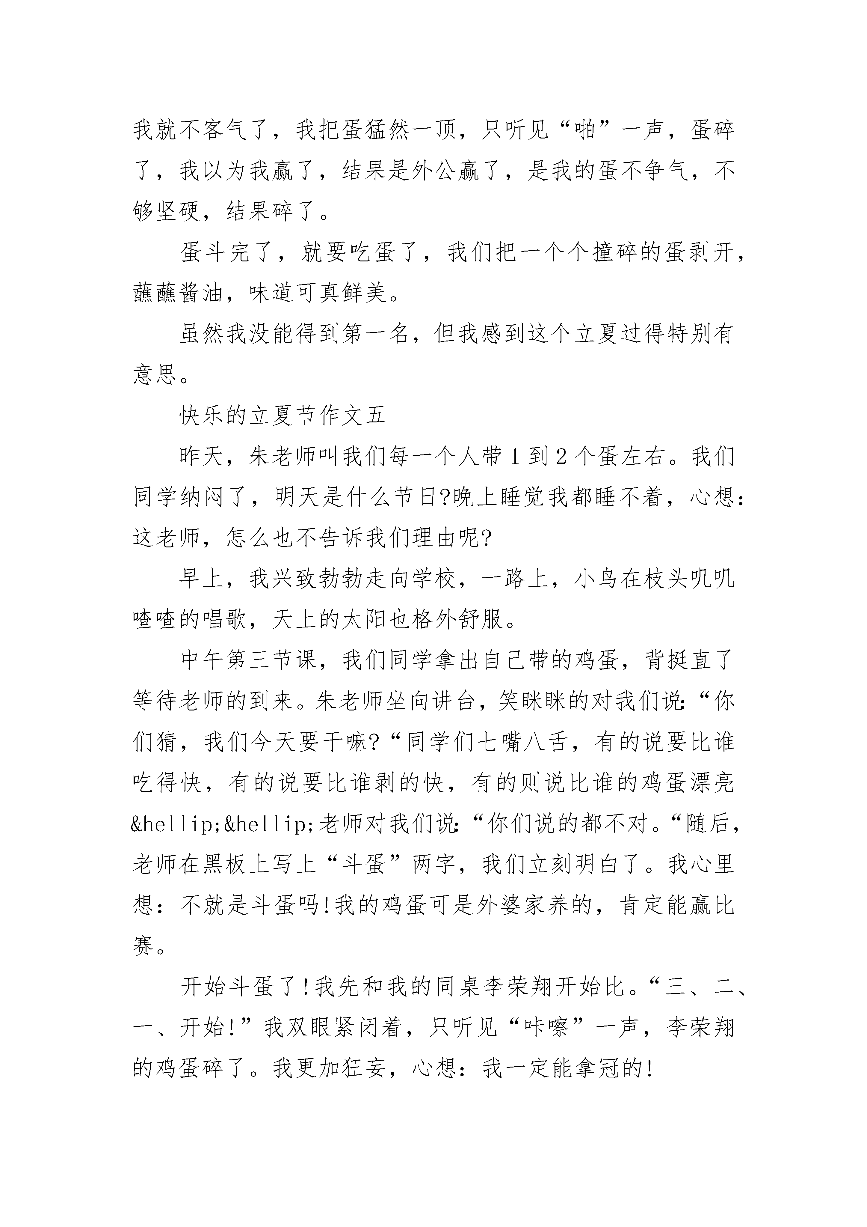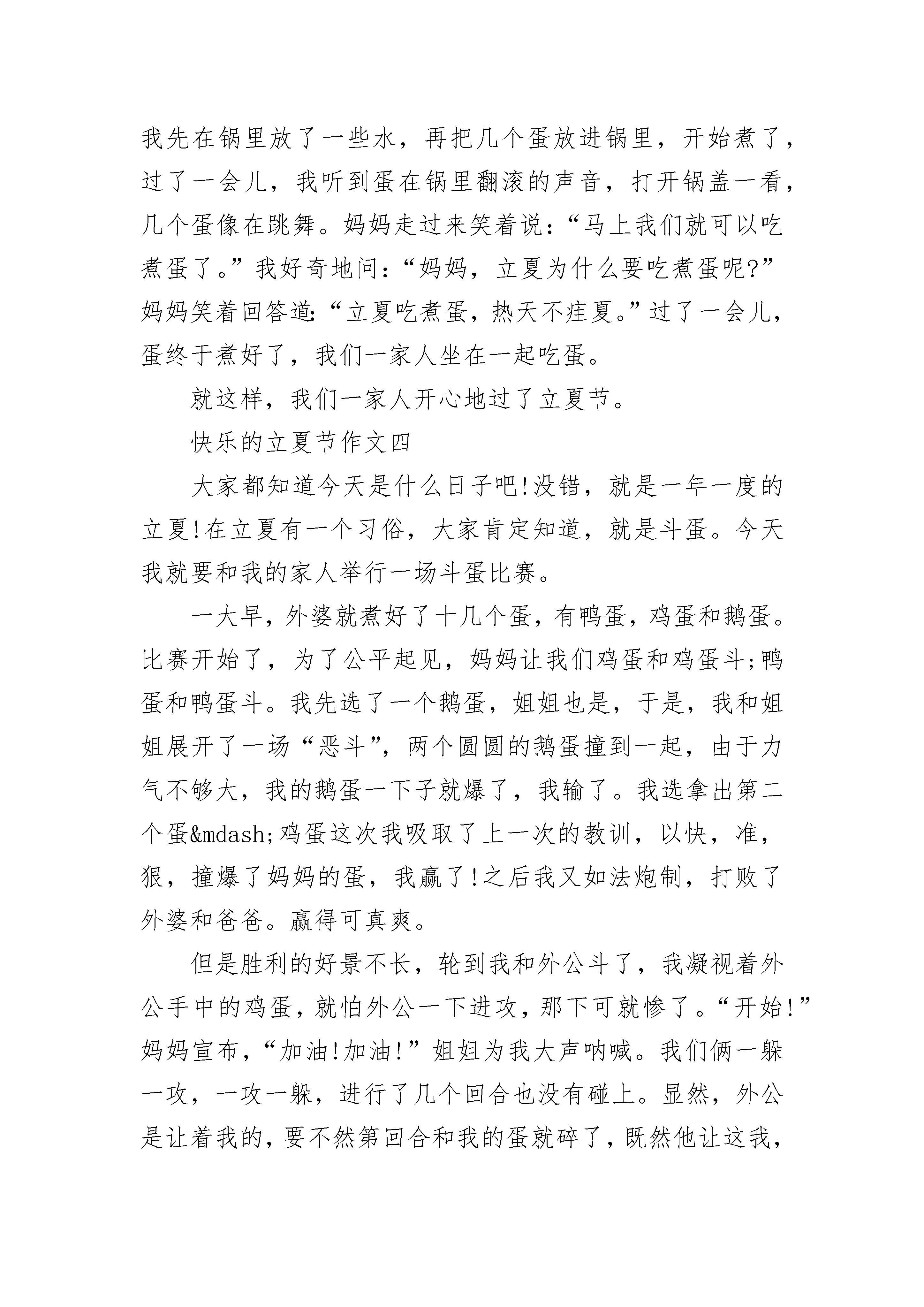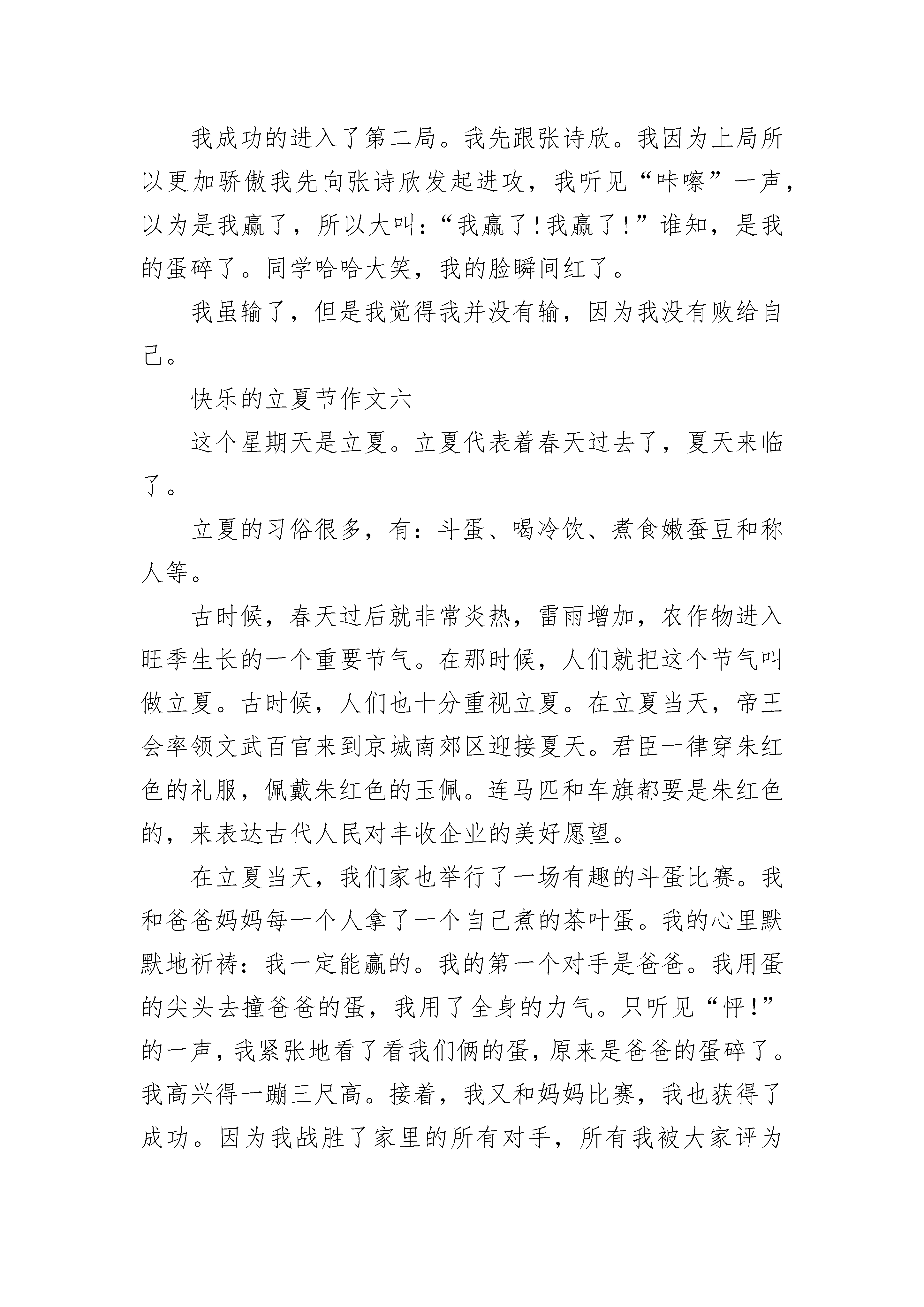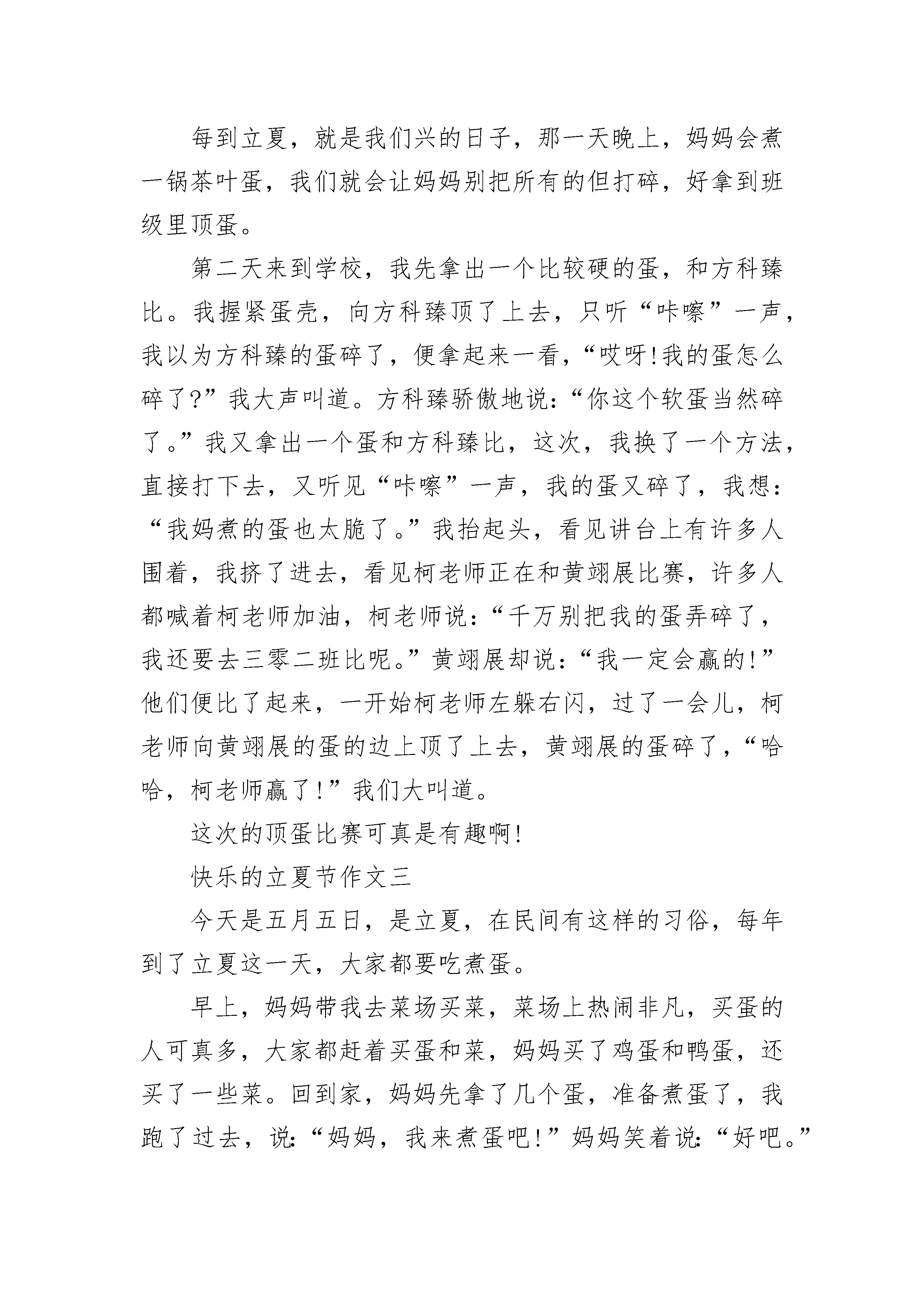 2022三年级快乐的立夏节作文立夏节那天早晨,我来到学校,心情非常舒畅,因为我们班要举行编蛋套和拄蛋活动。第二节课上,我们开始了编蛋套和拄蛋活动,我们先开始编蛋套。“预备,开始!”杨老师一声令下,我用铅笔盒压住蛋套的上端,蛋套就从桌子上垂下来了,我认认真真地编起蛋套来,但是因为我刚刚学会,动作不是很麻利,编的蛋套不是很精致,窟窿有的大有的小。哎,以后我得好好去学学编蛋套了,争取明年立夏节编得好一些!终于,最振奋人心的时刻到了!我们准备开始拄蛋了!杨老师说:“我们先和同桌对顶,接着四人小组对顶,然后四人小组胜出的选手对顶,最后每一大组胜出的同学一决胜负!”哈哈,拄蛋比赛开始啦!我先和同学比赛,我先挑了一个看似结实的蛋,找到小而尖的那头,用手紧紧地握住,只露出一点点蛋壳,对准同桌的蛋,用力一顶,只听见“咔嚓”一声,同桌的蛋裂了,我喜出望外,参加四人小组的比赛。可喜的是,我的“英雄蛋”又胜出了,接着,我的英雄蛋一路过关斩将,杀入了决赛。然而,我和的敌人——鹅蛋交手了,我们班五十多双眼睛齐刷刷地注视着我们两个,在同学们的呐喊声中,我的英雄蛋发起进攻,可是因实力不敌,我的英雄蛋败下阵来成为了亚军。这是一次难忘的比赛,我期盼着明年立夏节,再创佳绩。快乐的立夏节作文二每到立夏,就是我们兴的日子,那一天晚上,妈妈会煮一锅茶叶蛋,我们就会让妈妈别把所有的但打碎,好拿到班级里顶蛋。第二天来到学校,我先拿出一个比较硬的蛋,和方科臻比。我握紧蛋壳,向方科臻顶了上去,只听“咔嚓”一声,我以为方科臻的蛋碎了,便拿起来一看,“哎呀!我的蛋怎么碎了?”我大声叫道。方科臻骄傲地说:“你这个软蛋当然碎了。”我又拿出一个蛋和方科臻比,这次,我换了一个方法,直接打下去,又听见“咔嚓”一声,我的蛋又碎了,我想:“我妈煮的蛋也太脆了。”我抬起头,看见讲台上有许多人围着,我挤了进去,看见柯老师正在和黄翊展比赛,许多人都喊着柯老师加油,柯老师说:“千万别把我的蛋弄碎了,我还要去三零二班比呢。”黄翊展却说:“我一定会赢的!”他们便比了起来,一开始柯老师左躲右闪,过了一会儿,柯老师向黄翊展的蛋的边上顶了上去,黄翊展的蛋碎了,“哈哈,柯老师赢了!”我们大叫道。这次的顶蛋比赛可真是有趣啊!快乐的立夏节作文三今天是五月五日,是立夏,在民间有这样的习俗,每年到了立夏这一天,大家都要吃煮蛋。早上,妈妈带我去菜场买菜,菜场上热闹非凡,买蛋的人可真多,大家都赶着买蛋和菜,妈妈买了鸡蛋和鸭蛋,还买了一些菜。回到家,妈妈先拿了几个蛋,准备煮蛋了,我跑了过去,说:“妈妈,我来煮蛋吧!”妈妈笑着说:“好吧。”我先在锅里放了一些水,再把几个蛋放进锅里,开始煮了,过了一会儿,我听到蛋在锅里翻滚的声音,打开锅盖一看,几个蛋像在跳舞。妈妈走过来笑着说:“马上我们就可以吃煮蛋了。”我好奇地问:“妈妈,立夏为什么要吃煮蛋呢?”妈妈笑着回答道:“立夏吃煮蛋,热天不疰夏。”过了一会儿,蛋终于煮好了,我们一家人坐在一起吃蛋。就这样,我们一家人开心地过了立夏节。快乐的立夏节作文四大家都知道今天是什么日子吧!没错,就是一年一度的立夏!在立夏有一个习俗,大家肯定知道,就是斗蛋。今天我就要和我的家人举行一场斗蛋比赛。一大早,外婆就煮好了十几个蛋,有鸭蛋,鸡蛋和鹅蛋。比赛开始了,为了公平起见,妈妈让我们鸡蛋和鸡蛋斗;鸭蛋和鸭蛋斗。我先选了一个鹅蛋,姐姐也是,于是,我和姐姐展开了一场“恶斗”,两个圆圆的鹅蛋撞到一起,由于力气不够大,我的鹅蛋一下子就爆了,我输了。我选拿出第二个蛋—鸡蛋这次我吸取了上一次的教训,以快,准,狠,撞爆了妈妈的蛋,我赢了!之后我又如法炮制,打败了外婆和爸爸。赢得可真爽。但是胜利的好景不长,轮到我和外公斗了,我凝视着外公手中的鸡蛋,就怕外公一下进攻,那下可就惨了。“开始!”妈妈宣布,“加油!加油!”姐姐为我大声呐喊。我们俩一躲一攻,一攻一躲,进行了几个回合也没有碰上。显然,外公是让着我的,要不然第回合和我的蛋就碎了,既然他让这我,我就不客气了,我把蛋猛然一顶,只听见“啪”一声,蛋碎了,我以为我赢了,结果是外公赢了,是我的蛋不争气,不够坚硬,结果碎了。蛋斗完了,就要吃蛋了,我们把一个个撞碎的蛋剥开,蘸蘸酱油,味道可真鲜美。虽然我没能得到第一名,但我感到这个立夏过得特别有意思。快乐的立夏节作文五昨天,朱老师叫我们每一个人带1到2个蛋左右。我们同学纳闷了,明天是什么节日?晚上睡觉我都睡不着,心想:这老师,怎么也不告诉我们理由呢?早上,我兴致勃勃走向学校,一路上,小鸟在枝头叽叽喳喳的唱歌,天上的太阳也格外舒服。中午第三节课,我们同学拿出自己带的鸡蛋,背挺直了等待老师的到来。朱老师坐向讲台,笑眯眯的对我们说:“你们猜,我们今天要干嘛?“同学们七嘴八舌,有的说要比谁吃得快,有的说