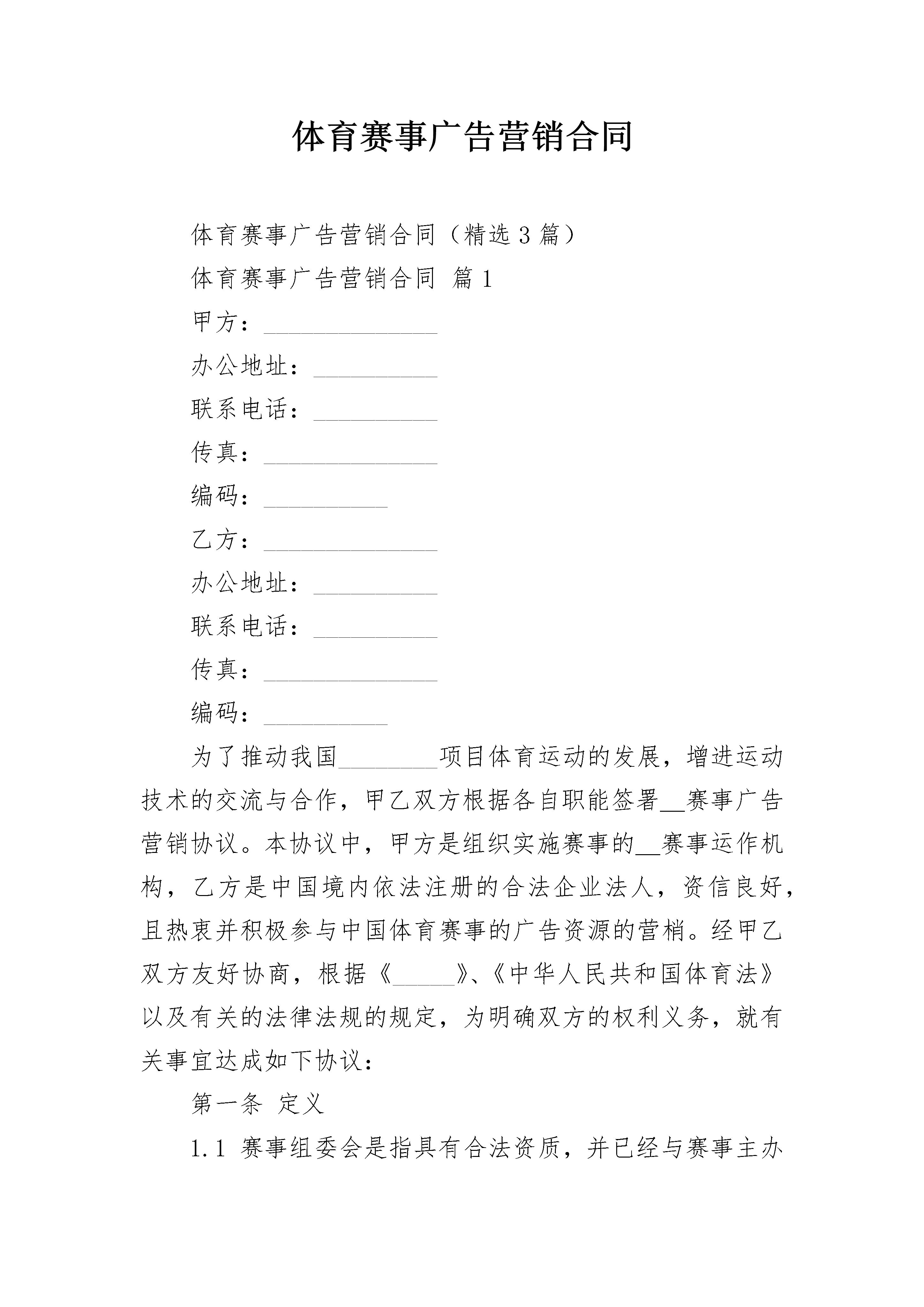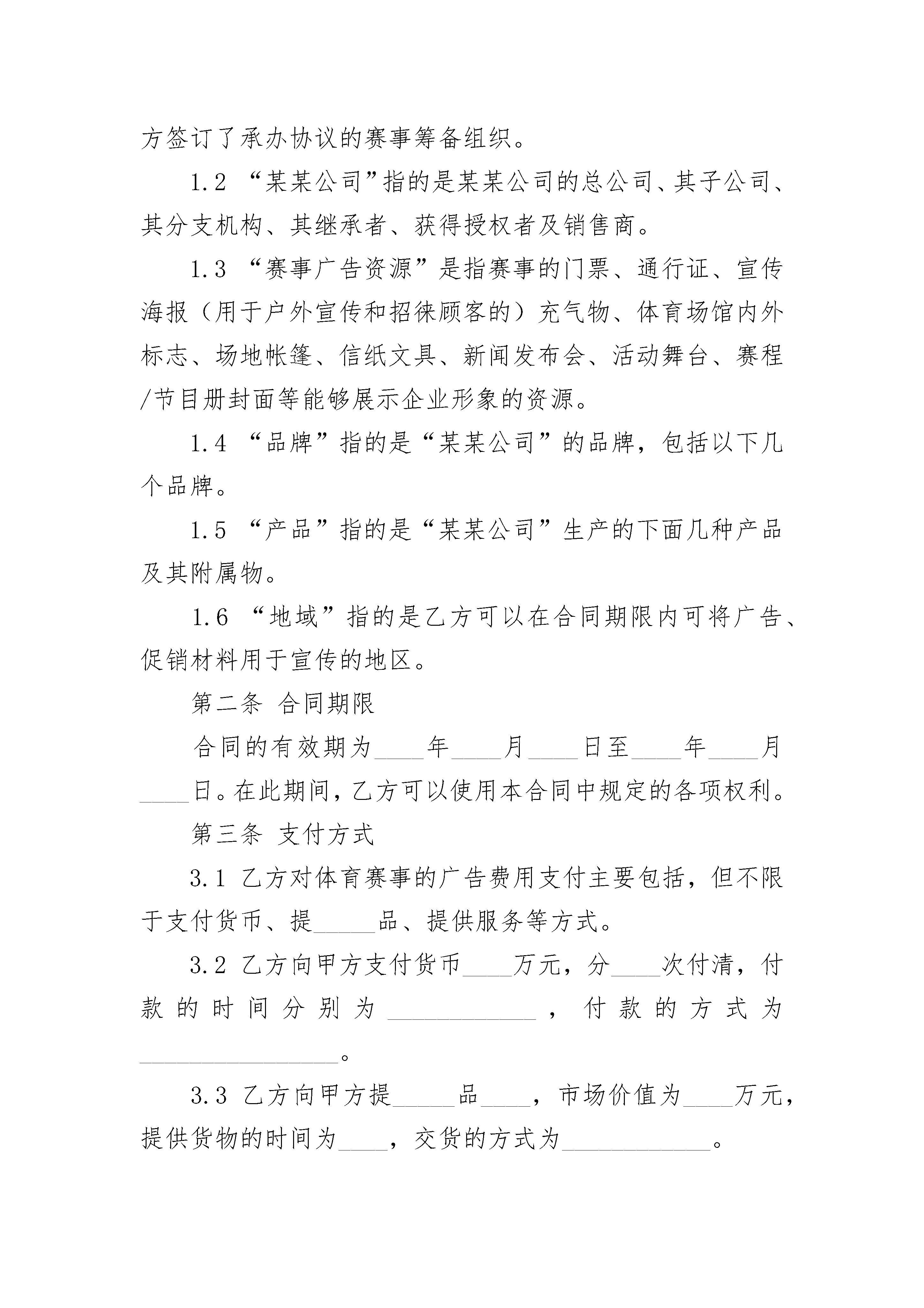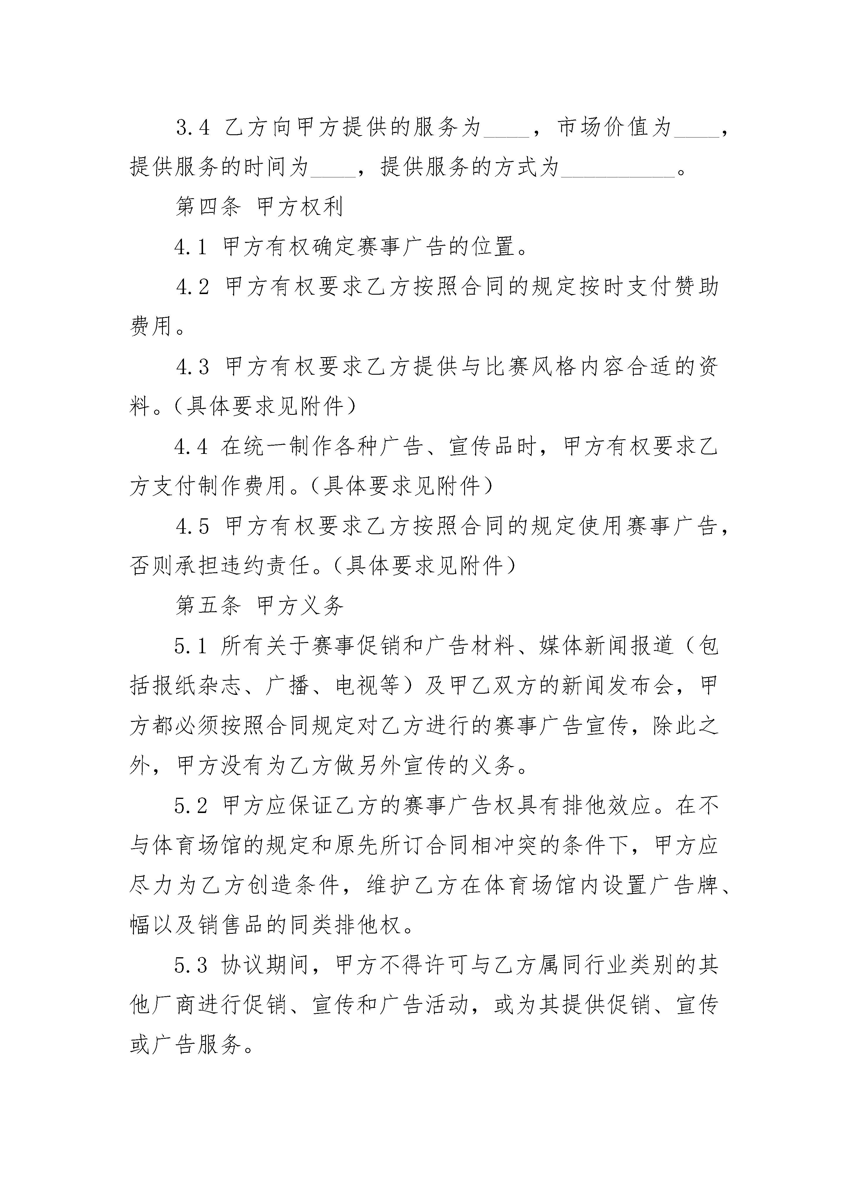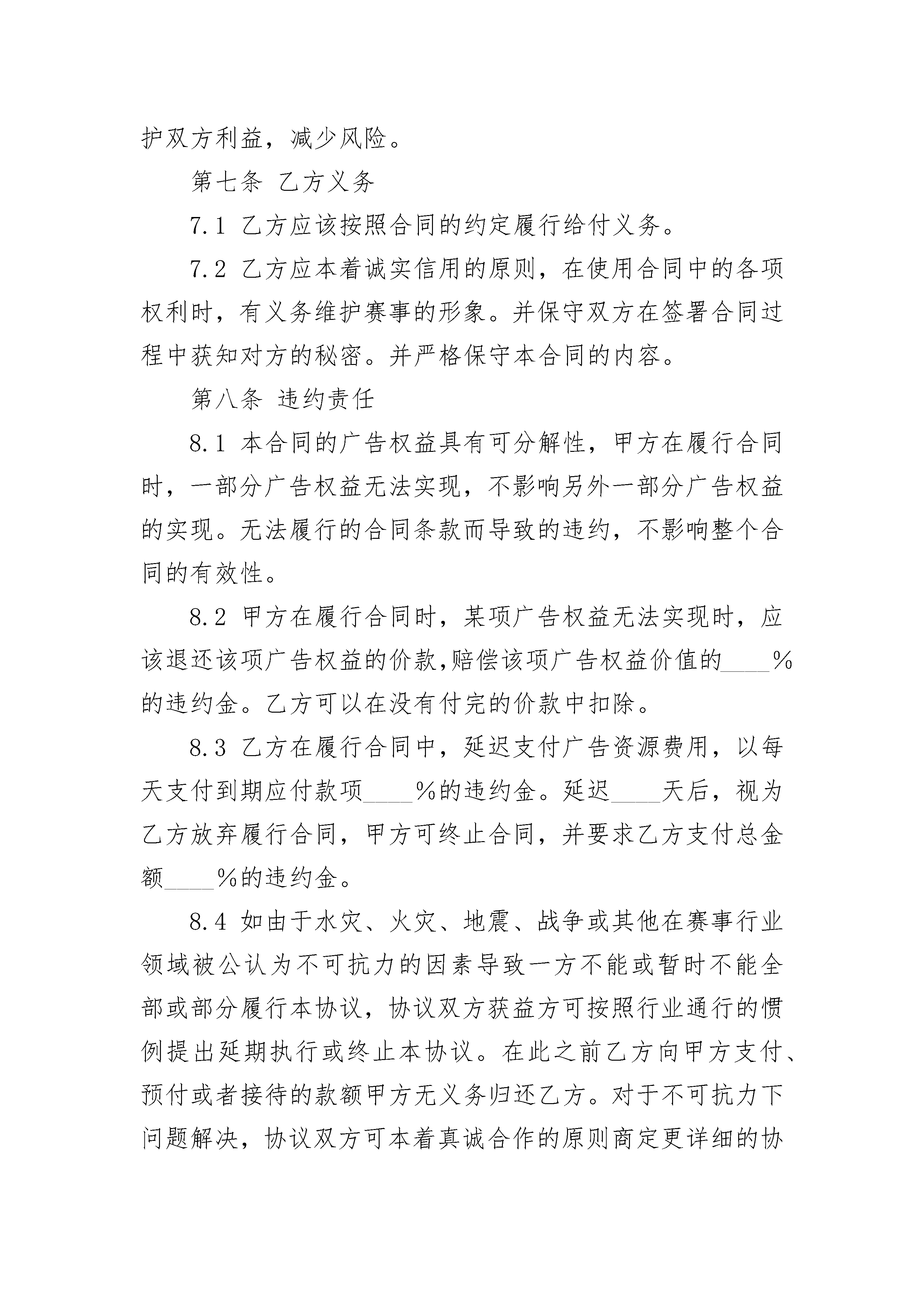 体育赛事广告营销合同体育赛事广告营销合同(精选3篇)体育赛事广告营销合同篇1甲方:______________办公地址:__________联系电话:__________传真:______________编码:__________乙方:______________办公地址:__________联系电话:__________传真:______________编码:__________为了推动我国________项目体育运动的发展,增进运动技术的交流与合作,甲乙双方根据各自职能签署_赛事广告营销协议。本协议中,甲方是组织实施赛事的_赛事运作机构,乙方是中国境内依法注册的合法企业法人,资信良好,且热衷并积极参与中国体育赛事的广告资源的营梢。经甲乙双方友好协商,根据《_____》、《中华人民共和国体育法》以及有关的法律法规的规定,为明确双方的权利义务,就有关事宜达成如下协议:第一条定义1.1赛事组委会是指具有合法资质,并已经与赛事主办方签订了承办协议的赛事筹备组织。1.2“某某公司”指的是某某公司的总公司、其子公司、其分支机构、其继承者、获得授权者及销售商。1.3“赛事广告资源”是指赛事的门票、通行证、宣传海报(用于户外宣传和招徕顾客的)充气物、体育场馆内外标志、场地帐篷、信纸文具、新闻发布会、活动舞台、赛程/节目册封面等能够展示企业形象的资源。1.4“品牌”指的是“某某公司”的品牌,包括以下几个品牌。1.5“产品”指的是“某某公司”生产的下面几种产品及其附属物。1.6“地域”指的是乙方可以在合同期限内可将广告、促销材料用于宣传的地区。第二条合同期限合同的有效期为____年____月____日至____年____月____日。在此期间,乙方可以使用本合同中规定的各项权利。第三条支付方式3.1乙方对体育赛事的广告费用支付主要包括,但不限于支付货币、提_____品、提供服务等方式。3.2乙方向甲方支付货币____万元,分____次付清,付款的时间分别为____________,付款的方式为________________。3.3乙方向甲方提_____品____,市场价值为____万元,提供货物的时间为____,交货的方式为____________。3.4乙方向甲方提供的服务为____,市场价值为____,提供服务的时间为____,提供服务的方式为__________。第四条甲方权利4.1甲方有权确定赛事广告的位置。4.2甲方有权要求乙方按照合同的规定按时支付赞助费用。4.3甲方有权要求乙方提供与比赛风格内容合适的资料。(具体要求见附件)4.4在统一制作各种广告、宣传品时,甲方有权要求乙方支付制作费用。(具体要求见附件)4.5甲方有权要求乙方按照合同的规定使用赛事广告,否则承担违约责任。(具体要求见附件)第五条甲方义务5.1所有关于赛事促销和广告材料、媒体新闻报道(包括报纸杂志、广播、电视等)及甲乙双方的新闻发布会,甲方都必须按照合同规定对乙方进行的赛事广告宣传,除此之外,甲方没有为乙方做另外宣传的义务。5.2甲方应保证乙方的赛事广告权具有排他效应。在不与体育场馆的规定和原先所订合同相冲突的条件下,甲方应尽力为乙方创造条件,维护乙方在体育场馆内设置广告牌、幅以及销售品的同类排他权。5.3协议期间,甲方不得许可与乙方属同行业类别的其他厂商进行促销、宣传和广告活动,或为其提供促销、宣传或广告服务。5.4协议期间,甲方有义务保障乙方的合同规定的权利,如有其他场上进行隐性营稍,甲方应承担维护乙方权利的义务,否则甲方应承担相应的违约责任。必要的时候,乙方可以协助甲方的维权。5.5对于乙方在促销和广告宣传中需要甲方审核批准的材料,甲方应商定专门的工作日接待,并须在____个连续的工作日内完成审核工作。5.6甲方有义务在合同履行过程中,保护乙方形象。保守双方的秘密。5.7甲方有义务为赛事各方面可能影响到比赛的方面投保。第六条乙方权利6.1乙方广告权具有排他性,乙方同类行业的厂商不能进行任何与比赛相关联的活动。6.2乙方可以用与赛事相关的广告、促梢、新闻媒体、网络媒体等多种活动来进行品牌宣传与产品促销。具体协商的内容见附件。6.3乙方有权维护独家广告权益,在甲方不配合的情况下,乙方有亲自维权的权利。同时有要求甲方赔偿相应损失的权利。6.4甲方对乙方的广告宣传、促销做法违反合同约定时,乙方有权提出意见,有要求甲方更正的权利。甲方严重违反合同约定时,乙方可以要求甲方赔偿;有权要求解除合同。6.5乙方有权要求甲方为赛事投保必要的险种,从而维护双方利益,减少风险。第七条乙方义务7.1乙方应该按照合同的约定履行给付义务。7.2乙方应本着诚实信用的原则,在使用合同中的各项权利时,有义务维护赛事的形象。并保守双方在签署合同过程中获知对方的秘密。并严格保守本合同的内容