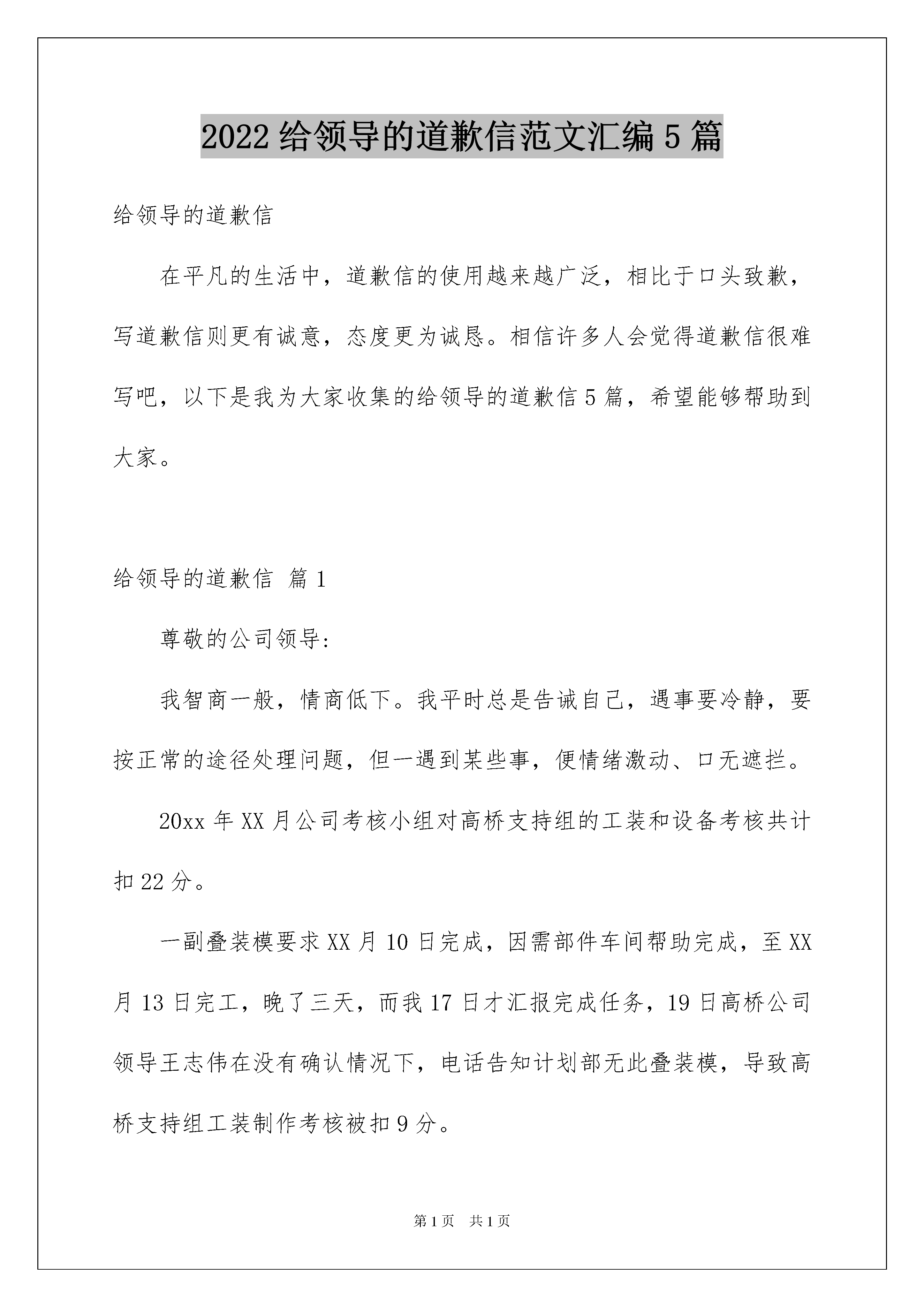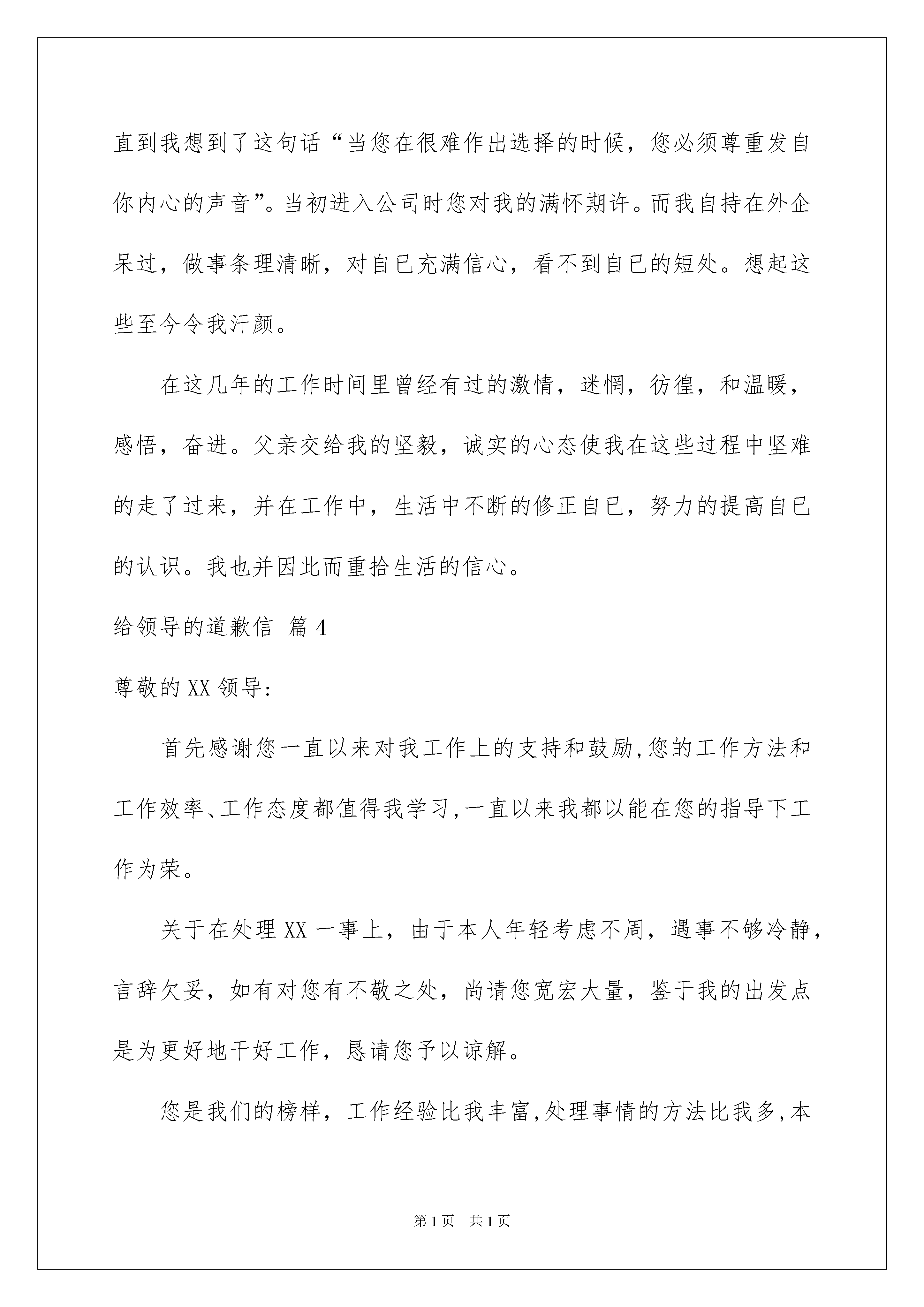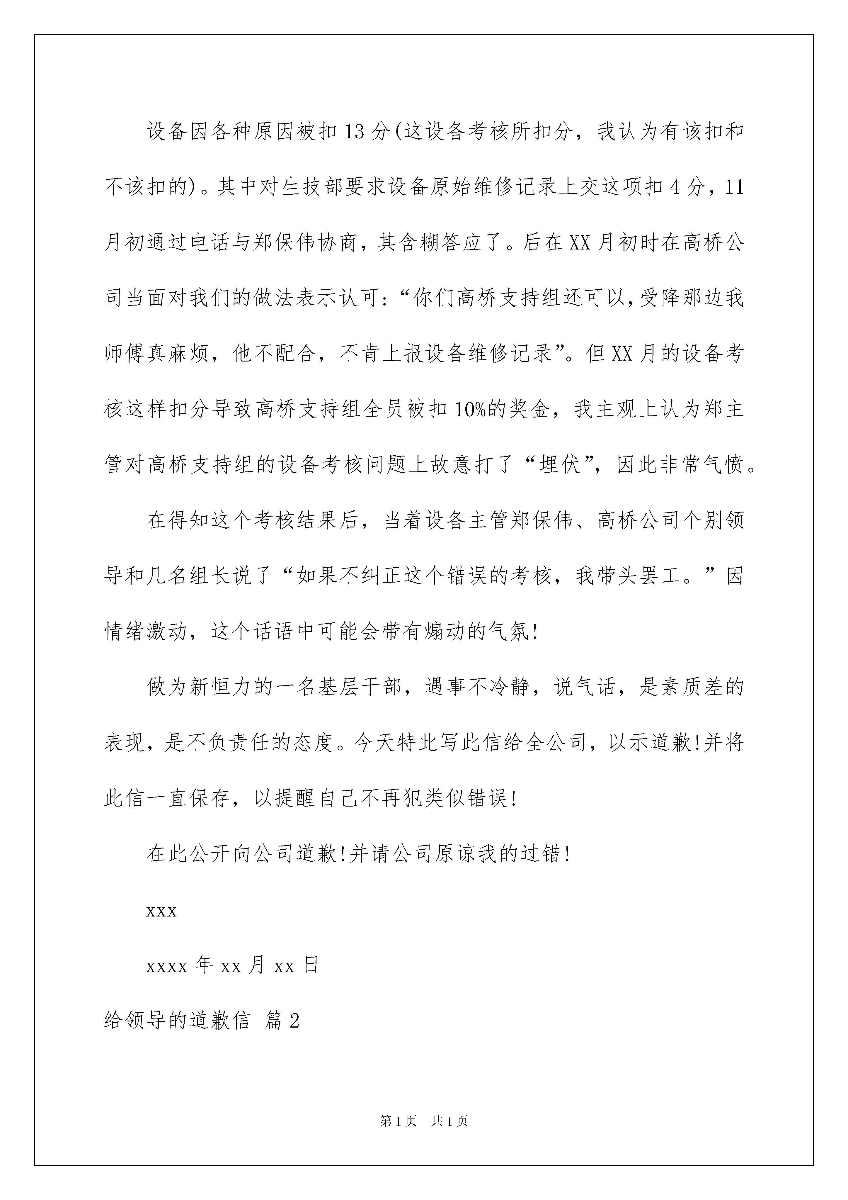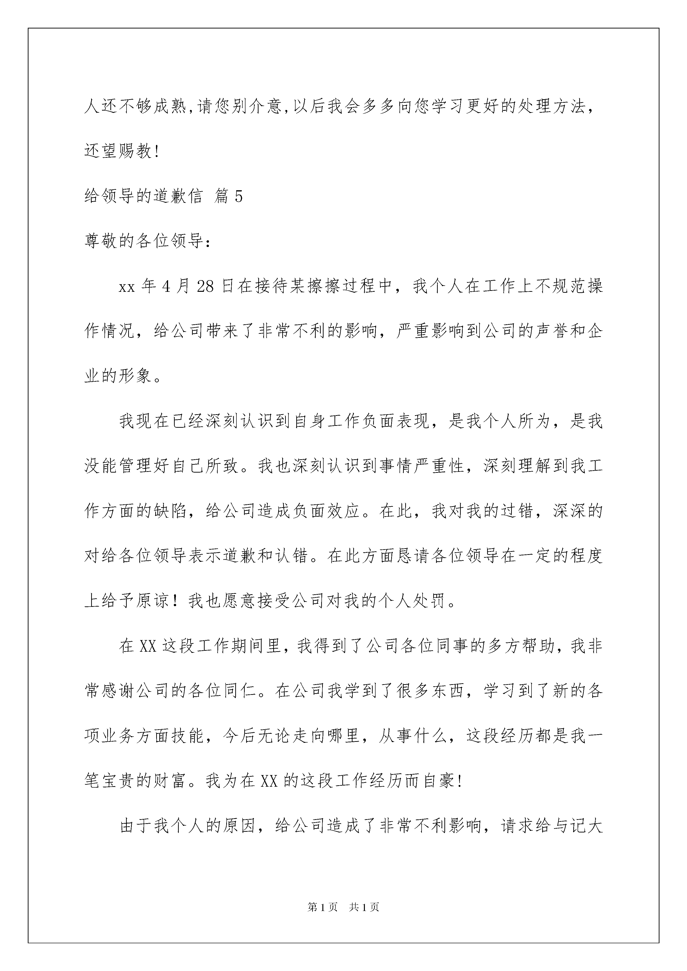 2022给领导的道歉信范文汇编5篇给领导的道歉信在平凡的生活中,道歉信的使用越来越广泛,相比于口头致歉,写道歉信则更有诚意,态度更为诚恳。相信许多人会觉得道歉信很难写吧,以下是我为大家收集的给领导的道歉信5篇,希望能够帮助到大家。给领导的道歉信篇1尊敬的公司领导:我智商一般,情商低下。我平时总是告诫自己,遇事要冷静,要按正常的途径处理问题,但一遇到某些事,便情绪激动、口无遮拦。20xx年XX月公司考核小组对高桥支持组的工装和设备考核共计扣22分。一副叠装模要求XX月10日完成,因需部件车间帮助完成,至XX月13日完工,晚了三天,而我17日才汇报完成任务,19日高桥公司领导王志伟在没有确认情况下,电话告知计划部无此叠装模,导致高桥支持组工装制作考核被扣9分。设备因各种原因被扣13分(这设备考核所扣分,我认为有该扣和不该扣的)。其中对生技部要求设备原始维修记录上交这项扣4分,11月初通过电话与郑保伟协商,其含糊答应了。后在XX月初时在高桥公司当面对我们的做法表示认可:“你们高桥支持组还可以,受降那边我师傅真麻烦,他不配合,不肯上报设备维修记录”。但XX月的设备考核这样扣分导致高桥支持组全员被扣10%的奖金,我主观上认为郑主管对高桥支持组的设备考核问题上故意打了“埋伏”,因此非常气愤。在得知这个考核结果后,当着设备主管郑保伟、高桥公司个别领导和几名组长说了“如果不纠正这个错误的考核,我带头罢工。”因情绪激动,这个话语中可能会带有煽动的气氛!做为新恒力的一名基层干部,遇事不冷静,说气话,是素质差的表现,是不负责任的态度。今天特此写此信给全公司,以示道歉!并将此信一直保存,以提醒自己不再犯类似错误!在此公开向公司道歉!并请公司原谅我的过错!xxxxxxx年xx月xx日给领导的道歉信篇2尊敬的领导:我是在迫不得已的情况下写这份信的,情况有三,其一:这份工作适合我发挥自己的特长,我不想轻易言弃.其二:公司的薪水足够我月月如流水的`时尚消费理念,过了这个村未必还有别的店.其三:我不想别人以为一山难容二虎,我被击败下所以败者为寇当了逃兵.为了表示我的诚意,故本人采取公开公平的公正的态度向各界群众公开道歉。您大可不必吃不好饭睡不好觉,有意无意总想从我嘴里套出什么话来,您的嘴很稳,您不说,我们自然不知道,您就放心吧.给领导的道歉信篇3尊敬的领导:您好!我想了很多才写下了下面的内容。“诚信或者忠诚,并不机械地等于终身服务于一家公司。人和企业都在时刻的改变着,对于企业而言,随着公司的发展变迁,过去适合的员工未来可能不再适合他的职位;对于个人来说,一个公司过去可能是他最佳的选项择,随着时间的流逝,现在可能已经无法激发他最大限度地发挥他的激情和才干。”当我在凌晨三点读到这段话时,心里面感慨万千,久不能眠……于是我打开电脑,给您写了这封辞呈。去与留这二字,在我心里一直反复。直到我想到了这句话“当您在很难作出选择的时候,您必须尊重发自你内心的声音”。当初进入公司时您对我的满怀期许。而我自持在外企呆过,做事条理清晰,对自已充满信心,看不到自已的短处。想起这些至今令我汗颜。在这几年的工作时间里曾经有过的激情,迷惘,彷徨,和温暖,感悟,奋进。父亲交给我的坚毅,诚实的心态使我在这些过程中坚难的走了过来,并在工作中,生活中不断的修正自已,努力的提高自已的认识。我也并因此而重拾生活的信心。给领导的道歉信篇4尊敬的XX领导:首先感谢您一直以来对我工作上的支持和鼓励,您的工作方法和工作效率、工作态度都值得我学习,一直以来我都以能在您的指导下工作为荣。关于在处理XX一事上,由于本人年轻考虑不周,遇事不够冷静,言辞欠妥,如有对您有不敬之处,尚请您宽宏大量,鉴于我的出发点是为更好地干好工作,恳请您予以谅解。您是我们的榜样,工作经验比我丰富,处理事情的方法比我多,本人还不够成熟,请您别介意,以后我会多多向您学习更好的处理方法,还望赐教!给领导的道歉信篇5尊敬的各位领导:xx年4月28日在接待某擦擦过程中,我个人在工作上不规范操作情况,给公司带来了非常不利的影响,严重影响到公司的声誉和企业的形象。我现在已经深刻认识到自身工作负面表现,是我个人所为,是我没能管理好自己所致。我也深刻认识到事情严重性,深刻理解到我工作方面的缺陷,给公司造成负面效应。在此,我对我的过错,深深的对给各位领导表示道歉和认错。在此方面恳请各位领导在一定的程度上给予原谅!我也愿意接受公司对我的个人处罚。在XX这段工作期间里,我得到了公司各位同事的多方帮助,我非常感谢公司的各位同仁。在公司我学到了很多东西,学习到了新的各项业务方面技能,今后无论走向哪里,从事什么,