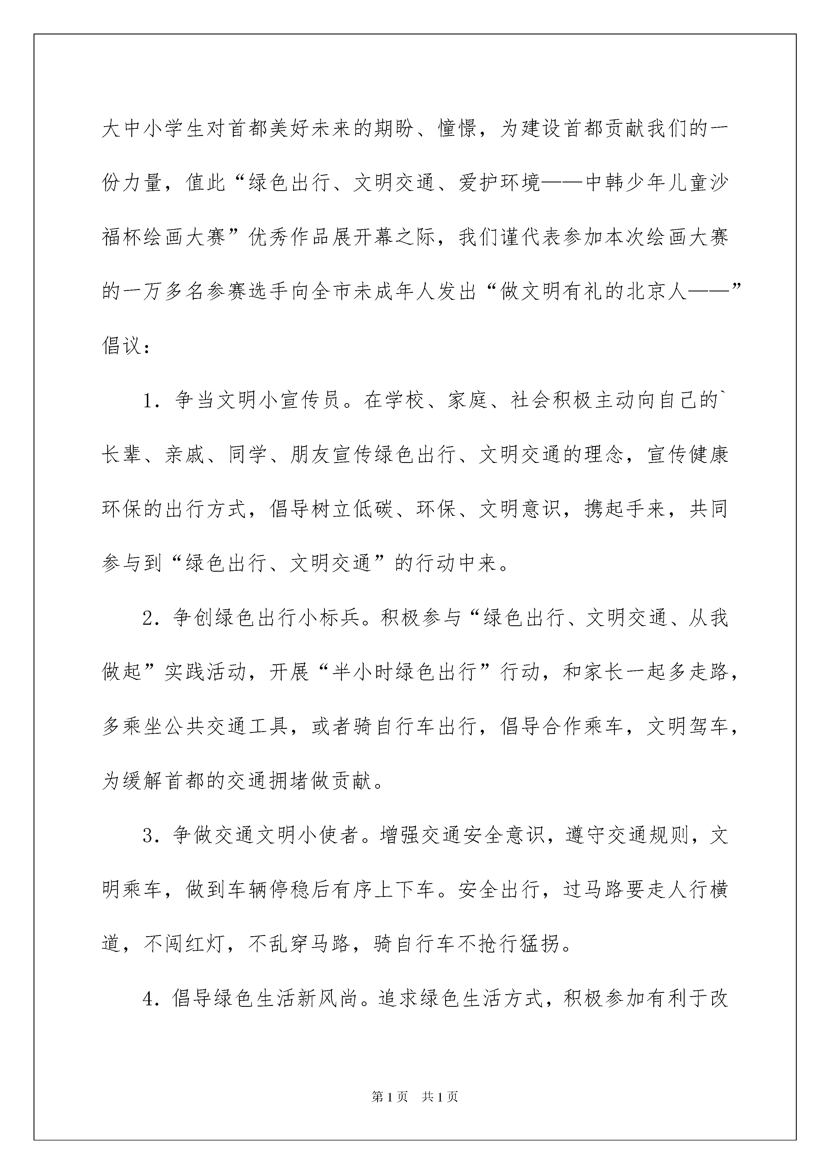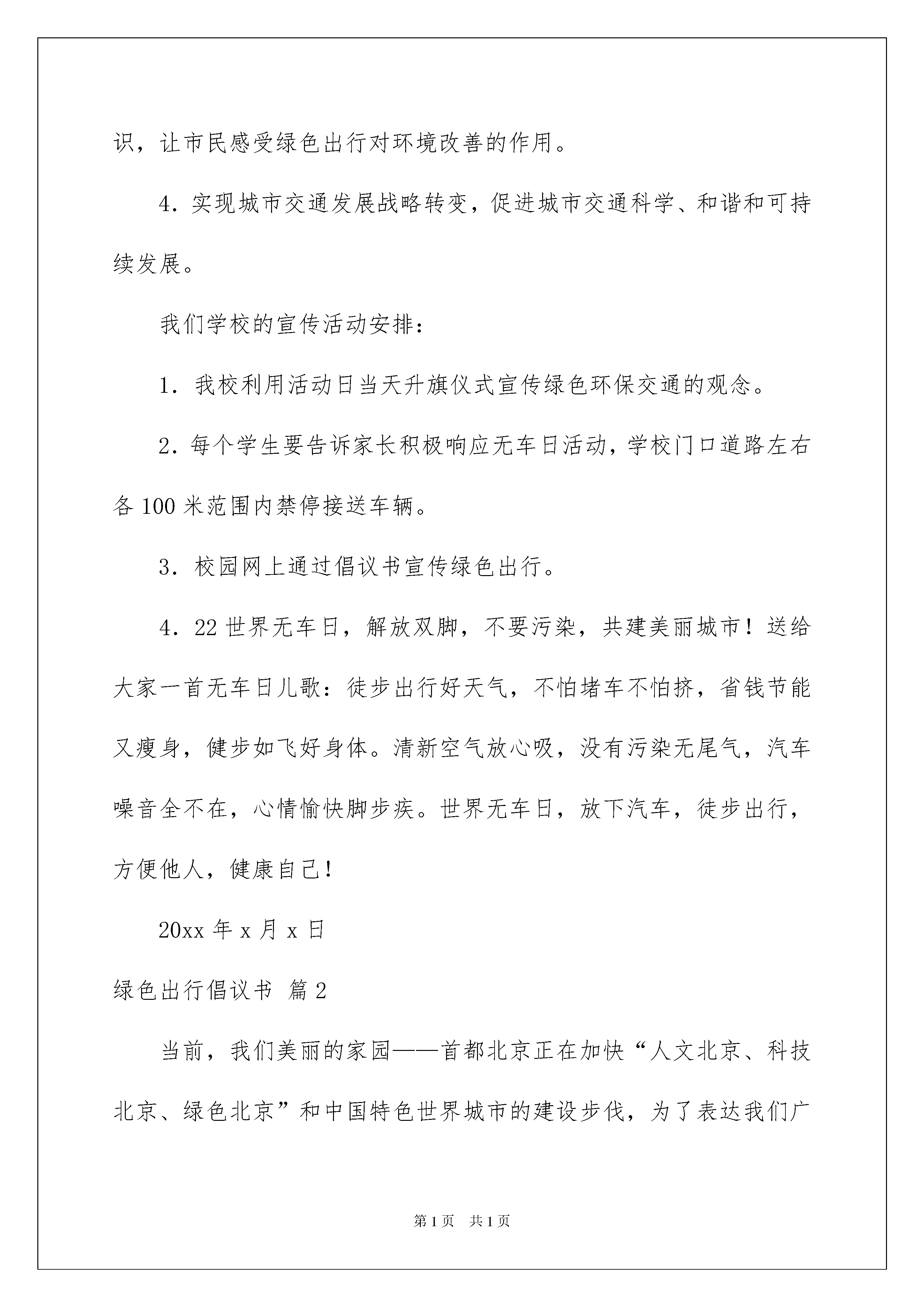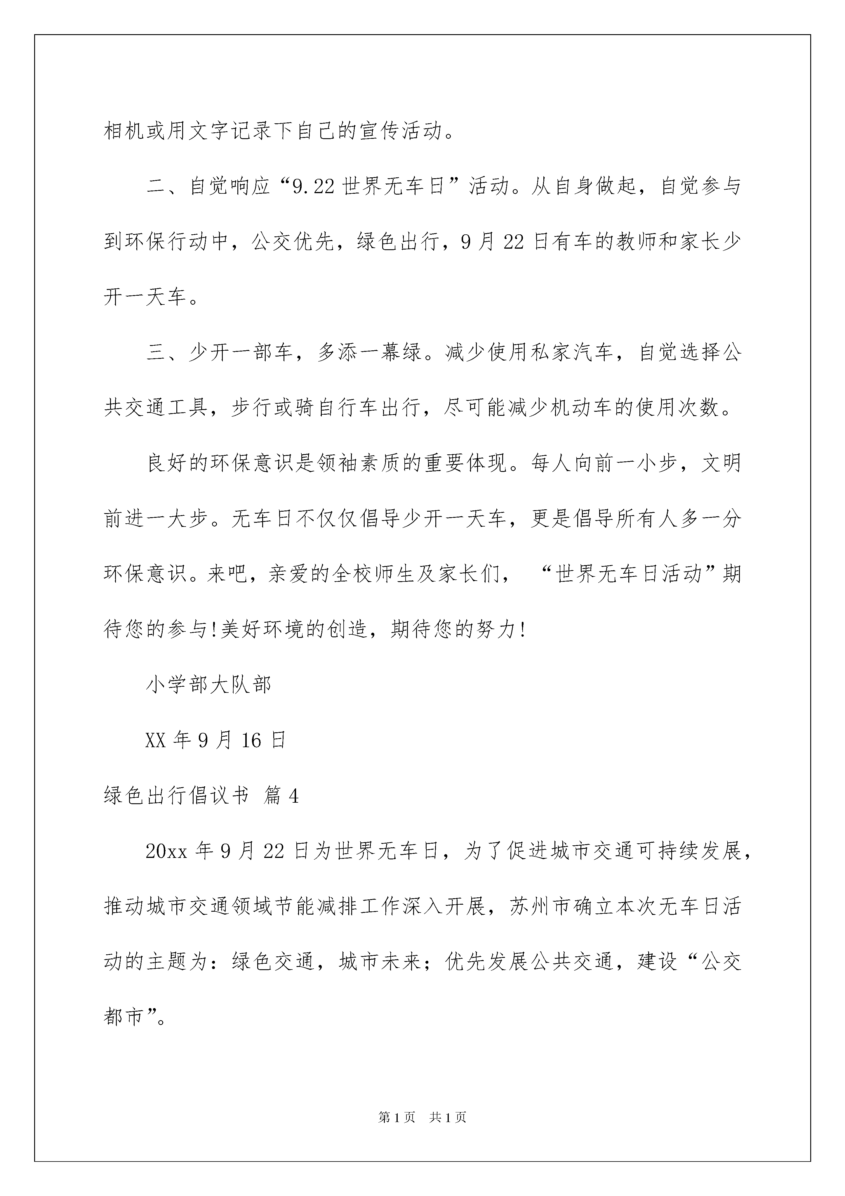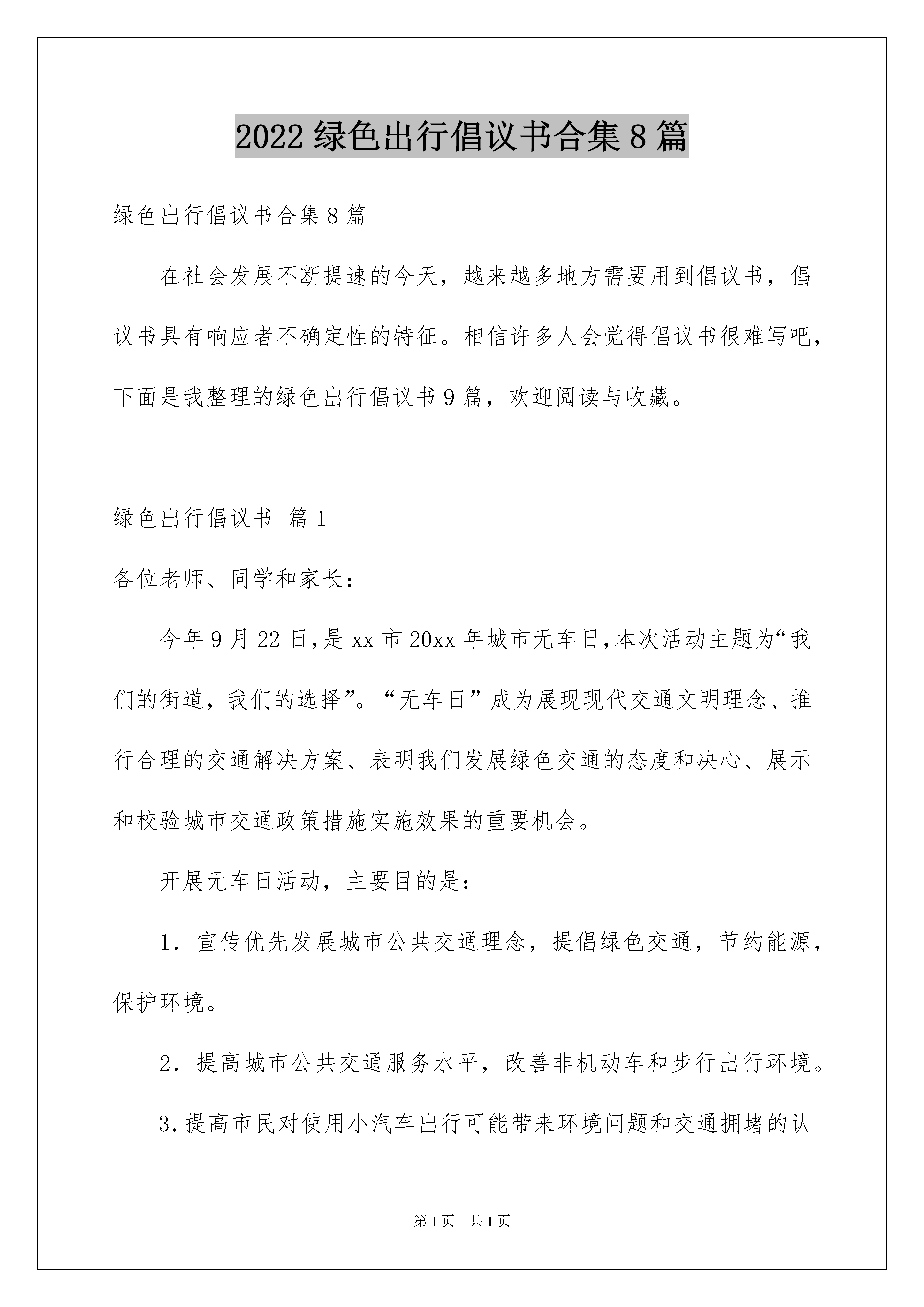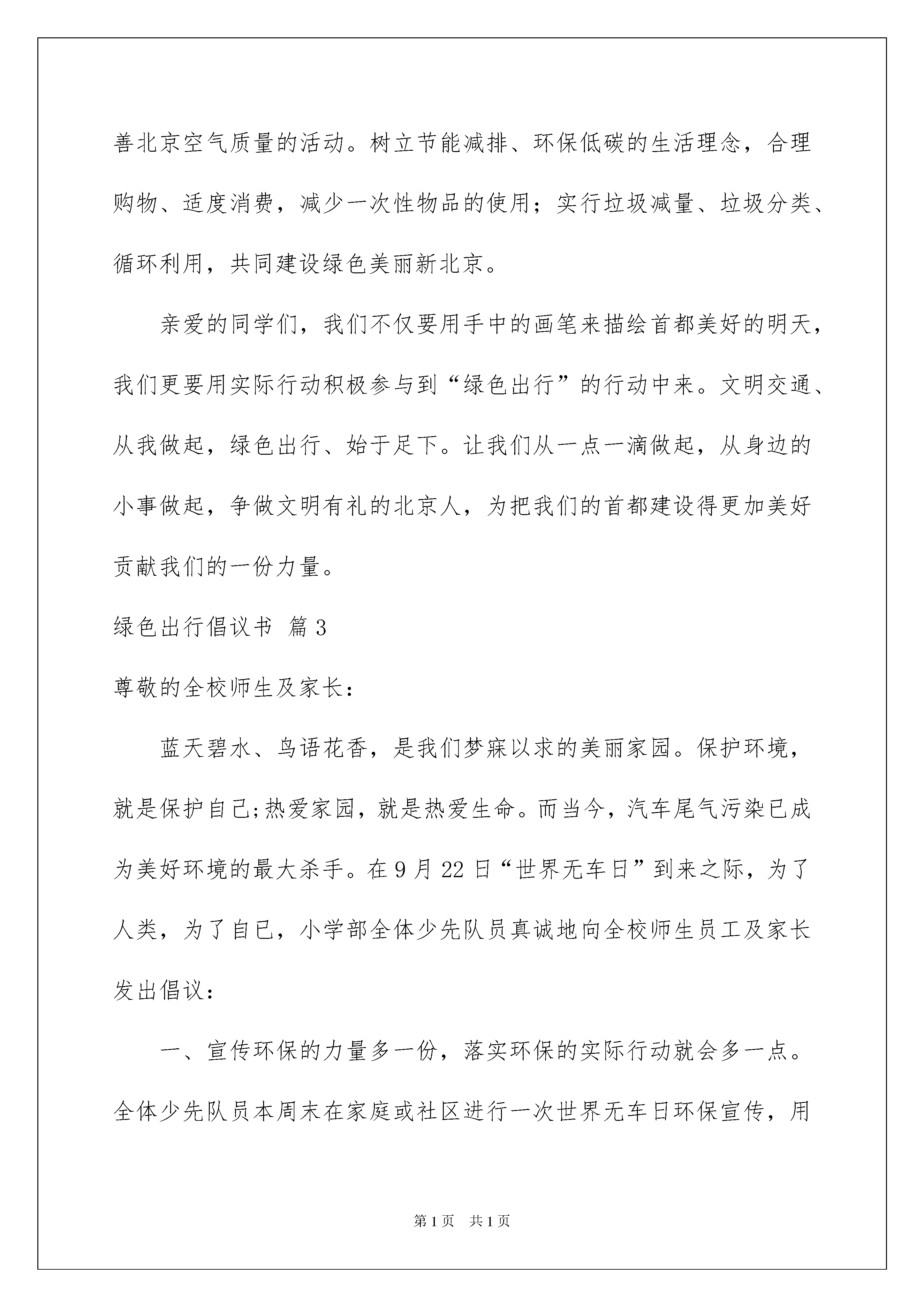 2022绿色出行倡议书合集8篇绿色出行倡议书合集8篇在社会发展不断提速的今天,越来越多地方需要用到倡议书,倡议书具有响应者不确定性的特征。相信许多人会觉得倡议书很难写吧,下面是我整理的绿色出行倡议书9篇,欢迎阅读与收藏。绿色出行倡议书篇1各位老师、同学和家长:今年9月22日,是xx市20xx年城市无车日,本次活动主题为“我们的街道,我们的选择”。“无车日”成为展现现代交通文明理念、推行合理的交通解决方案、表明我们发展绿色交通的态度和决心、展示和校验城市交通政策措施实施效果的重要机会。开展无车日活动,主要目的是:1.宣传优先发展城市公共交通理念,提倡绿色交通,节约能源,保护环境。2.提高城市公共交通服务水平,改善非机动车和步行出行环境。3.提高市民对使用小汽车出行可能带来环境问题和交通拥堵的认识,让市民感受绿色出行对环境改善的作用。4.实现城市交通发展战略转变,促进城市交通科学、和谐和可持续发展。我们学校的宣传活动安排:1.我校利用活动日当天升旗仪式宣传绿色环保交通的观念。2.每个学生要告诉家长积极响应无车日活动,学校门口道路左右各100米范围内禁停接送车辆。3.校园网上通过倡议书宣传绿色出行。4.22世界无车日,解放双脚,不要污染,共建美丽城市!送给大家一首无车日儿歌:徒步出行好天气,不怕堵车不怕挤,省钱节能又瘦身,健步如飞好身体。清新空气放心吸,没有污染无尾气,汽车噪音全不在,心情愉快脚步疾。世界无车日,放下汽车,徒步出行,方便他人,健康自己!20xx年x月x日绿色出行倡议书篇2当前,我们美丽的家园——首都北京正在加快“人文北京、科技北京、绿色北京”和中国特色世界城市的建设步伐,为了表达我们广大中小学生对首都美好未来的期盼、憧憬,为建设首都贡献我们的一份力量,值此“绿色出行、文明交通、爱护环境——中韩少年儿童沙福杯绘画大赛”优秀作品展开幕之际,我们谨代表参加本次绘画大赛的一万多名参赛选手向全市未成年人发出“做文明有礼的北京人——”倡议:1.争当文明小宣传员。在学校、家庭、社会积极主动向自己的`长辈、亲戚、同学、朋友宣传绿色出行、文明交通的理念,宣传健康环保的出行方式,倡导树立低碳、环保、文明意识,携起手来,共同参与到“绿色出行、文明交通”的行动中来。2.争创绿色出行小标兵。积极参与“绿色出行、文明交通、从我做起”实践活动,开展“半小时绿色出行”行动,和家长一起多走路,多乘坐公共交通工具,或者骑自行车出行,倡导合作乘车,文明驾车,为缓解首都的交通拥堵做贡献。3.争做交通文明小使者。增强交通安全意识,遵守交通规则,文明乘车,做到车辆停稳后有序上下车。安全出行,过马路要走人行横道,不闯红灯,不乱穿马路,骑自行车不抢行猛拐。4.倡导绿色生活新风尚。追求绿色生活方式,积极参加有利于改善北京空气质量的活动。树立节能减排、环保低碳的生活理念,合理购物、适度消费,减少一次性物品的使用;实行垃圾减量、垃圾分类、循环利用,共同建设绿色美丽新北京。亲爱的同学们,我们不仅要用手中的画笔来描绘首都美好的明天,我们更要用实际行动积极参与到“绿色出行”的行动中来。文明交通、从我做起,绿色出行、始于足下。让我们从一点一滴做起,从身边的小事做起,争做文明有礼的北京人,为把我们的首都建设得更加美好贡献我们的一份力量。绿色出行倡议书篇3尊敬的全校师生及家长:蓝天碧水、鸟语花香,是我们梦寐以求的美丽家园。保护环境,就是保护自己;热爱家园,就是热爱生命。而当今,汽车尾气污染已成为美好环境的最大杀手。在9月22日“世界无车日”到来之际,为了人类,为了自已,小学部全体少先队员真诚地向全校师生员工及家长发出倡议:一、宣传环保的力量多一份,落实环保的实际行动就会多一点。全体少先队员本周末在家庭或社区进行一次世界无车日环保宣传,用相机或用文字记录下自己的宣传活动。二、自觉响应“9.22世界无车日”活动。从自身做起,自觉参与到环保行动中,公交优先,绿色出行,9月22日有车的教师和家长少开一天车。三、少开一部车,多添一幕绿。减少使用私家汽车,自觉选择公共交通工具,步行或骑自行车出行,尽可能减少机动车的使用次数。良好的环保意识是领袖素质的重要体现。每人向前一小步,文明前进一大步。无车日不仅仅倡导少开一天车,更是倡导所有人多一分环保意识。来吧,亲爱的全校师生及家长们,“世界无车日活动”期待您的参与!美好环境的创造,期待您的努力!小学部大队部XX年9月16日绿色出行倡议书篇420xx年9月22日为世界无车日,为了促进城市交通可持续发展,推动城市交通领域节能减排工作深入开展,苏州市确立本次无车日活动的主题为:绿色交通,城市未来;优先