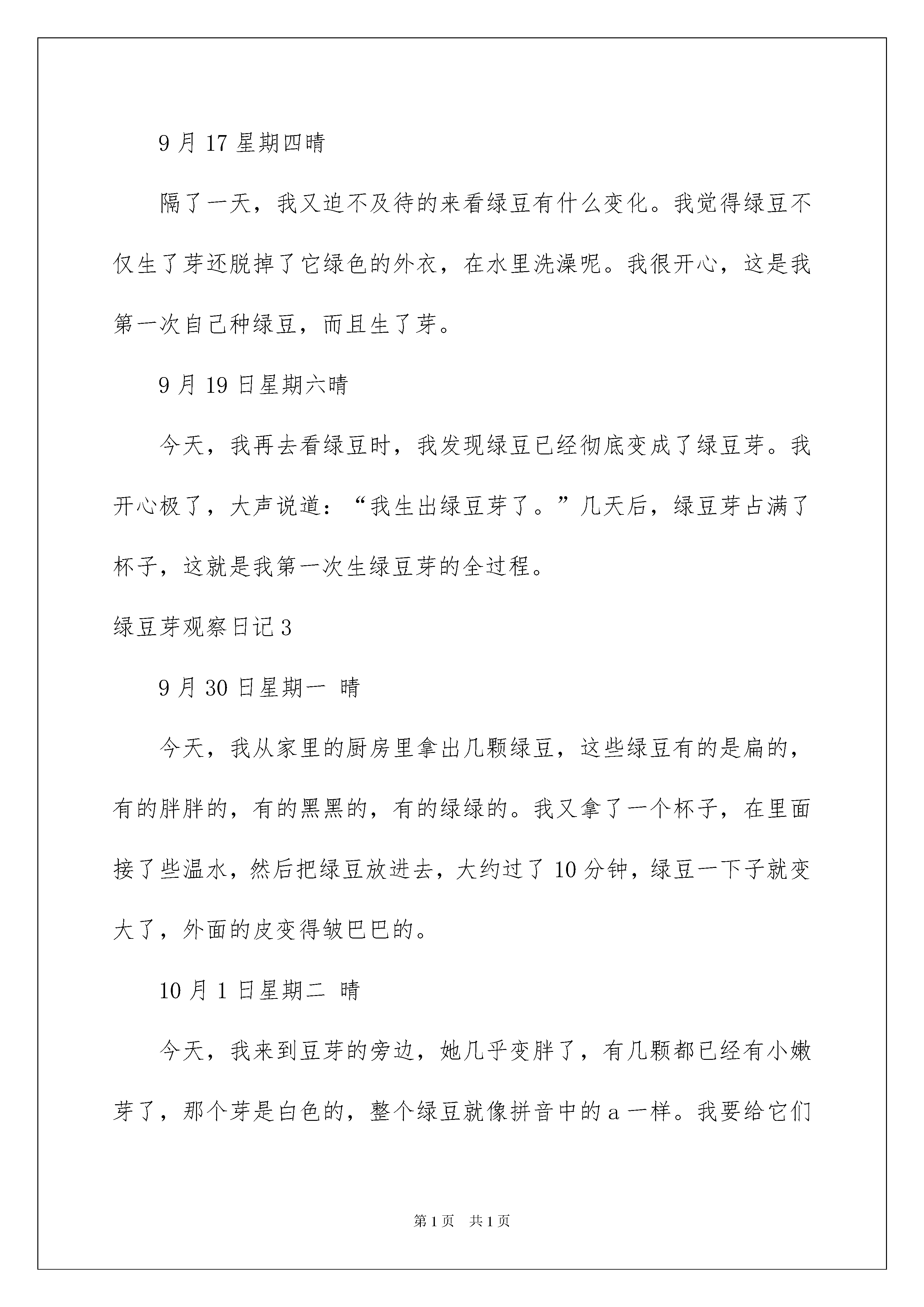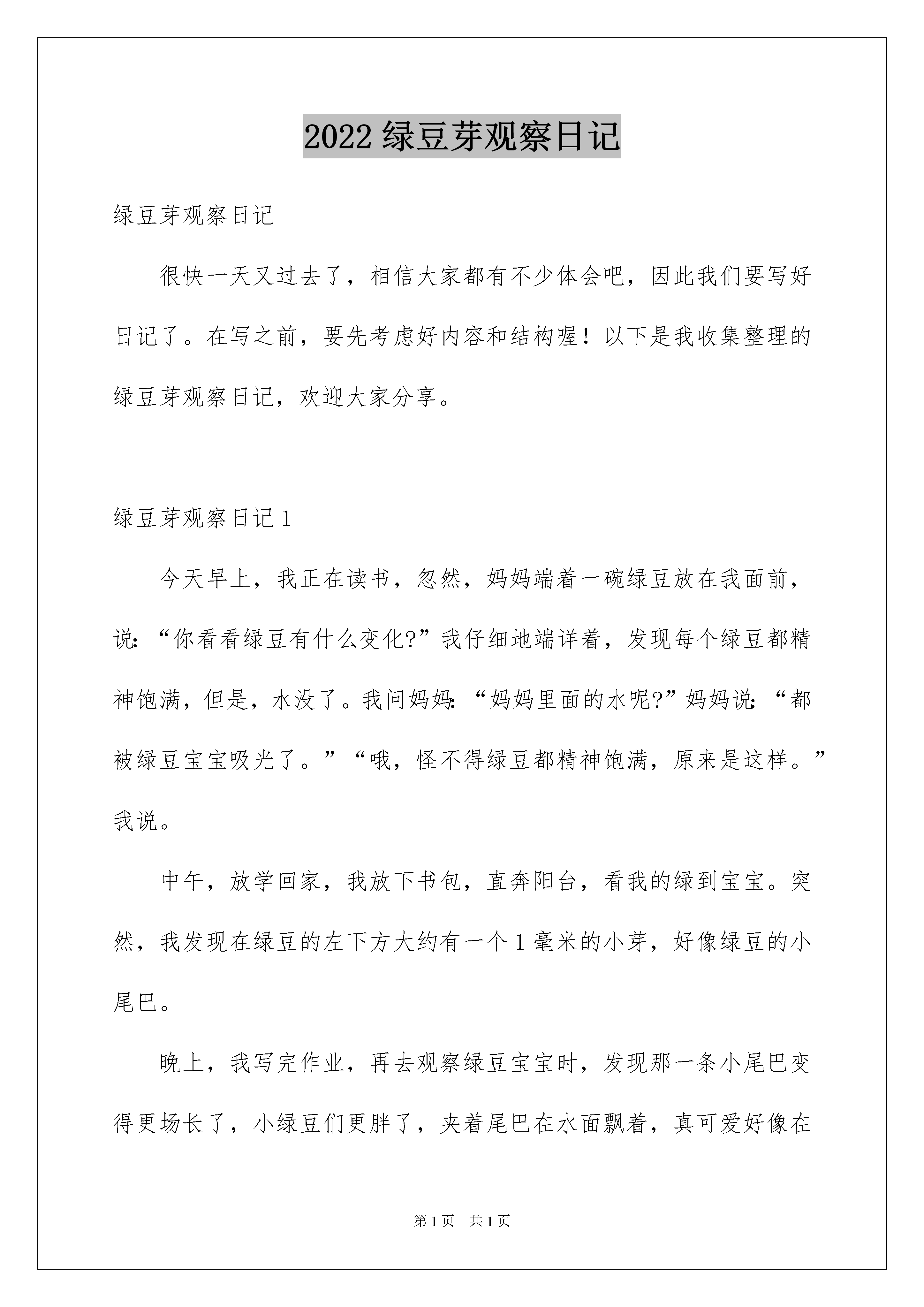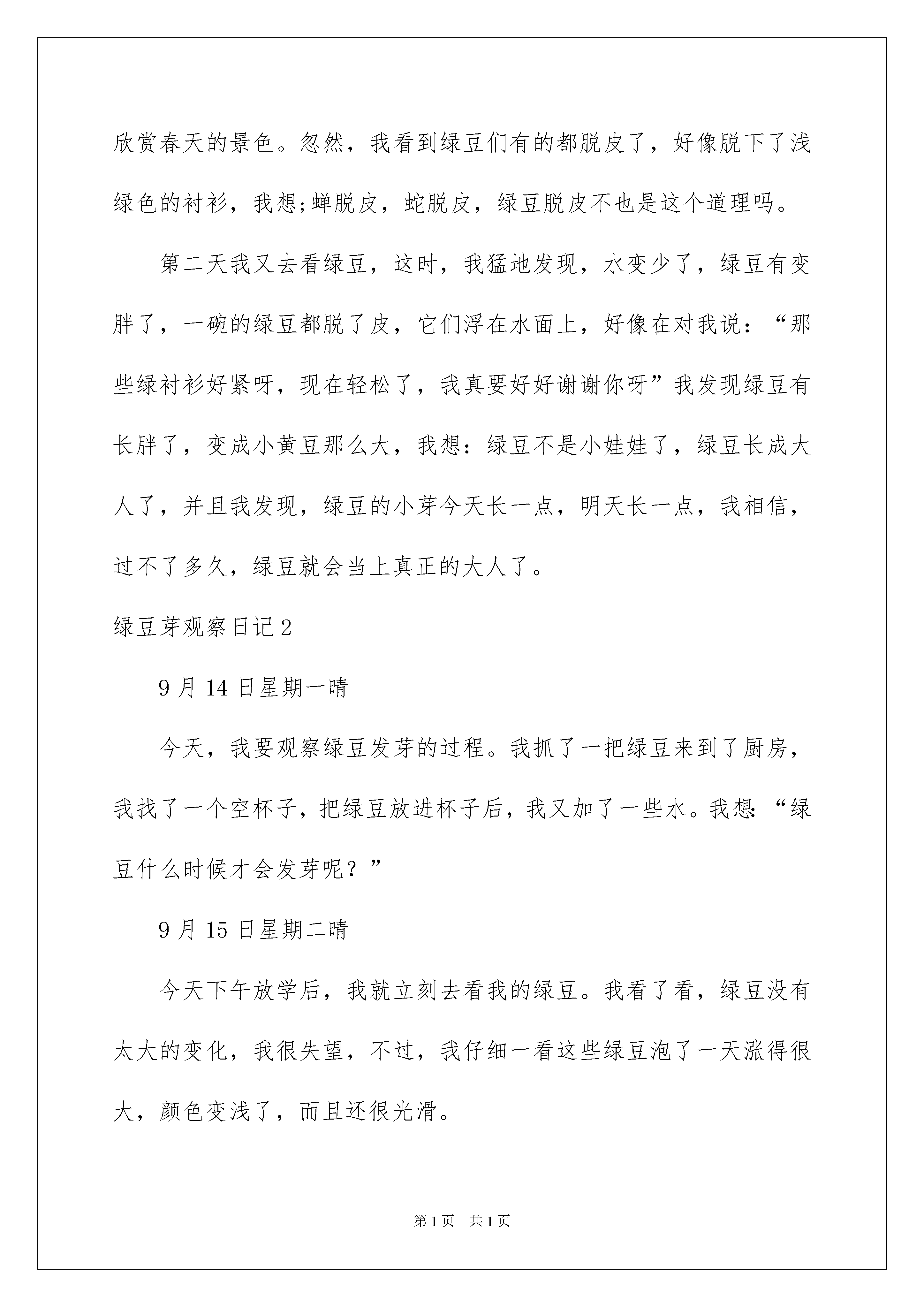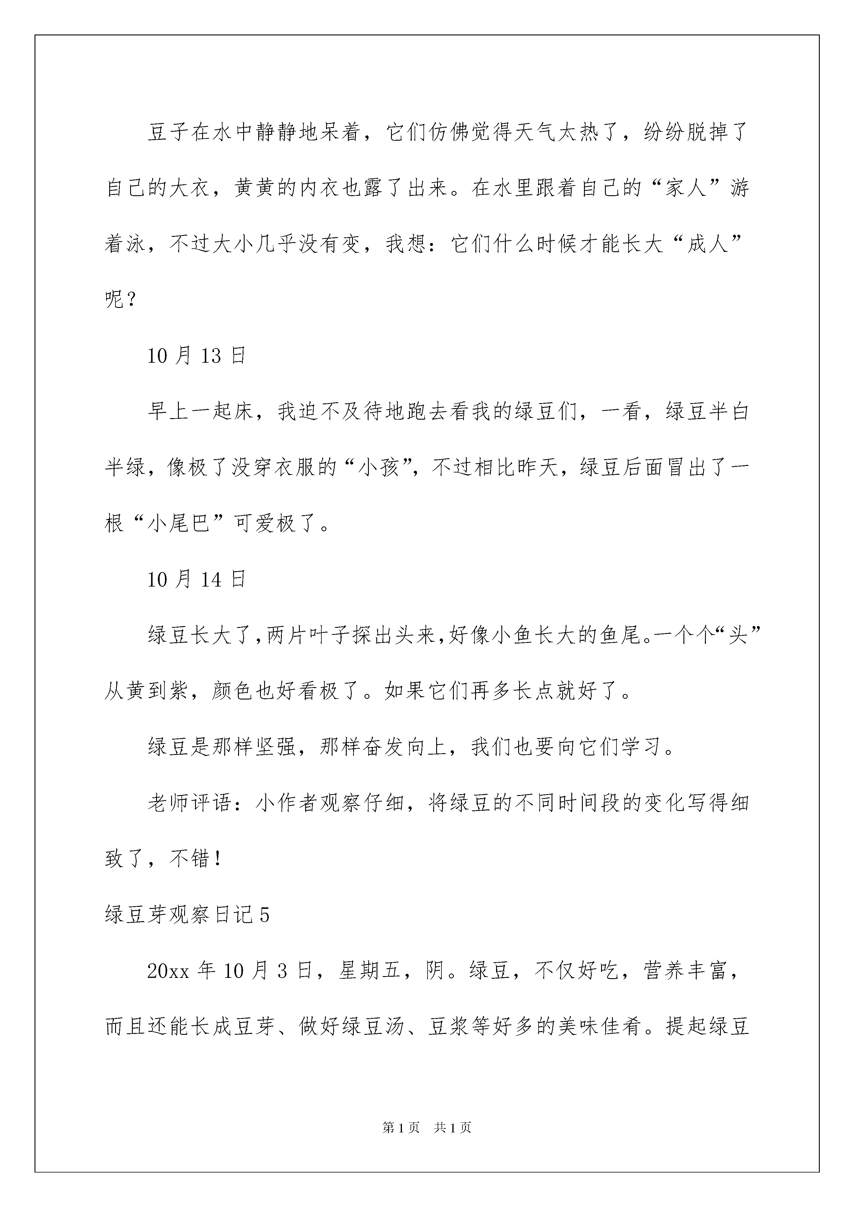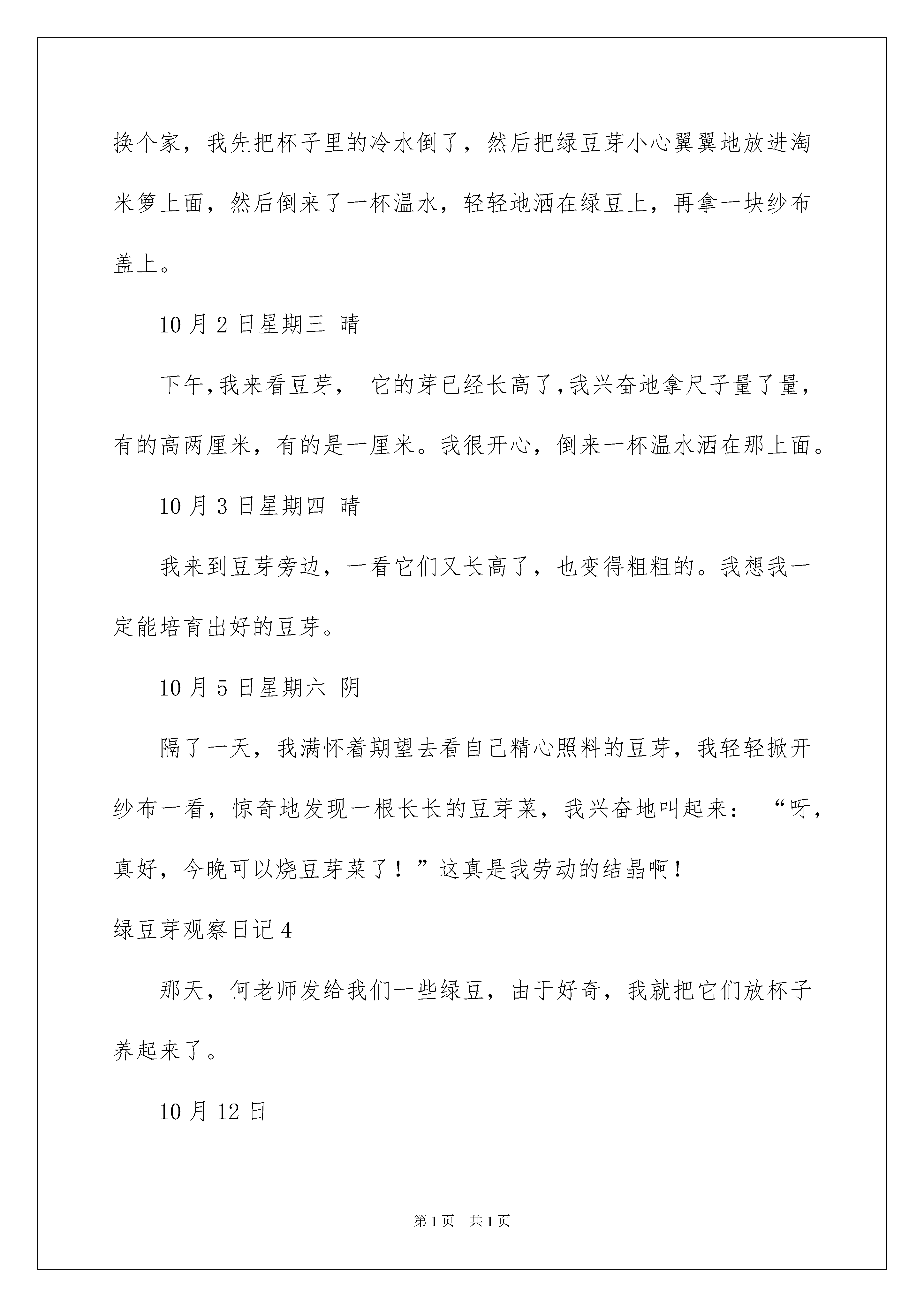 2022绿豆芽观察日记绿豆芽观察日记很快一天又过去了,相信大家都有不少体会吧,因此我们要写好日记了。在写之前,要先考虑好内容和结构喔!以下是我收集整理的绿豆芽观察日记,欢迎大家分享。绿豆芽观察日记1今天早上,我正在读书,忽然,妈妈端着一碗绿豆放在我面前,说:“你看看绿豆有什么变化?”我仔细地端详着,发现每个绿豆都精神饱满,但是,水没了。我问妈妈:“妈妈里面的水呢?”妈妈说:“都被绿豆宝宝吸光了。”“哦,怪不得绿豆都精神饱满,原来是这样。”我说。中午,放学回家,我放下书包,直奔阳台,看我的绿到宝宝。突然,我发现在绿豆的左下方大约有一个1毫米的小芽,好像绿豆的小尾巴。晚上,我写完作业,再去观察绿豆宝宝时,发现那一条小尾巴变得更场长了,小绿豆们更胖了,夹着尾巴在水面飘着,真可爱好像在欣赏春天的景色。忽然,我看到绿豆们有的都脱皮了,好像脱下了浅绿色的衬衫,我想;蝉脱皮,蛇脱皮,绿豆脱皮不也是这个道理吗。第二天我又去看绿豆,这时,我猛地发现,水变少了,绿豆有变胖了,一碗的绿豆都脱了皮,它们浮在水面上,好像在对我说:“那些绿衬衫好紧呀,现在轻松了,我真要好好谢谢你呀”我发现绿豆有长胖了,变成小黄豆那么大,我想:绿豆不是小娃娃了,绿豆长成大人了,并且我发现,绿豆的小芽今天长一点,明天长一点,我相信,过不了多久,绿豆就会当上真正的大人了。绿豆芽观察日记29月14日星期一晴今天,我要观察绿豆发芽的过程。我抓了一把绿豆来到了厨房,我找了一个空杯子,把绿豆放进杯子后,我又加了一些水。我想:“绿豆什么时候才会发芽呢?”9月15日星期二晴今天下午放学后,我就立刻去看我的绿豆。我看了看,绿豆没有太大的变化,我很失望,不过,我仔细一看这些绿豆泡了一天涨得很大,颜色变浅了,而且还很光滑。9月17星期四晴隔了一天,我又迫不及待的来看绿豆有什么变化。我觉得绿豆不仅生了芽还脱掉了它绿色的外衣,在水里洗澡呢。我很开心,这是我第一次自己种绿豆,而且生了芽。9月19日星期六晴今天,我再去看绿豆时,我发现绿豆已经彻底变成了绿豆芽。我开心极了,大声说道:“我生出绿豆芽了。”几天后,绿豆芽占满了杯子,这就是我第一次生绿豆芽的全过程。绿豆芽观察日记39月30日星期一晴今天,我从家里的厨房里拿出几颗绿豆,这些绿豆有的是扁的,有的胖胖的,有的黑黑的,有的绿绿的。我又拿了一个杯子,在里面接了些温水,然后把绿豆放进去,大约过了10分钟,绿豆一下子就变大了,外面的皮变得皱巴巴的。10月1日星期二晴今天,我来到豆芽的旁边,她几乎变胖了,有几颗都已经有小嫩芽了,那个芽是白色的,整个绿豆就像拼音中的a一样。我要给它们换个家,我先把杯子里的冷水倒了,然后把绿豆芽小心翼翼地放进淘米箩上面,然后倒来了一杯温水,轻轻地洒在绿豆上,再拿一块纱布盖上。10月2日星期三晴下午,我来看豆芽,它的芽已经长高了,我兴奋地拿尺子量了量,有的高两厘米,有的是一厘米。我很开心,倒来一杯温水洒在那上面。10月3日星期四晴我来到豆芽旁边,一看它们又长高了,也变得粗粗的。我想我一定能培育出好的豆芽。10月5日星期六阴隔了一天,我满怀着期望去看自己精心照料的豆芽,我轻轻掀开纱布一看,惊奇地发现一根长长的豆芽菜,我兴奋地叫起来:“呀,真好,今晚可以烧豆芽菜了!”这真是我劳动的结晶啊!绿豆芽观察日记4那天,何老师发给我们一些绿豆,由于好奇,我就把它们放杯子养起来了。10月12日豆子在水中静静地呆着,它们仿佛觉得天气太热了,纷纷脱掉了自己的大衣,黄黄的内衣也露了出来。在水里跟着自己的“家人”游着泳,不过大小几乎没有变,我想:它们什么时候才能长大“成人”呢?10月13日早上一起床,我迫不及待地跑去看我的绿豆们,一看,绿豆半白半绿,像极了没穿衣服的“小孩”,不过相比昨天,绿豆后面冒出了一根“小尾巴”可爱极了。10月14日绿豆长大了,两片叶子探出头来,好像小鱼长大的鱼尾。一个个“头”从黄到紫,颜色也好看极了。如果它们再多长点就好了。绿豆是那样坚强,那样奋发向上,我们也要向它们学习。老师评语:小作者观察仔细,将绿豆的不同时间段的变化写得细致了,不错!绿豆芽观察日记520xx年10月3日,星期五,阴。绿豆,不仅好吃,营养丰富,而且还能长成豆芽、做好绿豆汤、豆浆等好多的美味佳肴。提起绿豆芽,我就会想起妈妈做的绿豆芽菜,又香又好吃,吃完后令我回味无穷。今天,我拿了一些绿豆放在杯子里,倒了些水泡上,然后仔细观察它们的变化过程。我把这些小家伙放在手上,仔细看了看,几颗绿豆圆溜溜的,颜色是,腰上还有一个小小的肚脐。我看完,便把它们放进杯子里。几小时后,绿豆变大了。20xx年10月4日,星期六,阴转