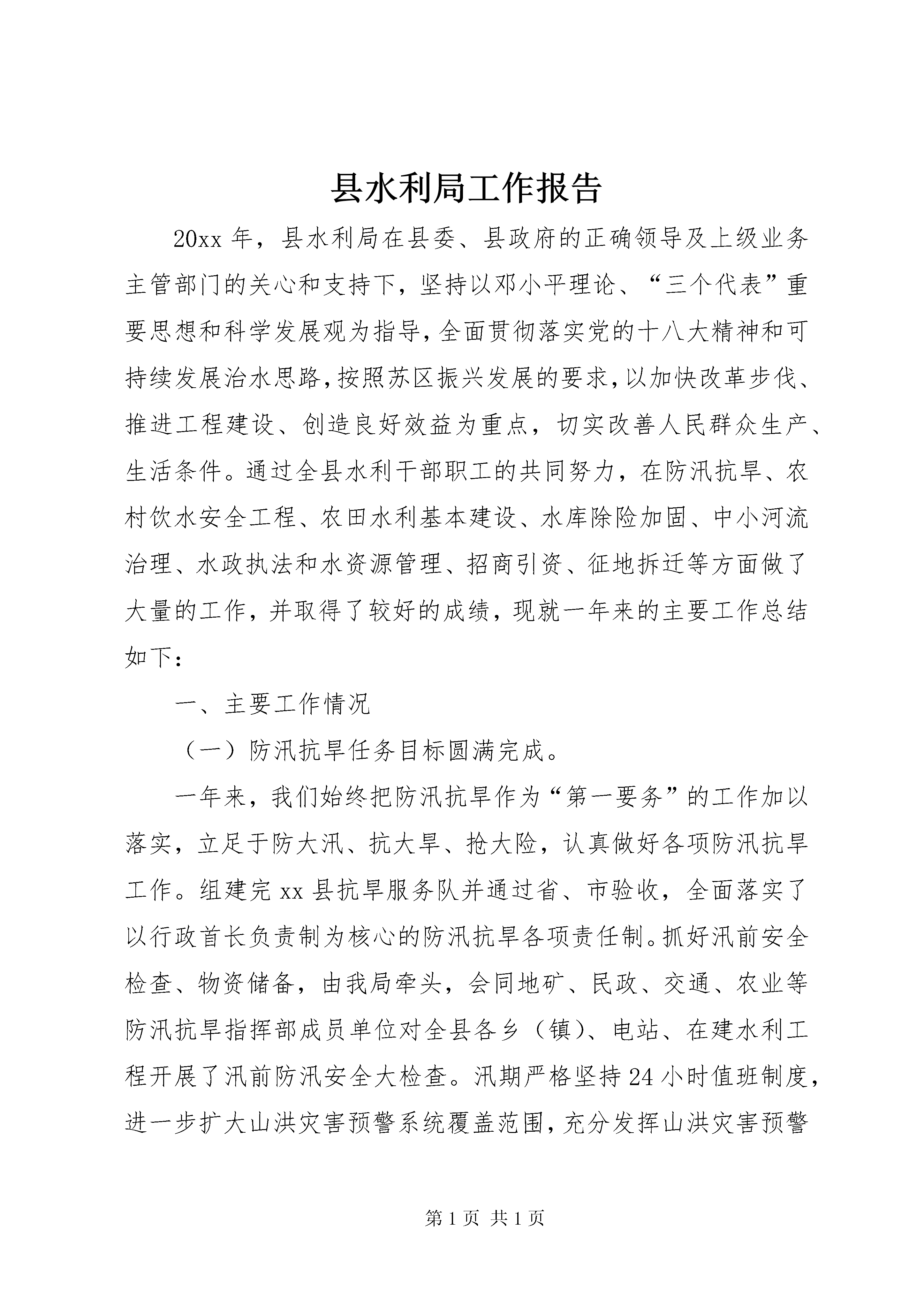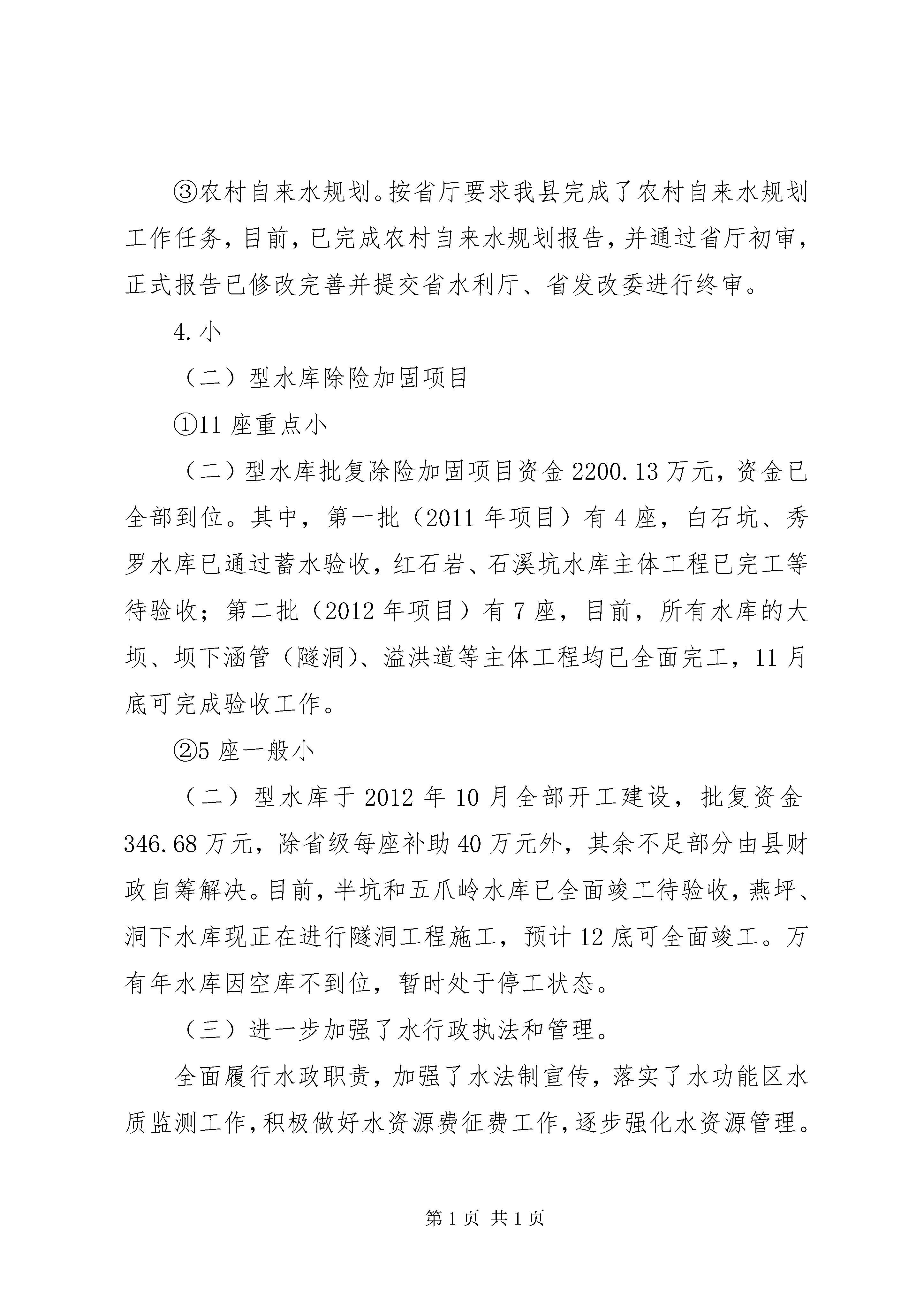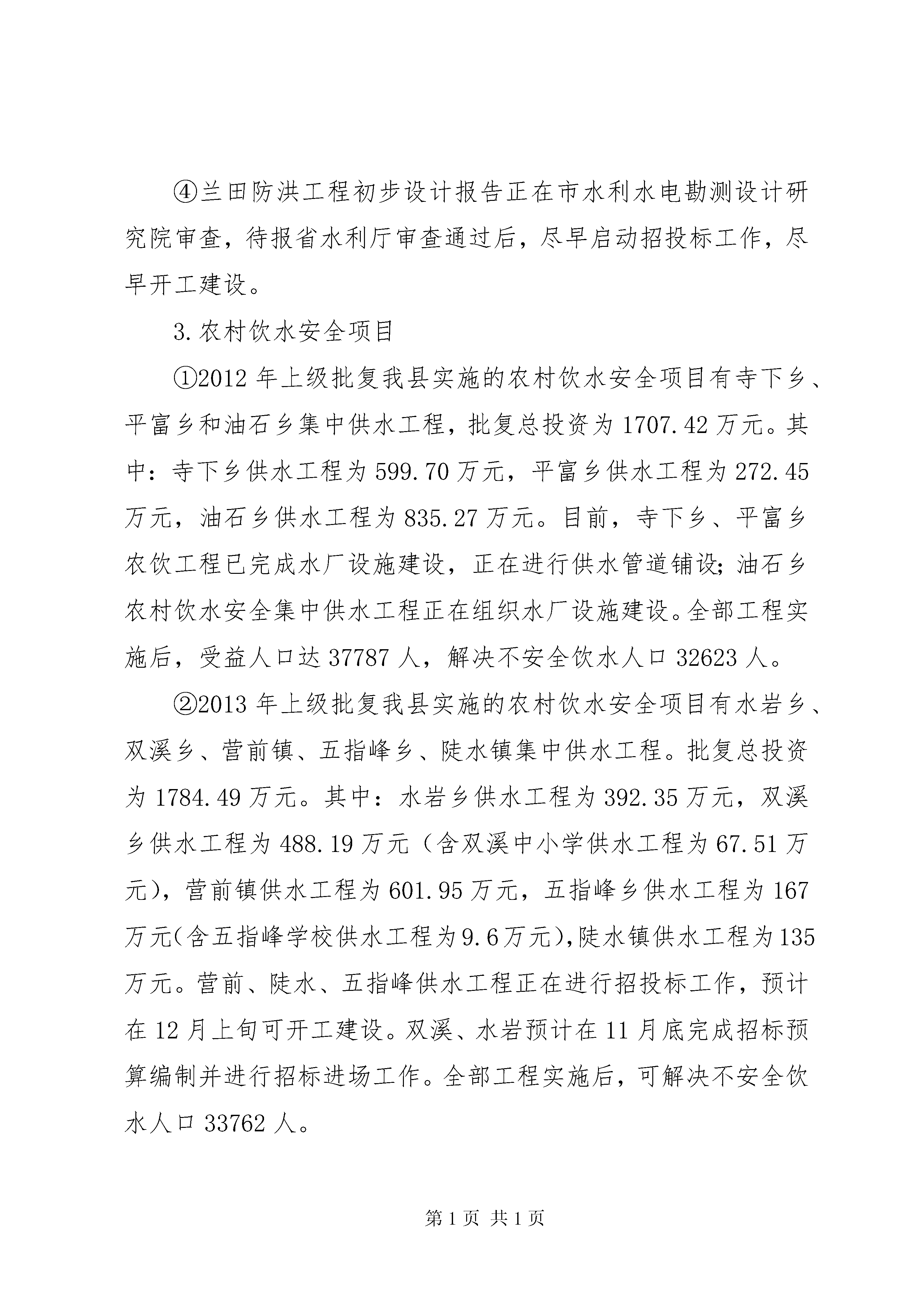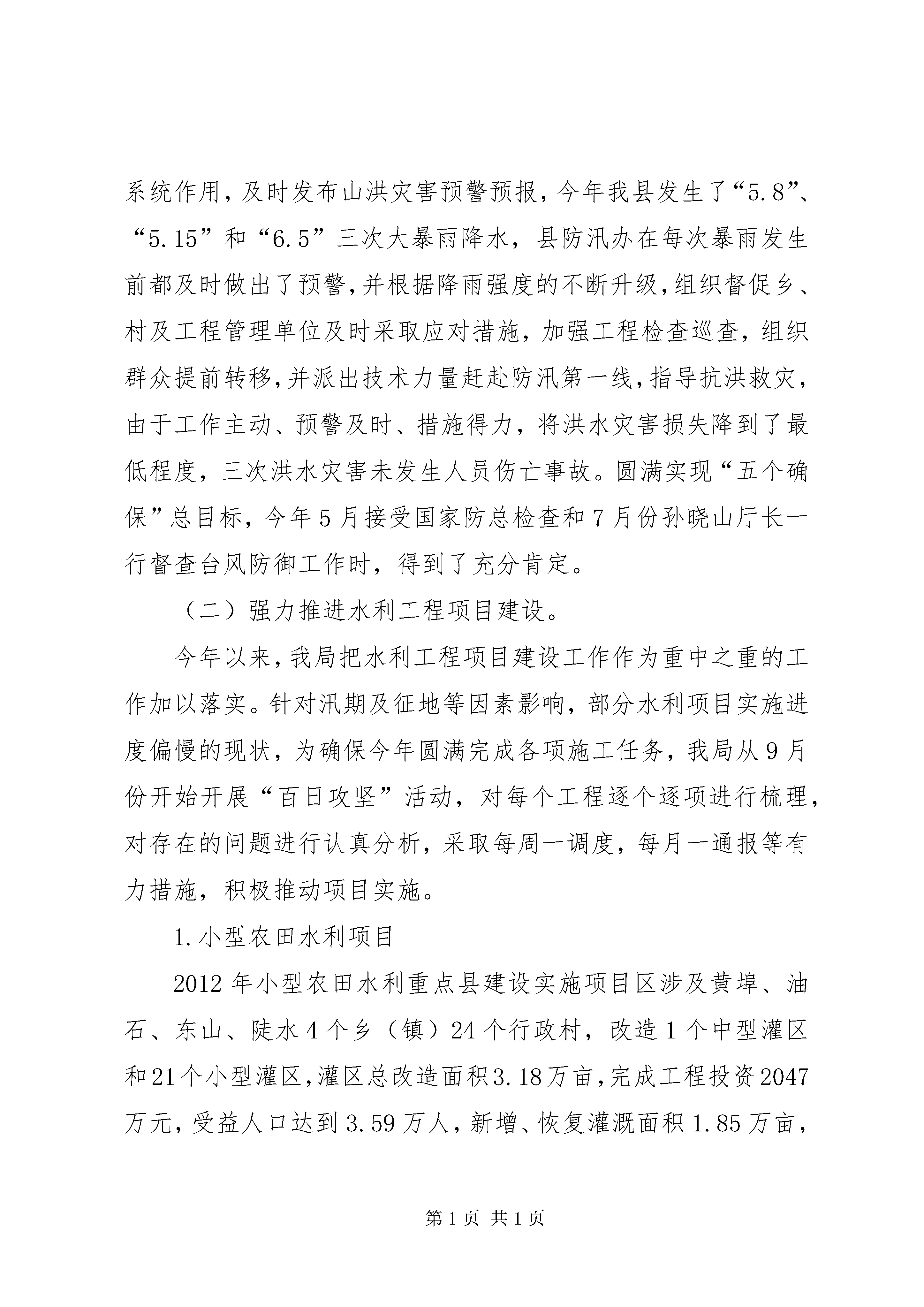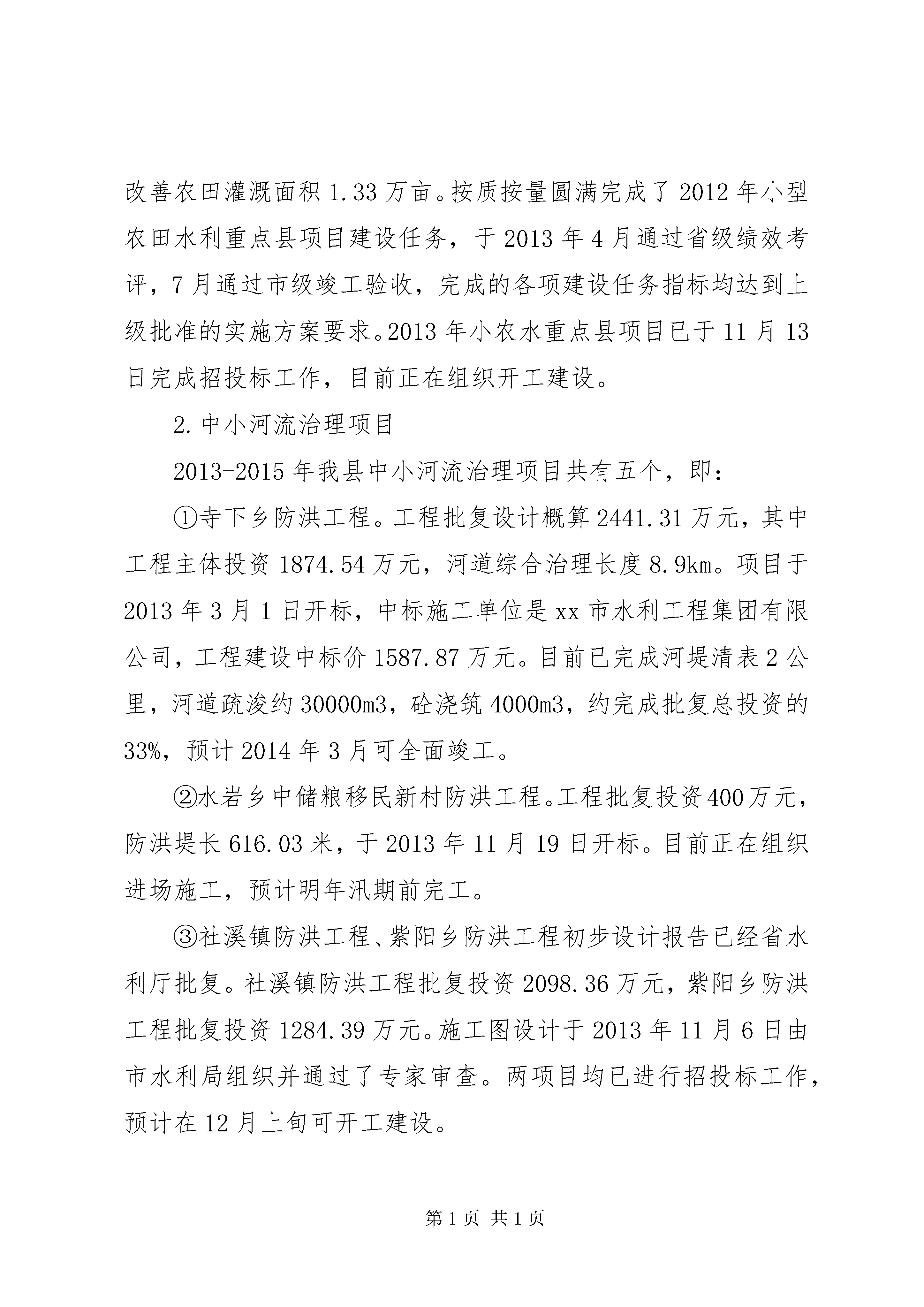 县水利局工作报告20xx年,县水利局在县委、县政府的正确领导及上级业务主管部门的关心和支持下,坚持以邓小平理论、“三个代表”重要思想和科学发展观为指导,全面贯彻落实党的十八大精神和可持续发展治水思路,按照苏区振兴发展的要求,以加快改革步伐、推进工程建设、创造良好效益为重点,切实改善人民群众生产、生活条件。通过全县水利干部职工的共同努力,在防汛抗旱、农村饮水安全工程、农田水利基本建设、水库除险加固、中小河流治理、水政执法和水资源管理、招商引资、征地拆迁等方面做了大量的工作,并取得了较好的成绩,现就一年来的主要工作总结如下:一、主要工作情况(一)防汛抗旱任务目标圆满完成。一年来,我们始终把防汛抗旱作为“第一要务”的工作加以落实,立足于防大汛、抗大旱、抢大险,认真做好各项防汛抗旱工作。组建完xx县抗旱服务队并通过省、市验收,全面落实了以行政首长负责制为核心的防汛抗旱各项责任制。抓好汛前安全检查、物资储备,由我局牵头,会同地矿、民政、交通、农业等防汛抗旱指挥部成员单位对全县各乡(镇)、电站、在建水利工程开展了汛前防汛安全大检查。汛期严格坚持24小时值班制度,进一步扩大山洪灾害预警系统覆盖范围,充分发挥山洪灾害预警系统作用,及时发布山洪灾害预警预报,今年我县发生了“5.8”、“5.15”和“6.5”三次大暴雨降水,县防汛办在每次暴雨发生前都及时做出了预警,并根据降雨强度的不断升级,组织督促乡、村及工程管理单位及时采取应对措施,加强工程检查巡查,组织群众提前转移,并派出技术力量赶赴防汛第一线,指导抗洪救灾,由于工作主动、预警及时、措施得力,将洪水灾害损失降到了最低程度,三次洪水灾害未发生人员伤亡事故。圆满实现“五个确保”总目标,今年5月接受国家防总检查和7月份孙晓山厅长一行督查台风防御工作时,得到了充分肯定。(二)强力推进水利工程项目建设。今年以来,我局把水利工程项目建设工作作为重中之重的工作加以落实。针对汛期及征地等因素影响,部分水利项目实施进度偏慢的现状,为确保今年圆满完成各项施工任务,我局从9月份开始开展“百日攻坚”活动,对每个工程逐个逐项进行梳理,对存在的问题进行认真分析,采取每周一调度,每月一通报等有力措施,积极推动项目实施。1.小型农田水利项目2012年小型农田水利重点县建设实施项目区涉及黄埠、油石、东山、陡水4个乡(镇)24个行政村,改造1个中型灌区和21个小型灌区,灌区总改造面积3.18万亩,完成工程投资2047万元,受益人口达到3.59万人,新增、恢复灌溉面积1.85万亩,改善农田灌溉面积1.33万亩。按质按量圆满完成了2012年小型农田水利重点县项目建设任务,于2013年4月通过省级绩效考评,7月通过市级竣工验收,完成的各项建设任务指标均达到上级批准的实施方案要求。2013年小农水重点县项目已于11月13日完成招投标工作,目前正在组织开工建设。2.中小河流治理项目2013-2015年我县中小河流治理项目共有五个,即:①寺下乡防洪工程。工程批复设计概算2441.31万元,其中工程主体投资1874.54万元,河道综合治理长度8.9km。项目于2013年3月1日开标,中标施工单位是xx市水利工程集团有限公司,工程建设中标价1587.87万元。目前已完成河堤清表2公里,河道疏浚约30000m3,砼浇筑4000m3,约完成批复总投资的33%,预计2014年3月可全面竣工。②水岩乡中储粮移民新村防洪工程。工程批复投资400万元,防洪堤长616.03米,于2013年11月19日开标。目前正在组织进场施工,预计明年汛期前完工。③社溪镇防洪工程、紫阳乡防洪工程初步设计报告已经省水利厅批复。社溪镇防洪工程批复投资2098.36万元,紫阳乡防洪工程批复投资1284.39万元。施工图设计于2013年11月6日由市水利局组织并通过了专家审查。两项目均已进行招投标工作,预计在12月上旬可开工建设。④兰田防洪工程初步设计报告正在市水利水电勘测设计研究院审查,待报省水利厅审查通过后,尽早启动招投标工作,尽早开工建设。3.农村饮水安全项目①2012年上级批复我县实施的农村饮水安全项目有寺下乡、平富乡和油石乡集中供水工程,批复总投资为1707.42万元。其中:寺下乡供水工程为599.70万元,平富乡供水工程为272.45万元,油石乡供水工程为835.27万元。目前,寺下乡、平富乡农饮工程已完成水厂设施建设,正在进行供水管道铺设;油石乡农村饮水安全集中供水工程正在组织水厂设施建设。全部工程实施后,受益人口达37787人,解决不安全饮水人口32623人。②2013年上级批复我县实施的农村饮水安全项目有水岩乡、双溪乡、营前镇、五指峰乡、陡水镇集中供水工程。批复总投资为1784.49万元。其中:水岩乡供水工程为392.35万元,双溪乡供