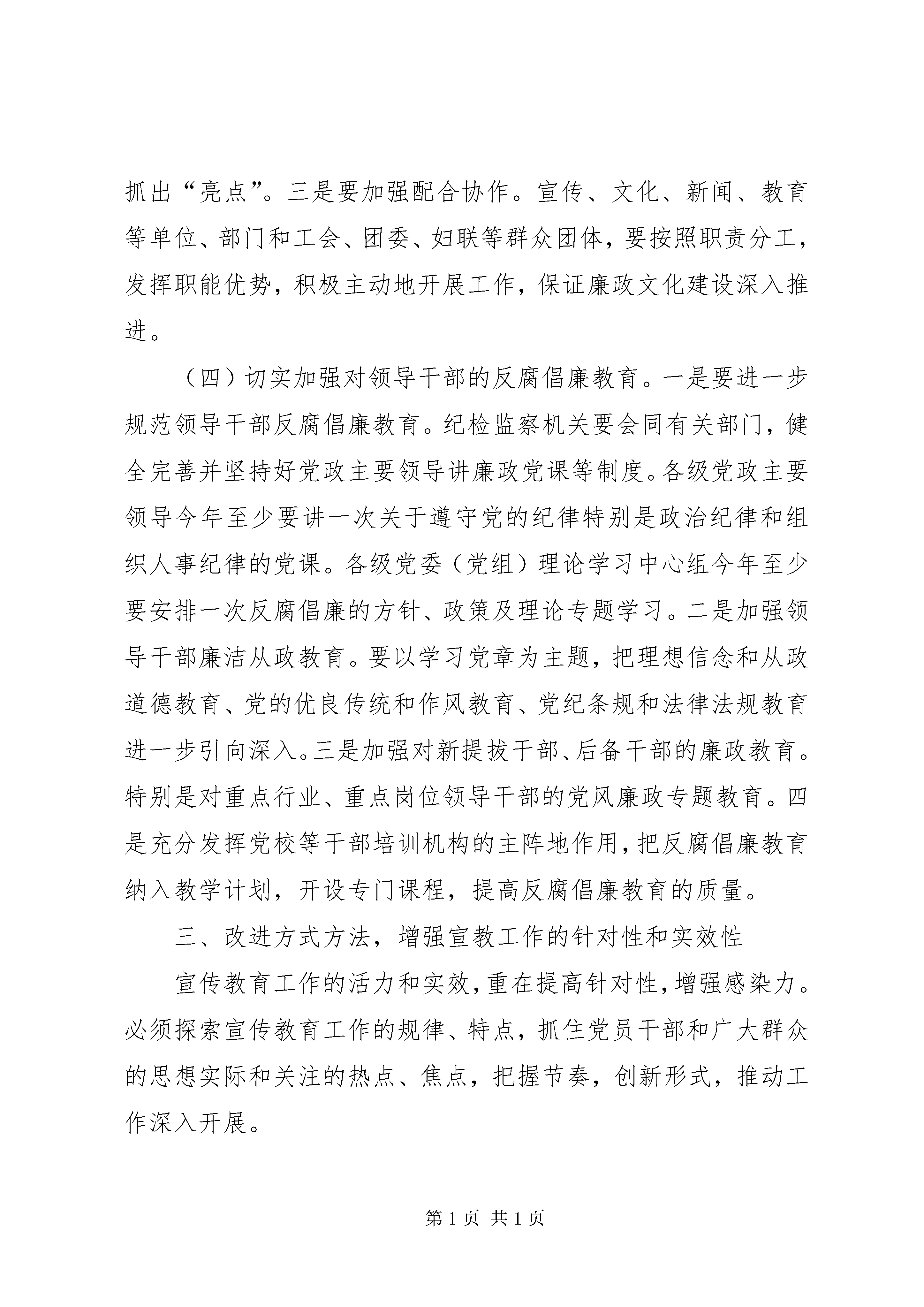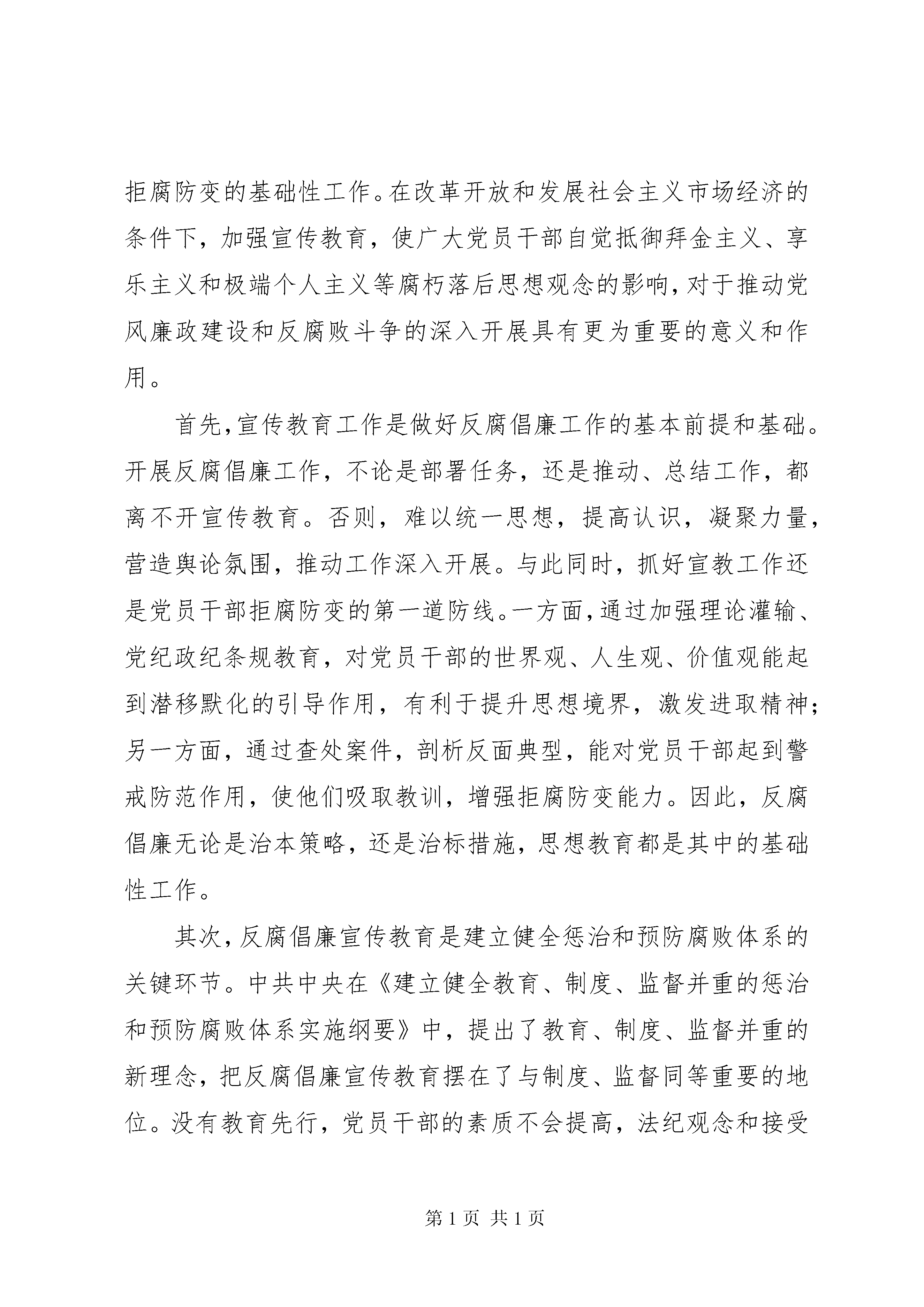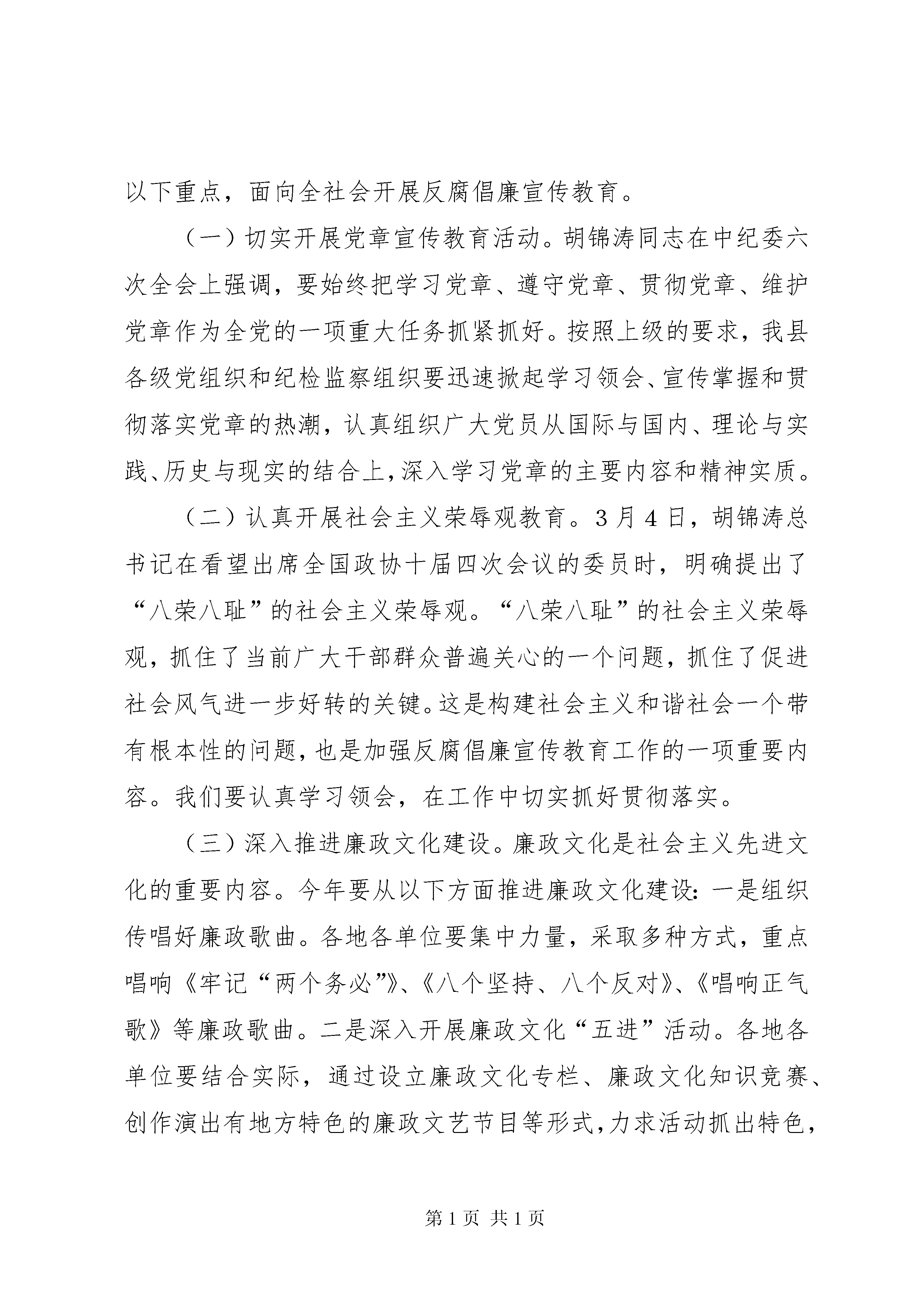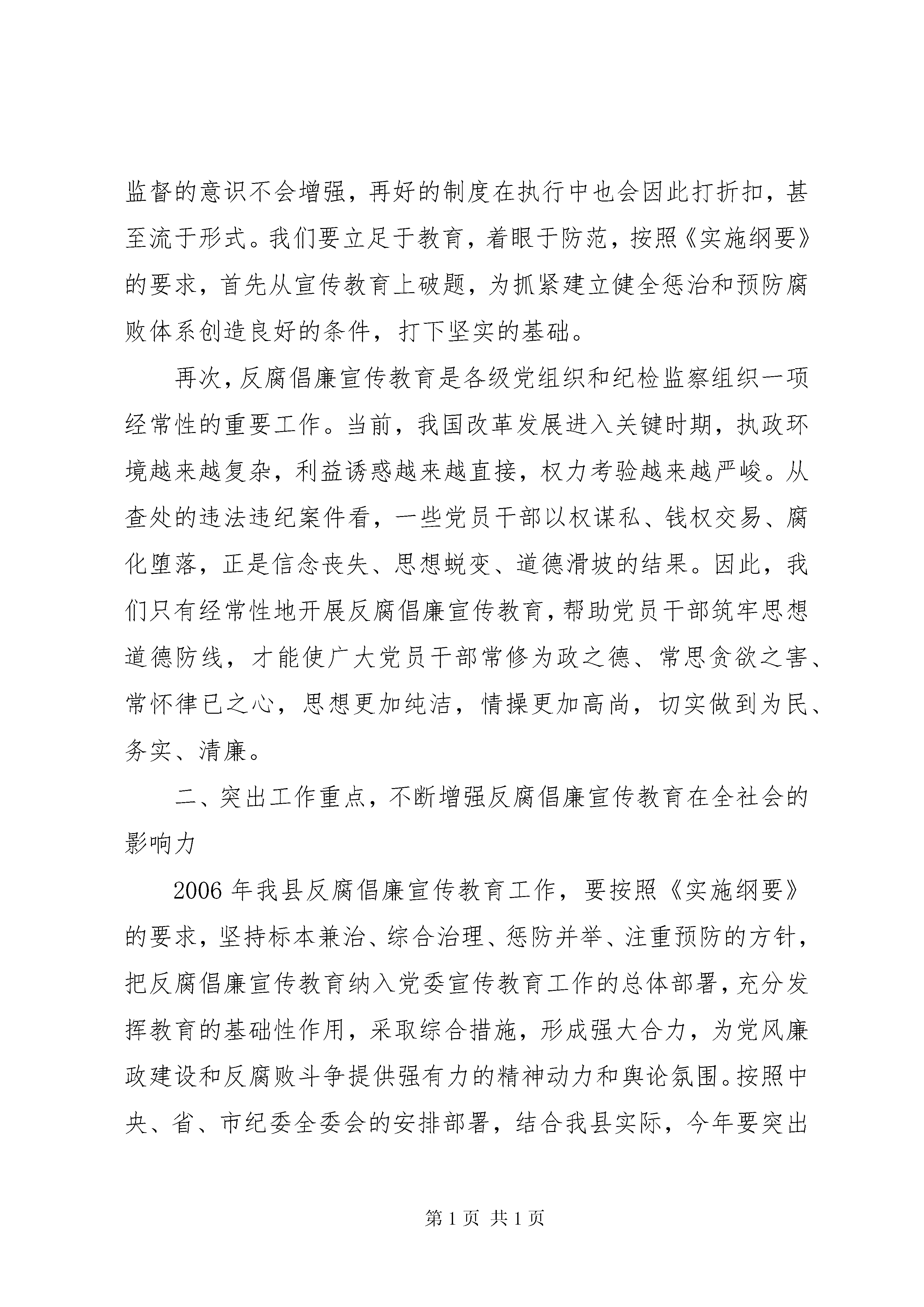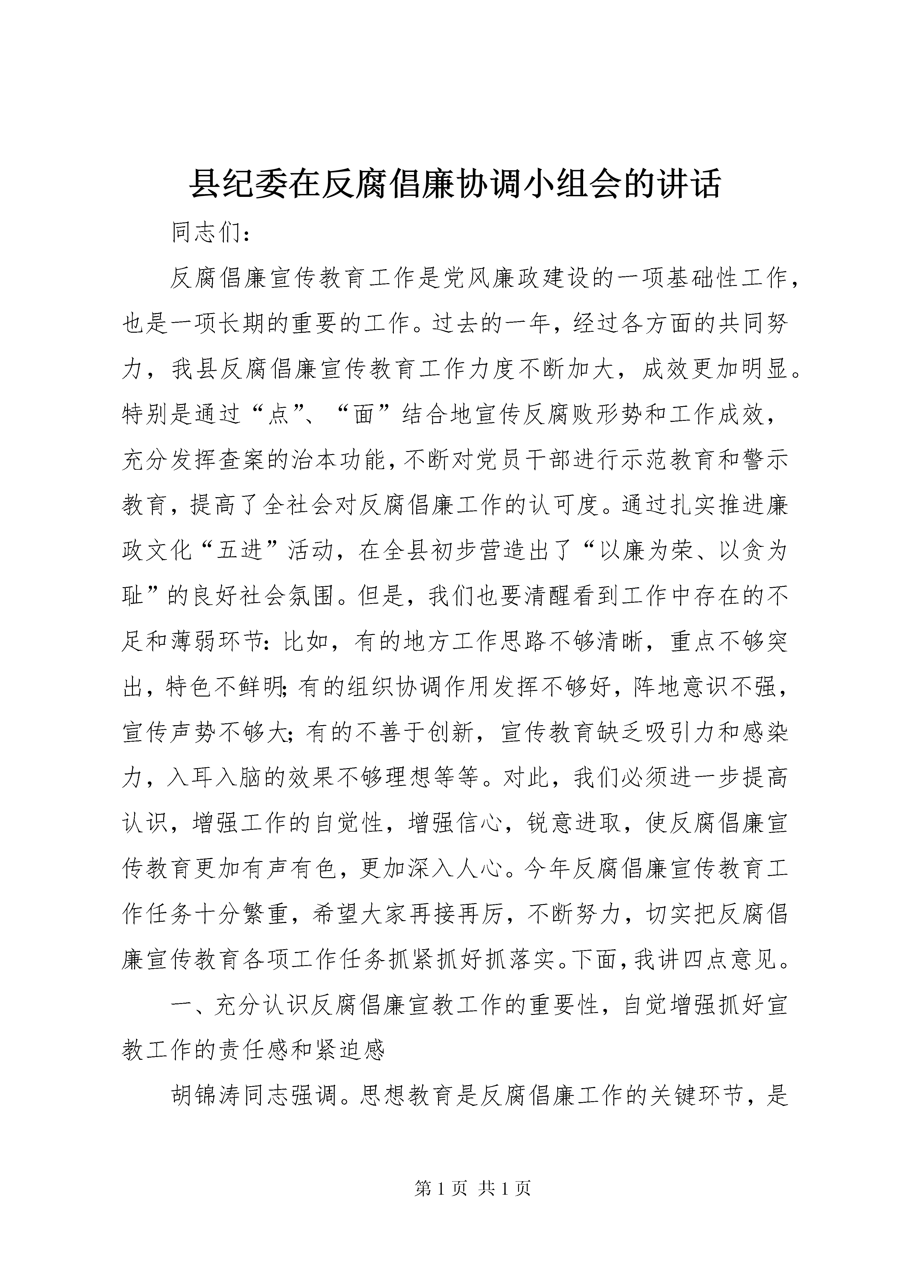 县纪委在反腐倡廉协调小组会的讲话同志们:反腐倡廉宣传教育工作是党风廉政建设的一项基础性工作,也是一项长期的重要的工作。过去的一年,经过各方面的共同努力,我县反腐倡廉宣传教育工作力度不断加大,成效更加明显。特别是通过“点”、“面”结合地宣传反腐败形势和工作成效,充分发挥查案的治本功能,不断对党员干部进行示范教育和警示教育,提高了全社会对反腐倡廉工作的认可度。通过扎实推进廉政文化“五进”活动,在全县初步营造出了“以廉为荣、以贪为耻”的良好社会氛围。但是,我们也要清醒看到工作中存在的不足和薄弱环节:比如,有的地方工作思路不够清晰,重点不够突出,特色不鲜明;有的组织协调作用发挥不够好,阵地意识不强,宣传声势不够大;有的不善于创新,宣传教育缺乏吸引力和感染力,入耳入脑的效果不够理想等等。对此,我们必须进一步提高认识,增强工作的自觉性,增强信心,锐意进取,使反腐倡廉宣传教育更加有声有色,更加深入人心。今年反腐倡廉宣传教育工作任务十分繁重,希望大家再接再厉,不断努力,切实把反腐倡廉宣传教育各项工作任务抓紧抓好抓落实。下面,我讲四点意见。一、充分认识反腐倡廉宣教工作的重要性,自觉增强抓好宣教工作的责任感和紧迫感胡锦涛同志强调。思想教育是反腐倡廉工作的关键环节,是拒腐防变的基础性工作。在改革开放和发展社会主义市场经济的条件下,加强宣传教育,使广大党员干部自觉抵御拜金主义、享乐主义和极端个人主义等腐朽落后思想观念的影响,对于推动党风廉政建设和反腐败斗争的深入开展具有更为重要的意义和作用。首先,宣传教育工作是做好反腐倡廉工作的基本前提和基础。开展反腐倡廉工作,不论是部署任务,还是推动、总结工作,都离不开宣传教育。否则,难以统一思想,提高认识,凝聚力量,营造舆论氛围,推动工作深入开展。与此同时,抓好宣教工作还是党员干部拒腐防变的第一道防线。一方面,通过加强理论灌输、党纪政纪条规教育,对党员干部的世界观、人生观、价值观能起到潜移默化的引导作用,有利于提升思想境界,激发进取精神;另一方面,通过查处案件,剖析反面典型,能对党员干部起到警戒防范作用,使他们吸取教训,增强拒腐防变能力。因此,反腐倡廉无论是治本策略,还是治标措施,思想教育都是其中的基础性工作。其次,反腐倡廉宣传教育是建立健全惩治和预防腐败体系的关键环节。中共中央在《建立健全教育、制度、监督并重的惩治和预防腐败体系实施纲要》中,提出了教育、制度、监督并重的新理念,把反腐倡廉宣传教育摆在了与制度、监督同等重要的地位。没有教育先行,党员干部的素质不会提高,法纪观念和接受监督的意识不会增强,再好的制度在执行中也会因此打折扣,甚至流于形式。我们要立足于教育,着眼于防范,按照《实施纲要》的要求,首先从宣传教育上破题,为抓紧建立健全惩治和预防腐败体系创造良好的条件,打下坚实的基础。再次,反腐倡廉宣传教育是各级党组织和纪检监察组织一项经常性的重要工作。当前,我国改革发展进入关键时期,执政环境越来越复杂,利益诱惑越来越直接,权力考验越来越严峻。从查处的违法违纪案件看,一些党员干部以权谋私、钱权交易、腐化堕落,正是信念丧失、思想蜕变、道德滑坡的结果。因此,我们只有经常性地开展反腐倡廉宣传教育,帮助党员干部筑牢思想道德防线,才能使广大党员干部常修为政之德、常思贪欲之害、常怀律已之心,思想更加纯洁,情操更加高尚,切实做到为民、务实、清廉。二、突出工作重点,不断增强反腐倡廉宣传教育在全社会的影响力2006年我县反腐倡廉宣传教育工作,要按照《实施纲要》的要求,坚持标本兼治、综合治理、惩防并举、注重预防的方针,把反腐倡廉宣传教育纳入党委宣传教育工作的总体部署,充分发挥教育的基础性作用,采取综合措施,形成强大合力,为党风廉政建设和反腐败斗争提供强有力的精神动力和舆论氛围。按照中央、省、市纪委全委会的安排部署,结合我县实际,今年要突出以下重点,面向全社会开展反腐倡廉宣传教育。(一)切实开展党章宣传教育活动。胡锦涛同志在中纪委六次全会上强调,要始终把学习党章、遵守党章、贯彻党章、维护党章作为全党的一项重大任务抓紧抓好。按照上级的要求,我县各级党组织和纪检监察组织要迅速掀起学习领会、宣传掌握和贯彻落实党章的热潮,认真组织广大党员从国际与国内、理论与实践、历史与现实的结合上,深入学习党章的主要内容和精神实质。(二)认真开展社会主义荣辱观教育。3月4日,胡锦涛总书记在看望出席全国政协十届四次会议的委员时,明确提出了“八荣八耻”的社会主义荣辱观。“八荣八耻”的社会主义荣辱观,抓住了当前广大干部群众普遍关心的一个问题,抓住了促进社会风气进一步好转的关键。这是构建社会主义和谐社会一个带有根本性的问题,也是加强反腐倡廉宣传教育工作的一项重要内容。我们要认真学习领会,在工作中切实抓好贯彻落实。(三)深入推进廉政文化建设。