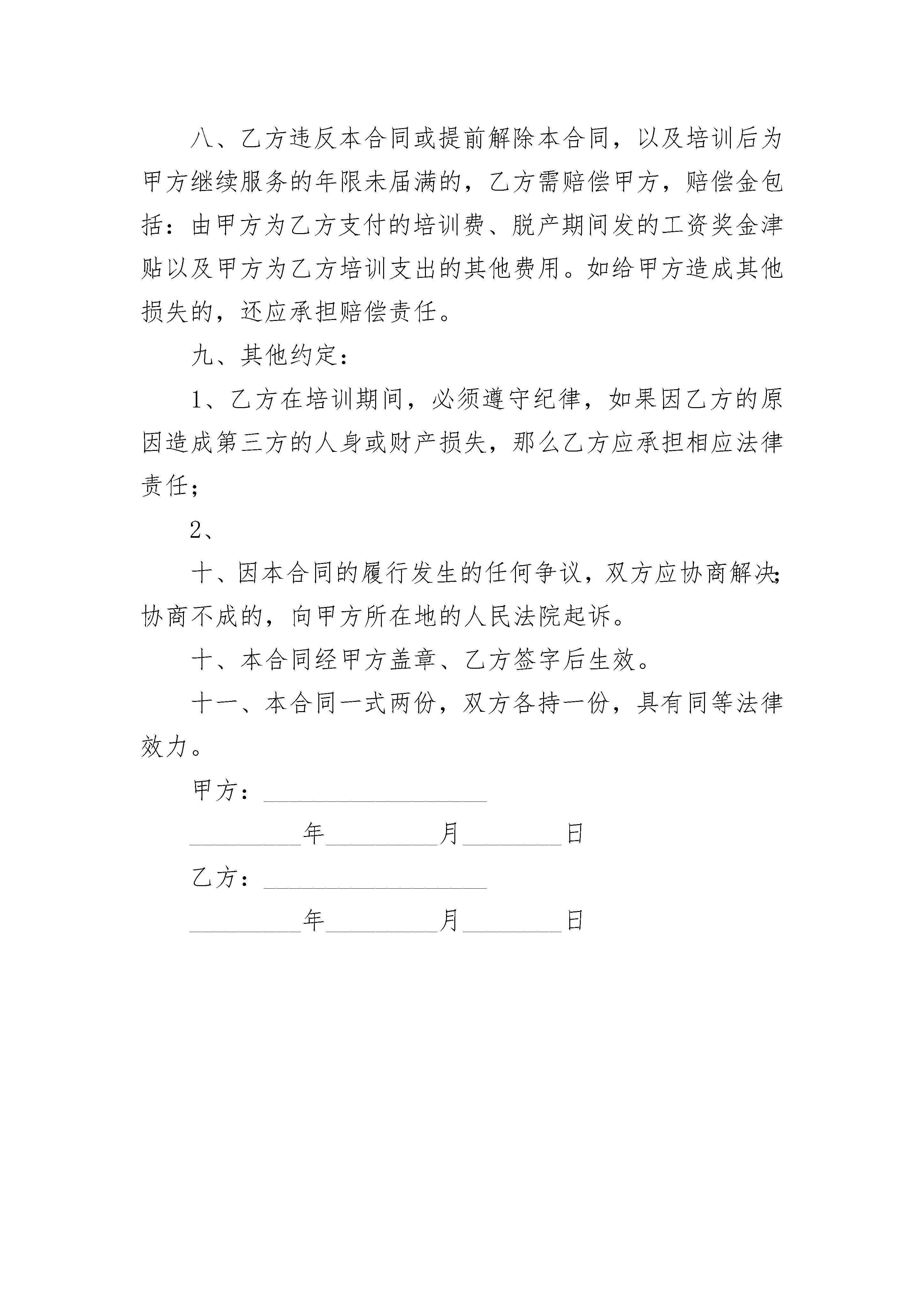 员工培训合同范本员工培训合同范本甲方(单位):乙方(员工):甲方因工作需要,决定派乙方参加培训。现根据劳动法及本单位的有关规定,经双方充分协商,达成协议如下:一、参加培训的时间从年月日起,至年月日止。二、培训地点:三、培训形式为以下第种:1、全脱产学习;2、半脱产学习;3、非脱产学习。四、培训费支付。培训费共计人民币元。由甲方负责承担%,即人民币元;由乙方负责承担%,即人民币元。培训所需的交通费由乙方负责。培训期间的生活费等费用由负责。五、在乙方培训期间的,甲方支付:1.基本工资:□原基本工资的%□不计发;2.岗位工资:□原岗位工资的%□不计发;3.其他工资奖金补贴:□□不计发。六、乙方通过培训后,未取得合格成绩者,培训费用全部由乙方承担。七、由甲方提供经费、时间的培训,乙方必须在完成培训后为甲方继续服务年。八、乙方违反本合同或提前解除本合同,以及培训后为甲方继续服务的年限未届满的,乙方需赔偿甲方,赔偿金包括:由甲方为乙方支付的培训费、脱产期间发的工资奖金津贴以及甲方为乙方培训支出的其他费用。如给甲方造成其他损失的,还应承担赔偿责任。九、其他约定:1、乙方在培训期间,必须遵守纪律,如果因乙方的原因造成第三方的人身或财产损失,那么乙方应承担相应法律责任;2、十、因本合同的履行发生的任何争议,双方应协商解决;协商不成的,向甲方所在地的人民法院起诉。十、本合同经甲方盖章、乙方签字后生效。十一、本合同一式两份,双方各持一份,具有同等法律效力。甲方:___________________________年_________月________日乙方:___________________________年_________月________日