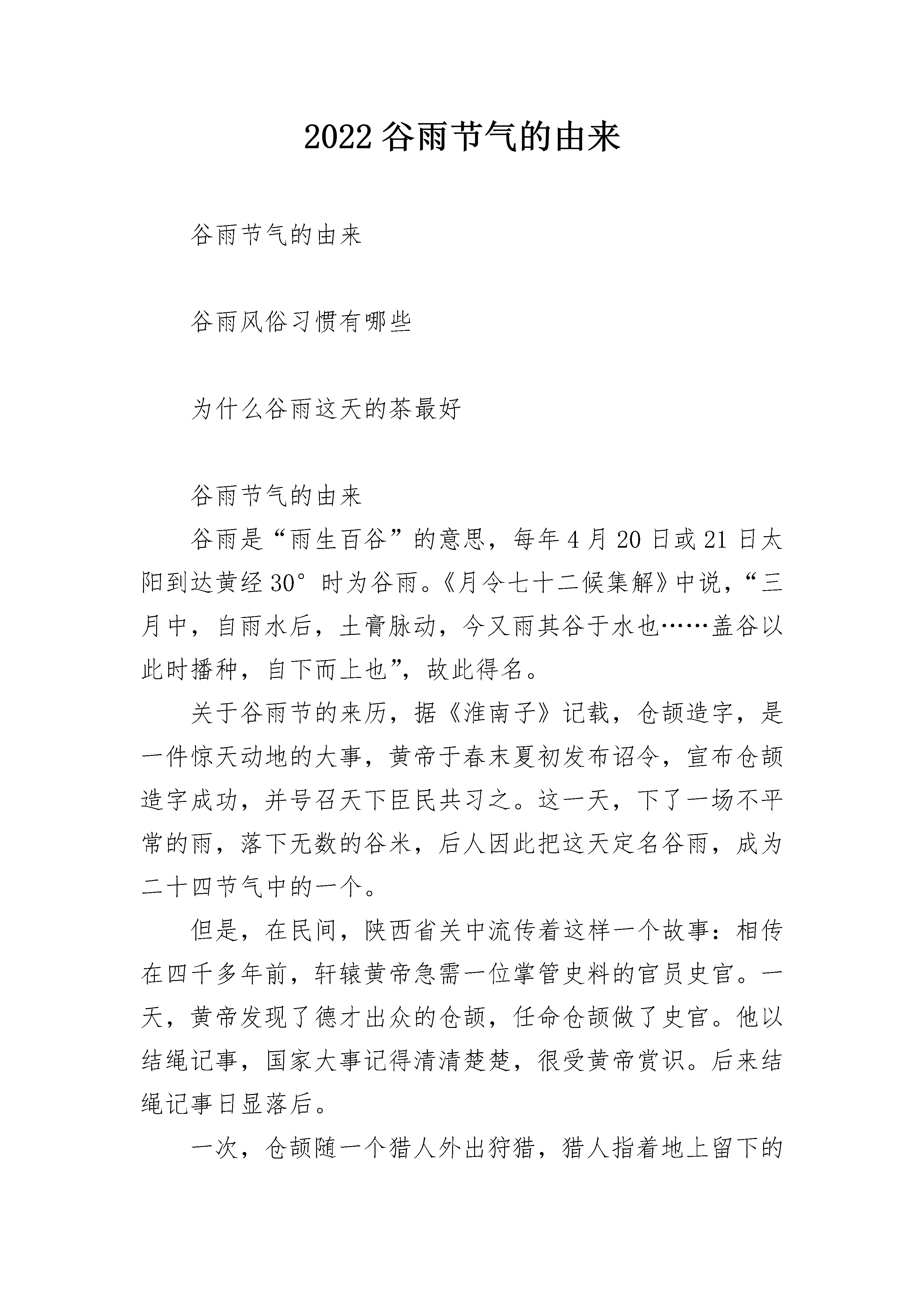 2022谷雨节气的由来谷雨节气的由来谷雨风俗习惯有哪些为什么谷雨这天的茶最好谷雨节气的由来谷雨是“雨生百谷”的意思,每年4月20日或21日太阳到达黄经30°时为谷雨。《月令七十二候集解》中说,“三月中,自雨水后,土膏脉动,今又雨其谷于水也……盖谷以此时播种,自下而上也”,故此得名。关于谷雨节的来历,据《淮南子》记载,仓颉造字,是一件惊天动地的大事,黄帝于春末夏初发布诏令,宣布仓颉造字成功,并号召天下臣民共习之。这一天,下了一场不平常的雨,落下无数的谷米,后人因此把这天定名谷雨,成为二十四节气中的一个。但是,在民间,陕西省关中流传着这样一个故事:相传在四千多年前,轩辕黄帝急需一位掌管史料的官员史官。一天,黄帝发现了德才出众的仓颉,任命仓颉做了史官。他以结绳记事,国家大事记得清清楚楚,很受黄帝赏识。后来结绳记事日显落后。一次,仓颉随一个猎人外出狩猎,猎人指着地上留下的各种野兽的踪迹讲述野兽的去向。仓颉深受启发:“一个足印代表一种事物呢!”回家后,仓颉便打点行装外出考访。他爬山涉水,不耻下问,把看到的各种事物都按其特征表示出来。依类象形,始创文字。因他制字有功,感动了天帝,当时天下正遭灾荒,便命天兵天将打开天宫的粮仓,下了一场谷子雨,天下万民得救了。仓颉死后,人们把他安葬在他的家乡-白水县史官镇北,墓门刻了一副对联:“雨粟当年感天帝,同文永世配桥陵。”人们把祭祀仓颉的日子定为下谷子雨的那天,也就是现在的“谷雨节”。如今,每逢谷雨节这天,白水县史官镇一带都举行拜仓颉的庙会。<<<
