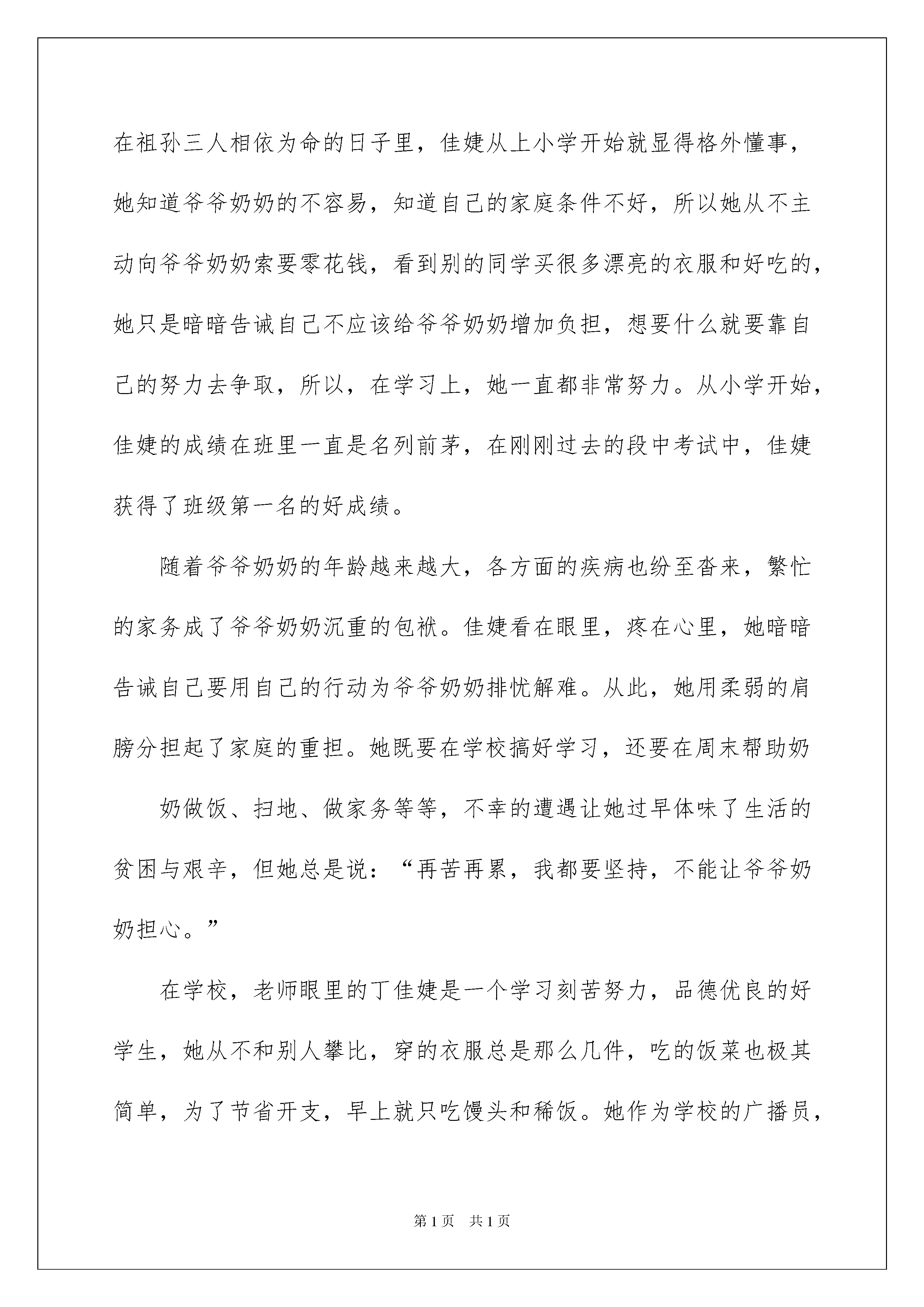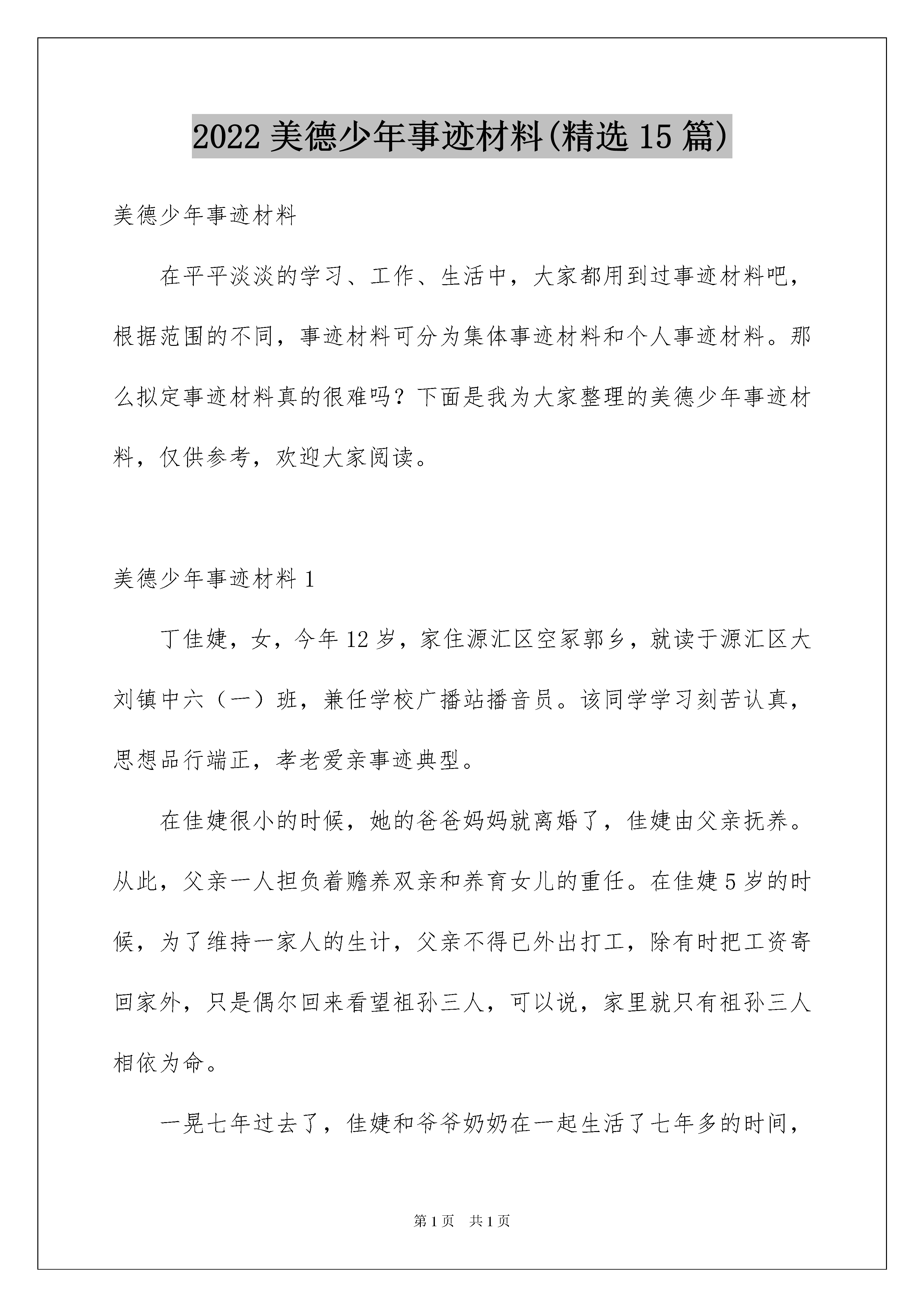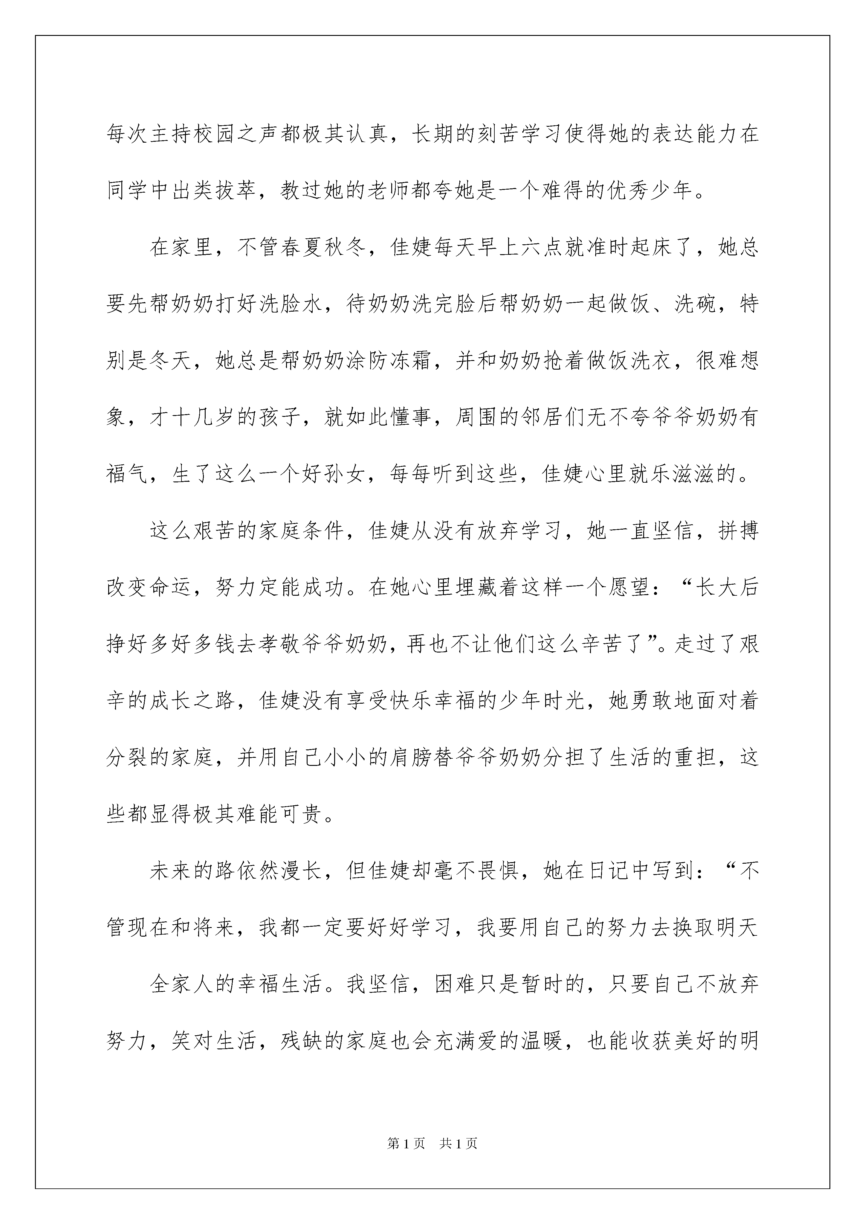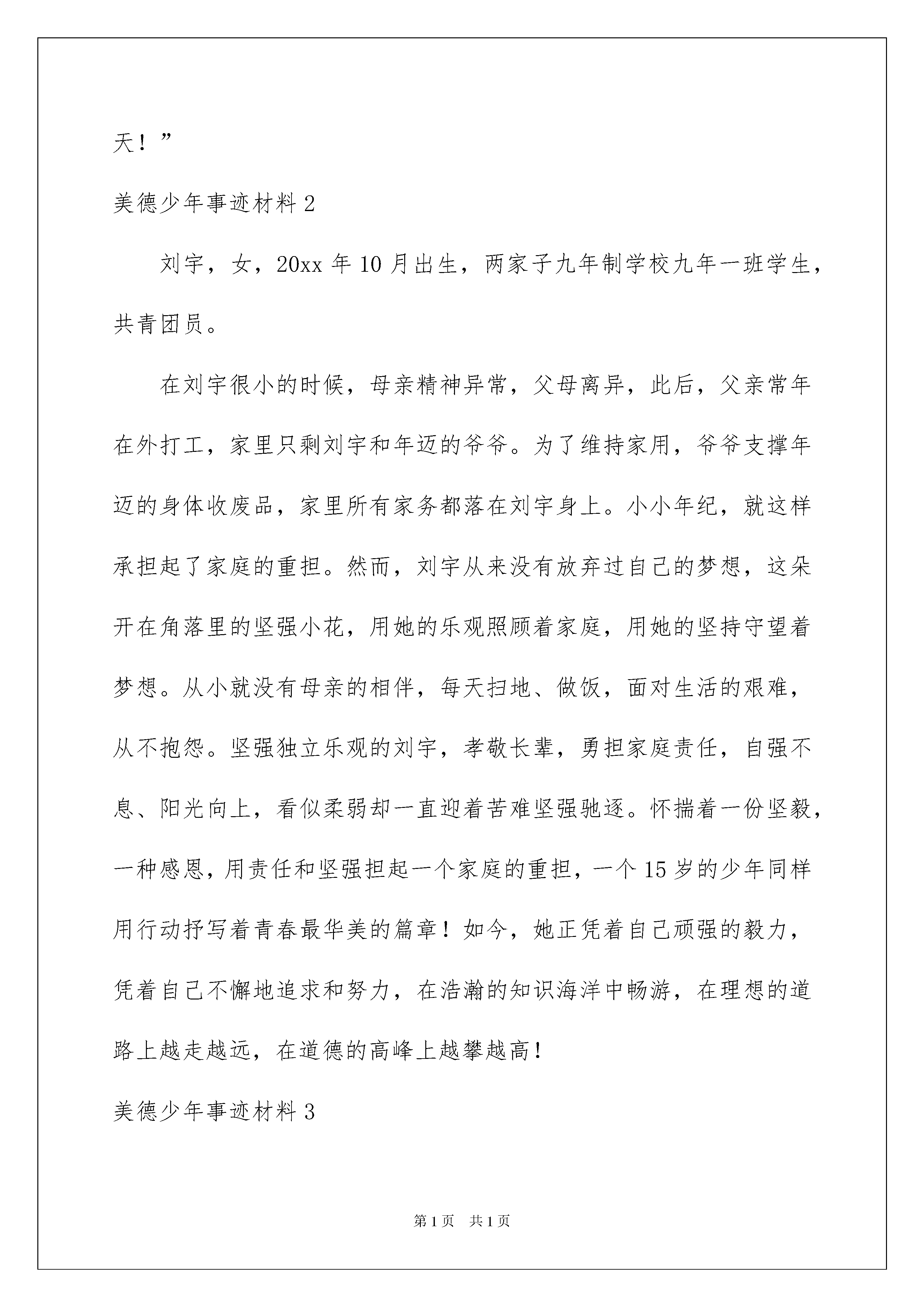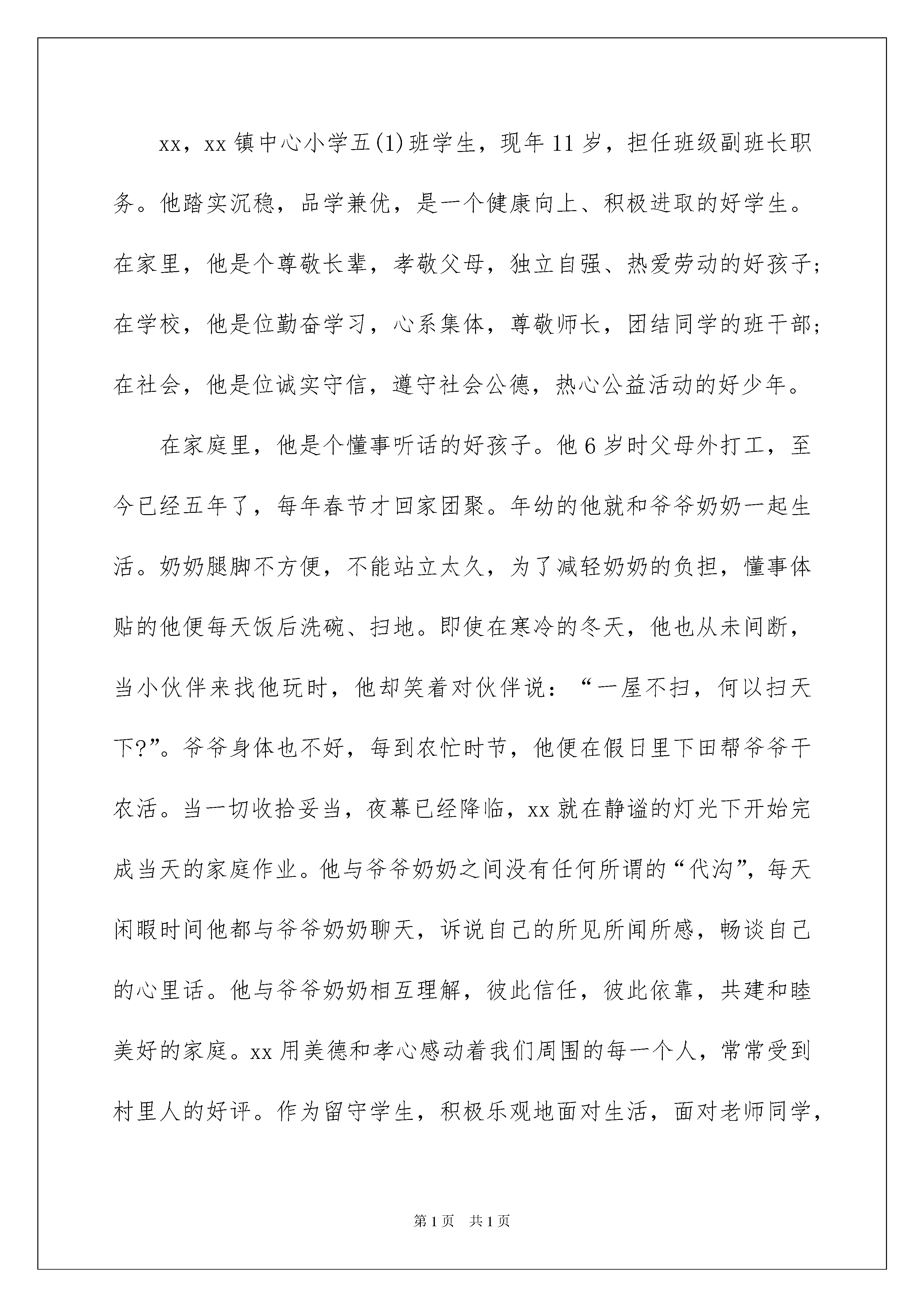 2022美德少年事迹材料(精选15篇)美德少年事迹材料在平平淡淡的学习、工作、生活中,大家都用到过事迹材料吧,根据范围的不同,事迹材料可分为集体事迹材料和个人事迹材料。那么拟定事迹材料真的很难吗?下面是我为大家整理的美德少年事迹材料,仅供参考,欢迎大家阅读。美德少年事迹材料1丁佳婕,女,今年12岁,家住源汇区空冢郭乡,就读于源汇区大刘镇中六(一)班,兼任学校广播站播音员。该同学学习刻苦认真,思想品行端正,孝老爱亲事迹典型。在佳婕很小的时候,她的爸爸妈妈就离婚了,佳婕由父亲抚养。从此,父亲一人担负着赡养双亲和养育女儿的重任。在佳婕5岁的时候,为了维持一家人的生计,父亲不得已外出打工,除有时把工资寄回家外,只是偶尔回来看望祖孙三人,可以说,家里就只有祖孙三人相依为命。一晃七年过去了,佳婕和爷爷奶奶在一起生活了七年多的时间,在祖孙三人相依为命的日子里,佳婕从上小学开始就显得格外懂事,她知道爷爷奶奶的不容易,知道自己的家庭条件不好,所以她从不主动向爷爷奶奶索要零花钱,看到别的同学买很多漂亮的衣服和好吃的,她只是暗暗告诫自己不应该给爷爷奶奶增加负担,想要什么就要靠自己的努力去争取,所以,在学习上,她一直都非常努力。从小学开始,佳婕的成绩在班里一直是名列前茅,在刚刚过去的段中考试中,佳婕获得了班级第一名的好成绩。随着爷爷奶奶的年龄越来越大,各方面的疾病也纷至沓来,繁忙的家务成了爷爷奶奶沉重的包袱。佳婕看在眼里,疼在心里,她暗暗告诫自己要用自己的行动为爷爷奶奶排忧解难。从此,她用柔弱的肩膀分担起了家庭的重担。她既要在学校搞好学习,还要在周末帮助奶奶做饭、扫地、做家务等等,不幸的遭遇让她过早体味了生活的贫困与艰辛,但她总是说:“再苦再累,我都要坚持,不能让爷爷奶奶担心。”在学校,老师眼里的丁佳婕是一个学习刻苦努力,品德优良的好学生,她从不和别人攀比,穿的衣服总是那么几件,吃的饭菜也极其简单,为了节省开支,早上就只吃馒头和稀饭。她作为学校的广播员,每次主持校园之声都极其认真,长期的刻苦学习使得她的表达能力在同学中出类拔萃,教过她的老师都夸她是一个难得的优秀少年。在家里,不管春夏秋冬,佳婕每天早上六点就准时起床了,她总要先帮奶奶打好洗脸水,待奶奶洗完脸后帮奶奶一起做饭、洗碗,特别是冬天,她总是帮奶奶涂防冻霜,并和奶奶抢着做饭洗衣,很难想象,才十几岁的孩子,就如此懂事,周围的邻居们无不夸爷爷奶奶有福气,生了这么一个好孙女,每每听到这些,佳婕心里就乐滋滋的。这么艰苦的家庭条件,佳婕从没有放弃学习,她一直坚信,拼搏改变命运,努力定能成功。在她心里埋藏着这样一个愿望:“长大后挣好多好多钱去孝敬爷爷奶奶,再也不让他们这么辛苦了”。走过了艰辛的成长之路,佳婕没有享受快乐幸福的少年时光,她勇敢地面对着分裂的家庭,并用自己小小的肩膀替爷爷奶奶分担了生活的重担,这些都显得极其难能可贵。未来的路依然漫长,但佳婕却毫不畏惧,她在日记中写到:“不管现在和将来,我都一定要好好学习,我要用自己的努力去换取明天全家人的幸福生活。我坚信,困难只是暂时的,只要自己不放弃努力,笑对生活,残缺的家庭也会充满爱的温暖,也能收获美好的明天!”美德少年事迹材料2刘宇,女,20xx年10月出生,两家子九年制学校九年一班学生,共青团员。在刘宇很小的时候,母亲精神异常,父母离异,此后,父亲常年在外打工,家里只剩刘宇和年迈的爷爷。为了维持家用,爷爷支撑年迈的身体收废品,家里所有家务都落在刘宇身上。小小年纪,就这样承担起了家庭的重担。然而,刘宇从来没有放弃过自己的梦想,这朵开在角落里的坚强小花,用她的乐观照顾着家庭,用她的坚持守望着梦想。从小就没有母亲的相伴,每天扫地、做饭,面对生活的艰难,从不抱怨。坚强独立乐观的刘宇,孝敬长辈,勇担家庭责任,自强不息、阳光向上,看似柔弱却一直迎着苦难坚强驰逐。怀揣着一份坚毅,一种感恩,用责任和坚强担起一个家庭的重担,一个15岁的少年同样用行动抒写着青春最华美的篇章!如今,她正凭着自己顽强的毅力,凭着自己不懈地追求和努力,在浩瀚的知识海洋中畅游,在理想的道路上越走越远,在道德的高峰上越攀越高!美德少年事迹材料3xx,xx镇中心小学五(1)班学生,现年11岁,担任班级副班长职务。他踏实沉稳,品学兼优,是一个健康向上、积极进取的好学生。在家里,他是个尊敬长辈,孝敬父母,独立自强、热爱劳动的好孩子;在学校,他是位勤奋学习,心系集体,尊敬师长,团结同学的班干部;在社会,他是位诚实守信,遵守社会公德,热心公益活动的好少年。在家庭里,他是个懂事听话的好孩子。他6岁时父母外打工,至今已经五年了,每年春节才回家团聚。年幼的他就