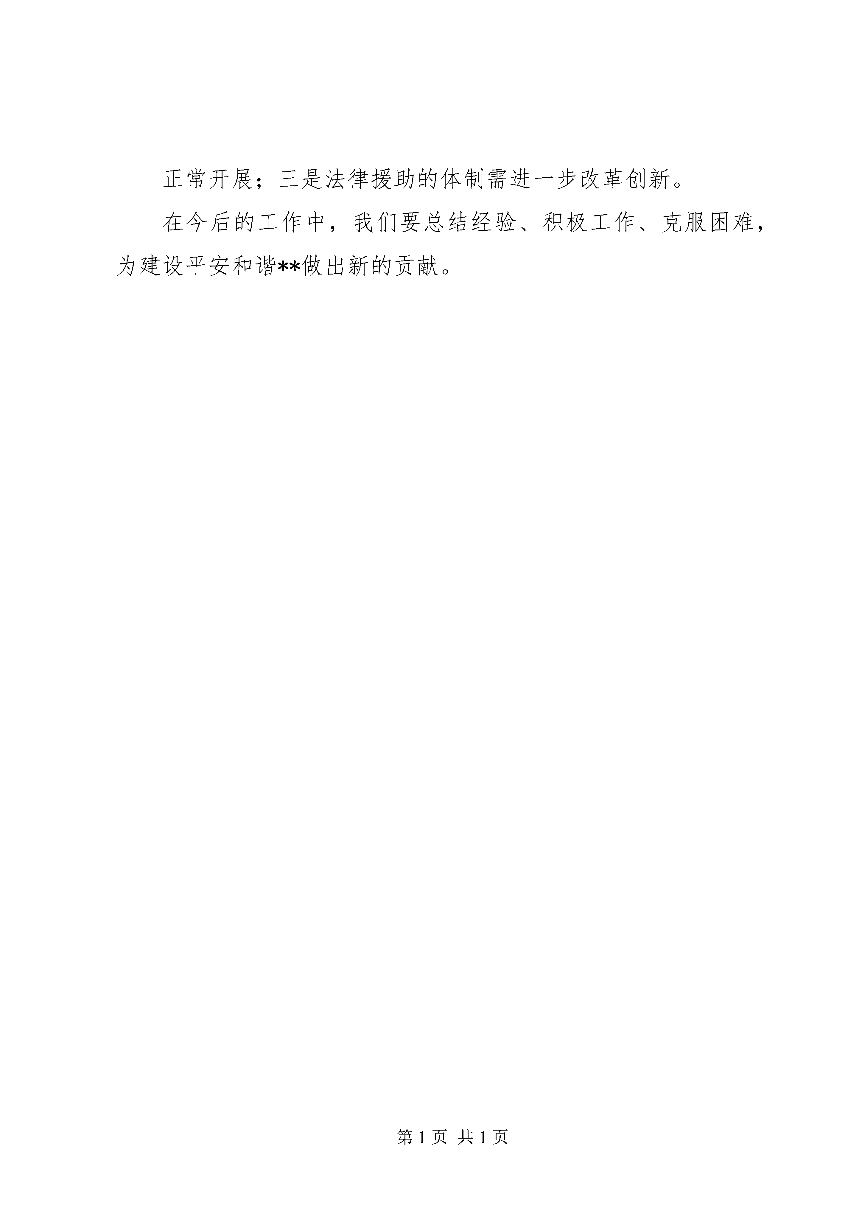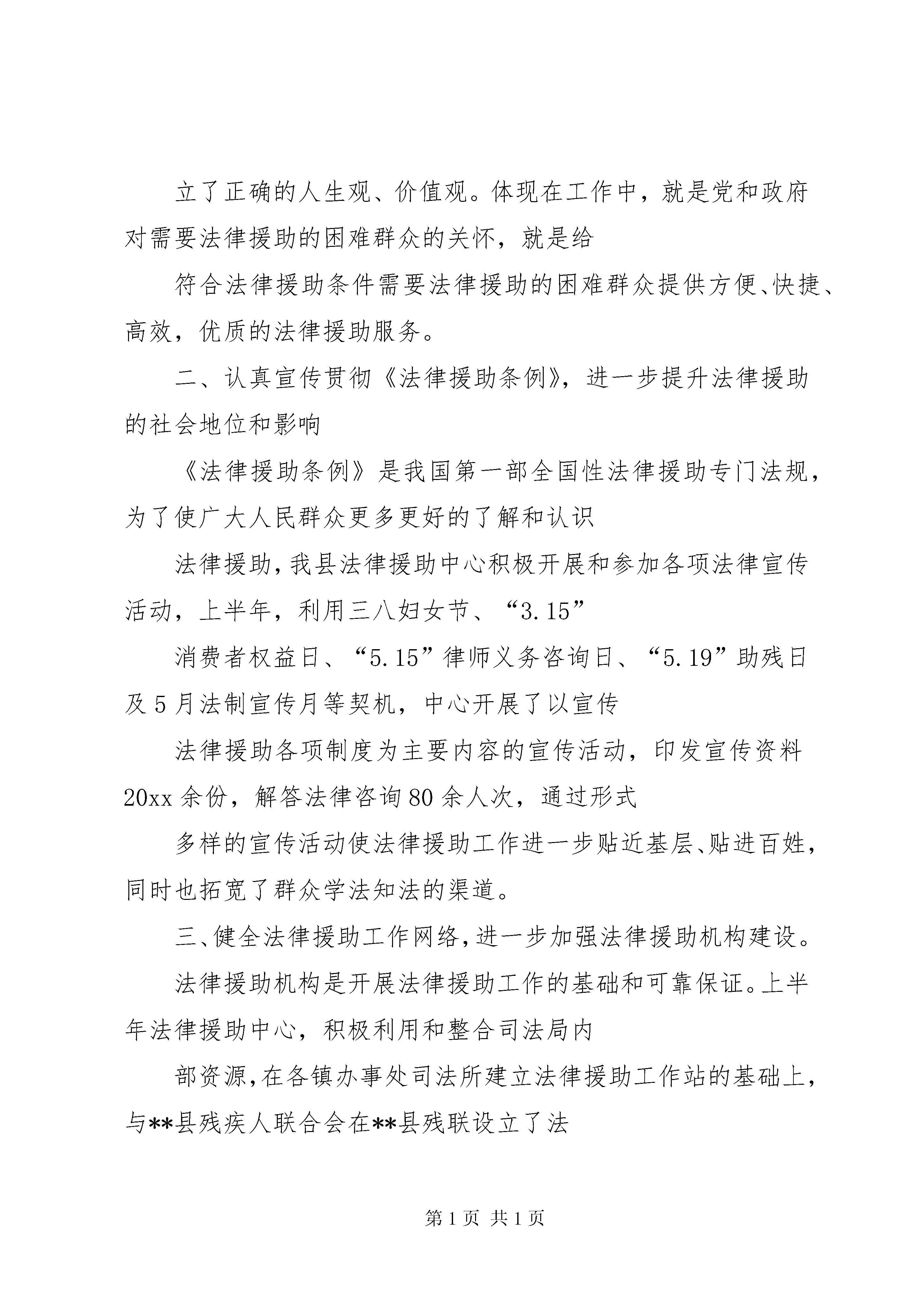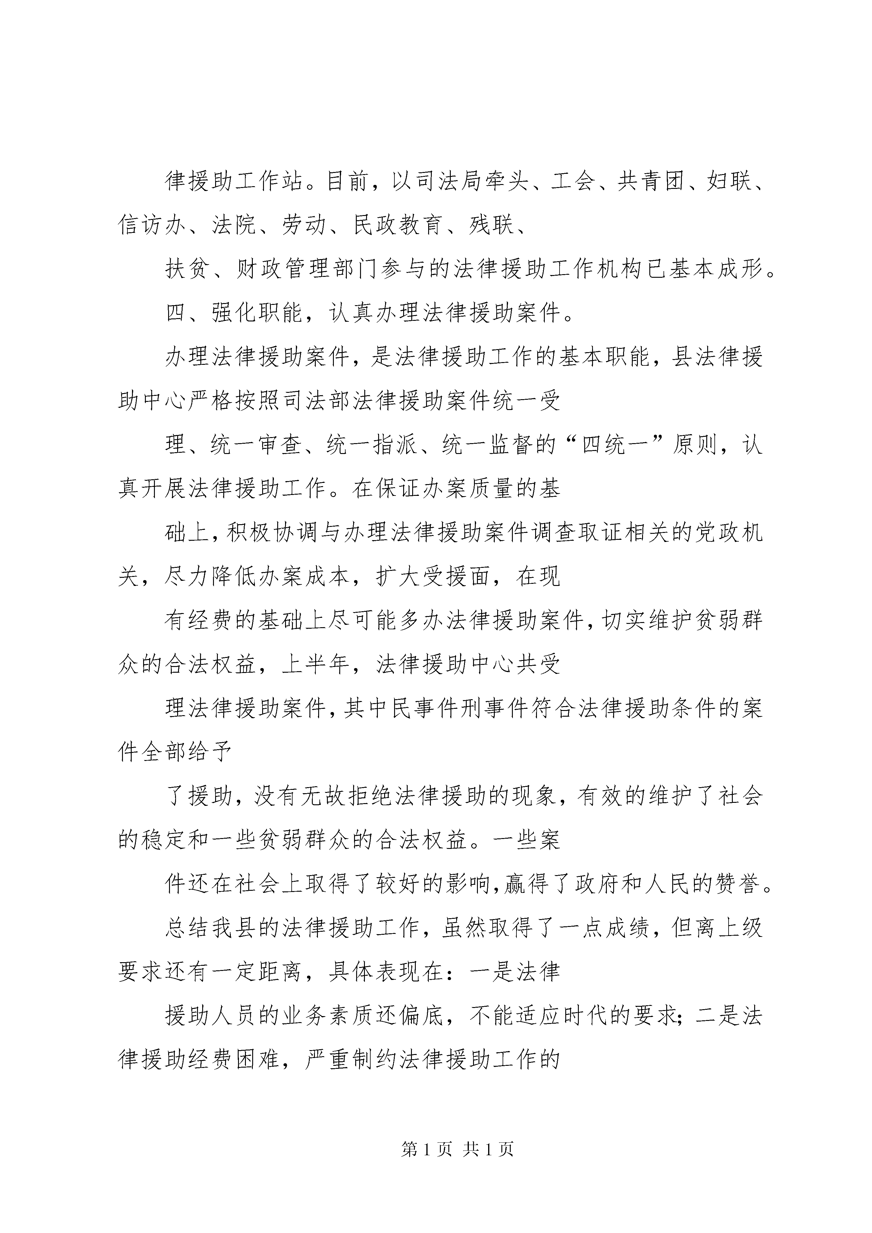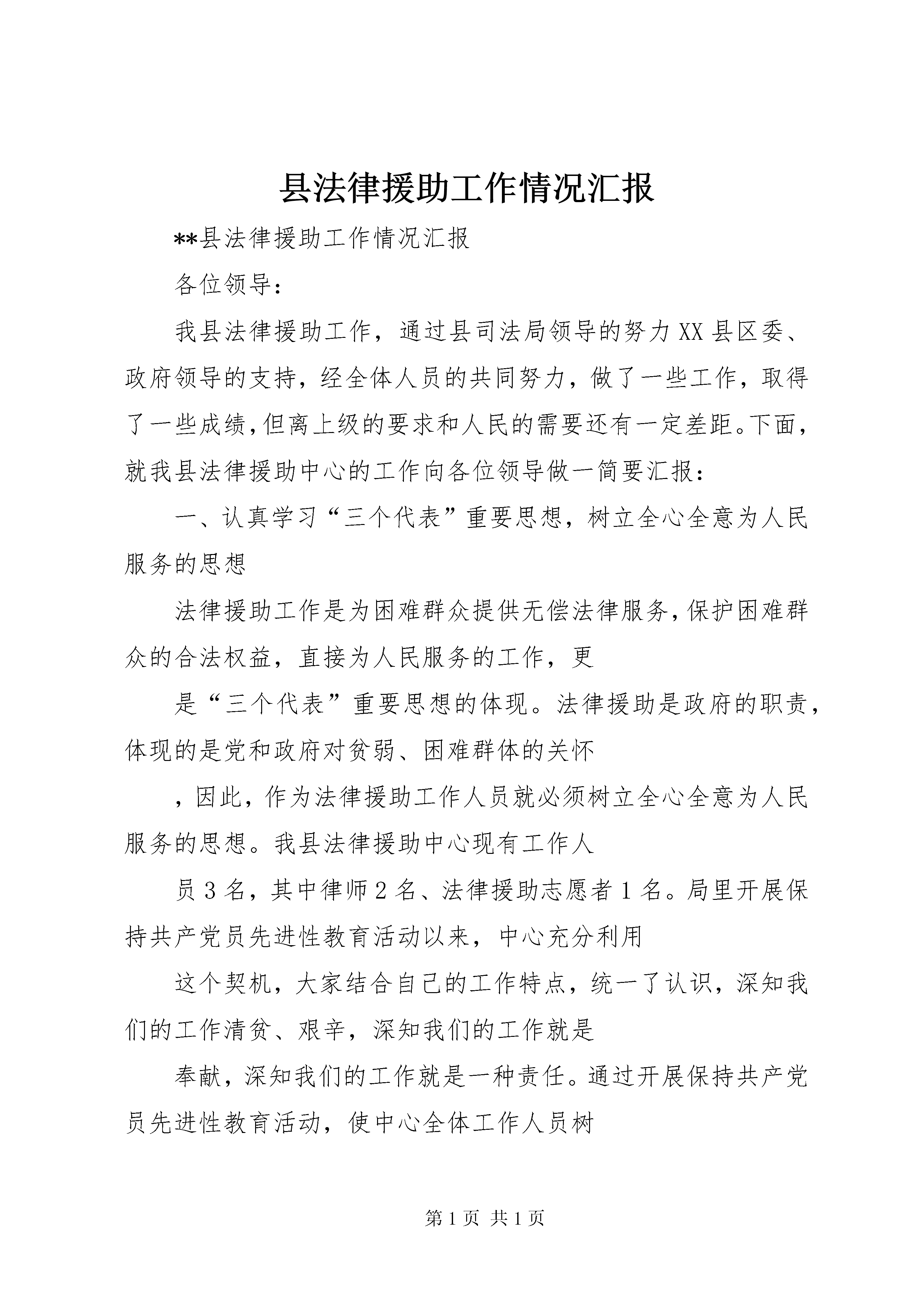 县法律援助工作情况汇报**县法律援助工作情况汇报各位领导:我县法律援助工作,通过县司法局领导的努力XX县区委、政府领导的支持,经全体人员的共同努力,做了一些工作,取得了一些成绩,但离上级的要求和人民的需要还有一定差距。下面,就我县法律援助中心的工作向各位领导做一简要汇报:一、认真学习“三个代表”重要思想,树立全心全意为人民服务的思想法律援助工作是为困难群众提供无偿法律服务,保护困难群众的合法权益,直接为人民服务的工作,更是“三个代表”重要思想的体现。法律援助是政府的职责,体现的是党和政府对贫弱、困难群体的关怀,因此,作为法律援助工作人员就必须树立全心全意为人民服务的思想。我县法律援助中心现有工作人员3名,其中律师2名、法律援助志愿者1名。局里开展保持共产党员先进性教育活动以来,中心充分利用这个契机,大家结合自己的工作特点,统一了认识,深知我们的工作清贫、艰辛,深知我们的工作就是奉献,深知我们的工作就是一种责任。通过开展保持共产党员先进性教育活动,使中心全体工作人员树立了正确的人生观、价值观。体现在工作中,就是党和政府对需要法律援助的困难群众的关怀,就是给符合法律援助条件需要法律援助的困难群众提供方便、快捷、高效,优质的法律援助服务。二、认真宣传贯彻《法律援助条例》,进一步提升法律援助的社会地位和影响《法律援助条例》是我国第一部全国性法律援助专门法规,为了使广大人民群众更多更好的了解和认识法律援助,我县法律援助中心积极开展和参加各项法律宣传活动,上半年,利用三八妇女节、“3.15”消费者权益日、“5.15”律师义务咨询日、“5.19”助残日及5月法制宣传月等契机,中心开展了以宣传法律援助各项制度为主要内容的宣传活动,印发宣传资料20xx余份,解答法律咨询80余人次,通过形式多样的宣传活动使法律援助工作进一步贴近基层、贴进百姓,同时也拓宽了群众学法知法的渠道。三、健全法律援助工作网络,进一步加强法律援助机构建设。法律援助机构是开展法律援助工作的基础和可靠保证。上半年法律援助中心,积极利用和整合司法局内部资源,在各镇办事处司法所建立法律援助工作站的基础上,与**县残疾人联合会在**县残联设立了法律援助工作站。目前,以司法局牵头、工会、共青团、妇联、信访办、法院、劳动、民政教育、残联、扶贫、财政管理部门参与的法律援助工作机构已基本成形。四、强化职能,认真办理法律援助案件。办理法律援助案件,是法律援助工作的基本职能,县法律援助中心严格按照司法部法律援助案件统一受理、统一审查、统一指派、统一监督的“四统一”原则,认真开展法律援助工作。在保证办案质量的基础上,积极协调与办理法律援助案件调查取证相关的党政机关,尽力降低办案成本,扩大受援面,在现有经费的基础上尽可能多办法律援助案件,切实维护贫弱群众的合法权益,上半年,法律援助中心共受理法律援助案件,其中民事件刑事件符合法律援助条件的案件全部给予了援助,没有无故拒绝法律援助的现象,有效的维护了社会的稳定和一些贫弱群众的合法权益。一些案件还在社会上取得了较好的影响,赢得了政府和人民的赞誉。总结我县的法律援助工作,虽然取得了一点成绩,但离上级要求还有一定距离,具体表现在:一是法律援助人员的业务素质还偏底,不能适应时代的要求;二是法律援助经费困难,严重制约法律援助工作的正常开展;三是法律援助的体制需进一步改革创新。在今后的工作中,我们要总结经验、积极工作、克服困难,为建设平安和谐**做出新的贡献。