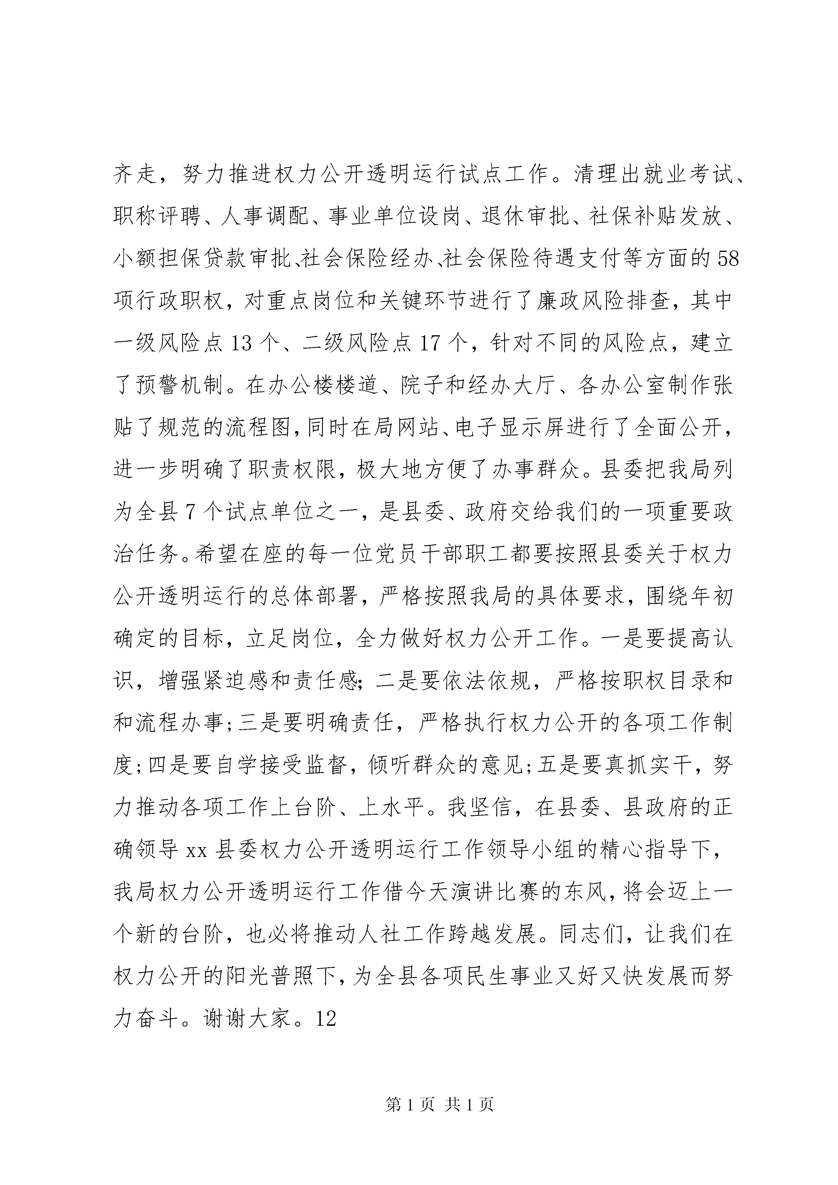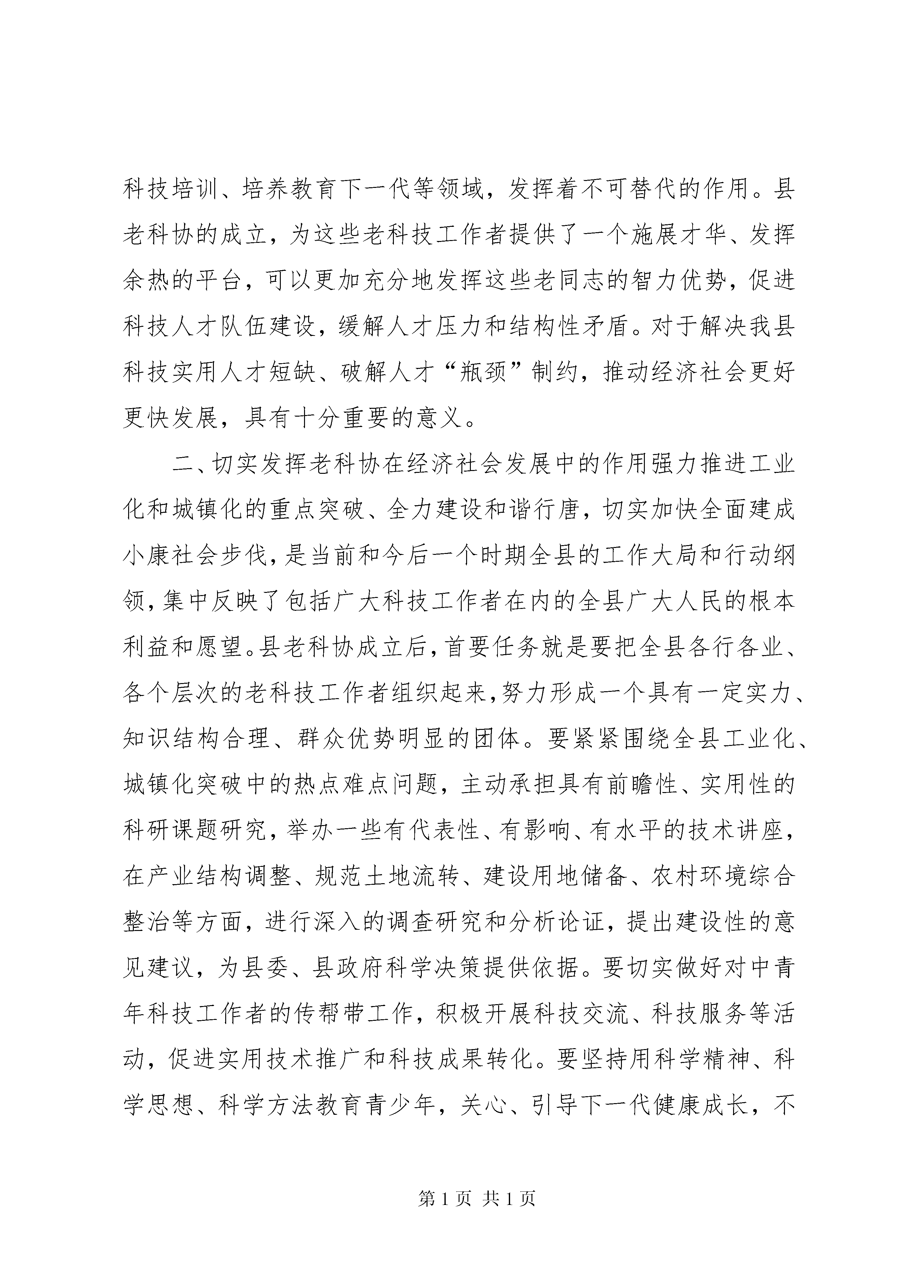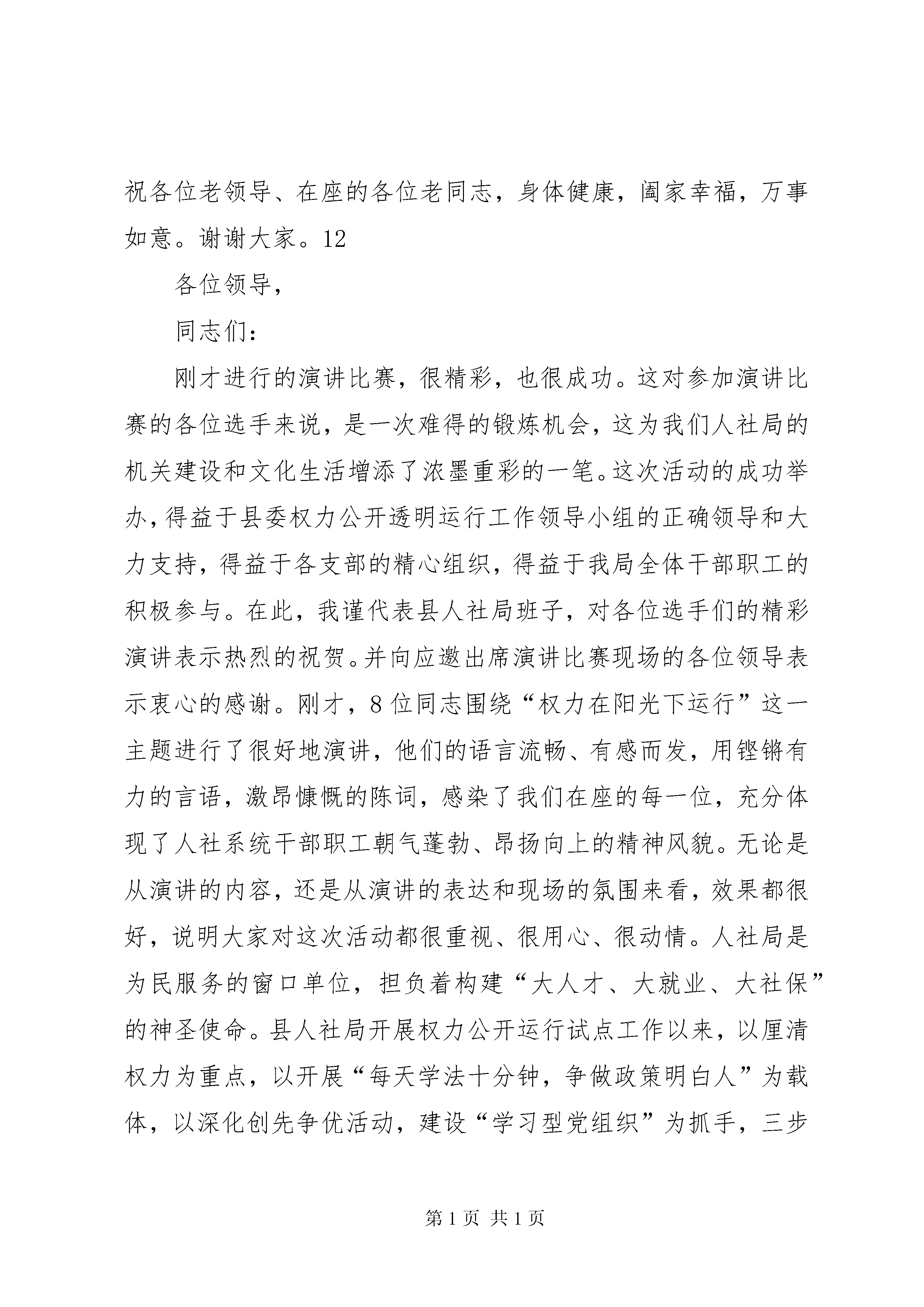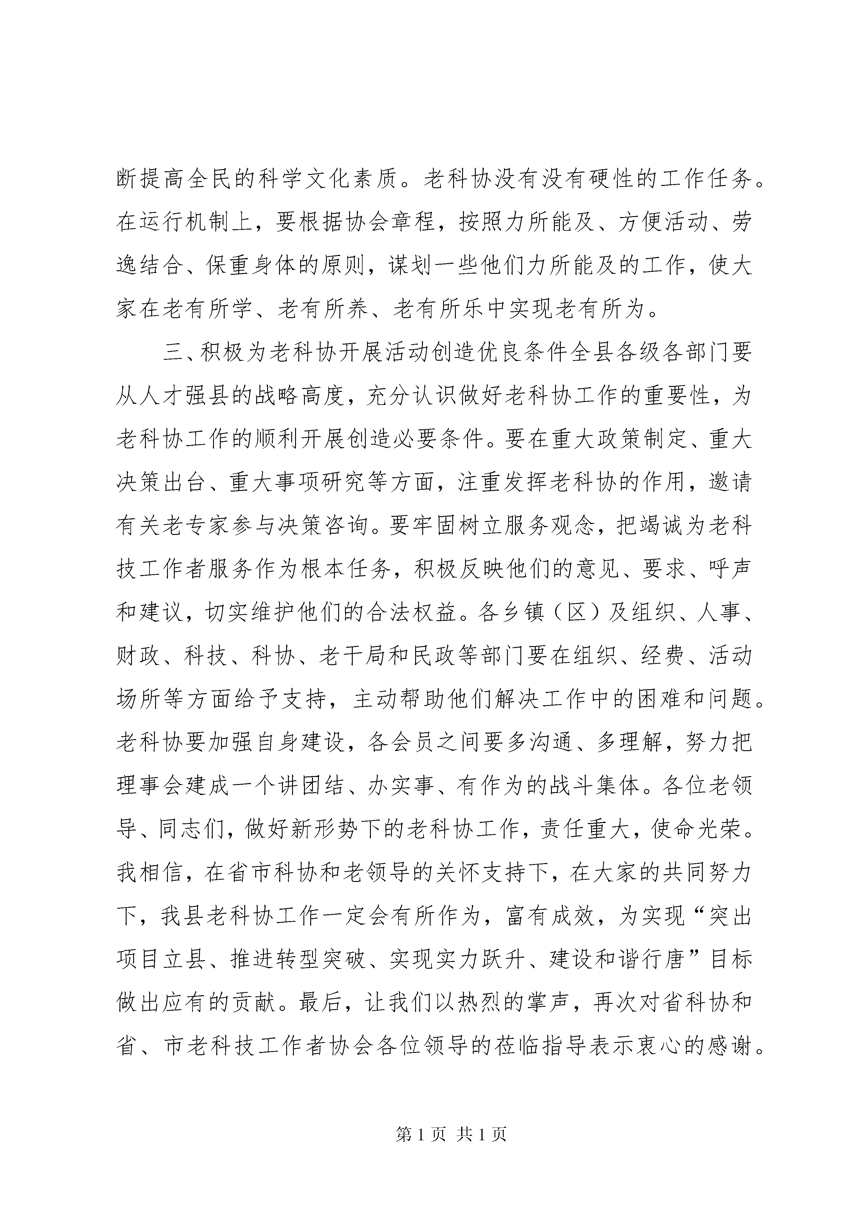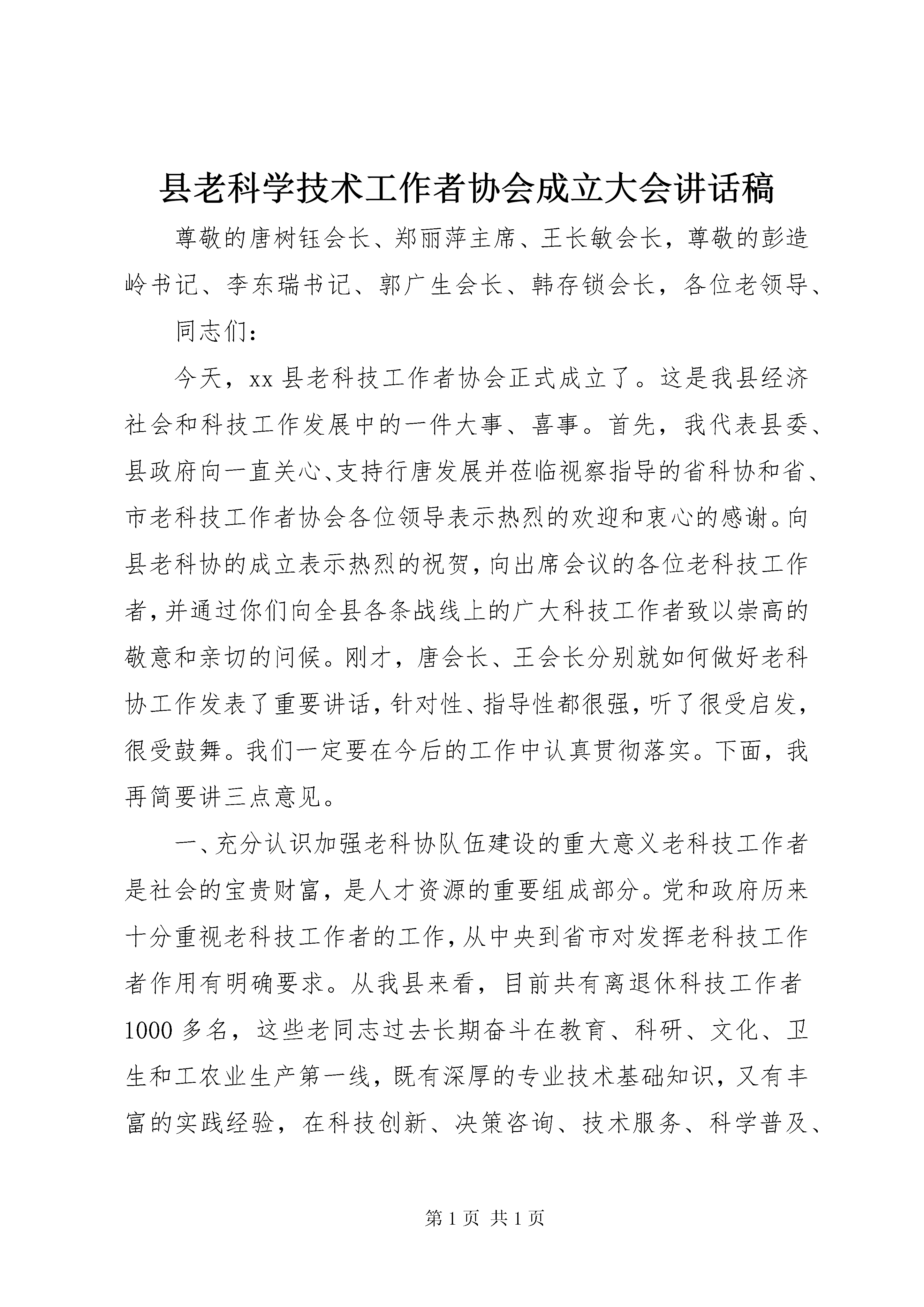县老科学技术工作者协会成立大会讲话稿尊敬的唐树钰会长、郑丽萍主席、王长敏会长,尊敬的彭造岭书记、李东瑞书记、郭广生会长、韩存锁会长,各位老领导、同志们:今天,xx县老科技工作者协会正式成立了。这是我县经济社会和科技工作发展中的一件大事、喜事。首先,我代表县委、县政府向一直关心、支持行唐发展并莅临视察指导的省科协和省、市老科技工作者协会各位领导表示热烈的欢迎和衷心的感谢。向县老科协的成立表示热烈的祝贺,向出席会议的各位老科技工作者,并通过你们向全县各条战线上的广大科技工作者致以崇高的敬意和亲切的问候。刚才,唐会长、王会长分别就如何做好老科协工作发表了重要讲话,针对性、指导性都很强,听了很受启发,很受鼓舞。我们一定要在今后的工作中认真贯彻落实。下面,我再简要讲三点意见。一、充分认识加强老科协队伍建设的重大意义老科技工作者是社会的宝贵财富,是人才资源的重要组成部分。党和政府历来十分重视老科技工作者的工作,从中央到省市对发挥老科技工作者作用有明确要求。从我县来看,目前共有离退休科技工作者1000多名,这些老同志过去长期奋斗在教育、科研、文化、卫生和工农业生产第一线,既有深厚的专业技术基础知识,又有丰富的实践经验,在科技创新、决策咨询、技术服务、科学普及、科技培训、培养教育下一代等领域,发挥着不可替代的作用。县老科协的成立,为这些老科技工作者提供了一个施展才华、发挥余热的平台,可以更加充分地发挥这些老同志的智力优势,促进科技人才队伍建设,缓解人才压力和结构性矛盾。对于解决我县科技实用人才短缺、破解人才“瓶颈”制约,推动经济社会更好更快发展,具有十分重要的意义。二、切实发挥老科协在经济社会发展中的作用强力推进工业化和城镇化的重点突破、全力建设和谐行唐,切实加快全面建成小康社会步伐,是当前和今后一个时期全县的工作大局和行动纲领,集中反映了包括广大科技工作者在内的全县广大人民的根本利益和愿望。县老科协成立后,首要任务就是要把全县各行各业、各个层次的老科技工作者组织起来,努力形成一个具有一定实力、知识结构合理、群众优势明显的团体。要紧紧围绕全县工业化、城镇化突破中的热点难点问题,主动承担具有前瞻性、实用性的科研课题研究,举办一些有代表性、有影响、有水平的技术讲座,在产业结构调整、规范土地流转、建设用地储备、农村环境综合整治等方面,进行深入的调查研究和分析论证,提出建设性的意见建议,为县委、县政府科学决策提供依据。要切实做好对中青年科技工作者的传帮带工作,积极开展科技交流、科技服务等活动,促进实用技术推广和科技成果转化。要坚持用科学精神、科学思想、科学方法教育青少年,关心、引导下一代健康成长,不断提高全民的科学文化素质。老科协没有没有硬性的工作任务。在运行机制上,要根据协会章程,按照力所能及、方便活动、劳逸结合、保重身体的原则,谋划一些他们力所能及的工作,使大家在老有所学、老有所养、老有所乐中实现老有所为。三、积极为老科协开展活动创造优良条件全县各级各部门要从人才强县的战略高度,充分认识做好老科协工作的重要性,为老科协工作的顺利开展创造必要条件。要在重大政策制定、重大决策出台、重大事项研究等方面,注重发挥老科协的作用,邀请有关老专家参与决策咨询。要牢固树立服务观念,把竭诚为老科技工作者服务作为根本任务,积极反映他们的意见、要求、呼声和建议,切实维护他们的合法权益。各乡镇(区)及组织、人事、财政、科技、科协、老干局和民政等部门要在组织、经费、活动场所等方面给予支持,主动帮助他们解决工作中的困难和问题。老科协要加强自身建设,各会员之间要多沟通、多理解,努力把理事会建成一个讲团结、办实事、有作为的战斗集体。各位老领导、同志们,做好新形势下的老科协工作,责任重大,使命光荣。我相信,在省市科协和老领导的关怀支持下,在大家的共同努力下,我县老科协工作一定会有所作为,富有成效,为实现“突出项目立县、推进转型突破、实现实力跃升、建设和谐行唐”目标做出应有的贡献。最后,让我们以热烈的掌声,再次对省科协和省、市老科技工作者协会各位领导的莅临指导表示衷心的感谢。祝各位老领导、在座的各位老同志,身体健康,阖家幸福,万事如意。谢谢大家。12各位领导,同志们:刚才进行的演讲比赛,很精彩,也很成功。这对参加演讲比赛的各位选手来说,是一次难得的锻炼机会,这为我们人社局的机关建设和文化生活增添了浓墨重彩的一笔。这次活动的成功举办,得益于县委权力公开透明运行工作领导小组的正确领导和大力支持,得益于各支部的精心组织,得益于我局全体干部职工的积极参与。在此,我谨代表县人社局班子,对各位选手们的精彩演讲表示热烈的祝贺。并向应邀出席演讲比赛现场的各位领导表示衷心的感谢。刚才,8位同志围绕“权力在阳光下运行”这一主题进行了很好地演讲,他们的语言流畅、有感而发,用铿锵