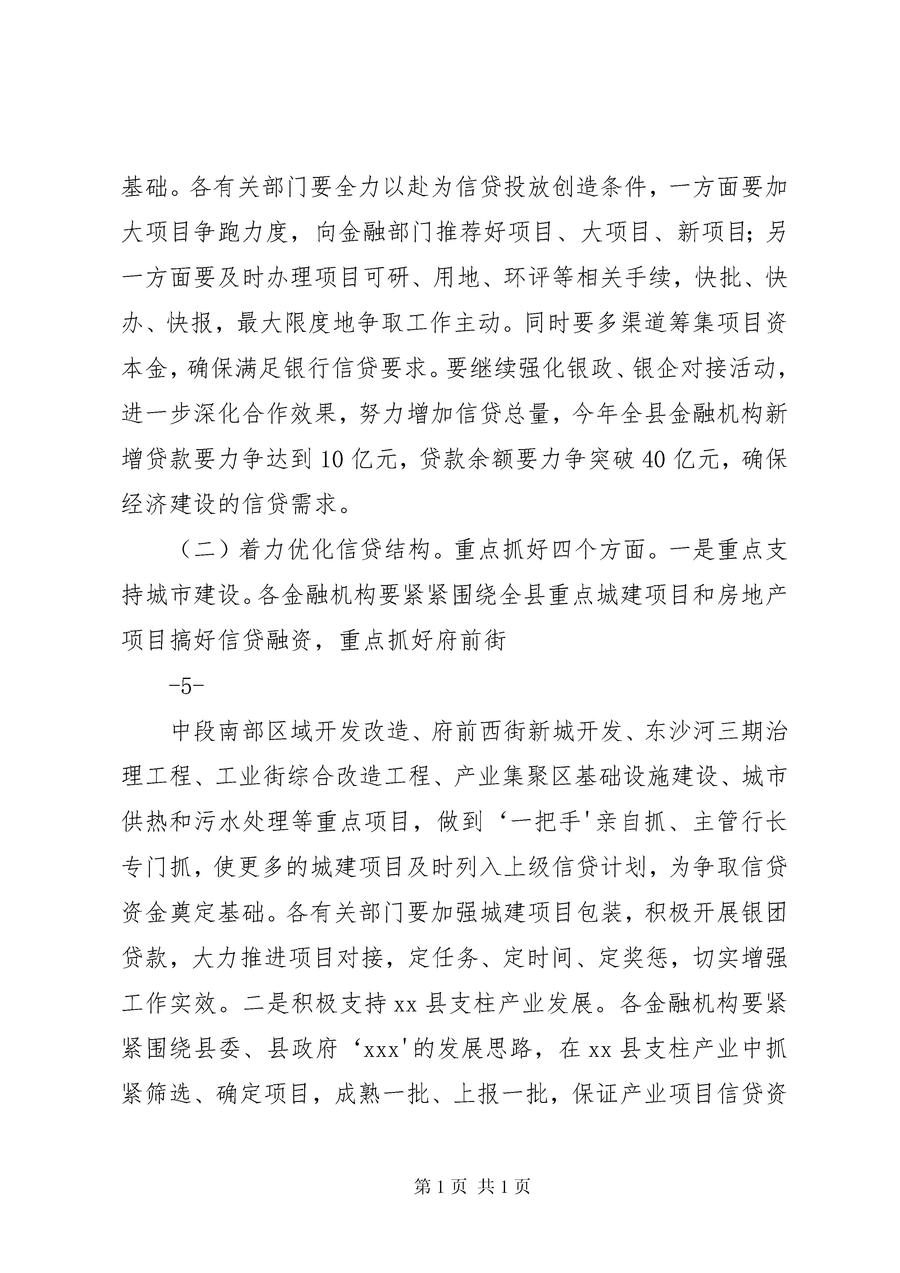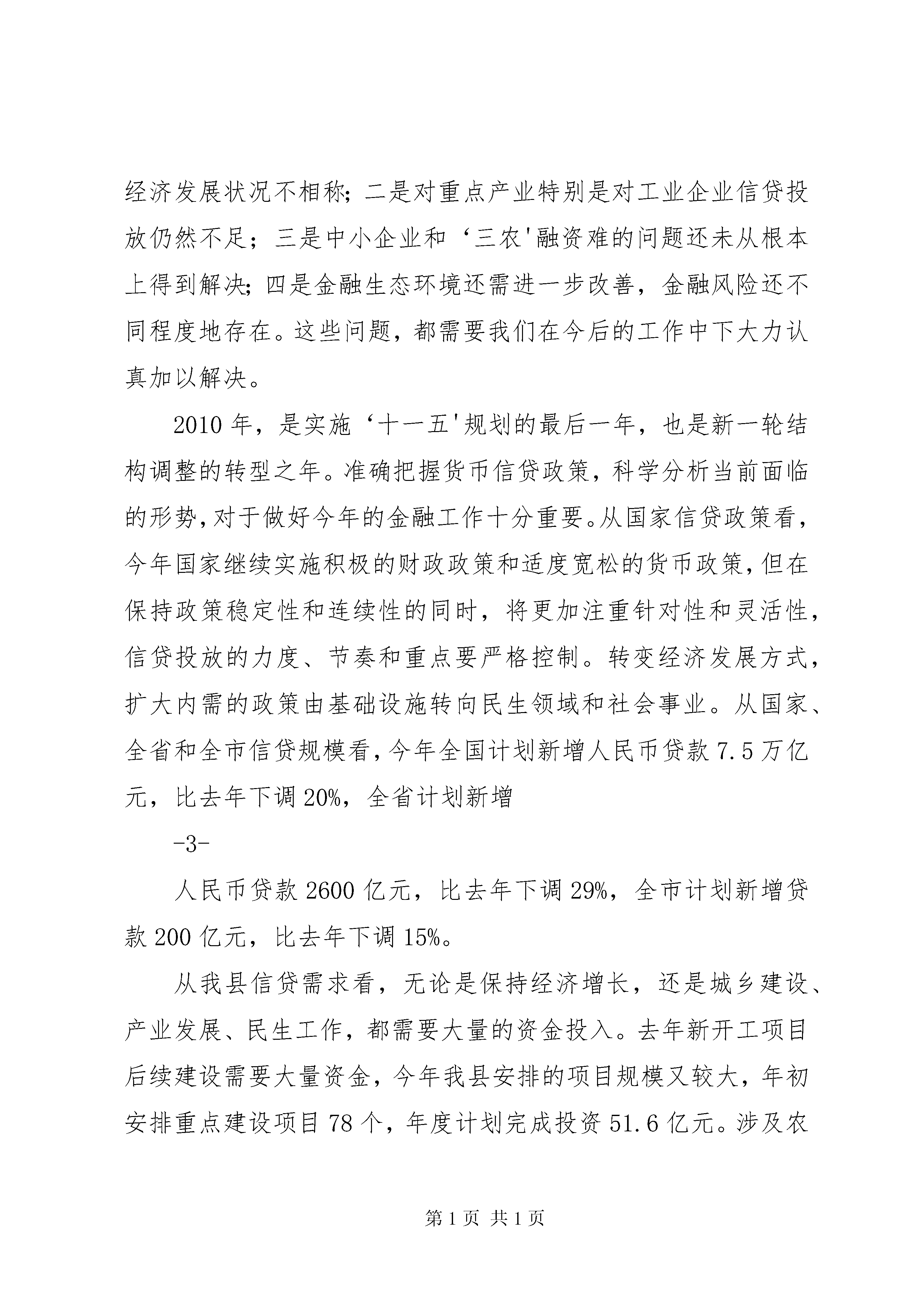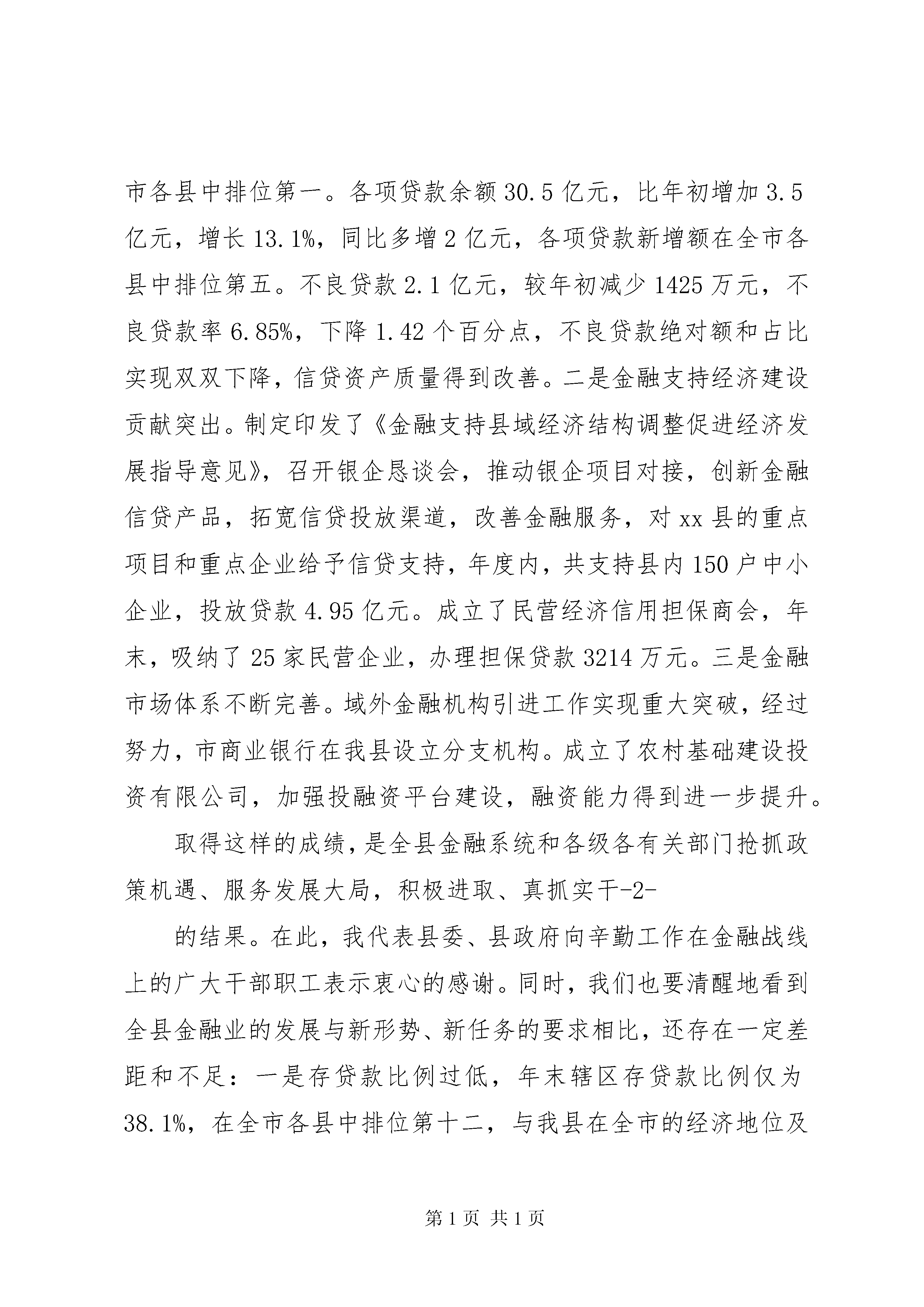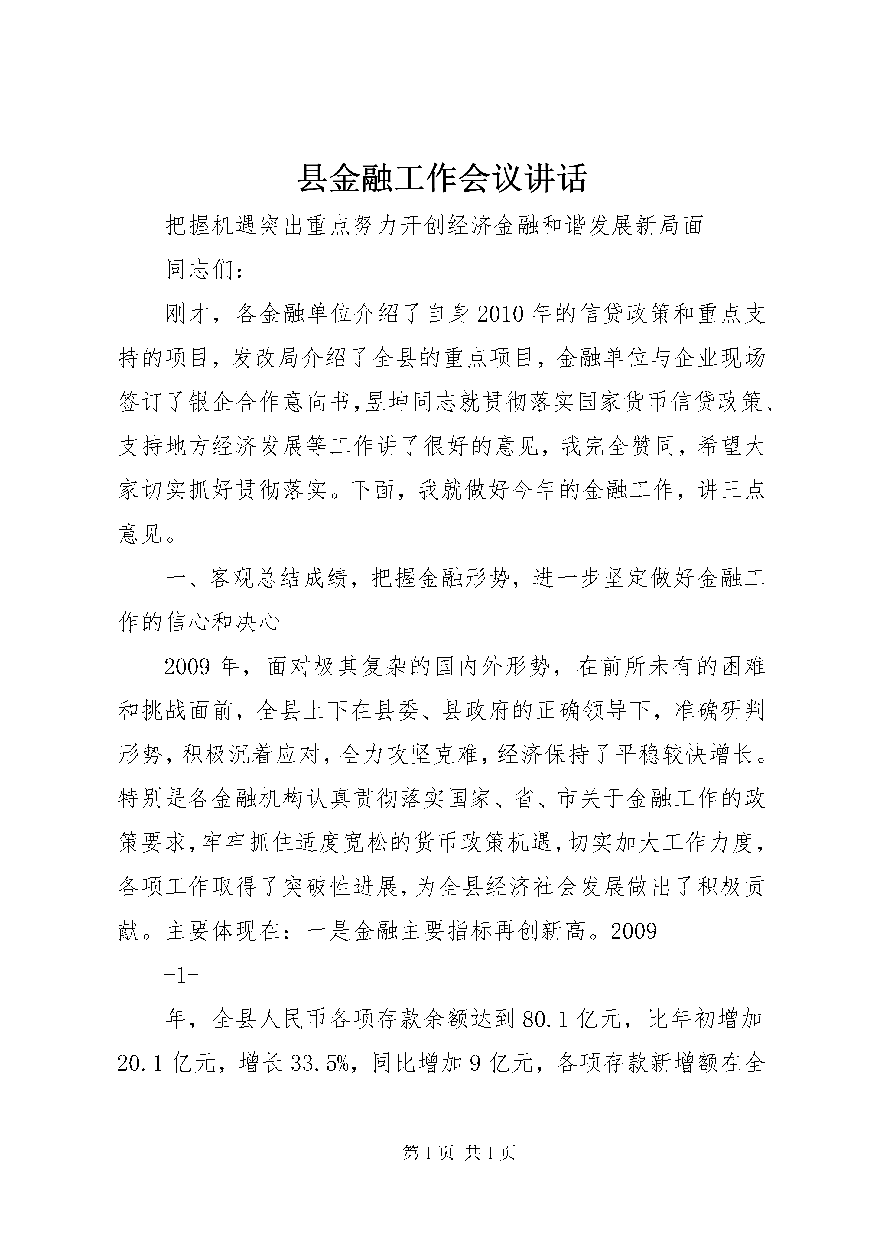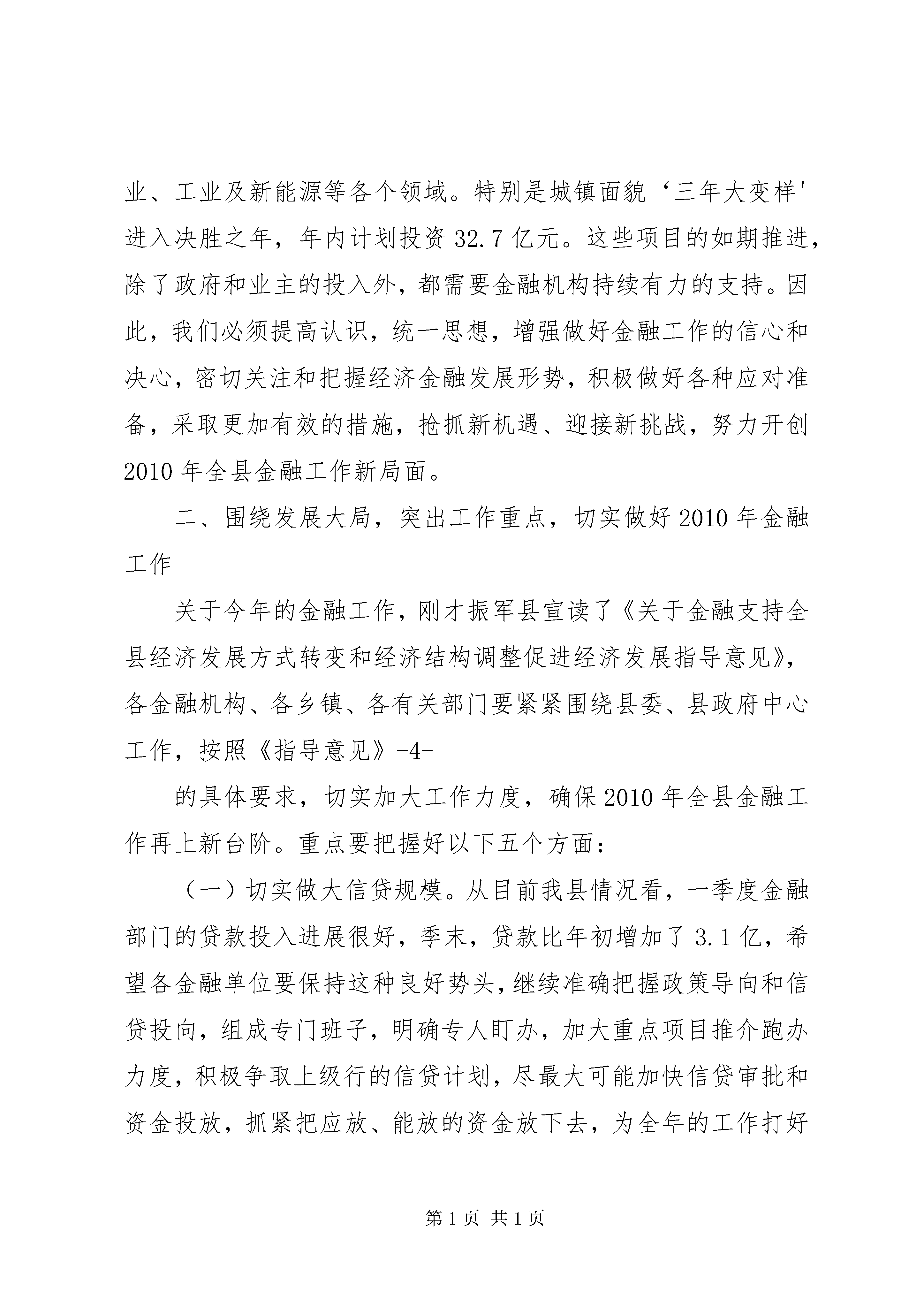 县金融工作会议讲话把握机遇突出重点努力开创经济金融和谐发展新局面同志们:刚才,各金融单位介绍了自身2010年的信贷政策和重点支持的项目,发改局介绍了全县的重点项目,金融单位与企业现场签订了银企合作意向书,昱坤同志就贯彻落实国家货币信贷政策、支持地方经济发展等工作讲了很好的意见,我完全赞同,希望大家切实抓好贯彻落实。下面,我就做好今年的金融工作,讲三点意见。一、客观总结成绩,把握金融形势,进一步坚定做好金融工作的信心和决心2009年,面对极其复杂的国内外形势,在前所未有的困难和挑战面前,全县上下在县委、县政府的正确领导下,准确研判形势,积极沉着应对,全力攻坚克难,经济保持了平稳较快增长。特别是各金融机构认真贯彻落实国家、省、市关于金融工作的政策要求,牢牢抓住适度宽松的货币政策机遇,切实加大工作力度,各项工作取得了突破性进展,为全县经济社会发展做出了积极贡献。主要体现在:一是金融主要指标再创新高。2009-1-年,全县人民币各项存款余额达到80.1亿元,比年初增加20.1亿元,增长33.5%,同比增加9亿元,各项存款新增额在全市各县中排位第一。各项贷款余额30.5亿元,比年初增加3.5亿元,增长13.1%,同比多增2亿元,各项贷款新增额在全市各县中排位第五。不良贷款2.1亿元,较年初减少1425万元,不良贷款率6.85%,下降1.42个百分点,不良贷款绝对额和占比实现双双下降,信贷资产质量得到改善。二是金融支持经济建设贡献突出。制定印发了《金融支持县域经济结构调整促进经济发展指导意见》,召开银企恳谈会,推动银企项目对接,创新金融信贷产品,拓宽信贷投放渠道,改善金融服务,对xx县的重点项目和重点企业给予信贷支持,年度内,共支持县内150户中小企业,投放贷款4.95亿元。成立了民营经济信用担保商会,年末,吸纳了25家民营企业,办理担保贷款3214万元。三是金融市场体系不断完善。域外金融机构引进工作实现重大突破,经过努力,市商业银行在我县设立分支机构。成立了农村基础建设投资有限公司,加强投融资平台建设,融资能力得到进一步提升。取得这样的成绩,是全县金融系统和各级各有关部门抢抓政策机遇、服务发展大局,积极进取、真抓实干-2-的结果。在此,我代表县委、县政府向辛勤工作在金融战线上的广大干部职工表示衷心的感谢。同时,我们也要清醒地看到全县金融业的发展与新形势、新任务的要求相比,还存在一定差距和不足:一是存贷款比例过低,年末辖区存贷款比例仅为38.1%,在全市各县中排位第十二,与我县在全市的经济地位及经济发展状况不相称;二是对重点产业特别是对工业企业信贷投放仍然不足;三是中小企业和‘三农'融资难的问题还未从根本上得到解决;四是金融生态环境还需进一步改善,金融风险还不同程度地存在。这些问题,都需要我们在今后的工作中下大力认真加以解决。2010年,是实施‘十一五'规划的最后一年,也是新一轮结构调整的转型之年。准确把握货币信贷政策,科学分析当前面临的形势,对于做好今年的金融工作十分重要。从国家信贷政策看,今年国家继续实施积极的财政政策和适度宽松的货币政策,但在保持政策稳定性和连续性的同时,将更加注重针对性和灵活性,信贷投放的力度、节奏和重点要严格控制。转变经济发展方式,扩大内需的政策由基础设施转向民生领域和社会事业。从国家、全省和全市信贷规模看,今年全国计划新增人民币贷款7.5万亿元,比去年下调20%,全省计划新增-3-人民币贷款2600亿元,比去年下调29%,全市计划新增贷款200亿元,比去年下调15%。从我县信贷需求看,无论是保持经济增长,还是城乡建设、产业发展、民生工作,都需要大量的资金投入。去年新开工项目后续建设需要大量资金,今年我县安排的项目规模又较大,年初安排重点建设项目78个,年度计划完成投资51.6亿元。涉及农业、工业及新能源等各个领域。特别是城镇面貌‘三年大变样'进入决胜之年,年内计划投资32.7亿元。这些项目的如期推进,除了政府和业主的投入外,都需要金融机构持续有力的支持。因此,我们必须提高认识,统一思想,增强做好金融工作的信心和决心,密切关注和把握经济金融发展形势,积极做好各种应对准备,采取更加有效的措施,抢抓新机遇、迎接新挑战,努力开创2010年全县金融工作新局面。二、围绕发展大局,突出工作重点,切实做好2010年金融工作关于今年的金融工作,刚才振军县宣读了《关于金融支持全县经济发展方式转变和经济结构调整促进经济发展指导意见》,各金融机构、各乡镇、各有关部门要紧紧围绕县委、县政府中心工作,按照《指导意见》-4-的具体要求,切实加大工作力度,确保2010年全县金融工作再上新台阶。重点要把握好以下五个方面:(一)切实做大信贷规模。从目前我县情况看,一季度金融部门的贷款投入进展很好,季末,贷款比年初增加了3