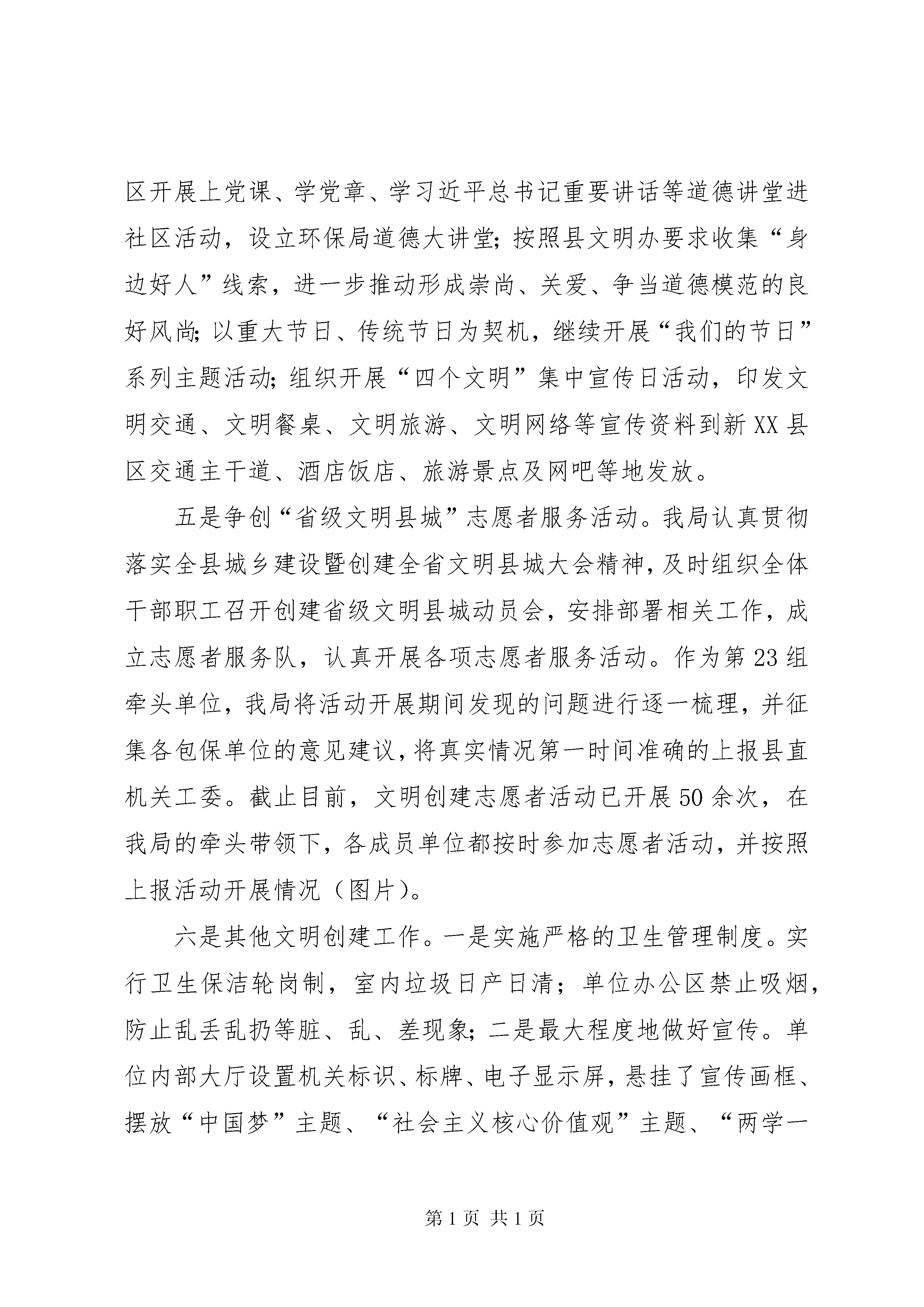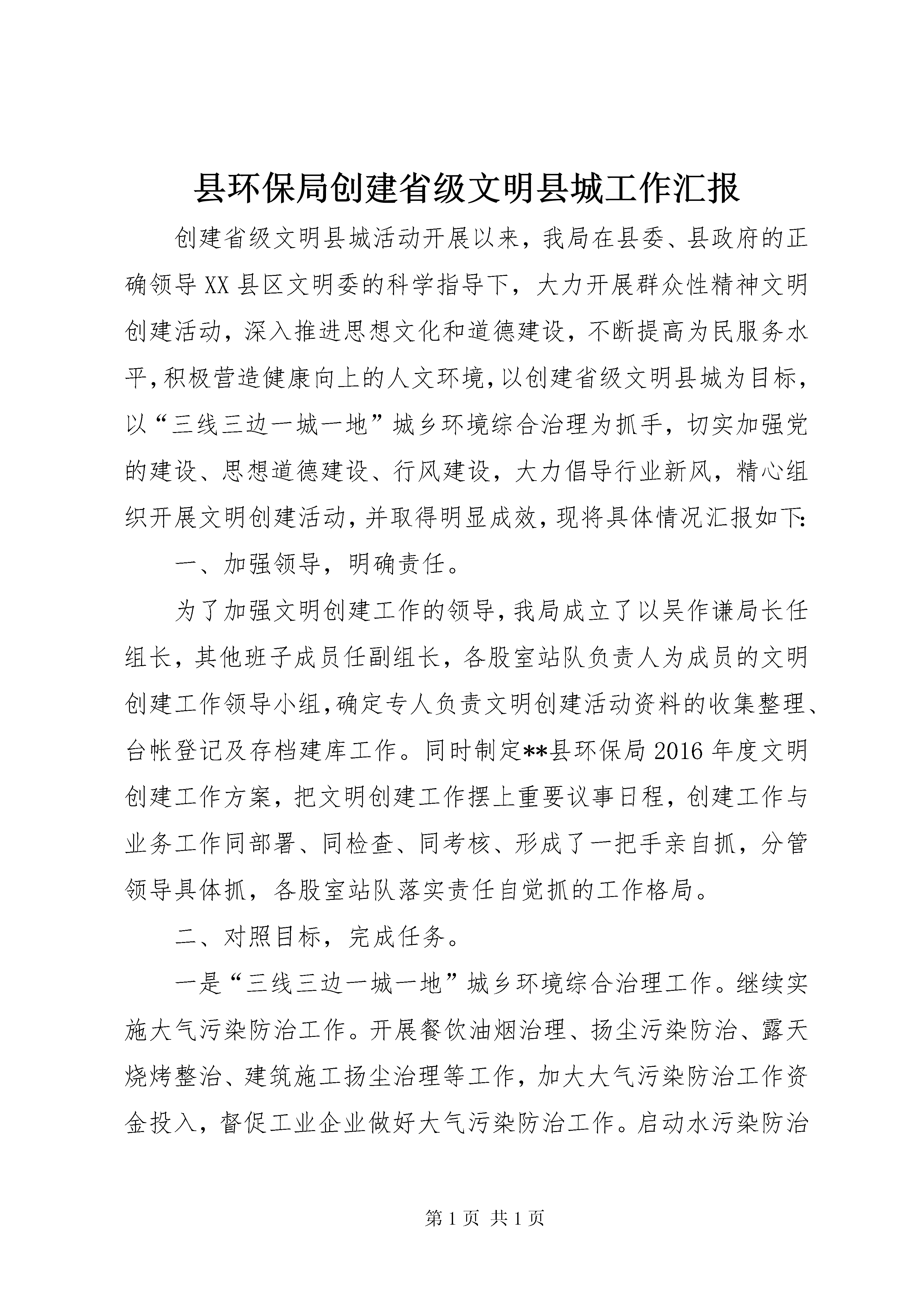 县环保局创建省级文明县城工作汇报创建省级文明县城活动开展以来,我局在县委、县政府的正确领导XX县区文明委的科学指导下,大力开展群众性精神文明创建活动,深入推进思想文化和道德建设,不断提高为民服务水平,积极营造健康向上的人文环境,以创建省级文明县城为目标,以“三线三边一城一地”城乡环境综合治理为抓手,切实加强党的建设、思想道德建设、行风建设,大力倡导行业新风,精心组织开展文明创建活动,并取得明显成效,现将具体情况汇报如下:一、加强领导,明确责任。为了加强文明创建工作的领导,我局成立了以吴作谦局长任组长,其他班子成员任副组长,各股室站队负责人为成员的文明创建工作领导小组,确定专人负责文明创建活动资料的收集整理、台帐登记及存档建库工作。同时制定**县环保局2016年度文明创建工作方案,把文明创建工作摆上重要议事日程,创建工作与业务工作同部署、同检查、同考核、形成了一把手亲自抓,分管领导具体抓,各股室站队落实责任自觉抓的工作格局。二、对照目标,完成任务。一是“三线三边一城一地”城乡环境综合治理工作。继续实施大气污染防治工作。开展餐饮油烟治理、扬尘污染防治、露天烧烤整治、建筑施工扬尘治理等工作,加大大气污染防治工作资金投入,督促工业企业做好大气污染防治工作。启动水污染防治工作。全面落实《**县水污染防治行动计划工作方案》和《**县不达标水体达标方案》,协调做好水污染防治工作,保障水环境安全。做好农村环境综合整治工作。积极推进农村环境综合整治工作,加强生态乡镇、生态村申报力度,重视农村环境保护工作,改善农村环境质量。二是开展“两学一做”学习教育活动。为推进“两学一做”学习教育深入开展,我局决定从五月中旬开始,在坚持每周一上午领导班子成员及二级机构以上负责人集中学习的基础上,定于每周五下午为全体干部职工集中学习日,做到“一周两学”。截至目前,周一集中学习已经常态化,周五集中学习已经开展20次,全局上下掀起了学习的热潮。三是认真筹备“6.5”世界环境日宣传活动工作。为纪念第45个“6.5”世界环境日,局党组超前谋划,紧紧围绕“改善环境质量,推动绿色发展”环境日主题,认真筹备“6.5”世界环境日及宣传周活动。活动中,我局组织县直18家单位在春申广场开展以“改善环境质量,推动绿色发展”为主题的大型宣传活动,现场散发宣传材料3000多份,接受群众咨询1000余人次。四是认真开展各项主题宣传活动。组织局全体党员干部职工集中学习社会主义核心价值观,要求全体党员熟背24字核心价值观内容;以“我的中国梦”为主题,在柴老师硬笔书法培训中心开展未成年人思想道德教育活动;组织环保志愿者走进新民社区开展上党课、学党章、学习近平总书记重要讲话等道德讲堂进社区活动,设立环保局道德大讲堂;按照县文明办要求收集“身边好人”线索,进一步推动形成崇尚、关爱、争当道德模范的良好风尚;以重大节日、传统节日为契机,继续开展“我们的节日”系列主题活动;组织开展“四个文明”集中宣传日活动,印发文明交通、文明餐桌、文明旅游、文明网络等宣传资料到新XX县区交通主干道、酒店饭店、旅游景点及网吧等地发放。五是争创“省级文明县城”志愿者服务活动。我局认真贯彻落实全县城乡建设暨创建全省文明县城大会精神,及时组织全体干部职工召开创建省级文明县城动员会,安排部署相关工作,成立志愿者服务队,认真开展各项志愿者服务活动。作为第23组牵头单位,我局将活动开展期间发现的问题进行逐一梳理,并征集各包保单位的意见建议,将真实情况第一时间准确的上报县直机关工委。截止目前,文明创建志愿者活动已开展50余次,在我局的牵头带领下,各成员单位都按时参加志愿者活动,并按照上报活动开展情况(图片)。六是其他文明创建工作。一是实施严格的卫生管理制度。实行卫生保洁轮岗制,室内垃圾日产日清;单位办公区禁止吸烟,防止乱丢乱扔等脏、乱、差现象;二是最大程度地做好宣传。单位内部大厅设置机关标识、标牌、电子显示屏,悬挂了宣传画框、摆放“中国梦”主题、“社会主义核心价值观”主题、“两学一做”主题及“讲文明树新风”主题等展板及绿植,全面实现工作环境的净化、绿化、亮化、美化,为干部职工创造良好的工作和生活环境。