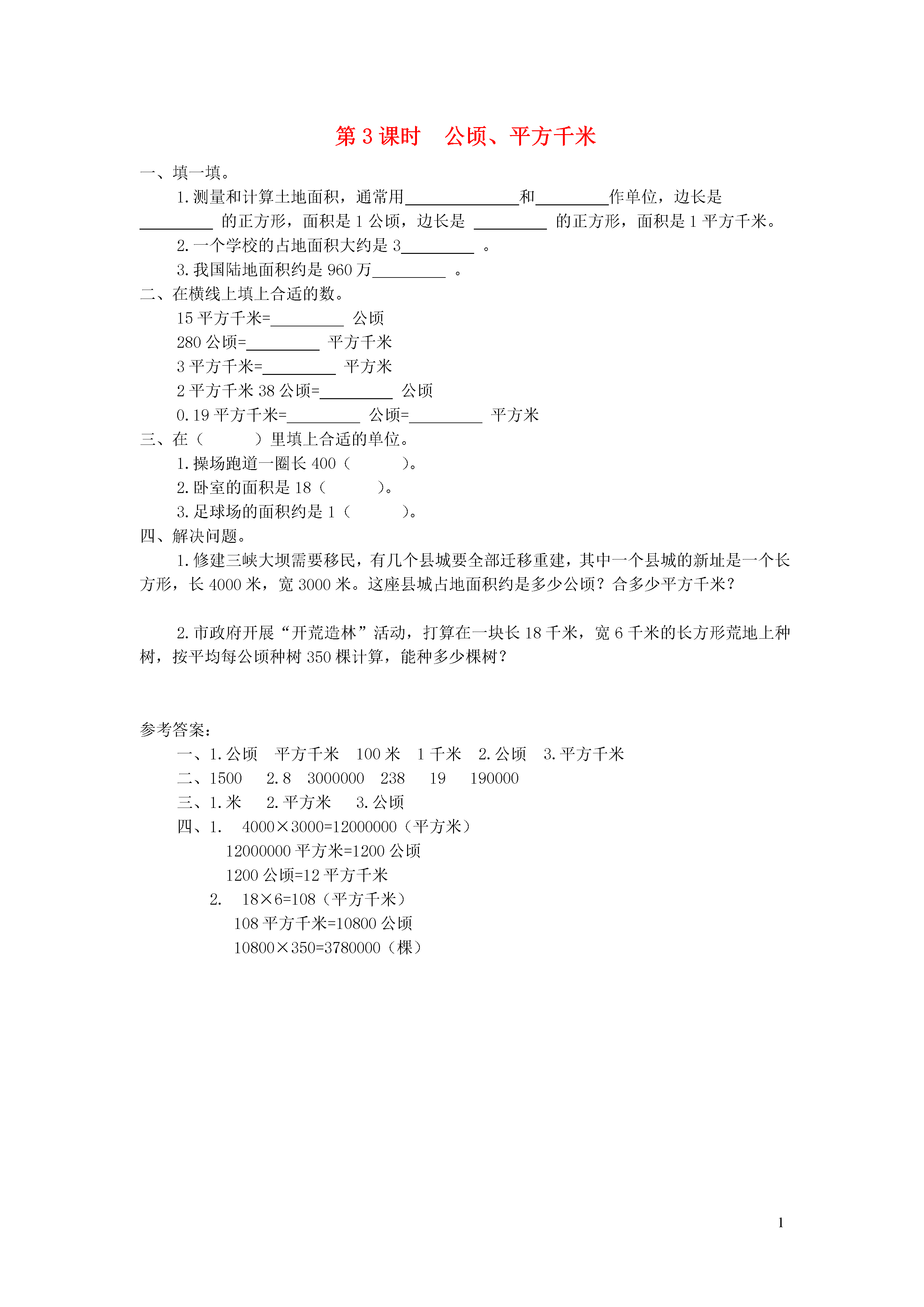 1第3课时公顷、平方千米填一填。1.测量和计算土地面积,通常用和作单位,边长是的正方形,面积是1公顷,边长是的正方形,面积是1平方千米。2.一个学校的占地面积大约是3。3.我国陆地面积约是960万。二、在横线上填上合适的数。15平方千米=公顷280公顷=平方千米3平方千米=平方米2平方千米38公顷=公顷0.19平方千米=公顷=平方米在()里填上合适的单位。1.操场跑道一圈长400()。2.卧室的面积是18()。3.足球场的面积约是1()。四、解决问题。1.修建三峡大坝需要移民,有几个县城要全部迁移重建,其中一个县城的新址是一个长方形,长4000米,宽3000米。这座县城占地面积约是多少公顷?合多少平方千米?市政府开展“开荒造林”活动,打算在一块长18千米,宽6千米的长方形荒地上种树,按平均每公顷种树350棵计算,能种多少棵树?参考答案:一、1.公顷平方千米100米1千米2.公顷3.平方千米二、15002.8300000023819190000三、1.米2.平方米3.公顷四、1.4000×3000=12000000(平方米)12000000平方米=1200公顷1200公顷=12平方千米2.18×6=108(平方千米)108平方千米=10800公顷10800×350=3780000(棵)